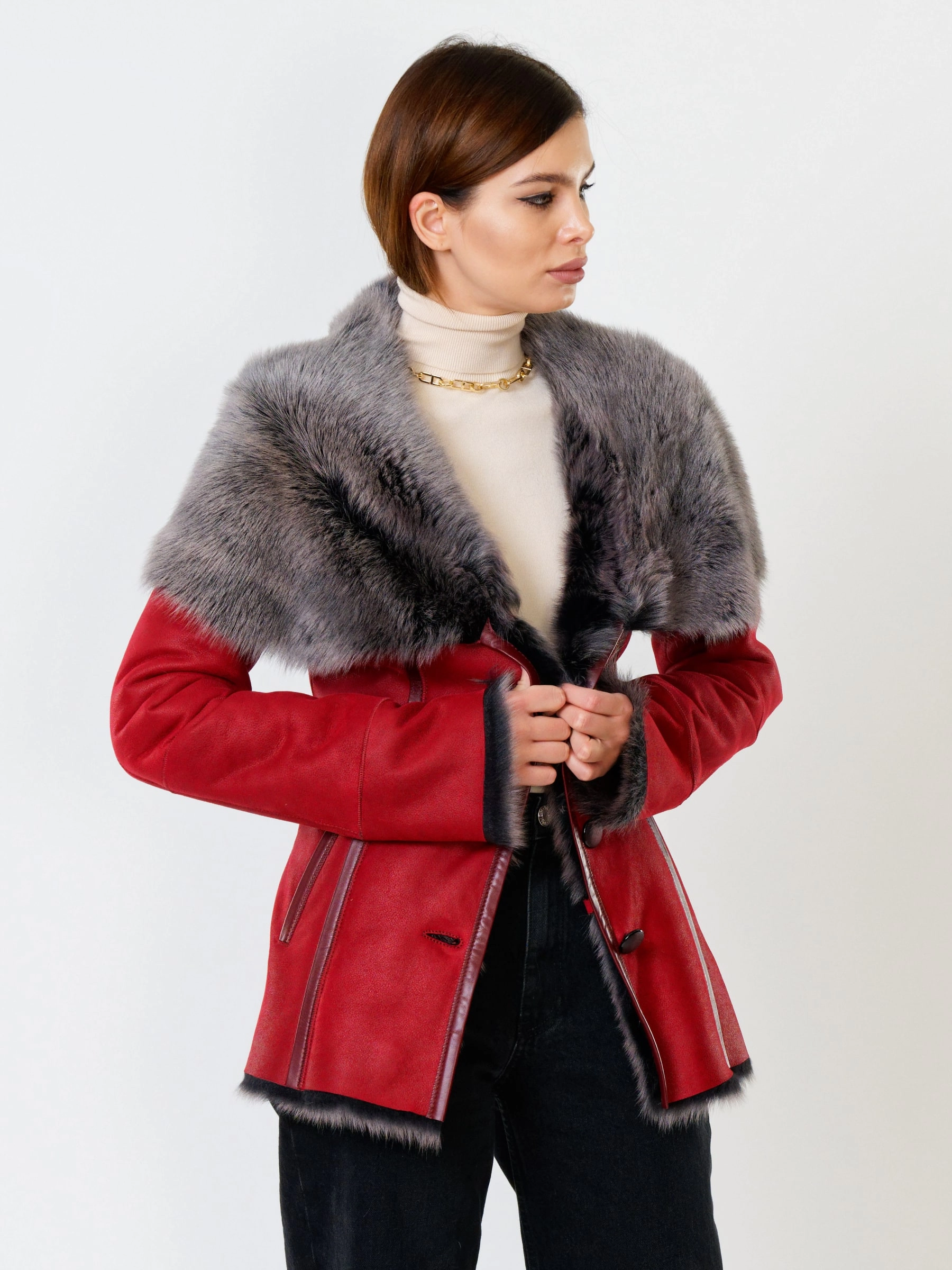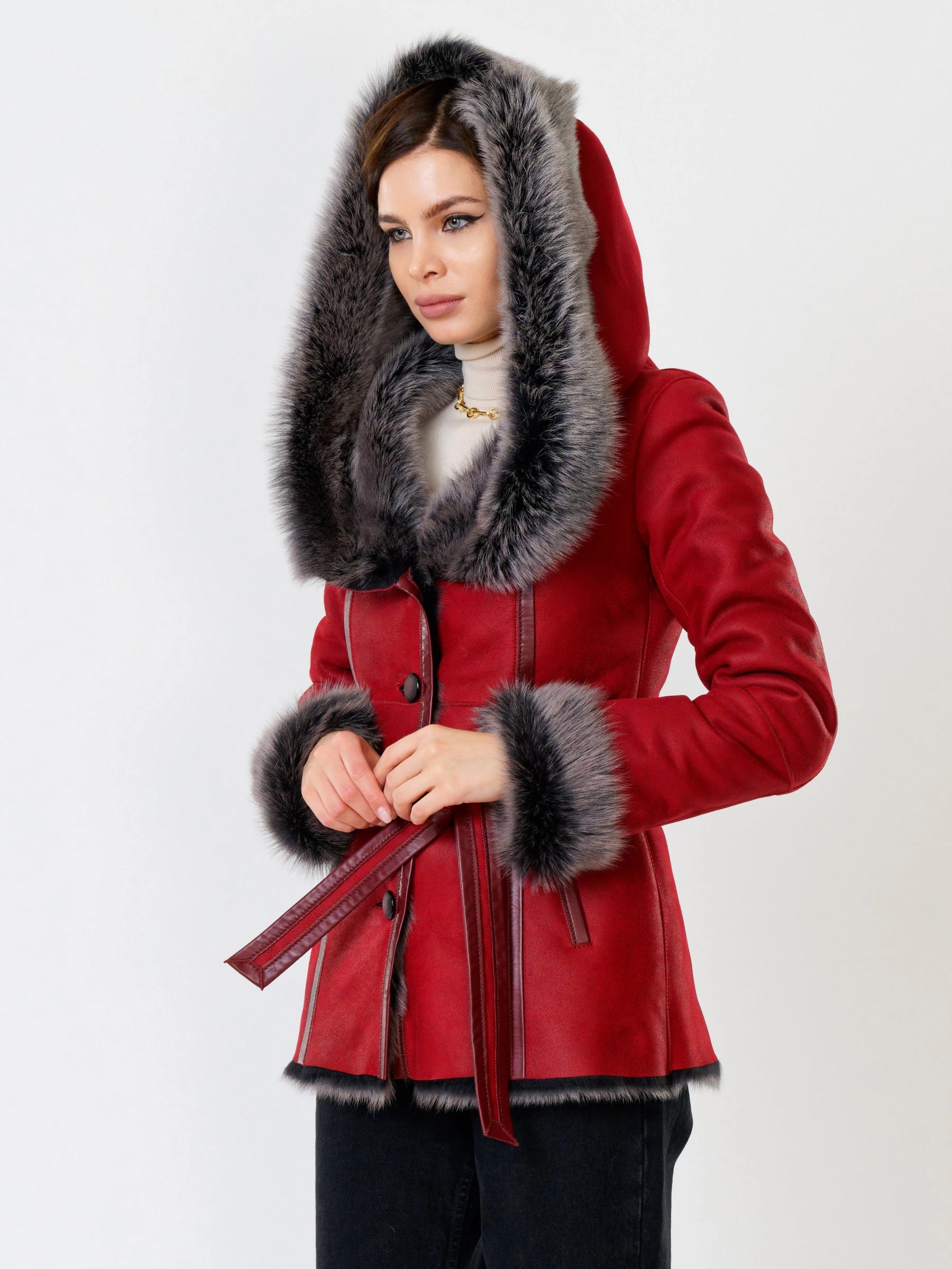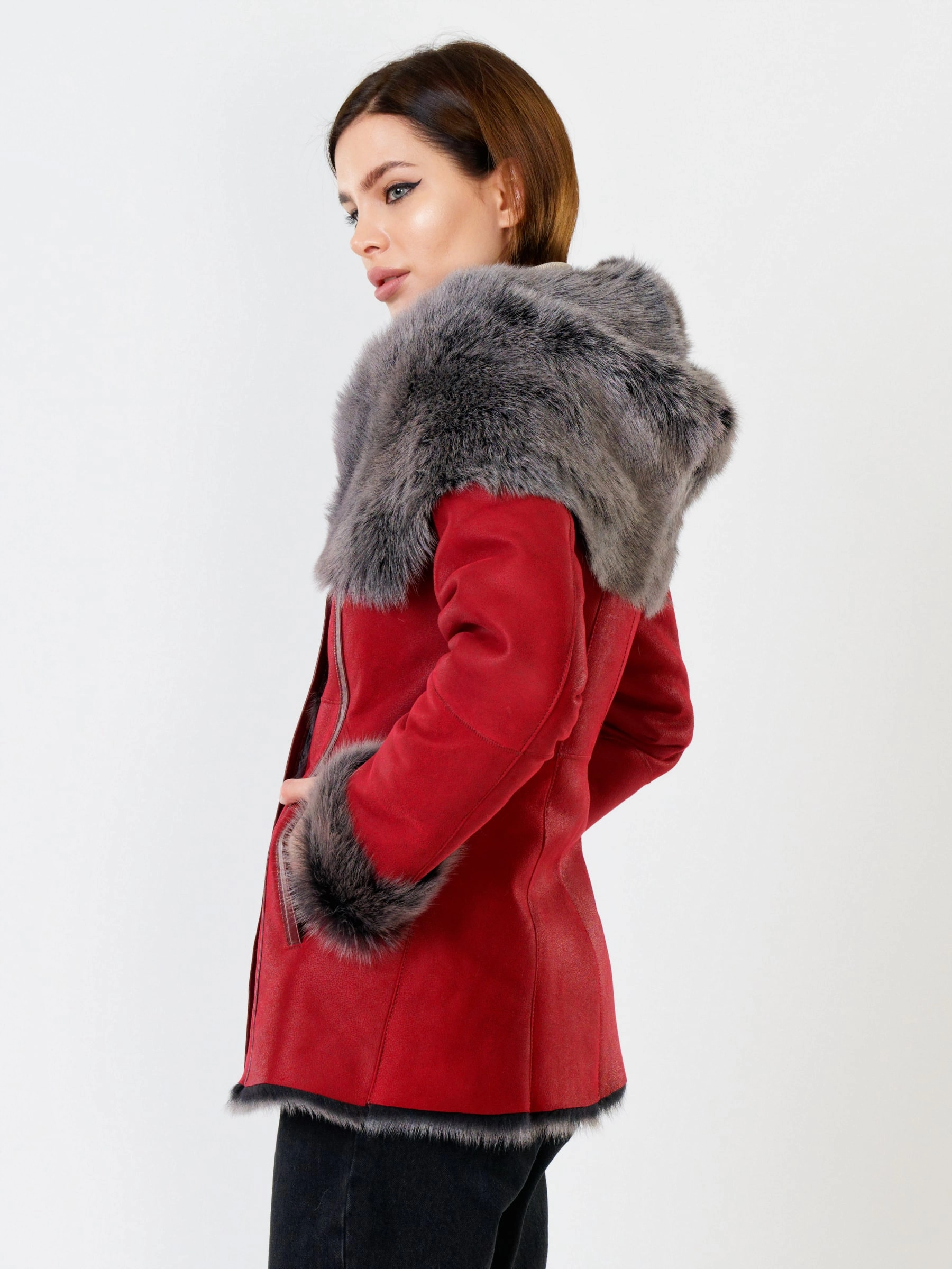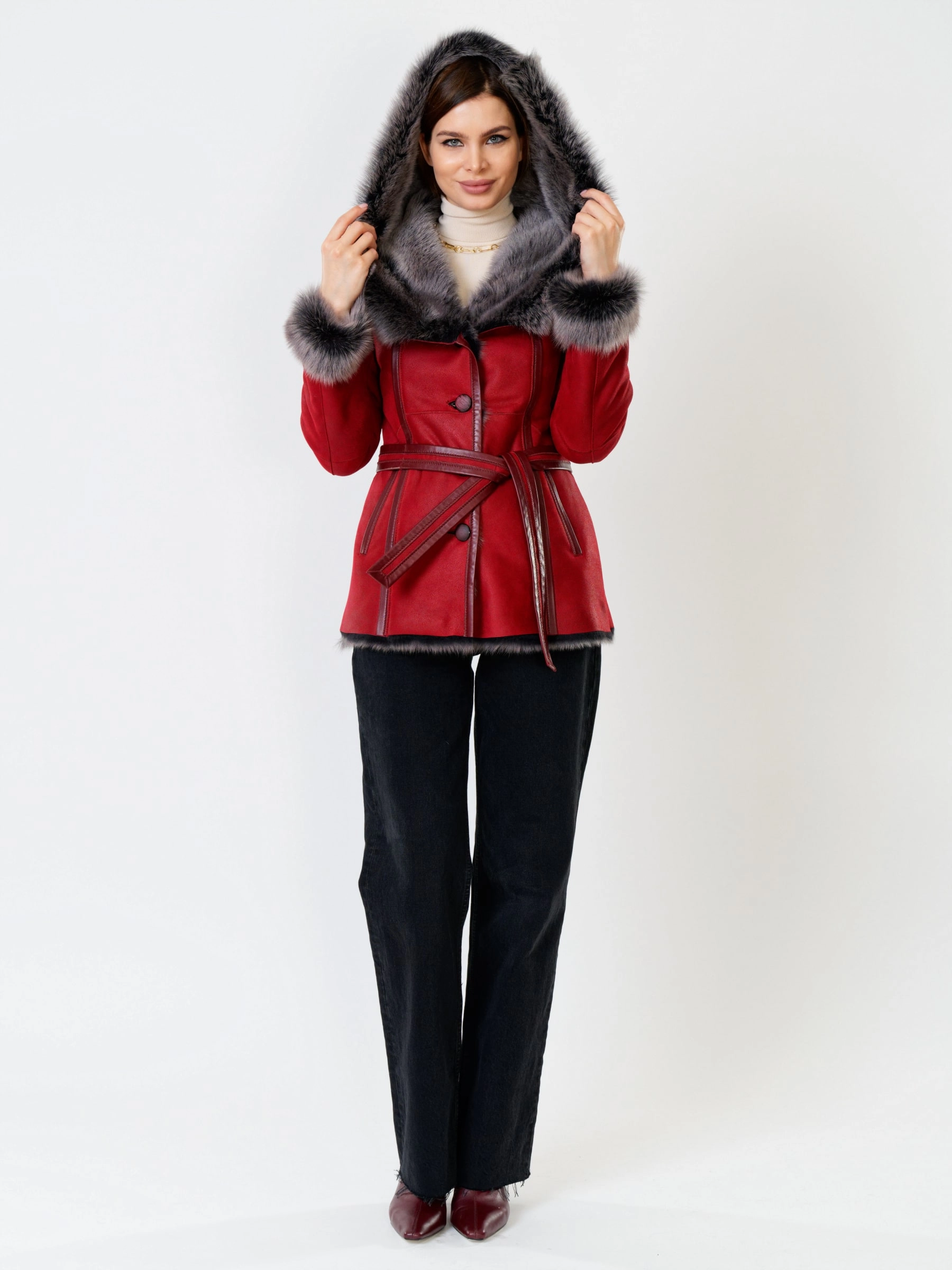 Короткая женская дубленка из тосканы с капюшоном 122, красная, размер 44, артикул 61862
