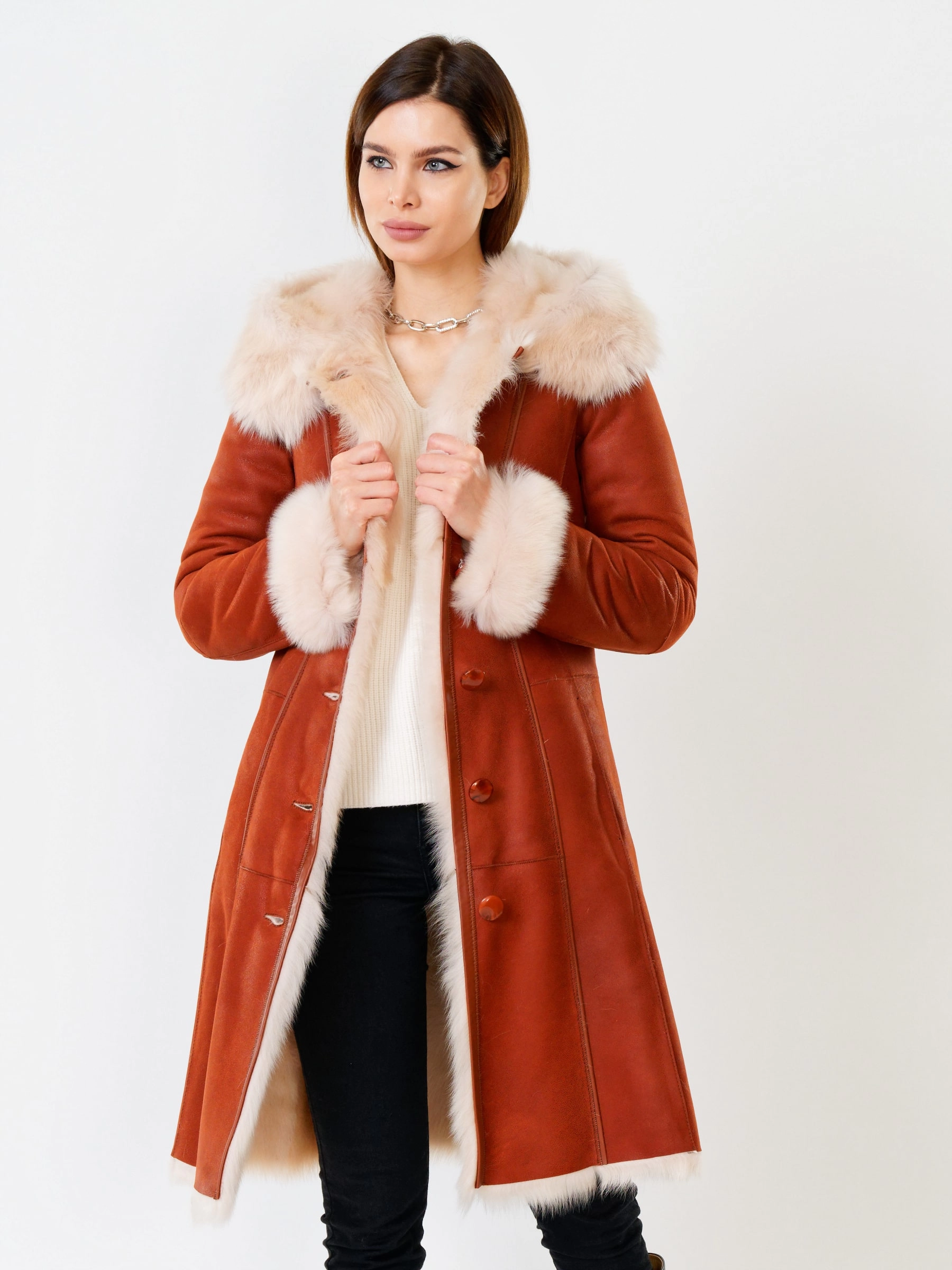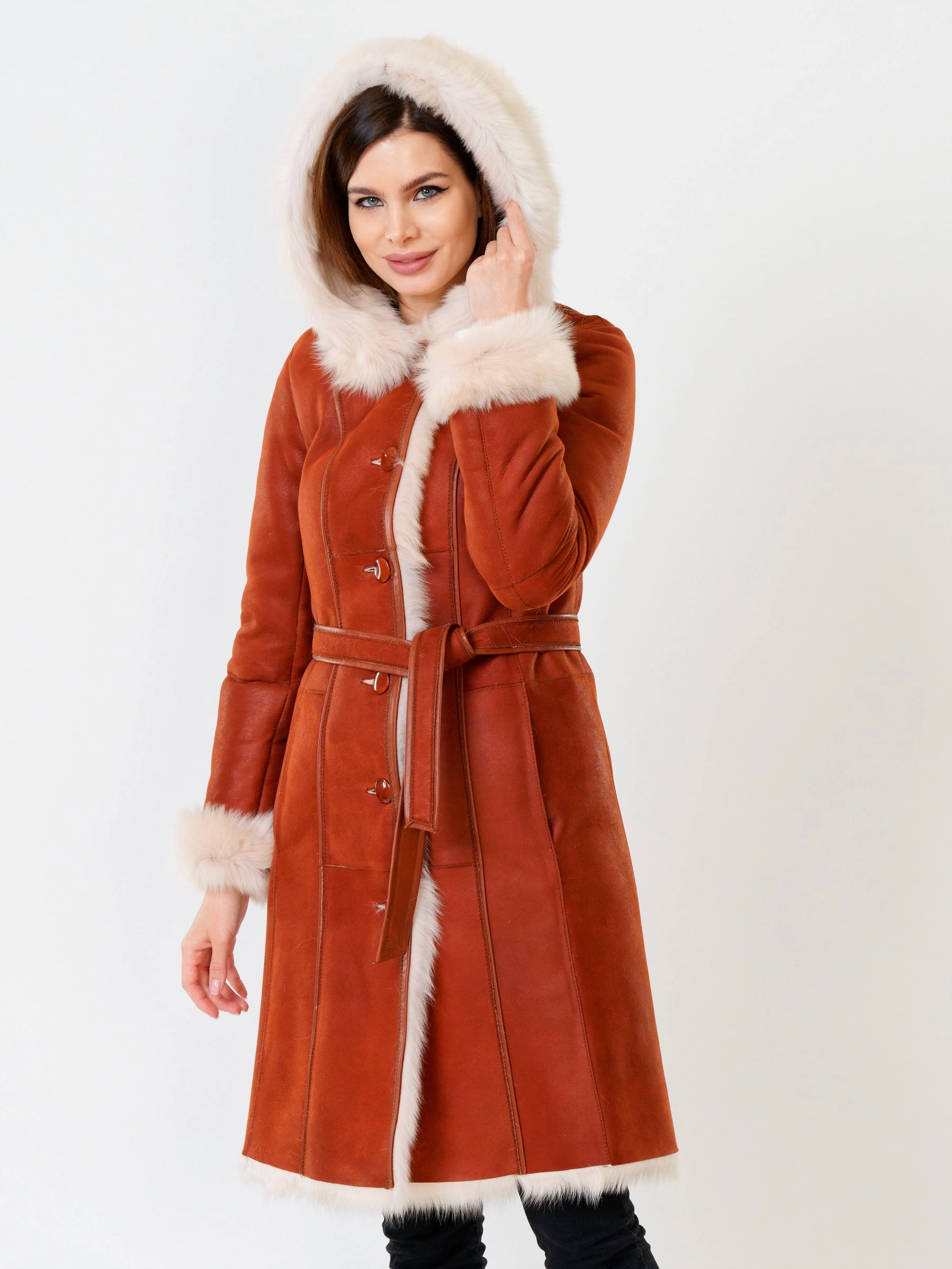 Длинная женская дубленка из тосканы с капюшоном 123нк, виски, размер 40, артикул 61891