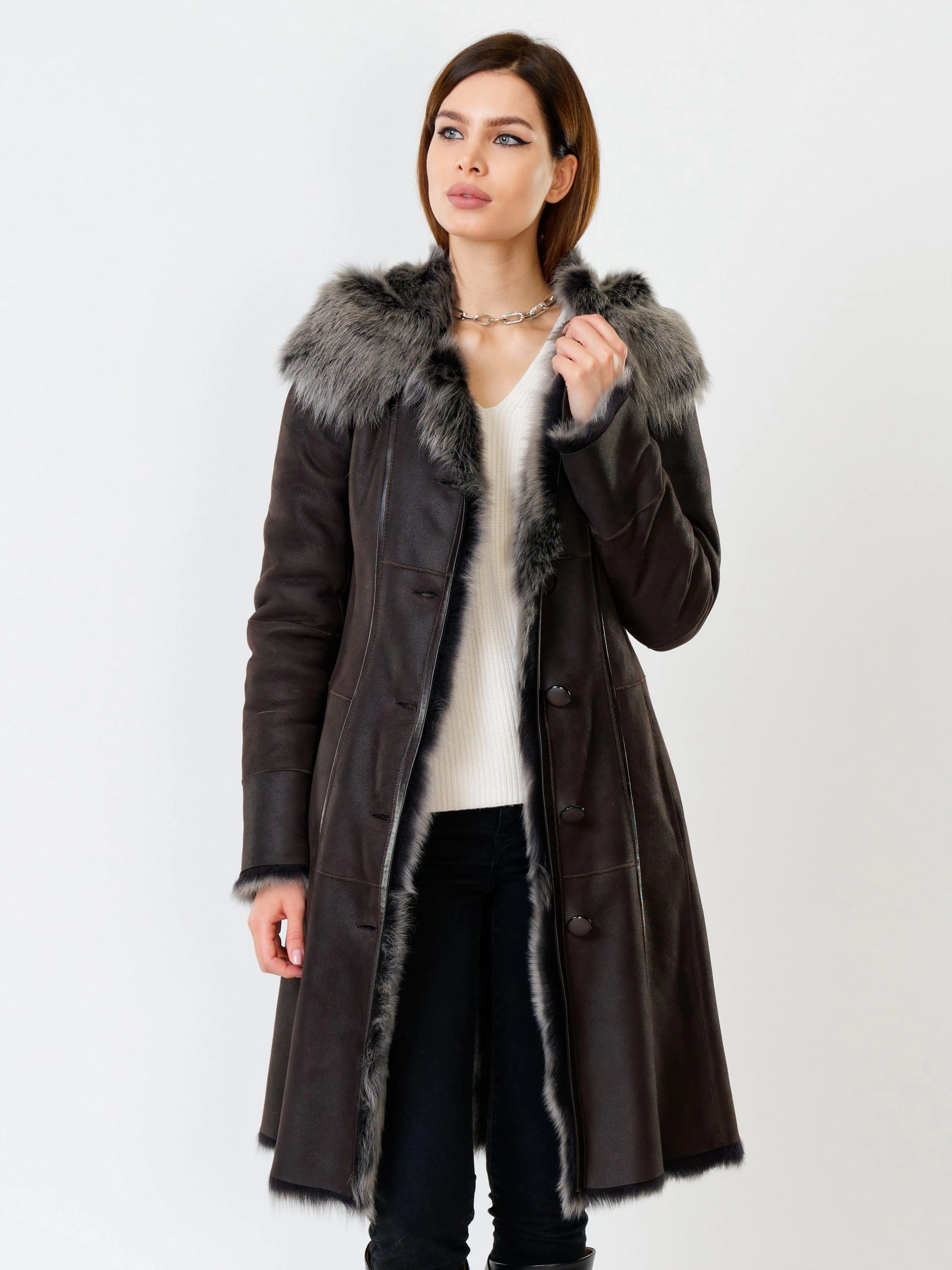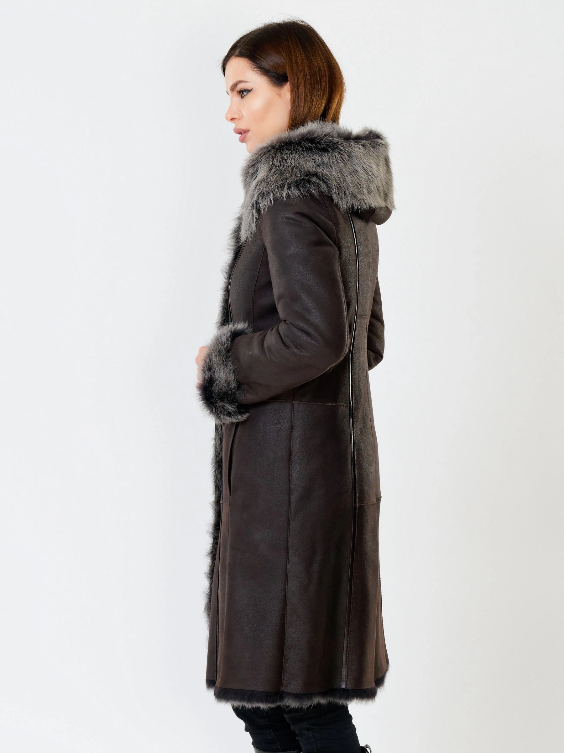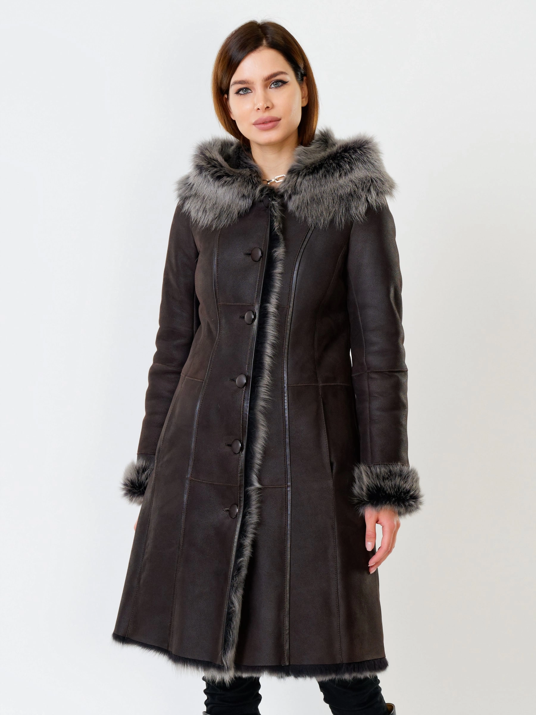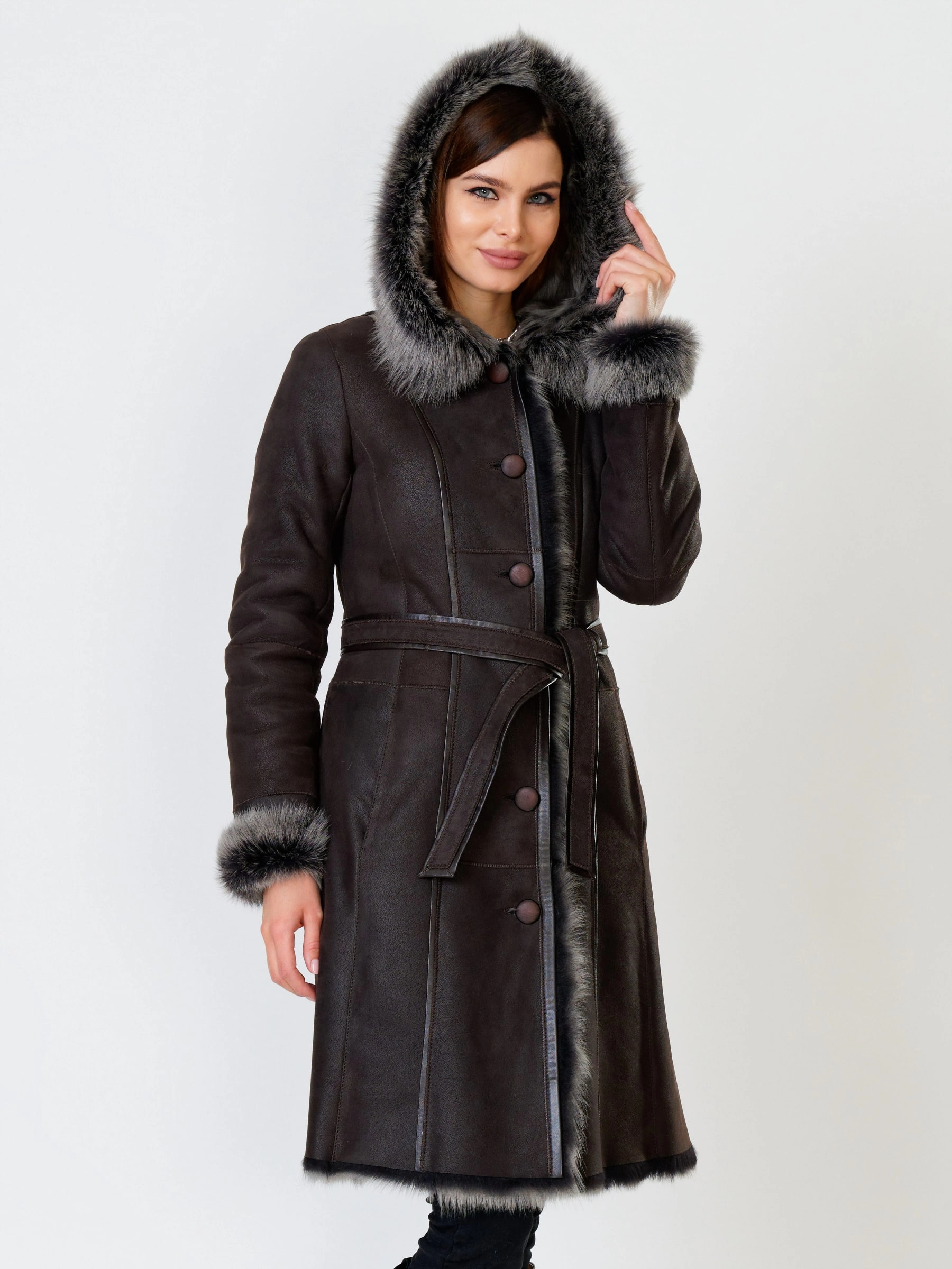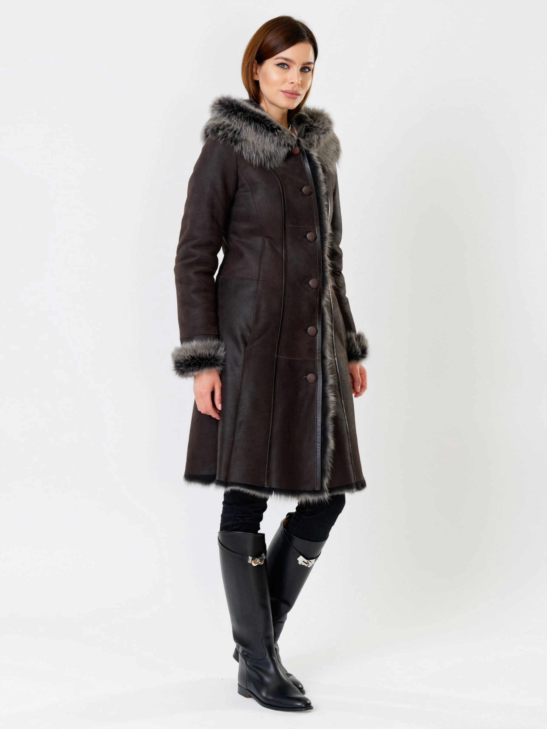 Длинная женская дубленка из тосканы с капюшоном 123нк, коричневая, размер 56, артикул 61901