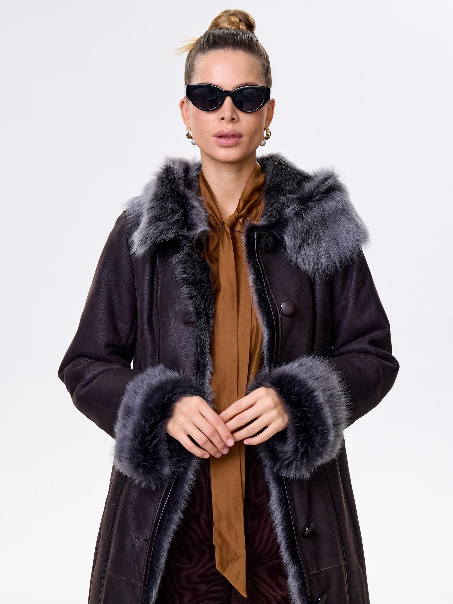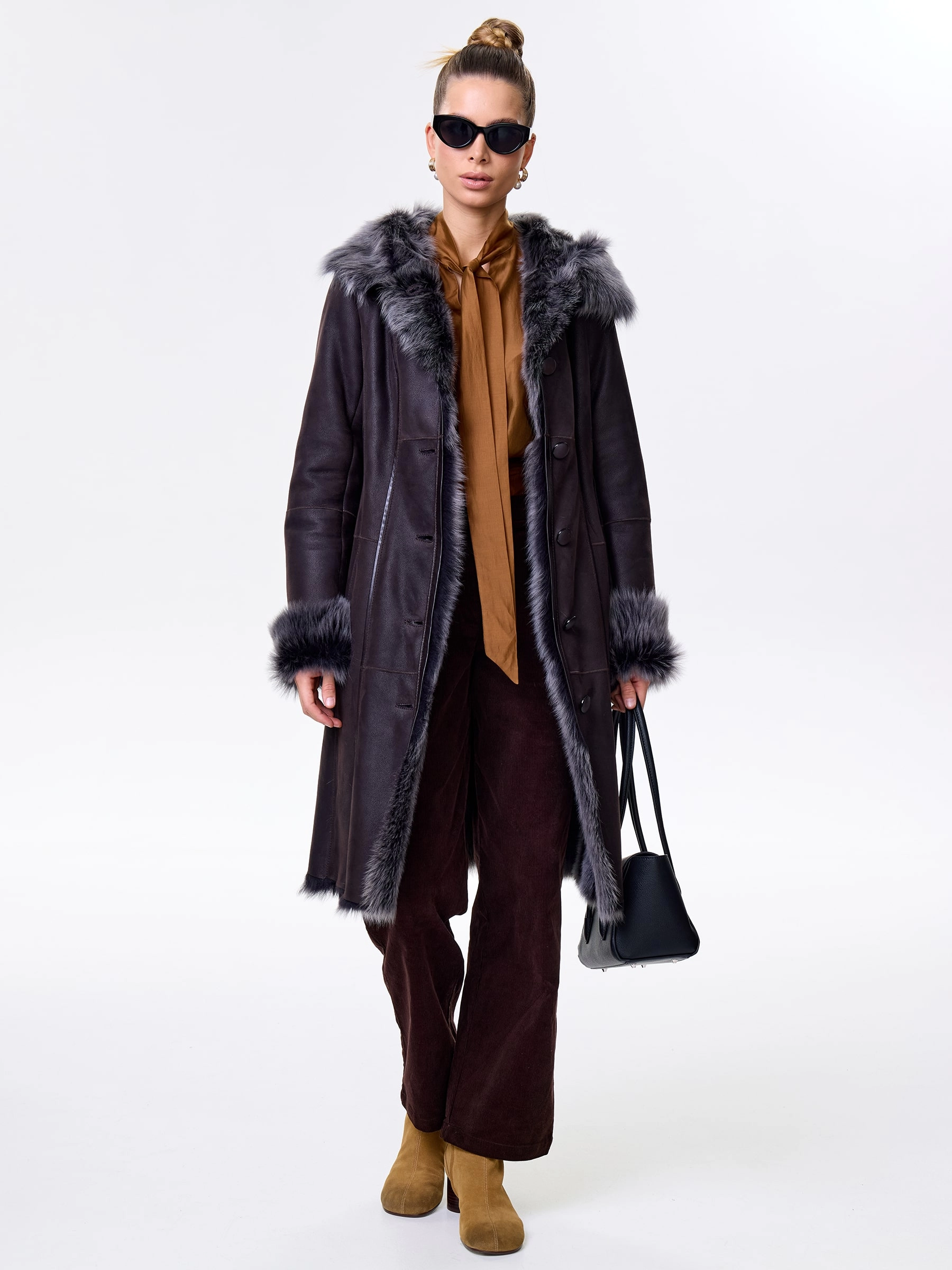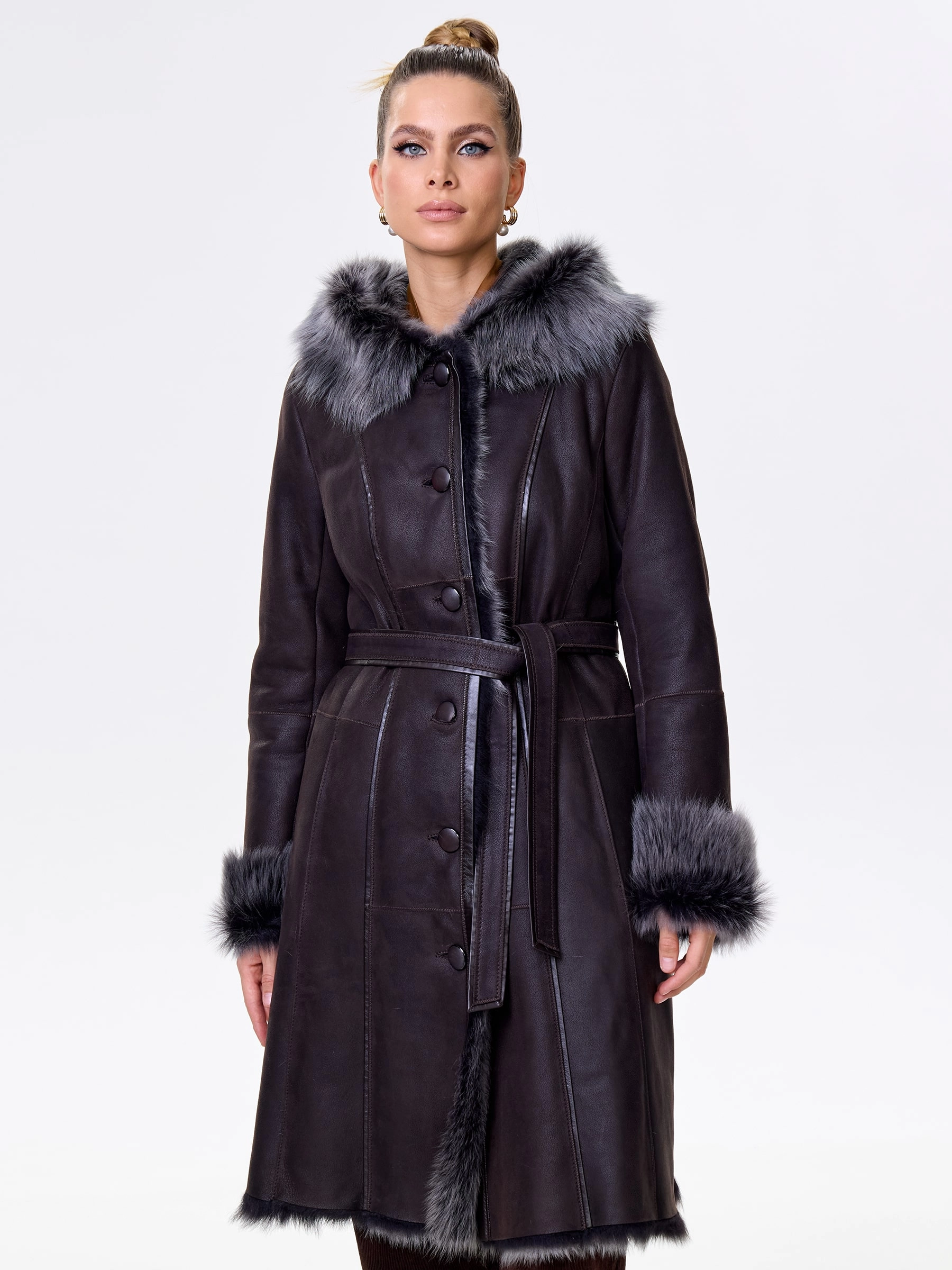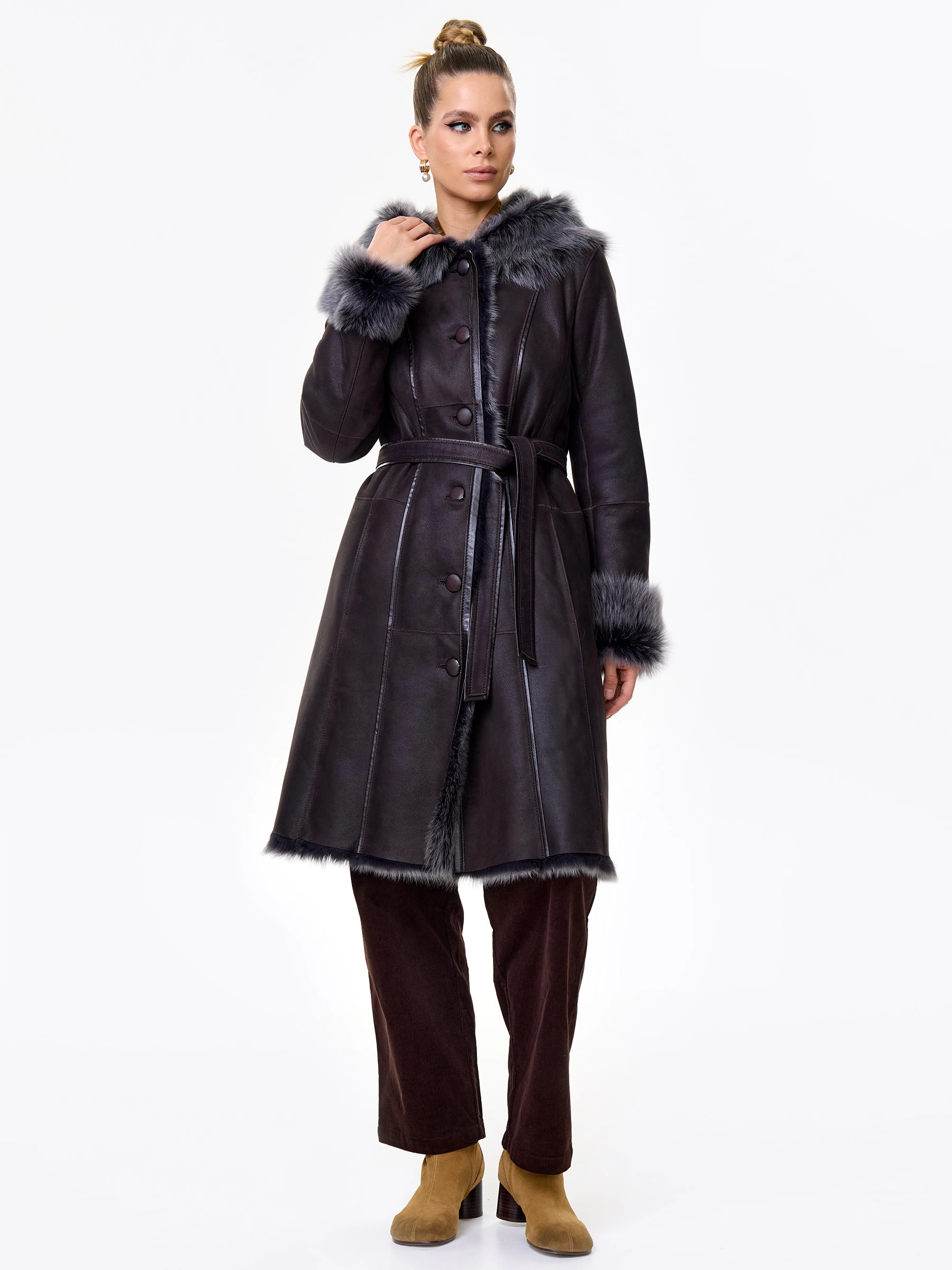Длинная дублёнка с капюшоном из тосканской овчины. Роскошная полуприлегающая модель премиум-класса: густой нежнейший мех глубокого оттенк подарит королевское тепло даже в лютый мороз, а объёмный капюшон создаст уютный кокон от непогоды или элегантно ниспадет на плечи. Защитное покрытие убережёт от царапин, а идеальная посадка по фигуре, боковые карманы и длинный пояс подчеркнут силуэт — сочетайте с чёрными джинсами, вязаными платьями или кожаными брюками для безупречного зимнего образа! Преимущество: короткая длина, полуприлегающий крой - это мобильность для города и элегантность для вечера.