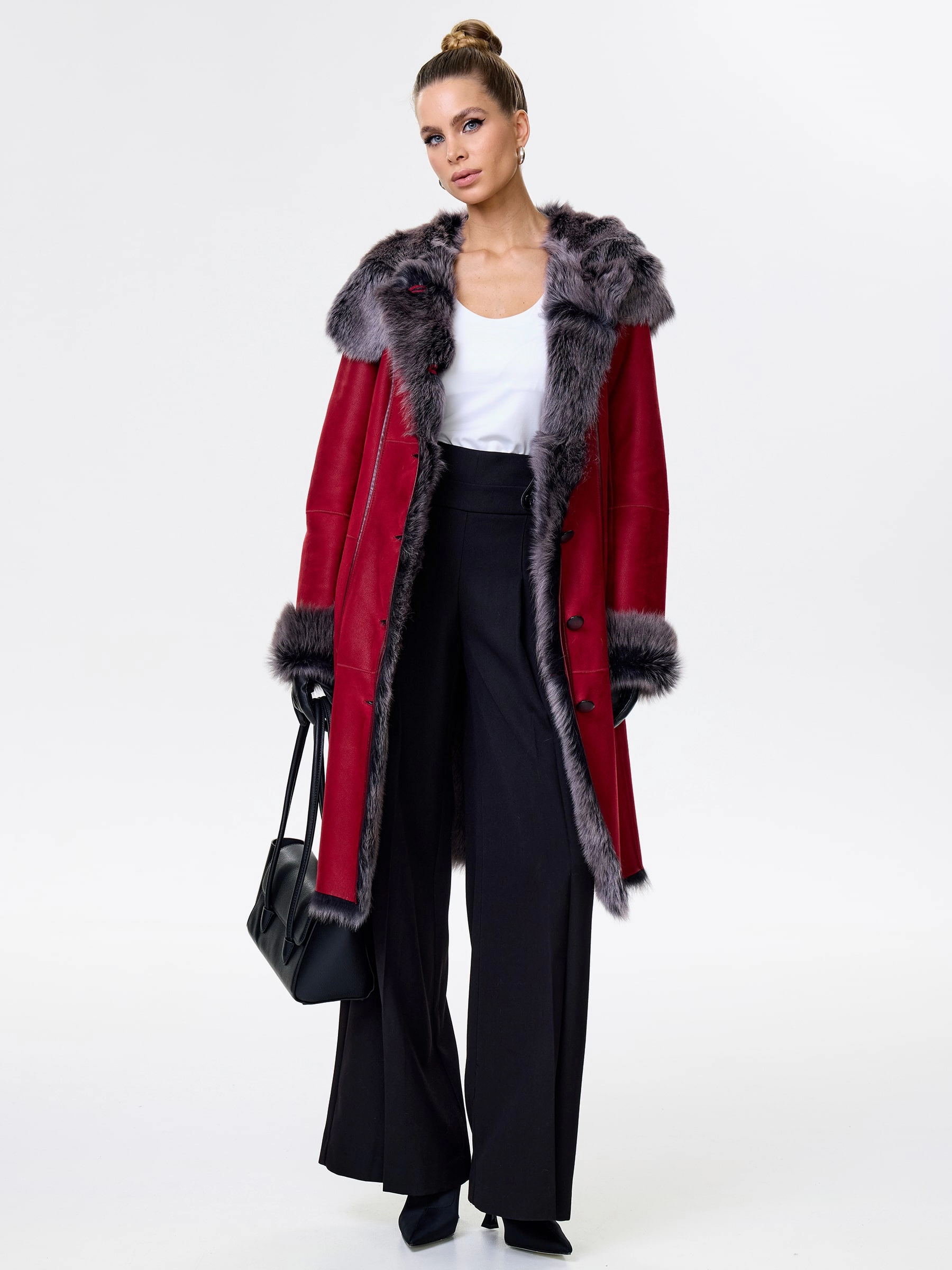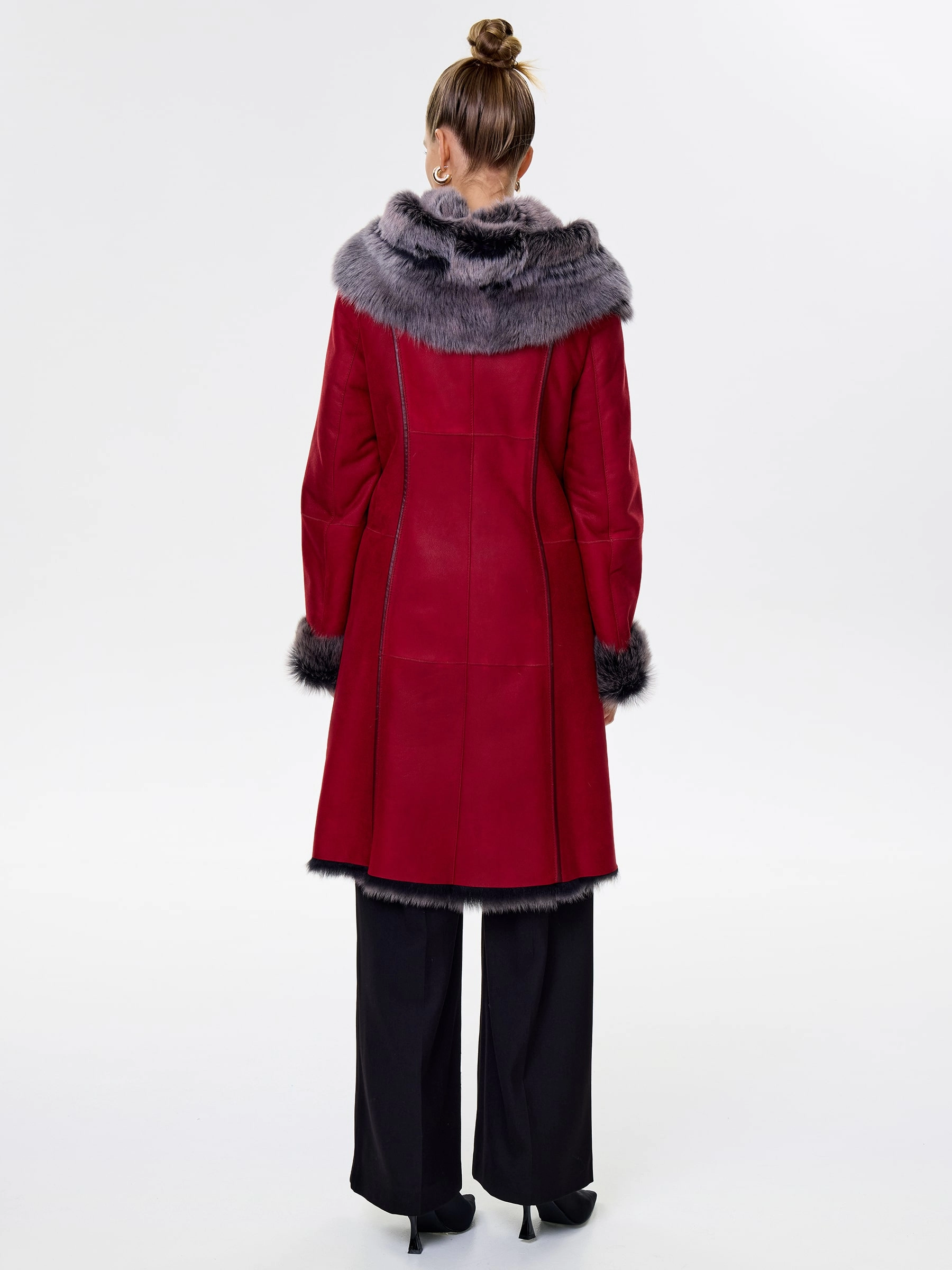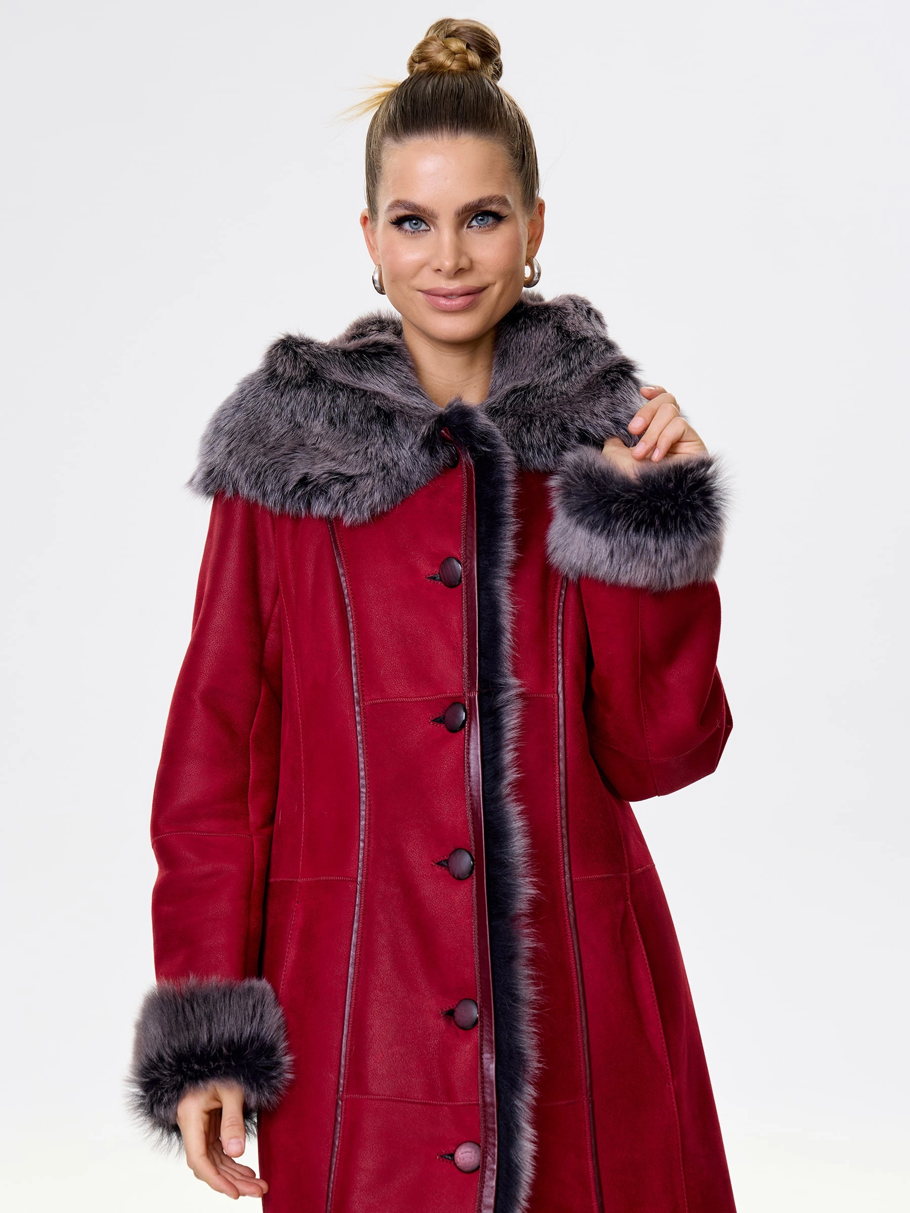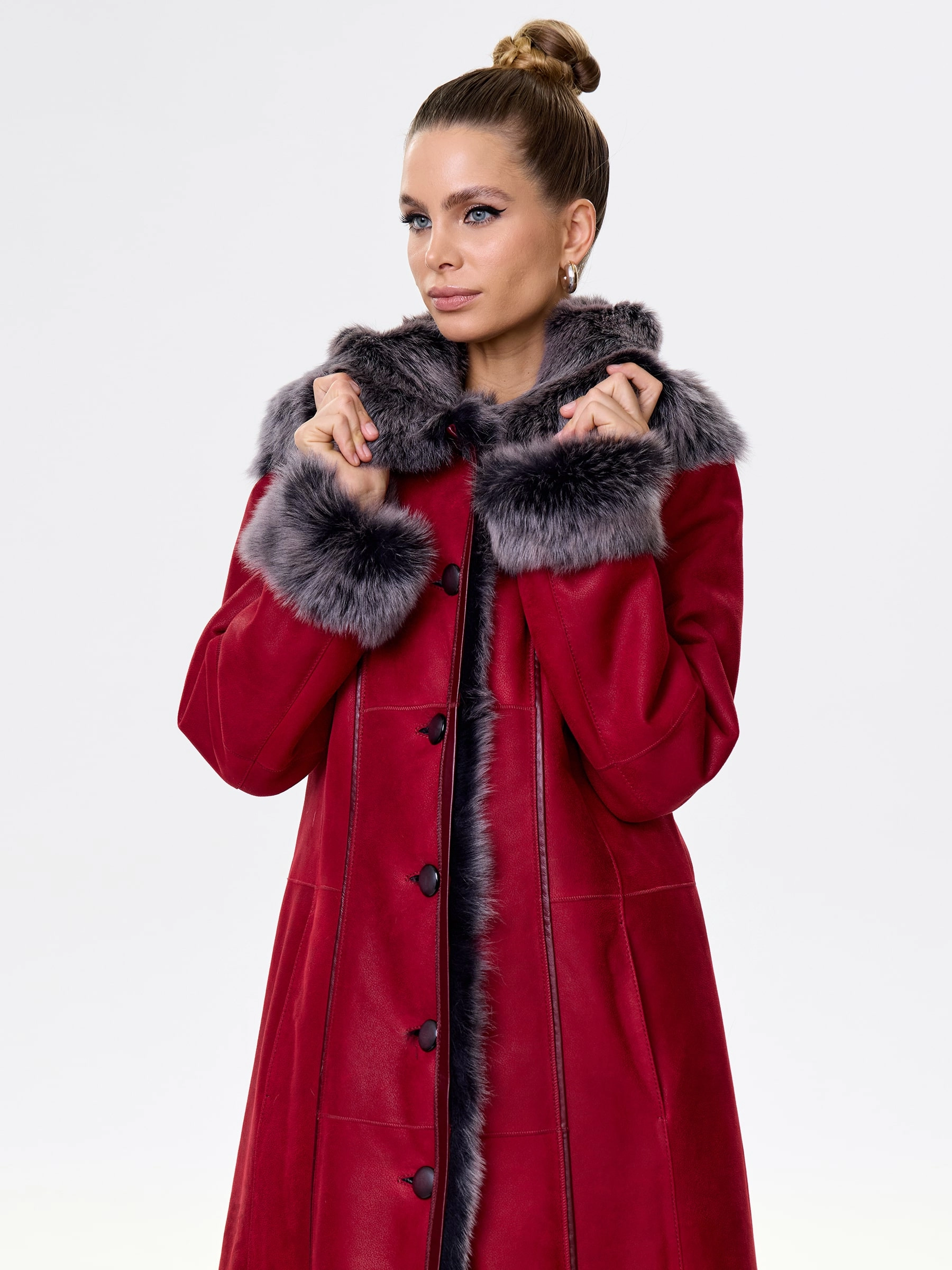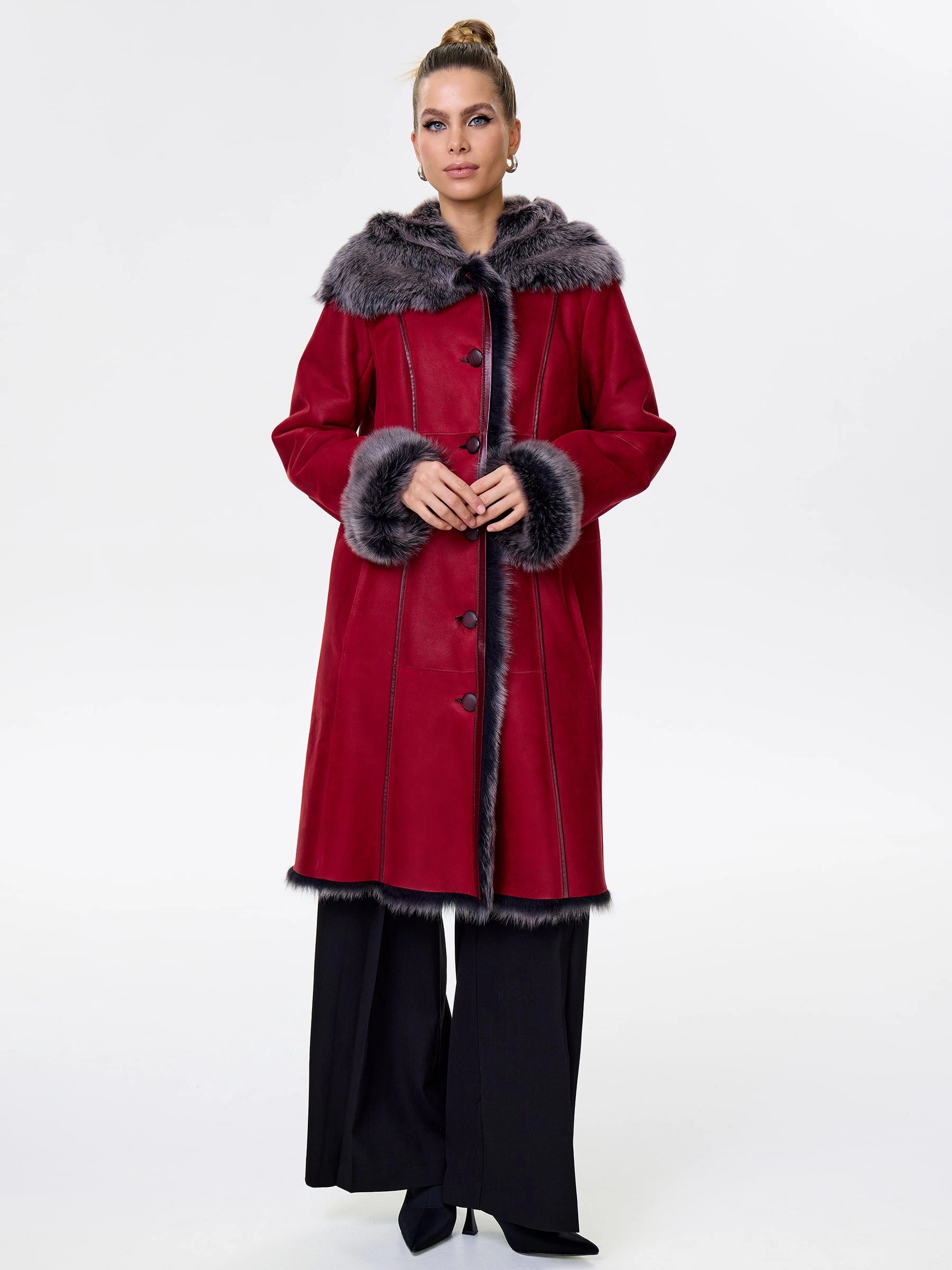 Длинная дублёнка с капюшоном из тосканской овчины. Роскошная полуприлегающая модель премиум-класса: густой нежнейший мех глубокого оттенк подарит королевское тепло даже в лютый мороз, а объёмный капюшон создаст уютный кокон от непогоды или элегантно ниспадет на плечи. Защитное покрытие убережёт от царапин, а идеальная посадка по фигуре, боковые карманы и длинный пояс подчеркнут силуэт — сочетайте с чёрными джинсами, вязаными платьями или кожаными брюками для безупречного зимнего образа! Преимущество: короткая длина, полуприлегающий крой - это мобильность для города и элегантность для вечера.