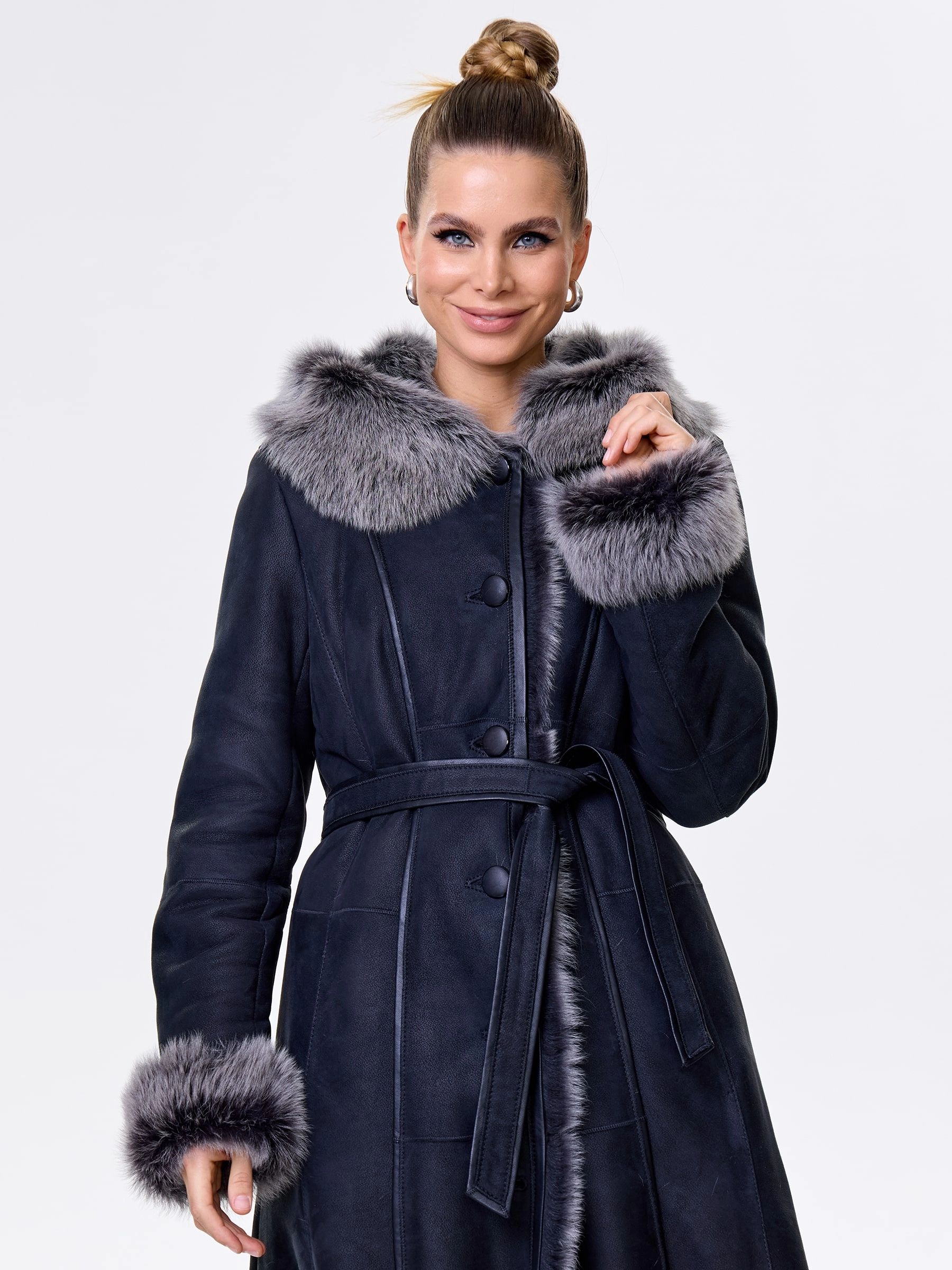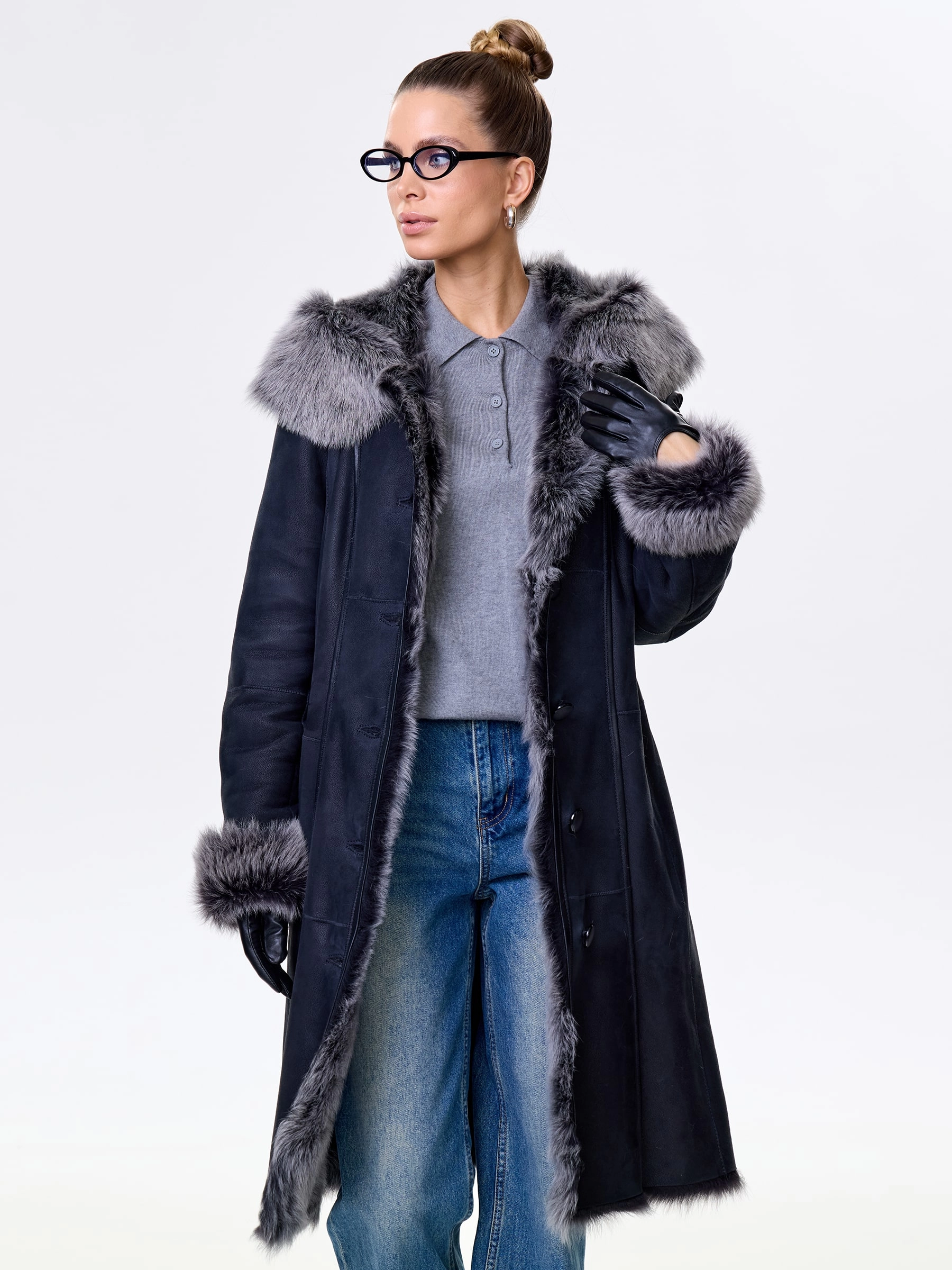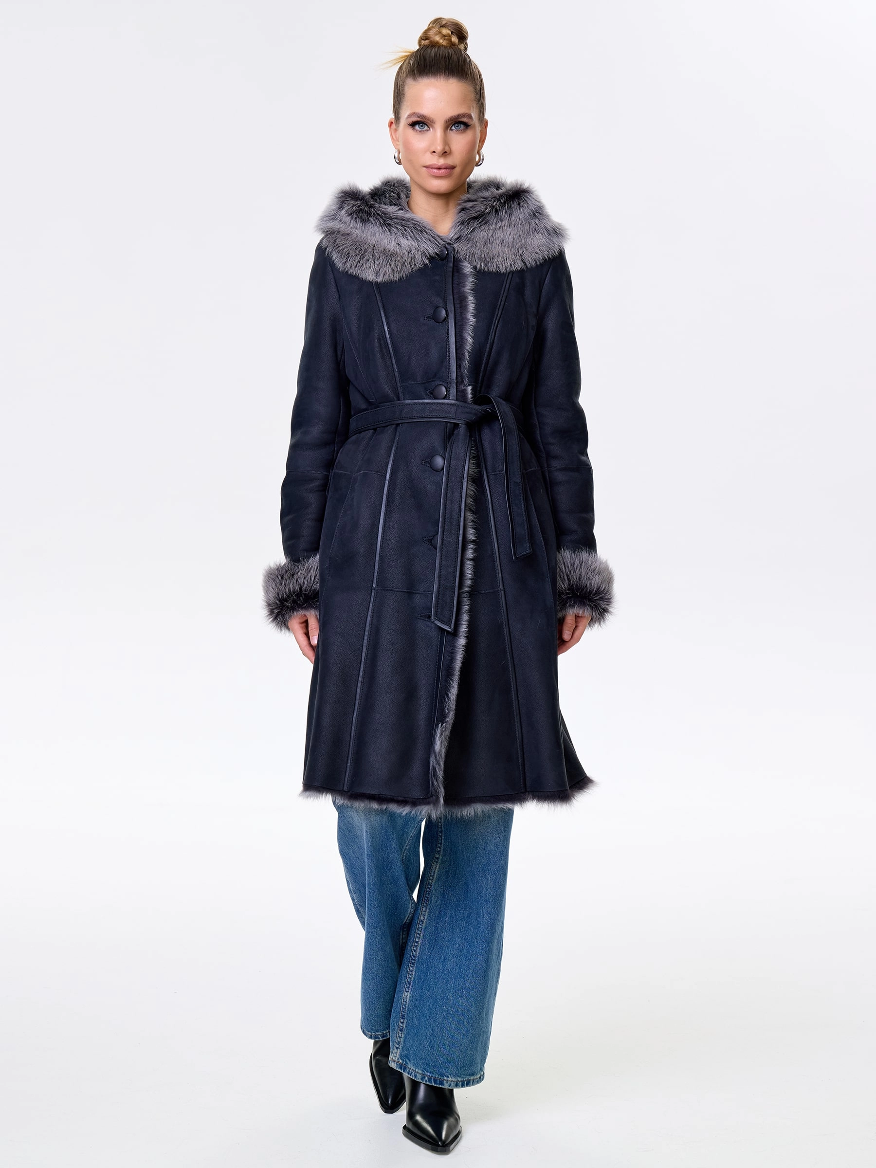 Длинная дублёнка с капюшоном из тосканской овчины — роскошная полуприлегающая модель премиум-класса: густой нежнейший мех глубокого оттенка подарит королевское тепло даже в лютый мороз, а объёмный капюшон создаст уютный кокон от непогоды или элегантно ниспадет на плечи. Длина 101 см — это безупречная защита в холода: дубленка закрывает колени и не даёт ветру продувать, создавая эффектный вертикальный силуэт, визуально вытягивающий фигуру. Защитное покрытие убережёт от царапин, кожаная отделка карманов и борта добавит статусности, а идеальная посадка по фигуре, боковые карманы и длинный пояс подчеркнут силуэт. Совет стилиста: Максимальная длина требует особого баланса — носите дубленку с обувью на устойчивом каблуке или танкетке (ботильоны или казаки), чтобы добавить роста и стройности. Под пояс надевайте не слишком объемные вещи: идеально подойдут облегающие джемперы, водолазки и узкие кожаные брюки или джинсы-скинни.
