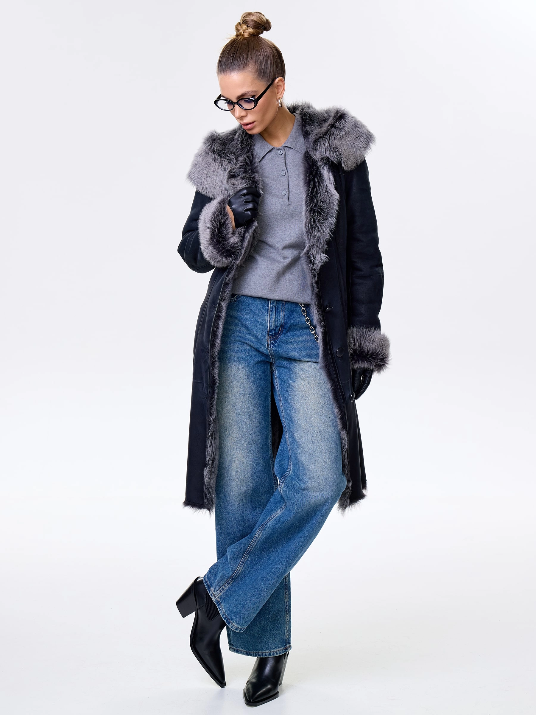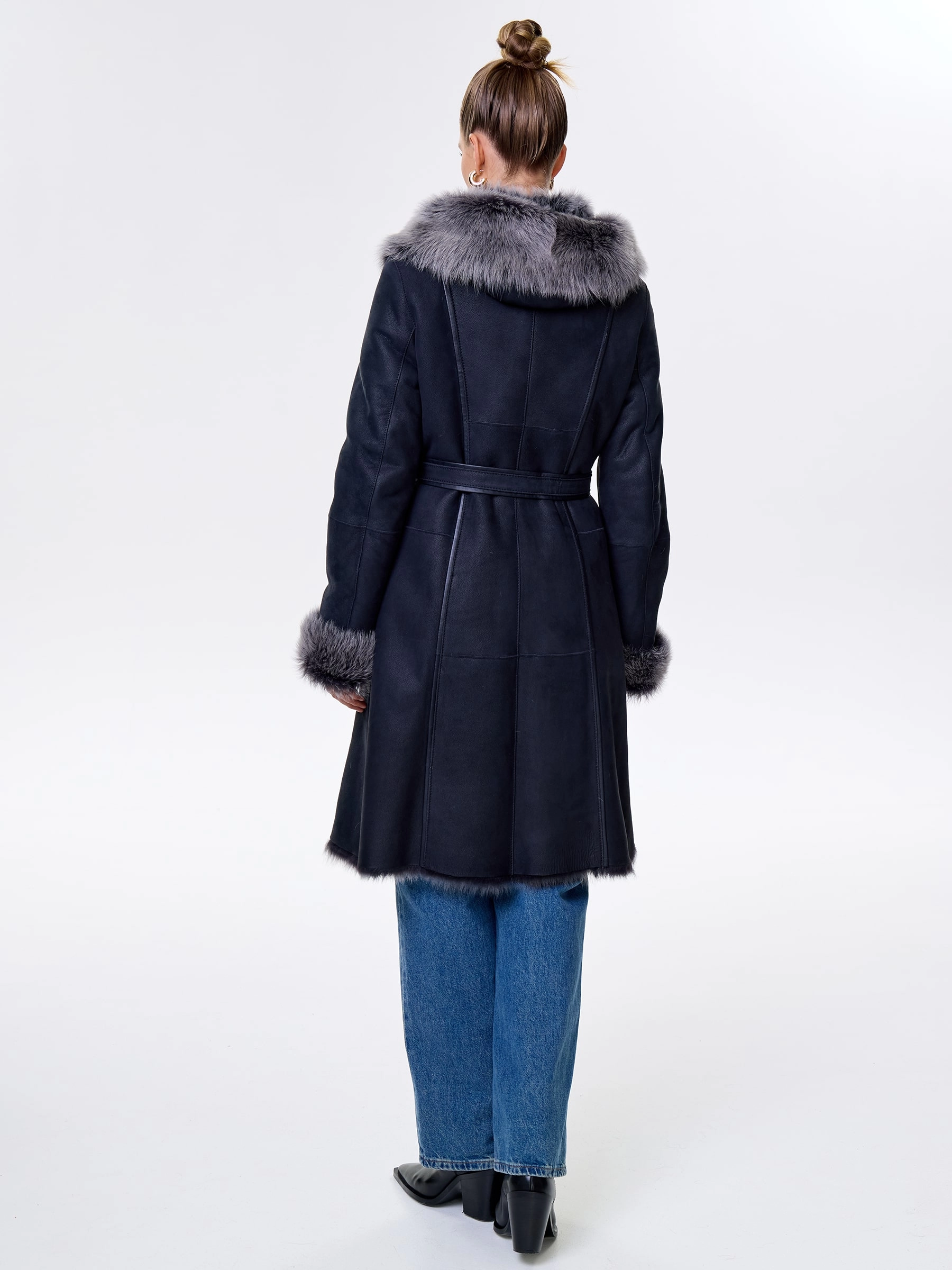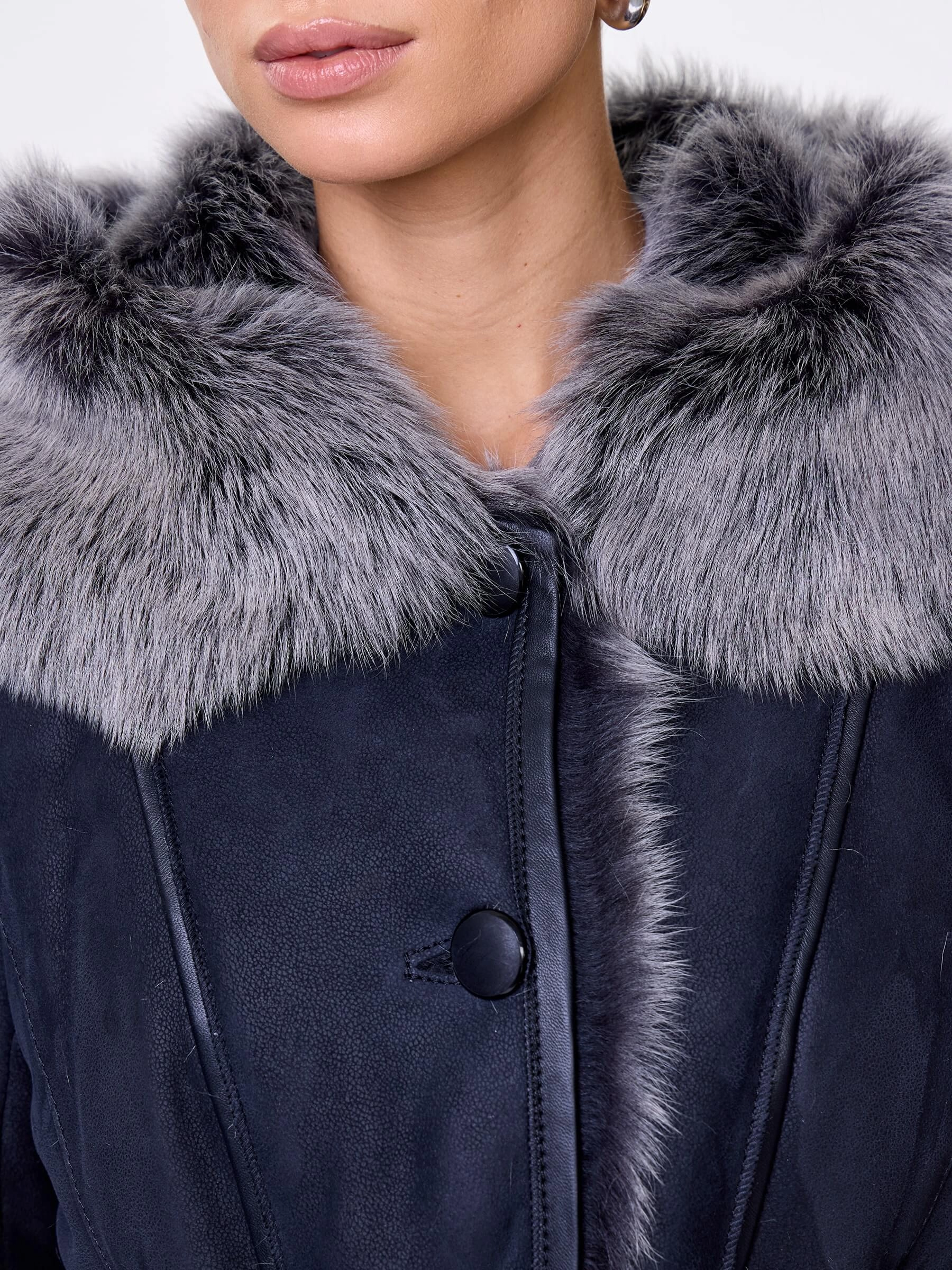 Длинная дублёнка с капюшоном из тосканской овчины — роскошная полуприлегающая модель премиум-класса: густой нежнейший мех глубокого оттенка подарит королевское тепло даже в лютый мороз, а объёмный капюшон создаст уютный кокон от непогоды или элегантно ниспадет на плечи. Длина 101 см — это безупречная защита в холода: дубленка закрывает колени и не даёт ветру продувать, создавая эффектный вертикальный силуэт, визуально вытягивающий фигуру. Защитное покрытие убережёт от царапин, кожаная отделка карманов и борта добавит статусности, а идеальная посадка по фигуре, боковые карманы и длинный пояс подчеркнут силуэт. Совет стилиста: Максимальная длина требует особого баланса — носите дубленку с обувью на устойчивом каблуке или танкетке (ботильоны или казаки), чтобы добавить роста и стройности. Под пояс надевайте не слишком объемные вещи: идеально подойдут облегающие джемперы, водолазки и узкие кожаные брюки или джинсы-скинни.