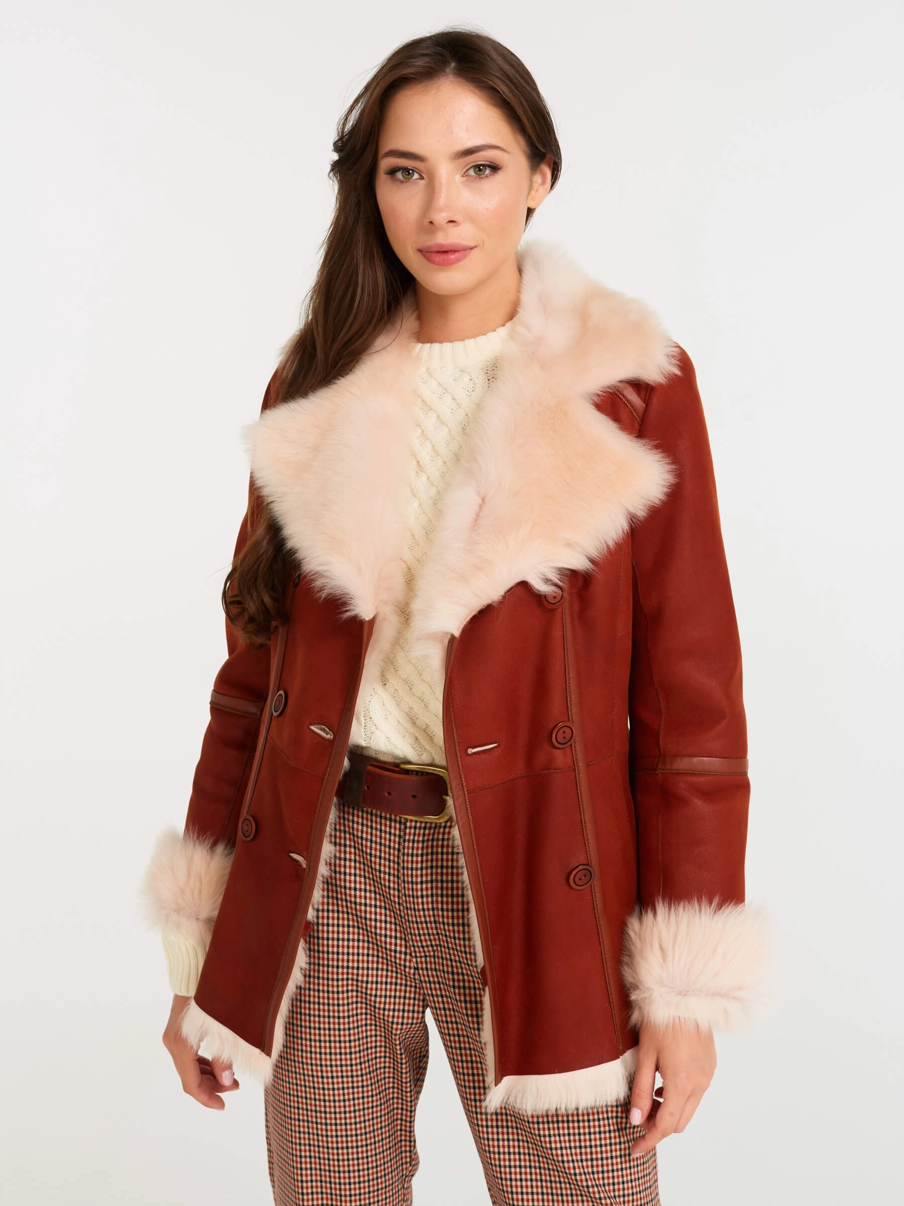 Представляем вам безупречную короткую двубортную дубленку из премиальной овчины тоскана в благородном оттенке виски — воплощение классической элегантности и бескомпромиссного комфорта для прохладного сезона. Модель полуприлегающего силуэта длиной 70 сантиметров с английским воротником и втачным рукавом подчеркивает женственность линий, сохраняя при этом свободу движений и уют. Роскошная тосканская овчина отличается особой текстурой с длинным, шелковистым и блестящим ворсом, который придает глубокому оттенку виски визуальное богатство и тактильную мягкость. Продуманные детали делают эту дубленку не только стильной, но и функциональной: два врезных кармана согреют руки, регулируемые манжеты позволяют адаптировать посадку рукава, а длинный пояс дает возможность подчеркнуть талию и менять силуэт по настроению. Элегантная двубортная застежка на пуговицы завершает классический образ.