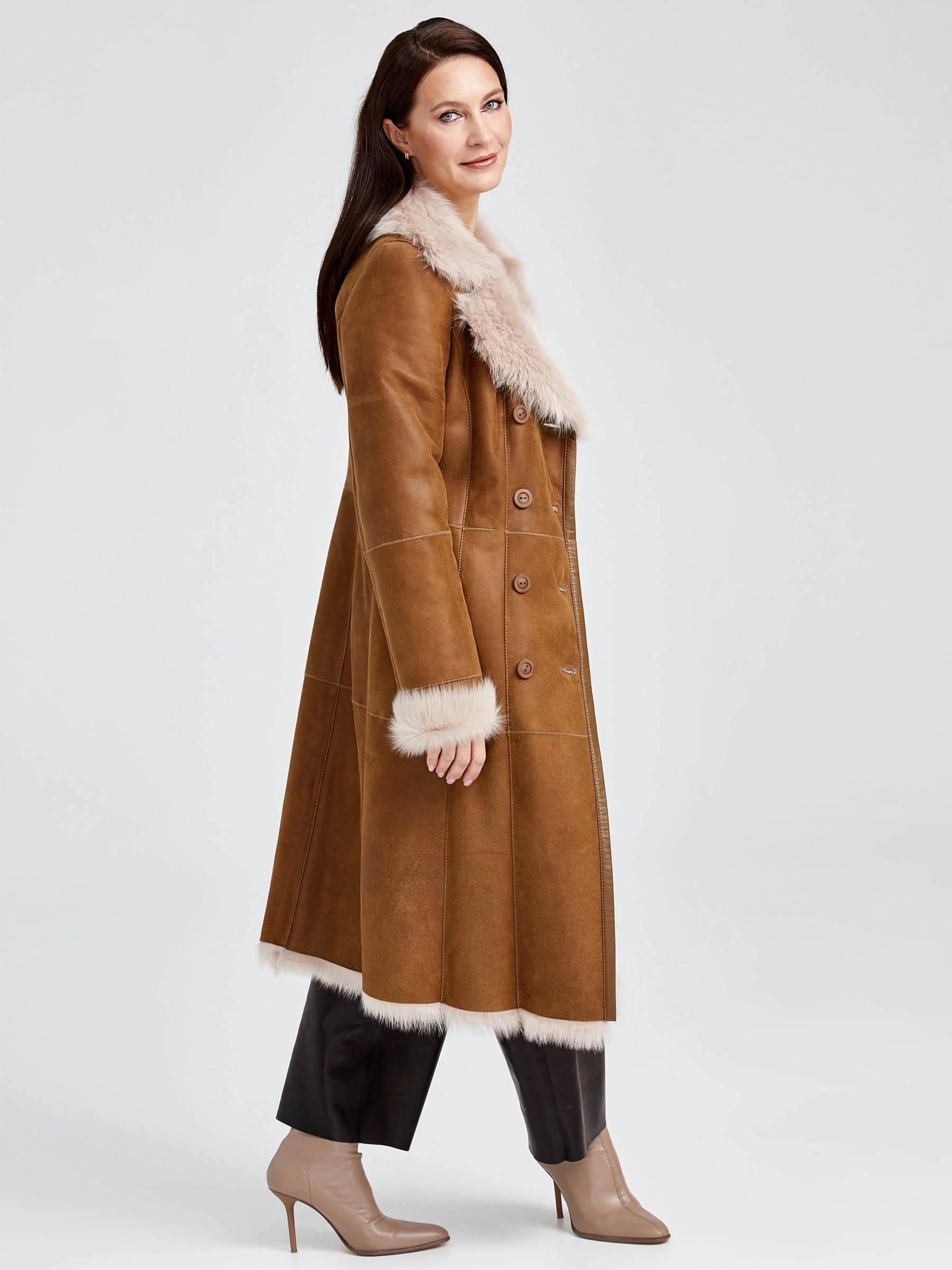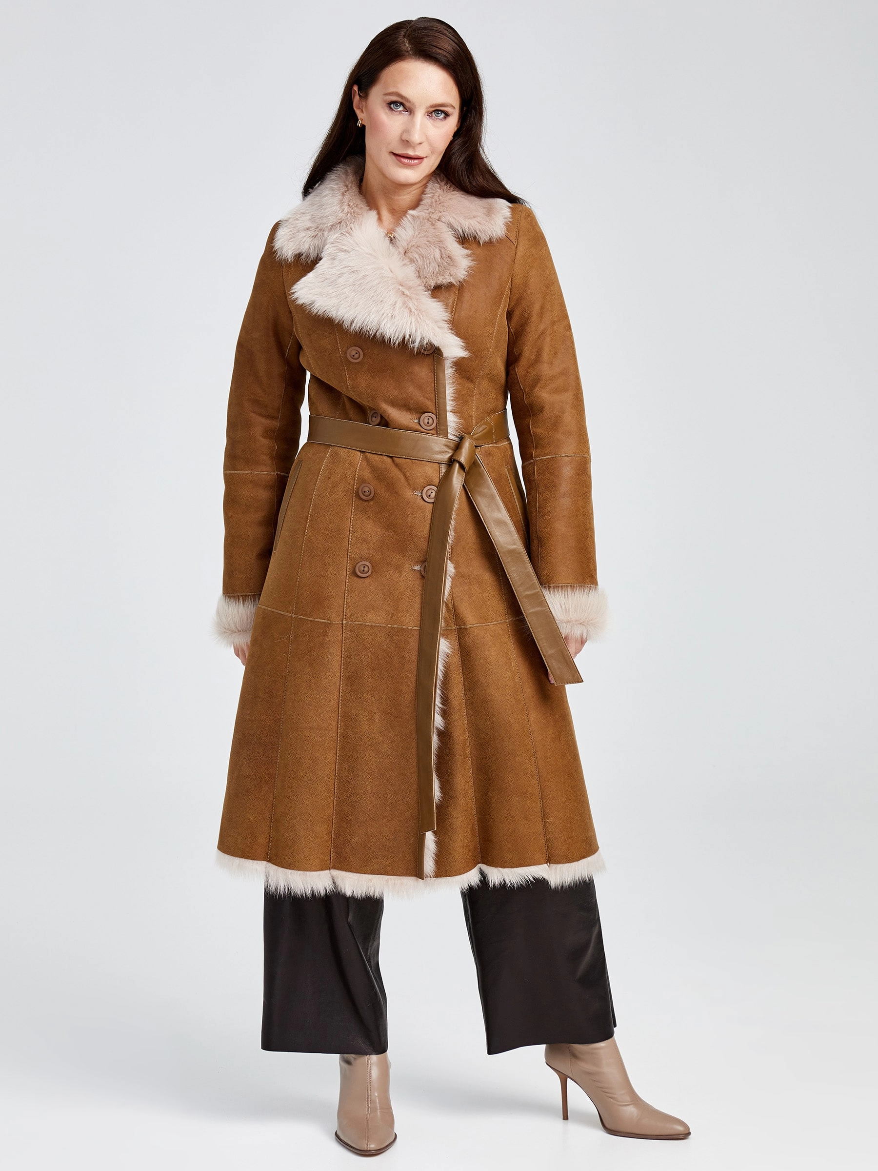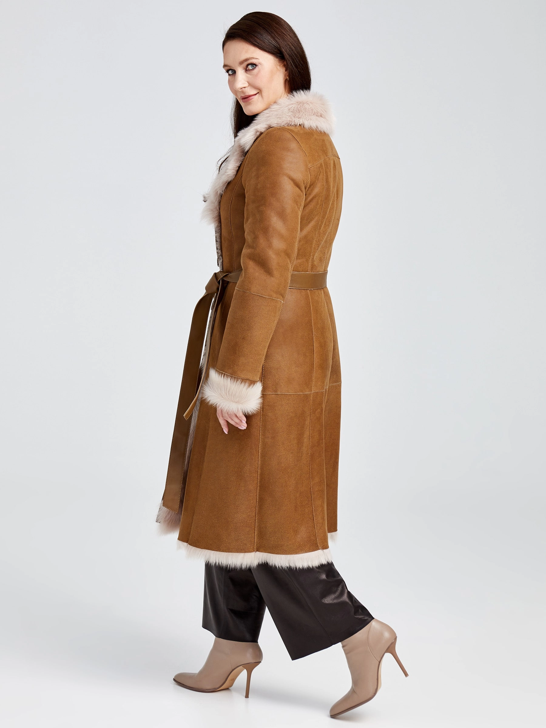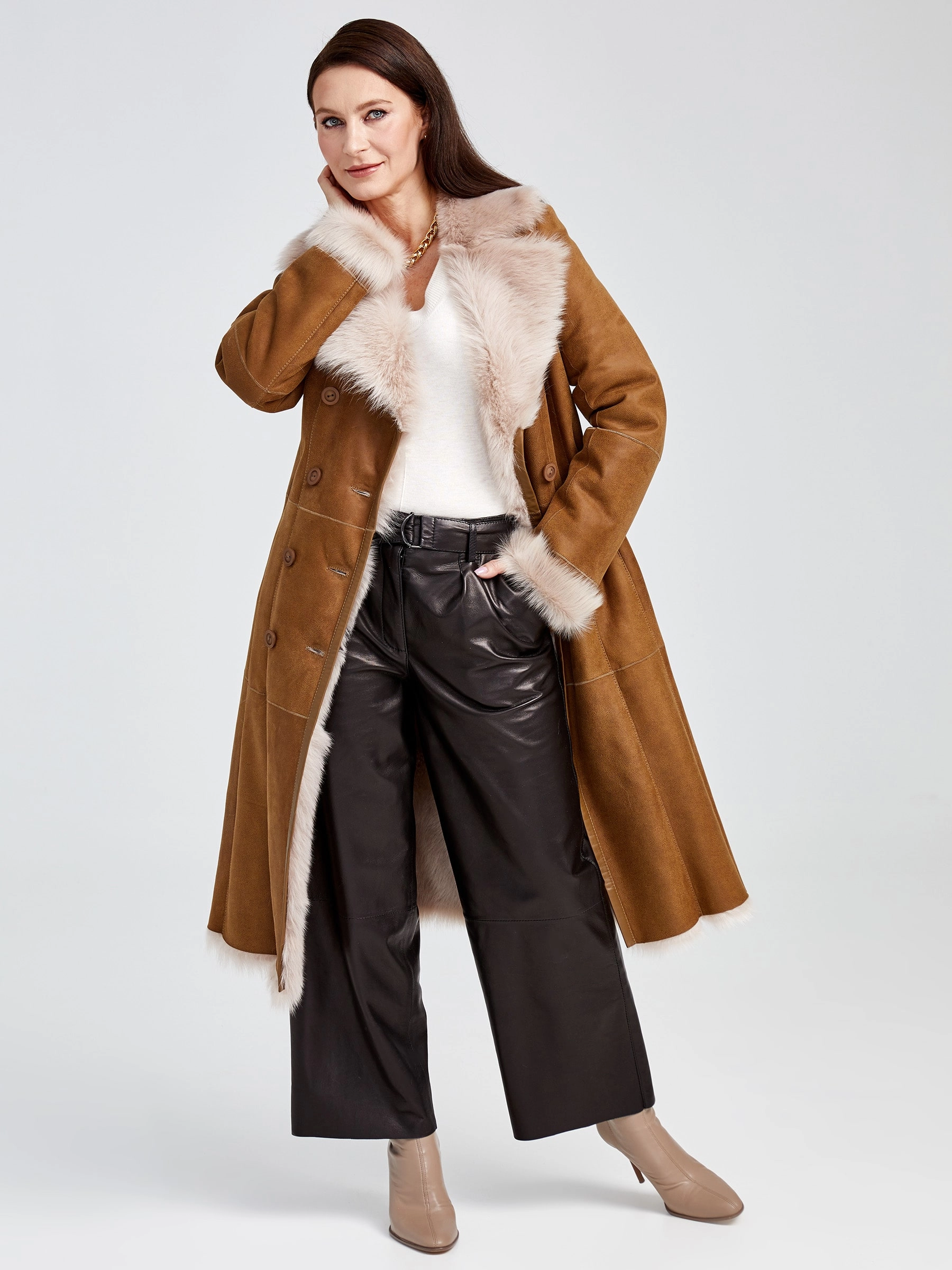 Согревающая классика премиум-класса: нежнейшая бежевая овчина «тосканы» в полуприлегающем силуэте дарит элегантное тепло, а двубортная застёжка на пуговицах и английский воротник создают вневременной образ. Длинный пояс мягко подчеркнёт талию, сохраняя комфорт — сочетайте с вязаными платьями, кожаными брюками или джинсами для безупречного зимнего стиля!
