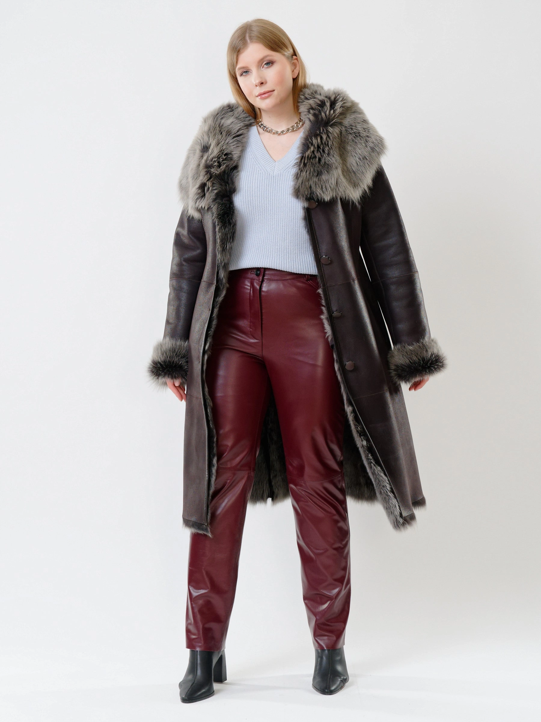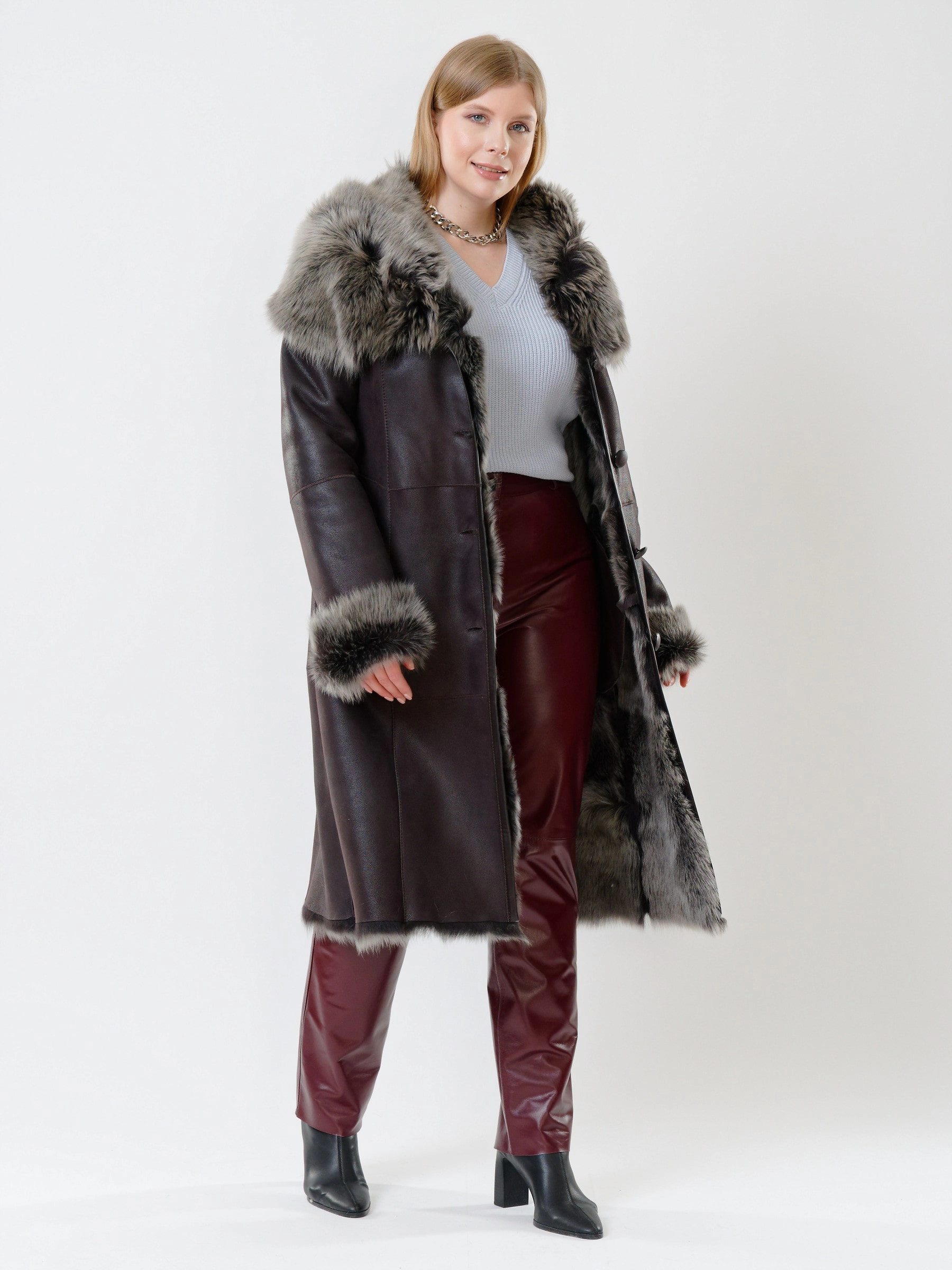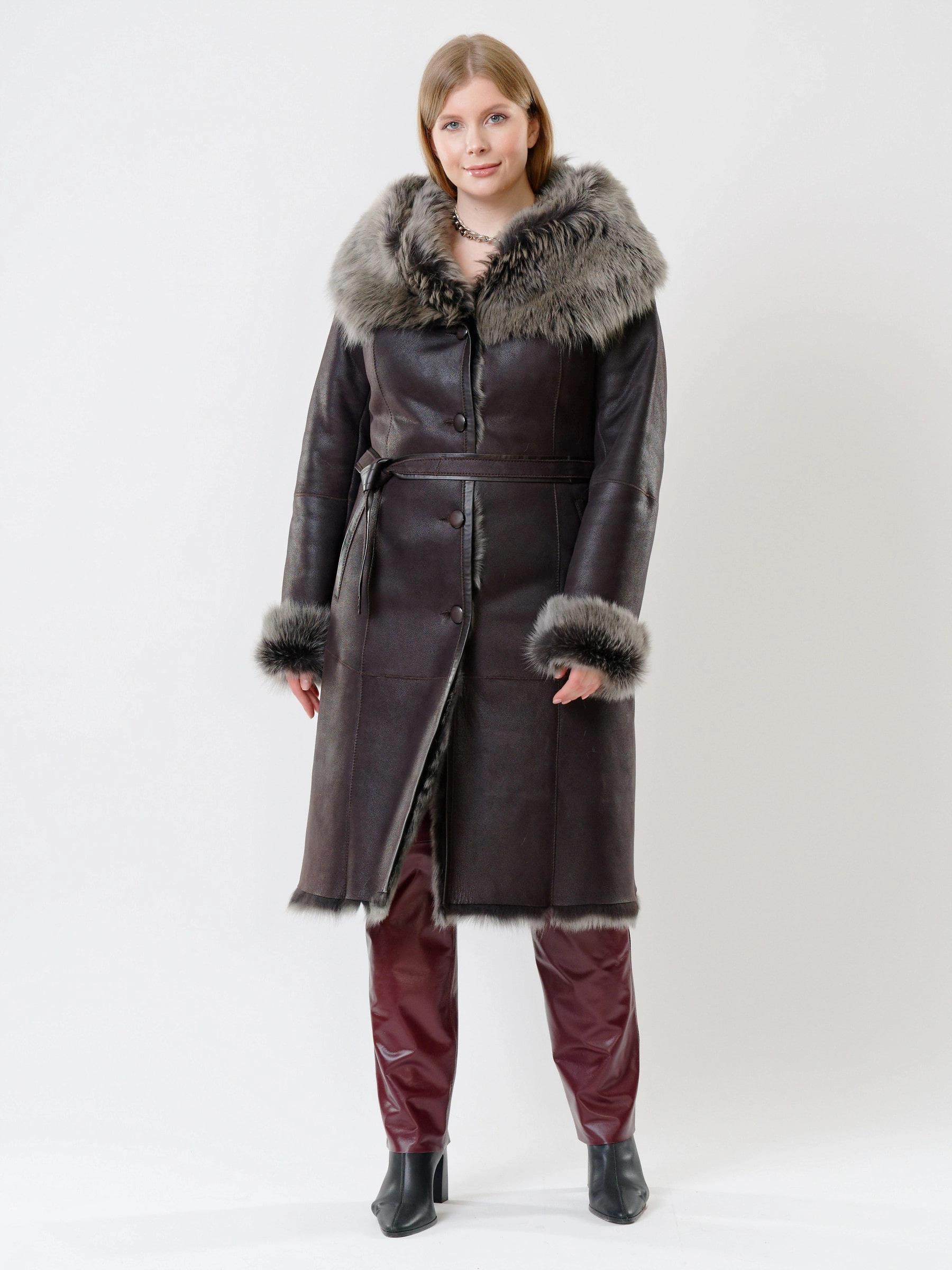 В насыщенном черном цвете, эта роскошная длинная женская дубленка из нежнейшей овчины "Тоскана" на пуговицах, с эффектным объемным капюшоном-шалью, полуприлегающим силуэтом, двумя врезными карманами и длинным поясом, дарит премиальное тепло и подчеркивает элегантность; сочетайте ее с водолазкой и джинсами, элегантным платьем и сапогами, кожаной косухой и кедами или поверх тонкого свитера, дополняя объемным шарфом и стильной сумкой.