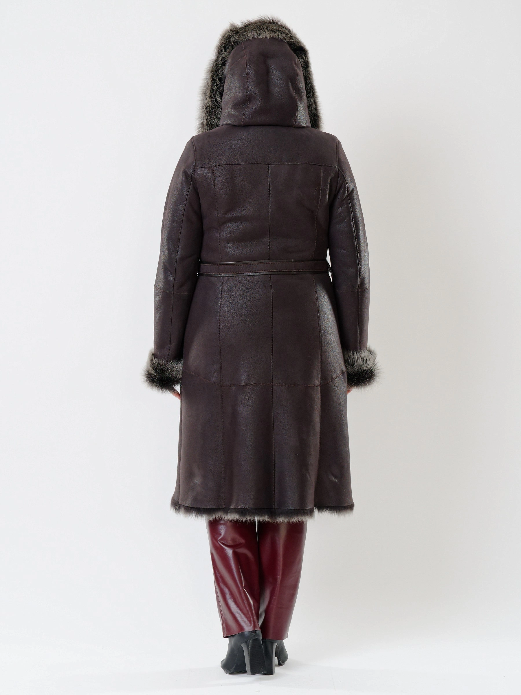 Женская длинная дубленка из тосканы с капюшоном 131, коричневая, размер 44, артикул 14290