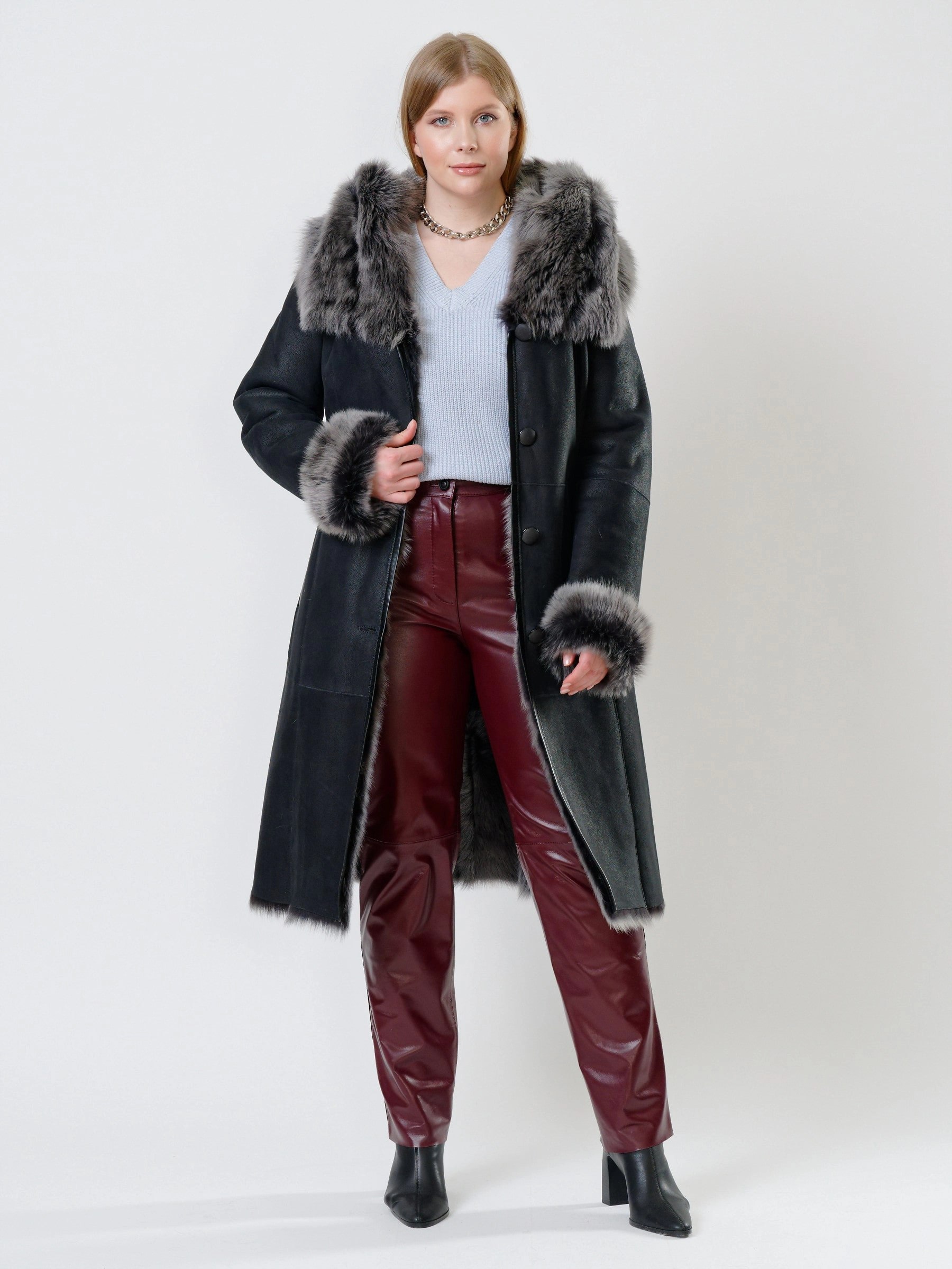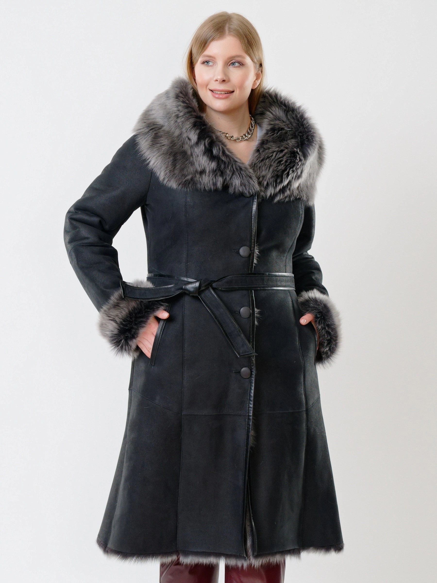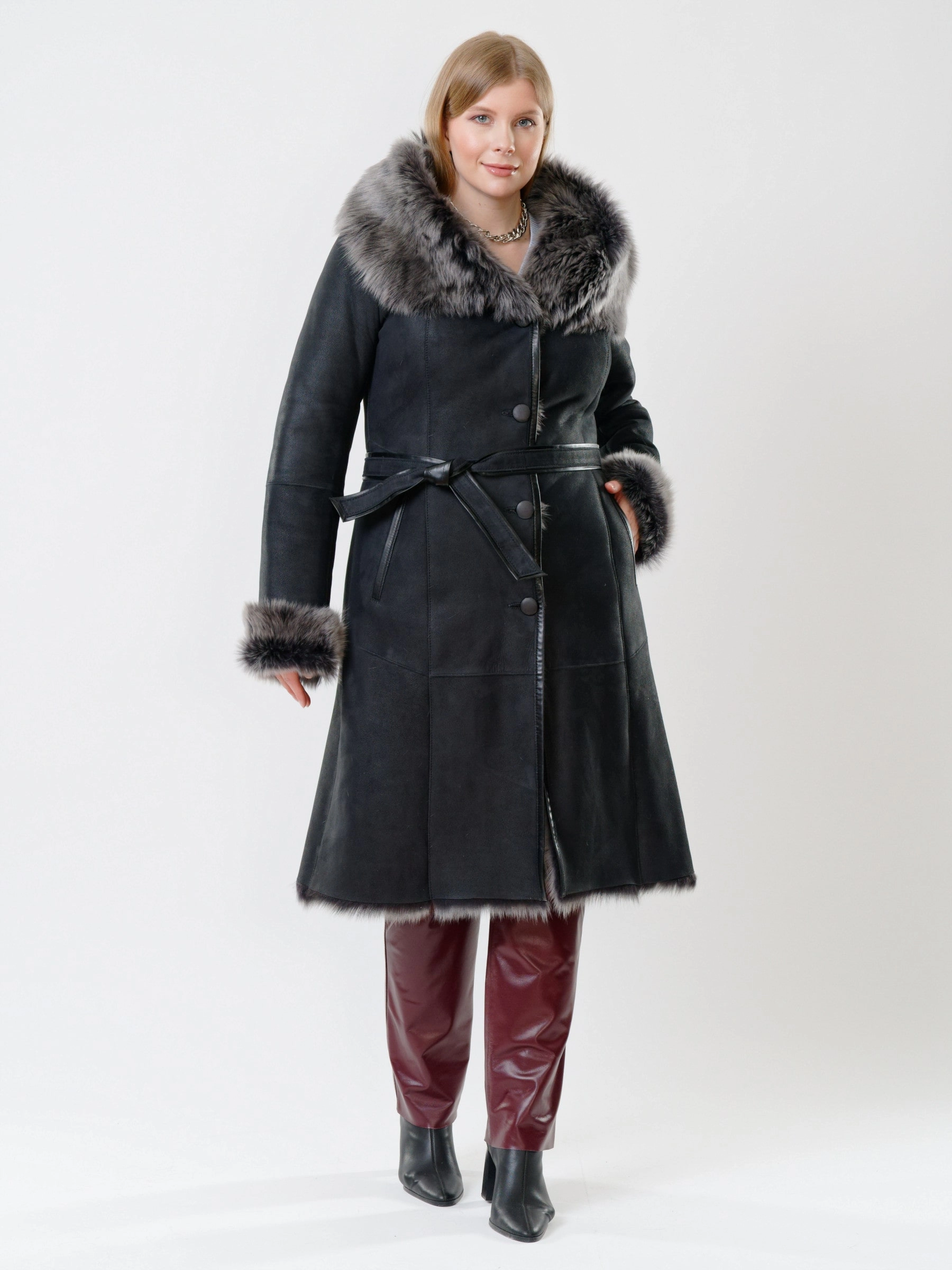 Длинная дублёнка с капюшоном из тосканской овчины — роскошная полуприлегающая модель премиум-класса: густой нежнейший мех глубокого оттенка подарит королевское тепло даже в лютый мороз, а объёмный капюшон создаст уютный кокон от непогоды или элегантно ниспадет на плечи. Длина 110 см — это безупречная защита в холода: дубленка закрывает колени и не даёт ветру продувать, создавая эффектный вертикальный силуэт, визуально вытягивающий фигуру. Защитное покрытие убережёт от царапин, кожаная отделка карманов и борта добавит статусности, а идеальная посадка по фигуре, боковые карманы и длинный пояс подчеркнут силуэт. Совет стилиста: Максимальная длина требует особого баланса — носите дубленку с обувью на устойчивом каблуке или танкетке (ботильоны или казаки), чтобы добавить роста и стройности. Под пояс надевайте не слишком объемные вещи: идеально подойдут облегающие джемперы, водолазки и узкие кожаные брюки или джинсы-скинни.