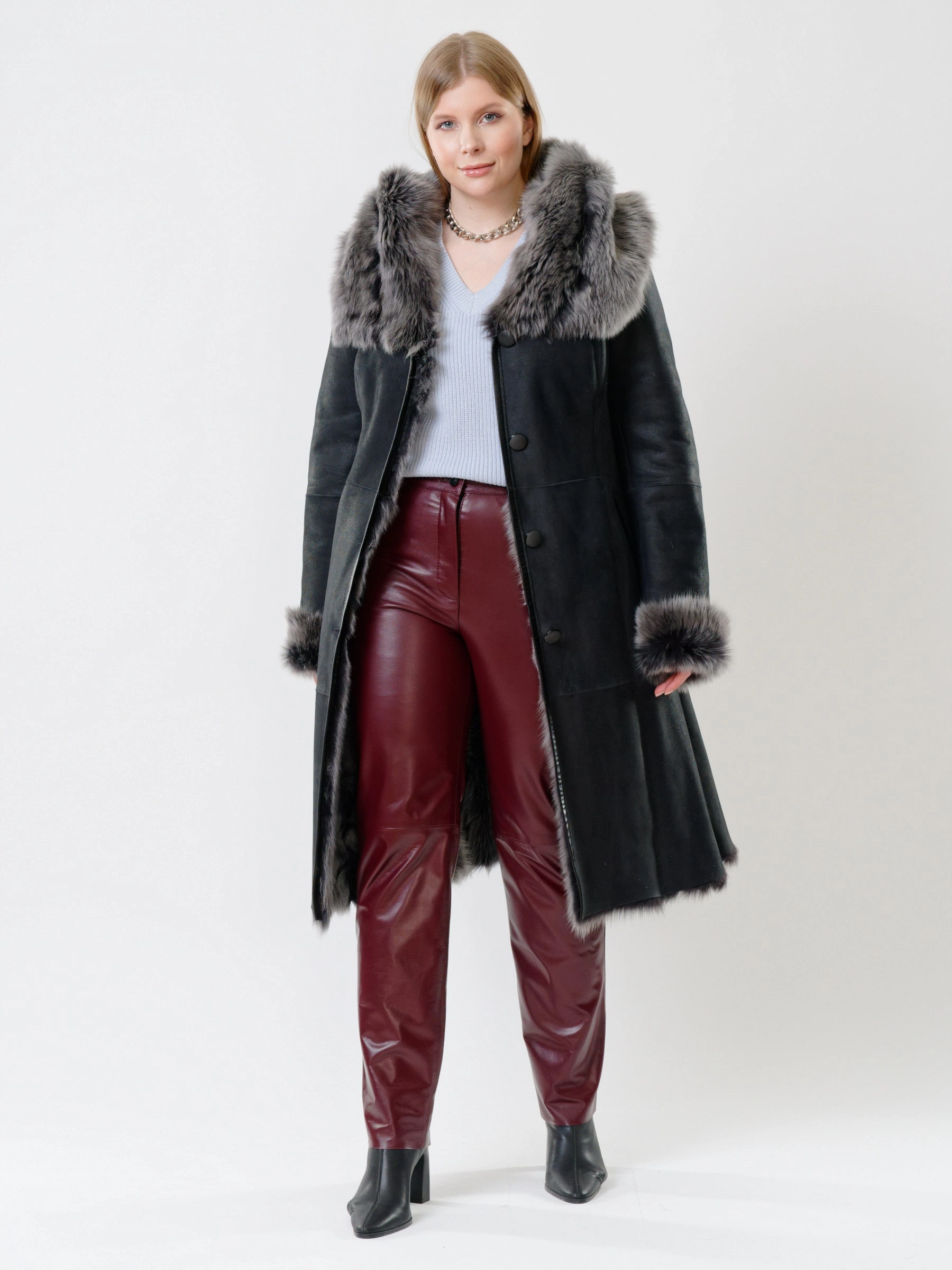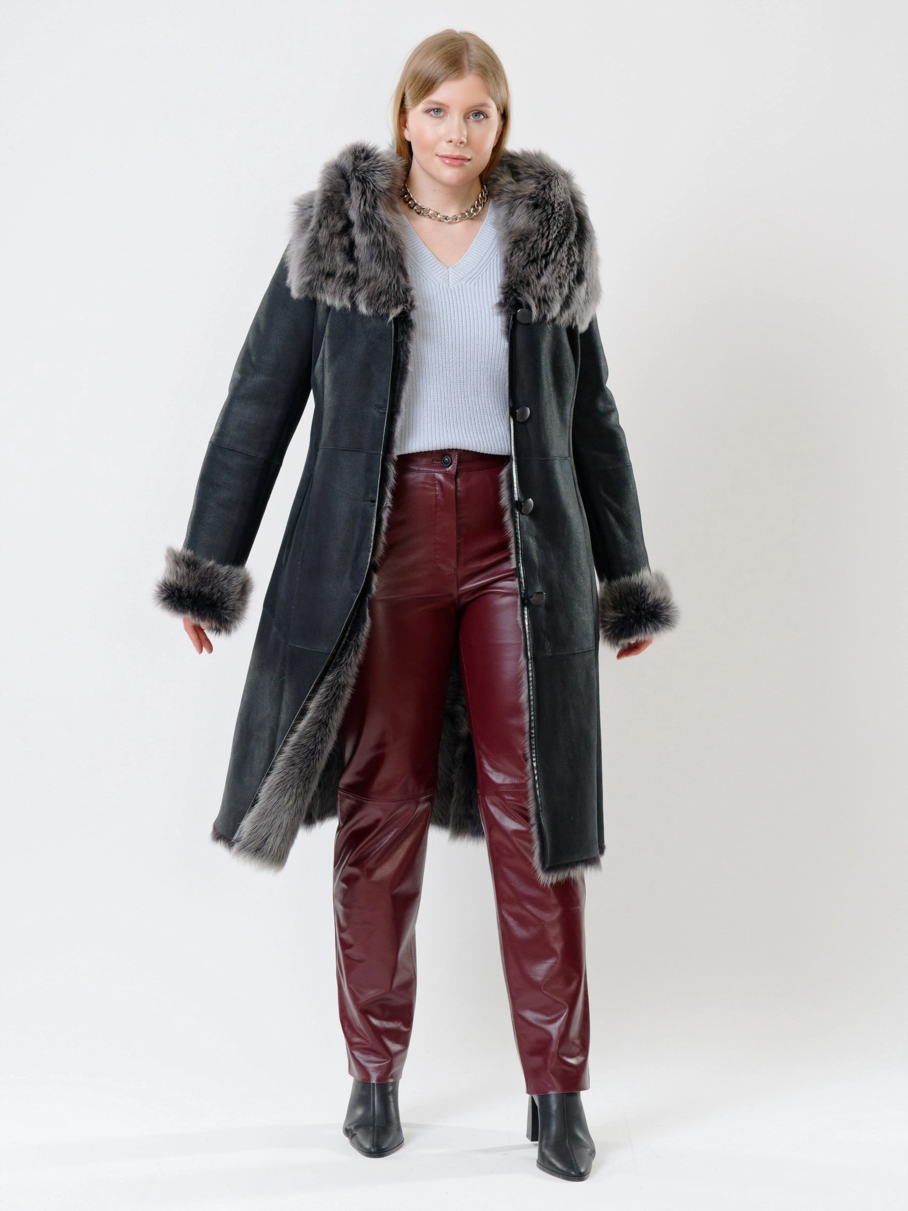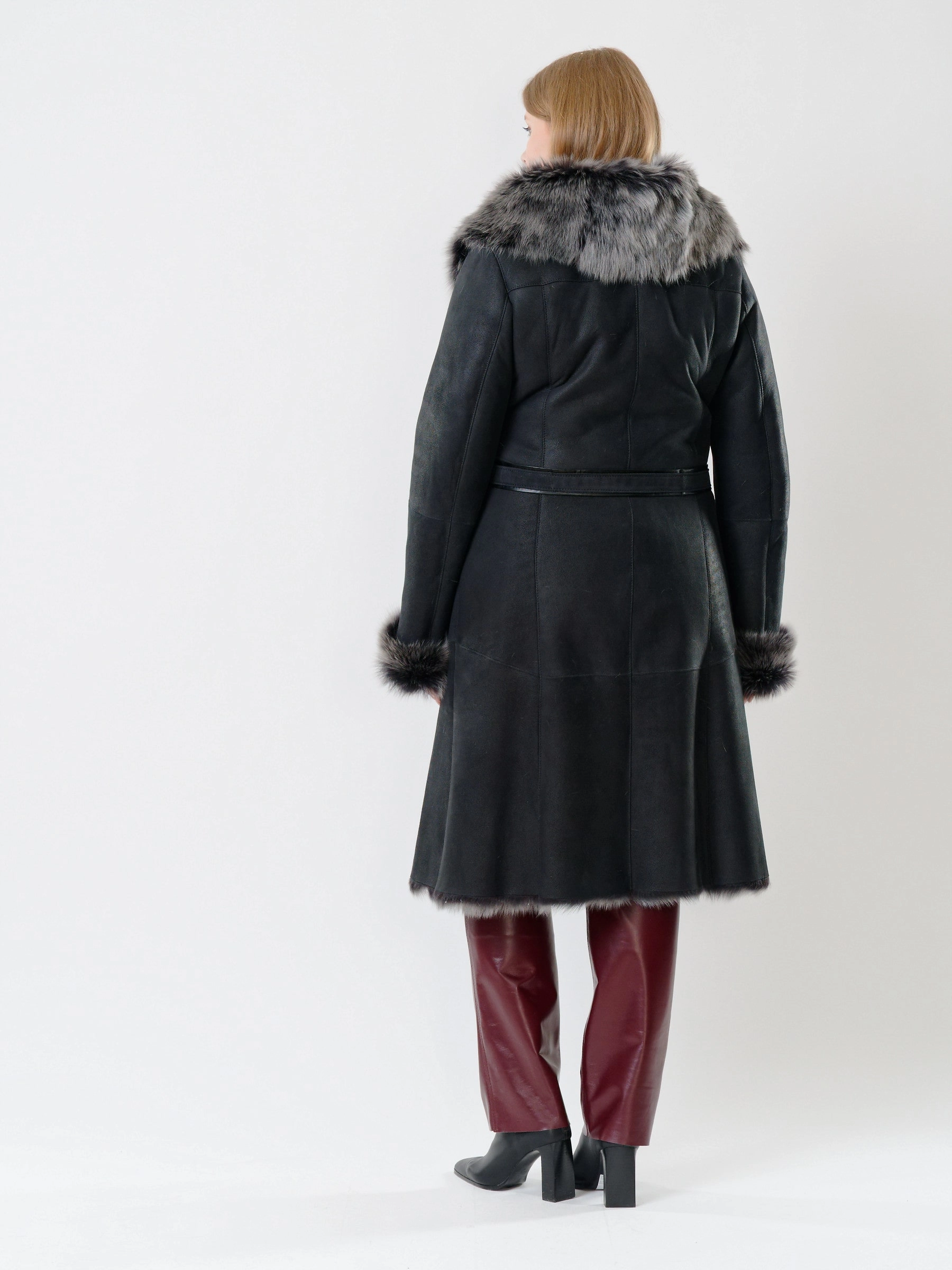Длинная дублёнка с капюшоном из тосканской овчины — роскошная полуприлегающая модель премиум-класса: густой нежнейший мех глубокого оттенка подарит королевское тепло даже в лютый мороз, а объёмный капюшон создаст уютный кокон от непогоды или элегантно ниспадет на плечи. Длина 110 см — это безупречная защита в холода: дубленка закрывает колени и не даёт ветру продувать, создавая эффектный вертикальный силуэт, визуально вытягивающий фигуру. Защитное покрытие убережёт от царапин, кожаная отделка карманов и борта добавит статусности, а идеальная посадка по фигуре, боковые карманы и длинный пояс подчеркнут силуэт. Совет стилиста: Максимальная длина требует особого баланса — носите дубленку с обувью на устойчивом каблуке или танкетке (ботильоны или казаки), чтобы добавить роста и стройности. Под пояс надевайте не слишком объемные вещи: идеально подойдут облегающие джемперы, водолазки и узкие кожаные брюки или джинсы-скинни.
