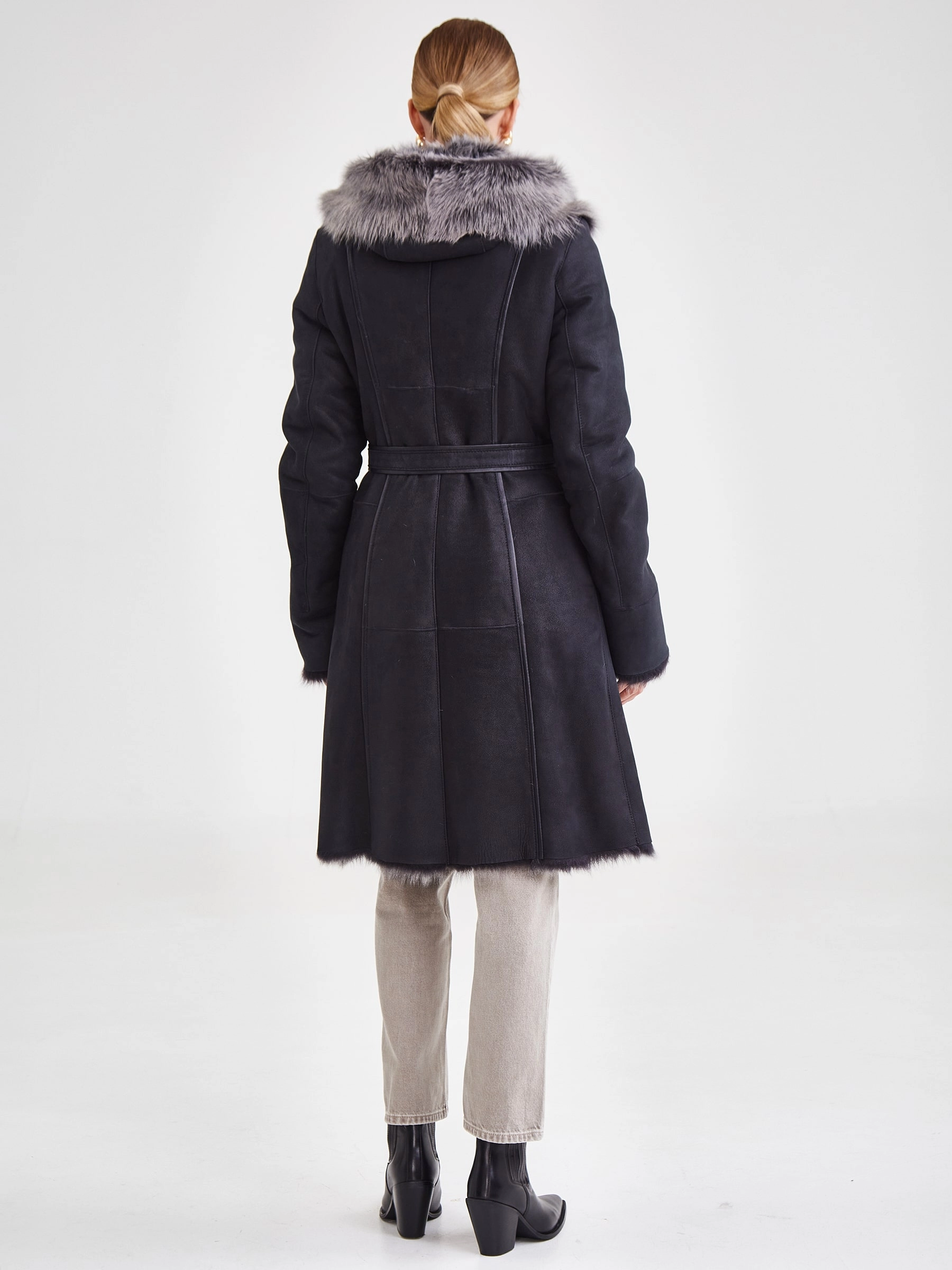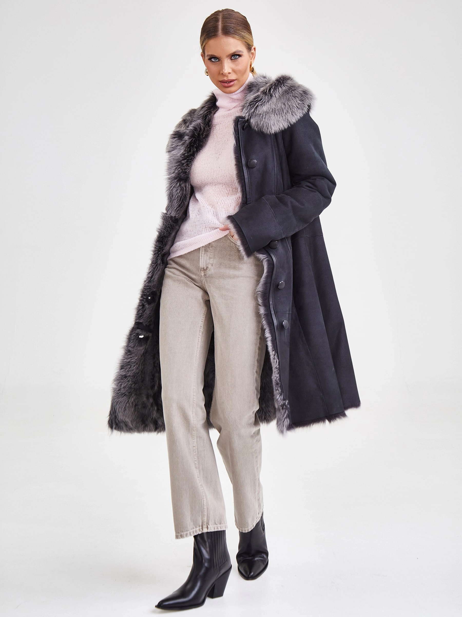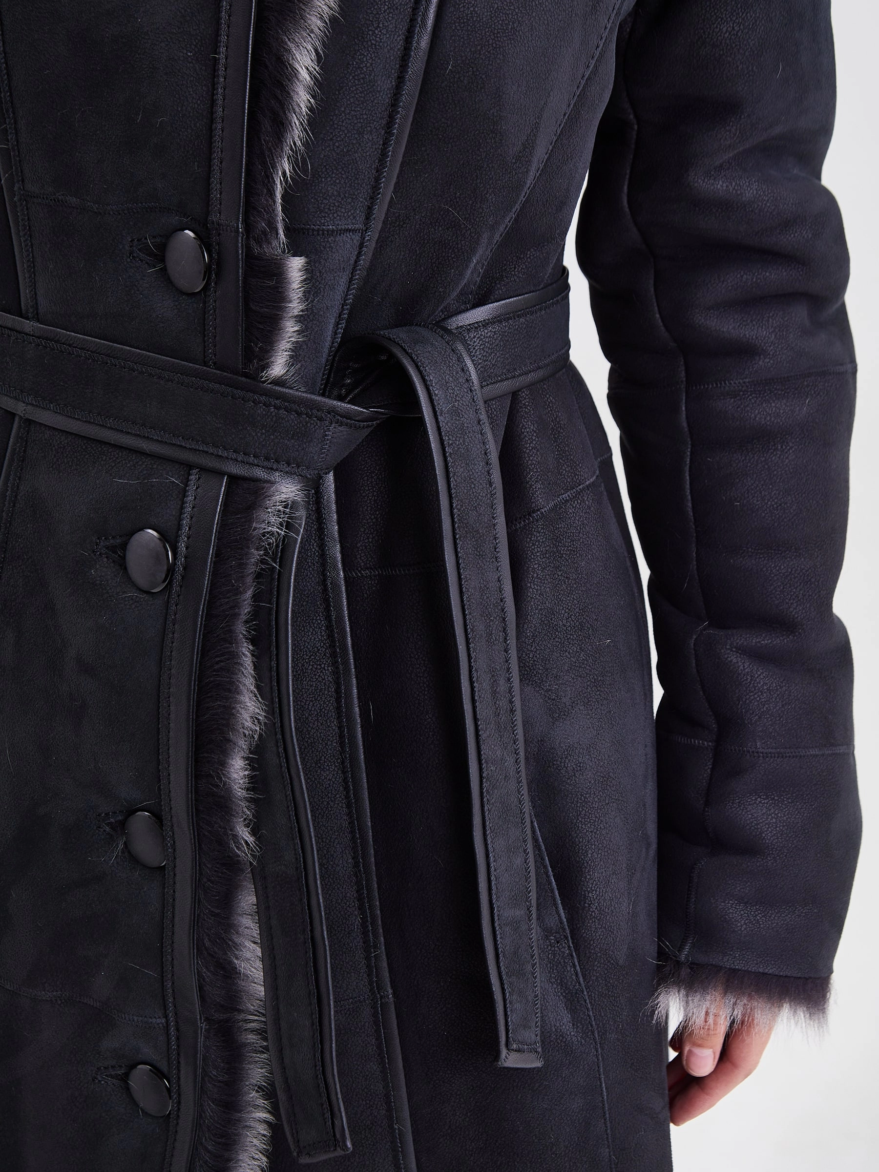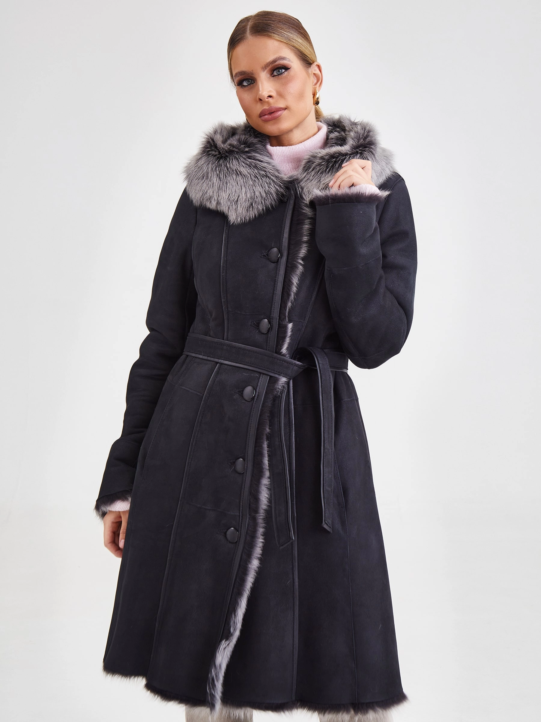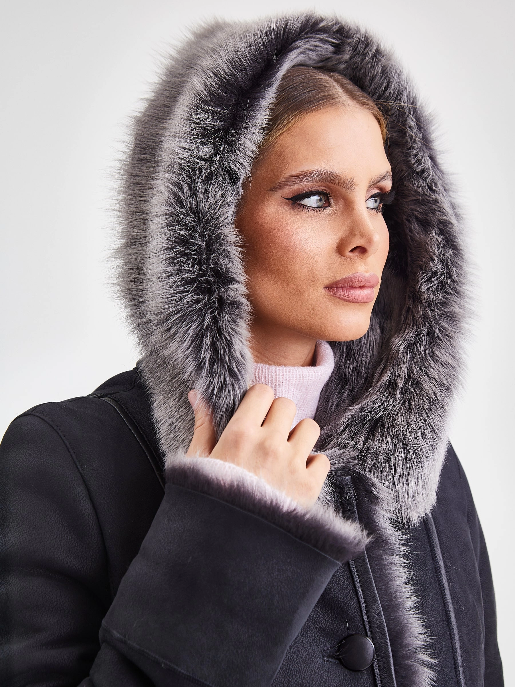 В насыщенном черном цвете, эта роскошная длинная женская дубленка из нежнейшей овчины "Тоскана" на пуговицах, с эффектным объемным капюшоном-шалью, полуприлегающим силуэтом, двумя врезными карманами и длинным поясом, дарит премиальное тепло и подчеркивает элегантность; сочетайте ее с водолазкой и джинсами, элегантным платьем и сапогами, кожаной косухой и кедами или поверх тонкого свитера, дополняя объемным шарфом и стильной сумкой.