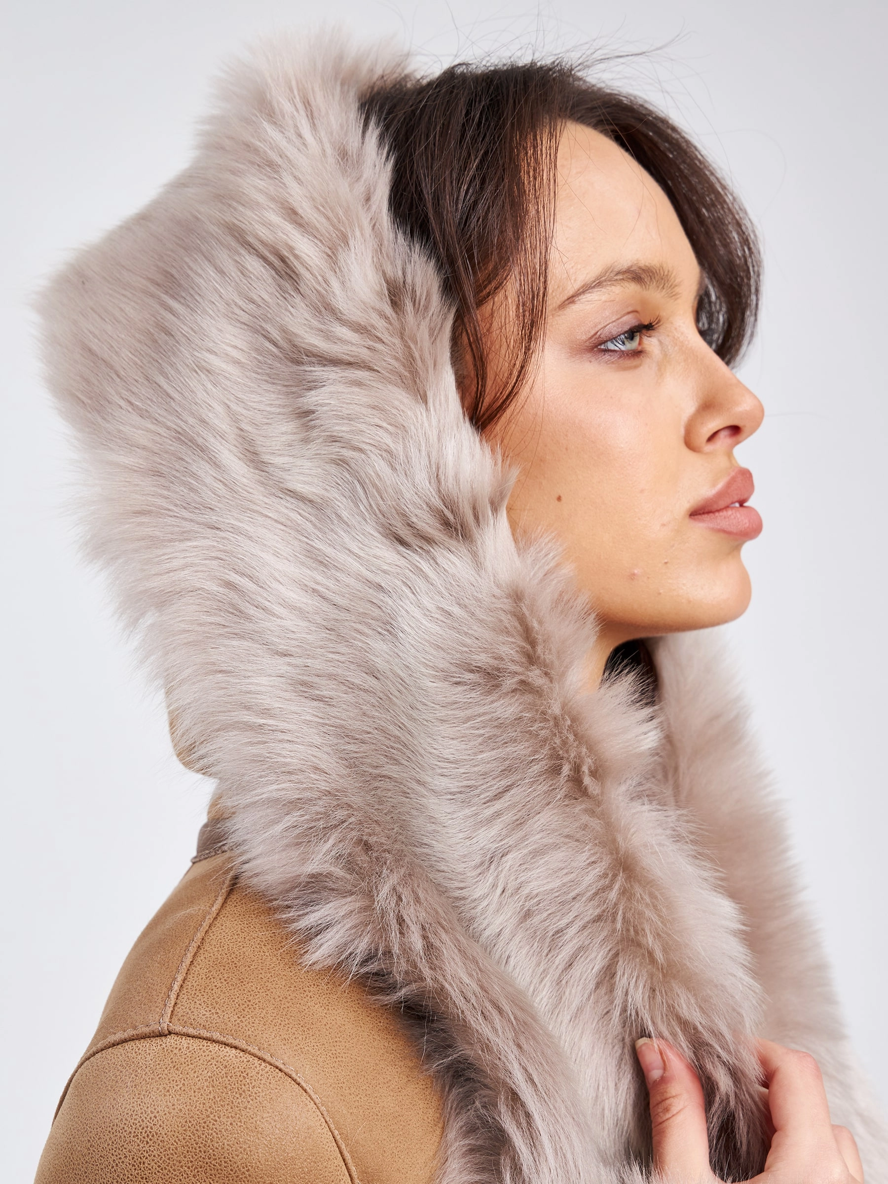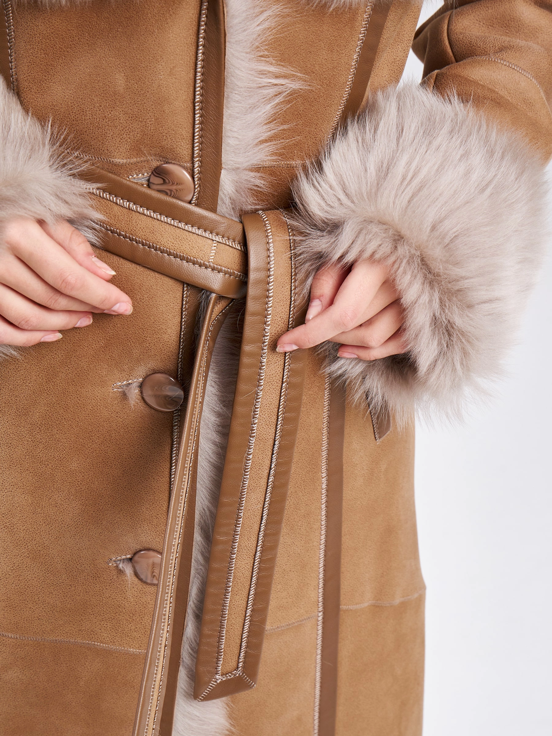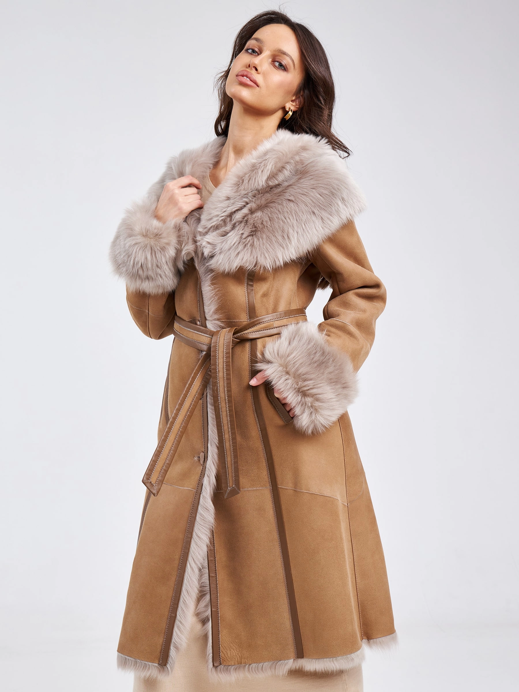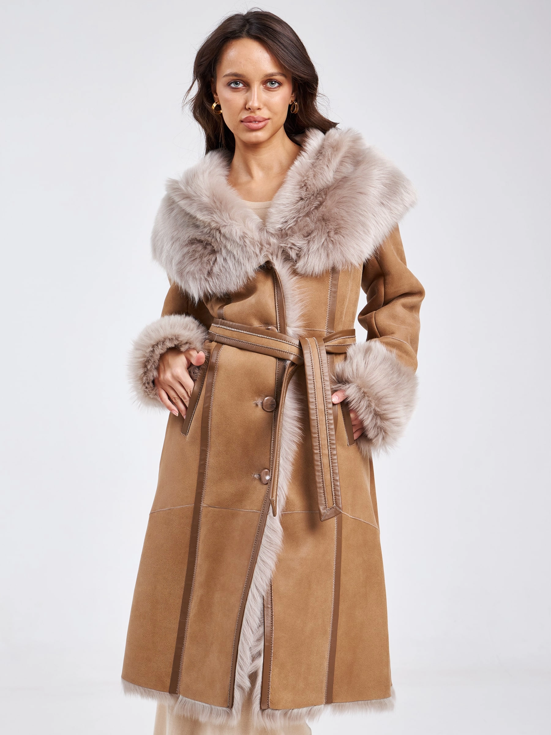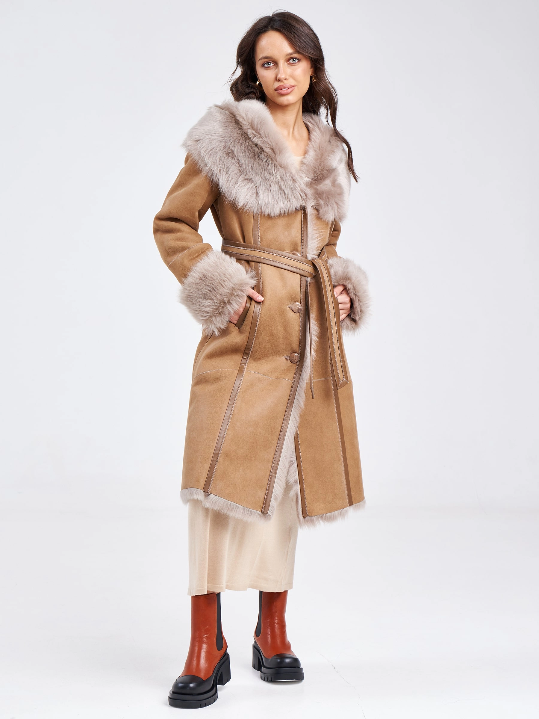 Роскошная длинная женская дубленка из нежнейшей овчины тоскана на пуговицах с эффектным объемным капюшоном-шалью — это воплощение премиального тепла, утонченного силуэта и безупречного вкуса для холодного времени года. Модель полуприлегающего силуэта длиной 110 сантиметров с втачным рукавом подчеркивает женственность линий, сохраняя благородную элегантность и свободу движений. Роскошная тосканская овчина отличается особой текстурой с длинным, шелковистым и блестящим ворсом, который придает изделию визуальное богатство и тактильную мягкость, делая эту дубленку настоящим сокровищем гардероба. Эффектный объемный капюшон-шаль не только надежно защищает от ветра и снега, но и становится выразительным акцентом, обрамляя лицо мягким мехом и добавляя образу королевскую грацию. Два практичных врезных кармана согревают руки, а длинный пояс позволяет подчеркнуть талию и менять силуэт от расслабленного до более структурированного. Элегантная застежка на пуговицы сохраняет классические линии.