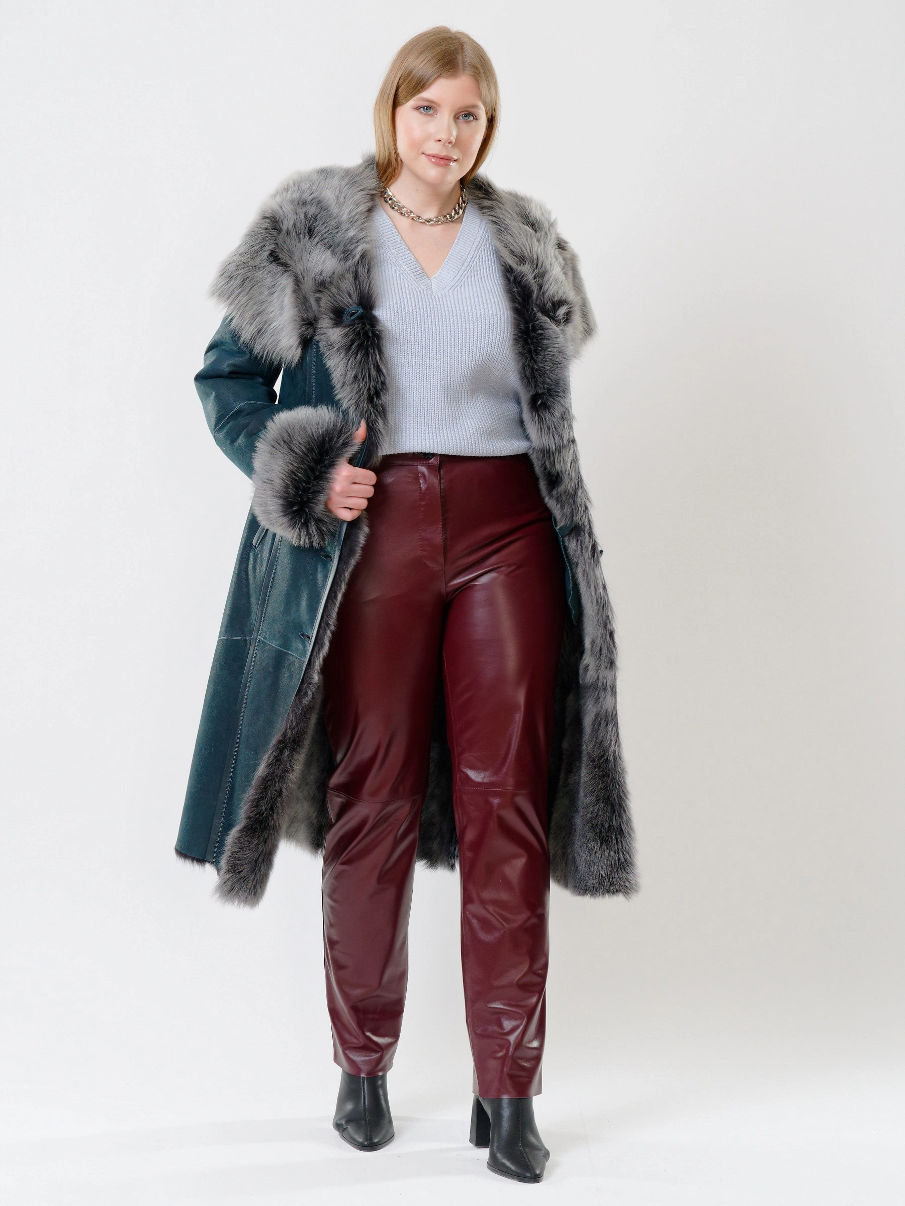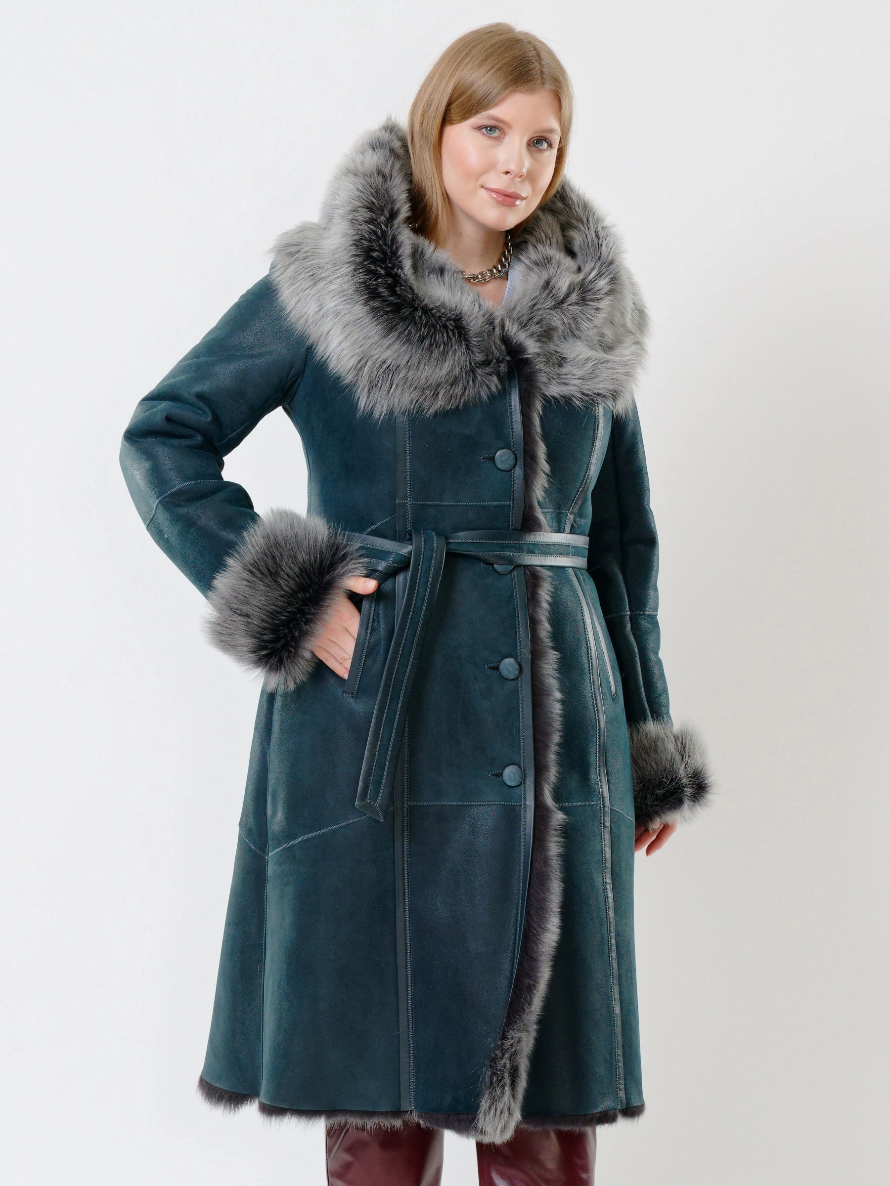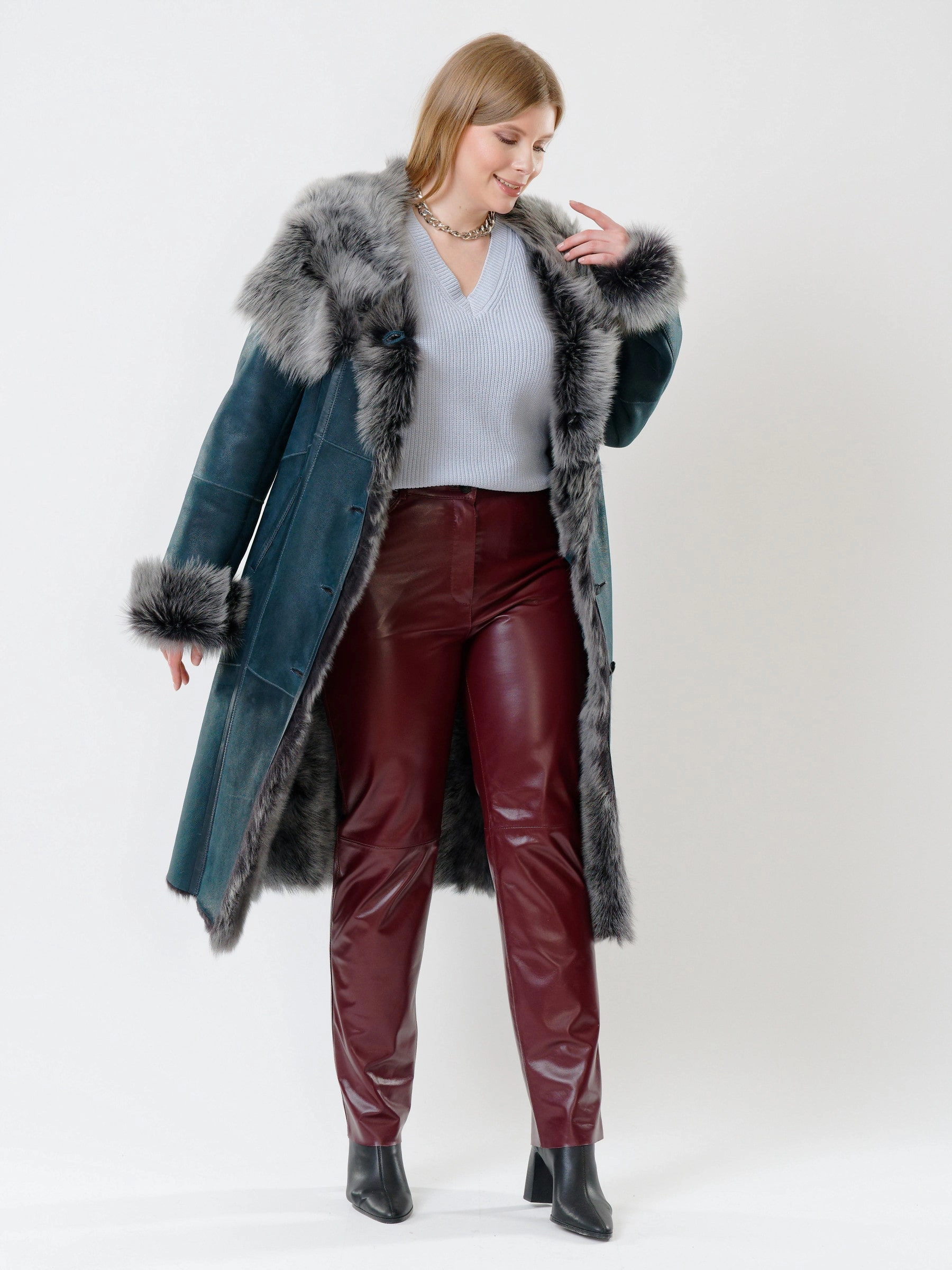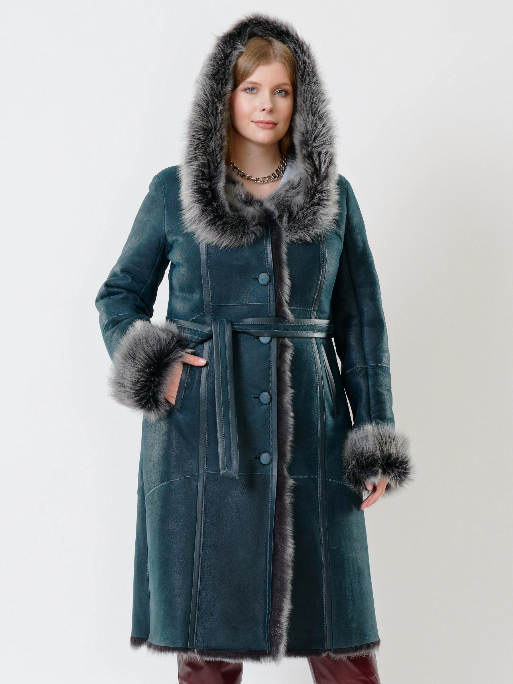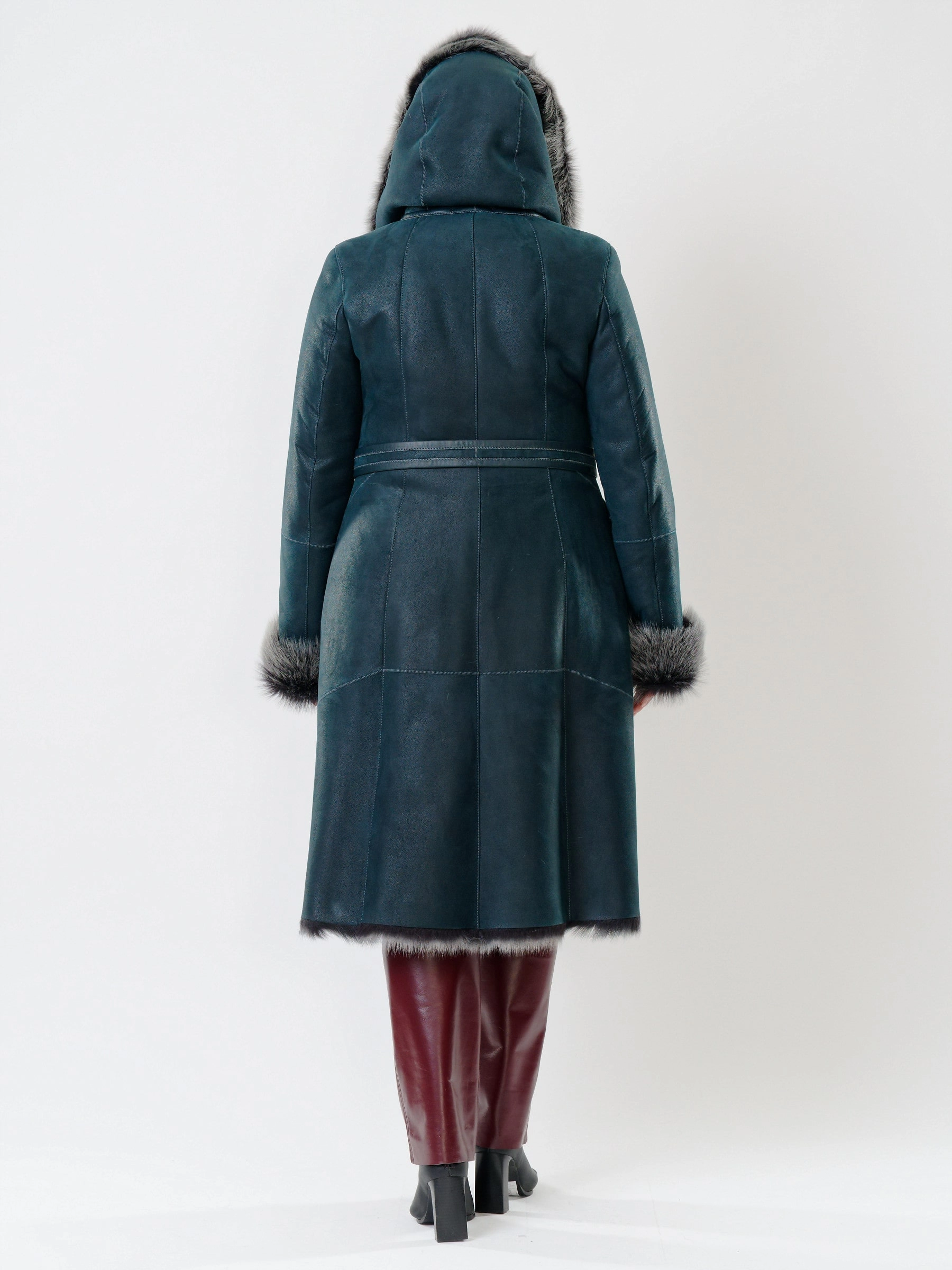 Длинная дубленка из тосканы с капюшоном для женщин 132, синяя, размер 44, артикул 62110