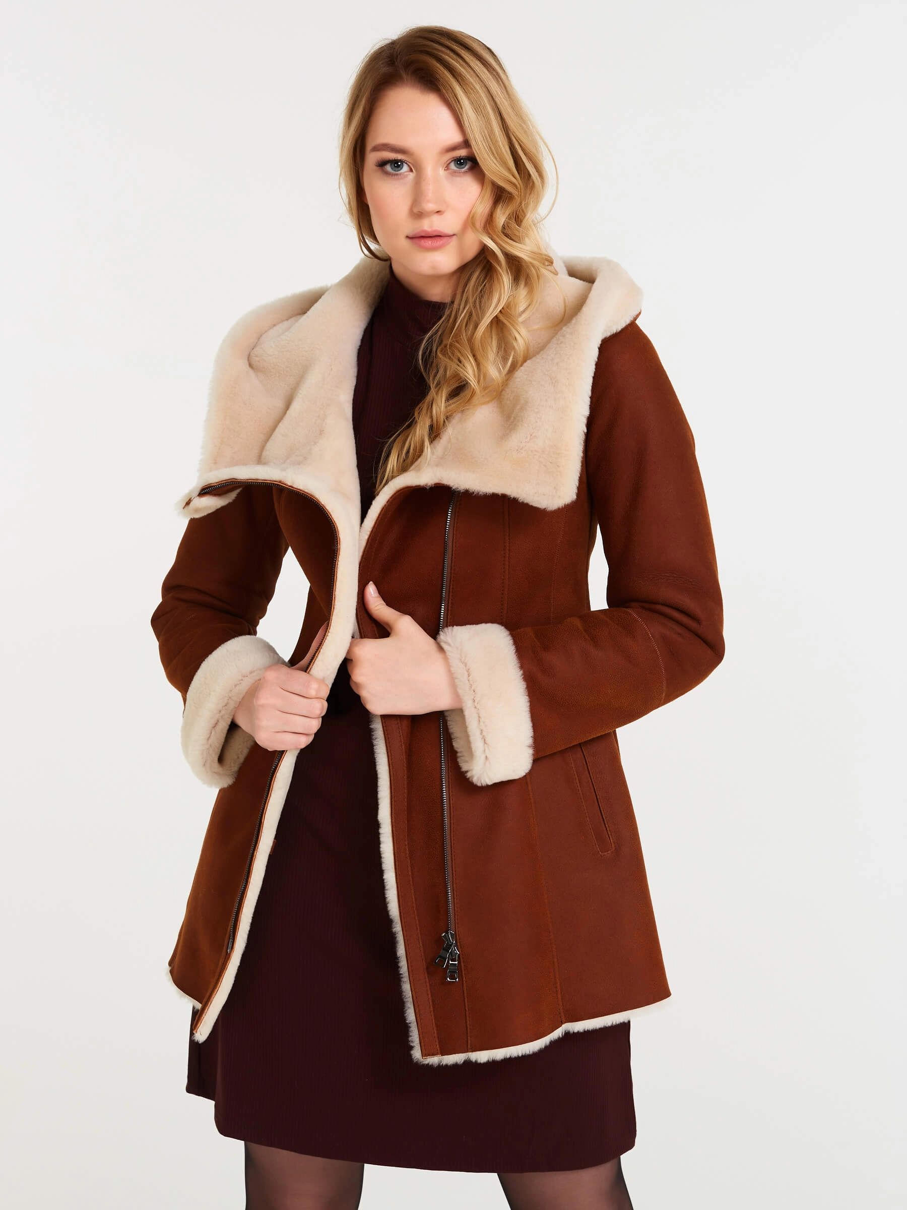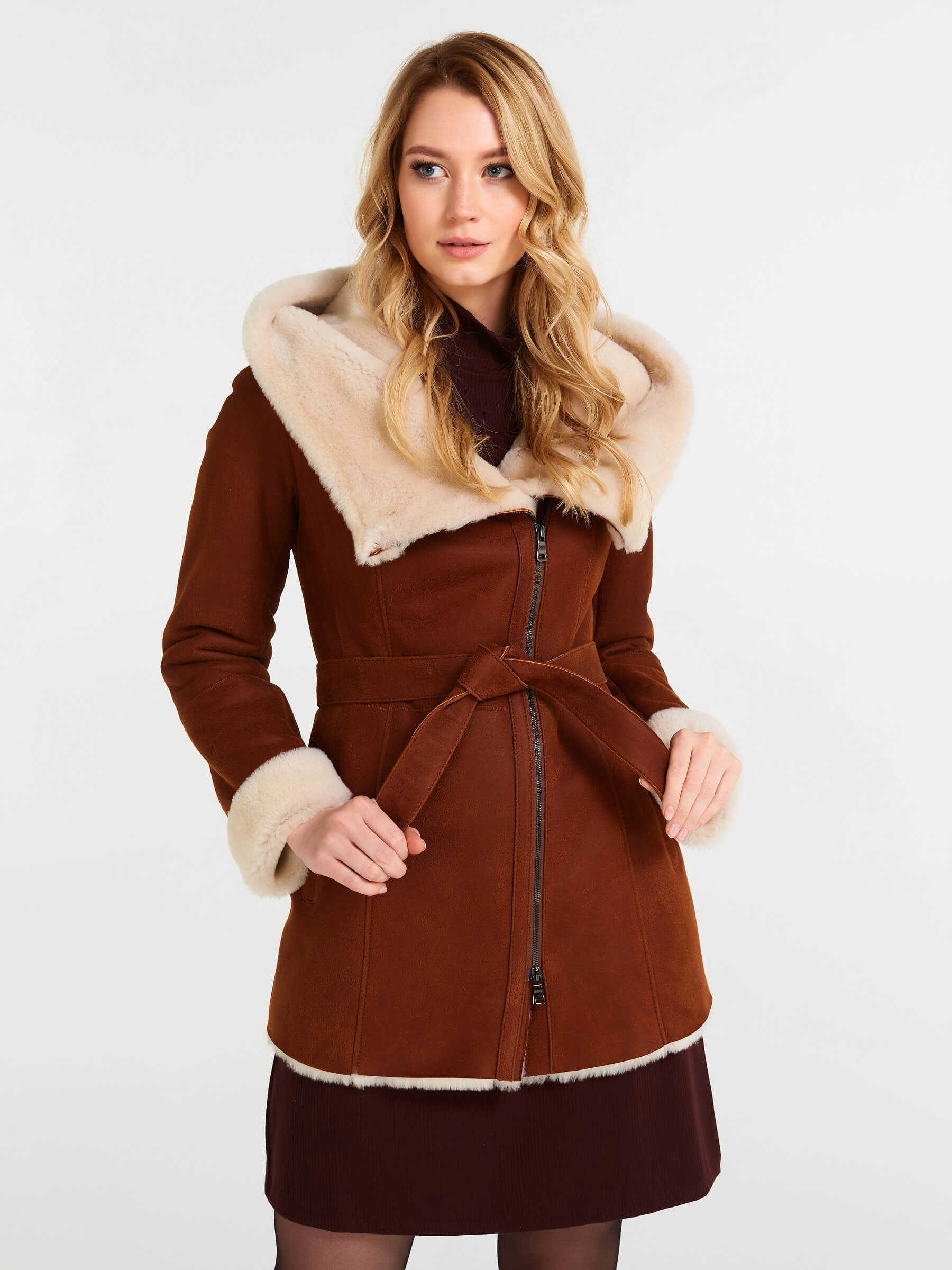 В теплом табачно-рыжем цвете эта дерзкая короткая женская дубленка-косуха из нежнейшей овчины мерино становится воплощением уличного шика и бескомпромиссного комфорта для прохладного сезона. Модель полуприлегающего силуэта длиной 75 сантиметров с втачным рукавом и удобным объемным несъемным капюшоном создает образ современной небрежной элегантности, где байкерский характер встречается с премиальным теплом натуральной овчины. Эффектная застежка на двойную молнию подчеркивает дерзкий стиль косухи, позволяя варьировать посадку и создавать разные силуэты. Два практичных врезных кармана согревают руки, а длинный пояс дает возможность при желании акцентировать талию и менять настроение образа. Нежнейшая овчина мерино дарит исключительное тепло и тактильный комфорт, делая эту дубленку идеальным спутником для холодных дней. Стилисты рекомендуют сочетать ее с худи и рваными джинсами для максимально дерзкого лука.