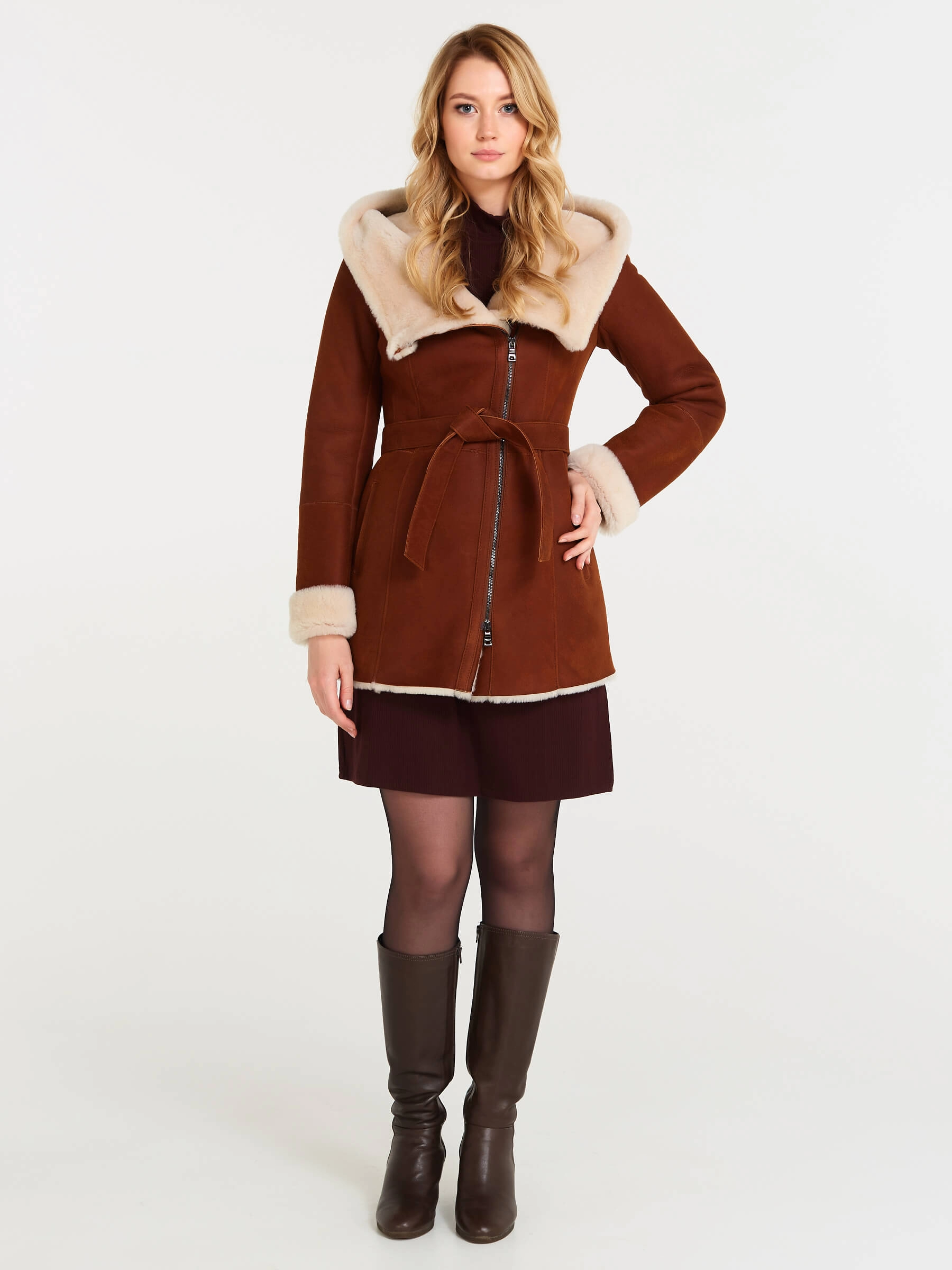 Товар короткая женская дубленка косуха с капюшоном 200, табачно-рыжая, размер 44, артикул 61250 выполнен из овчина "мерино" с застежкой молния. Рассчитан на сезон: осень-зима. Длина изделия 75 см, силуэт полуприлегающий.