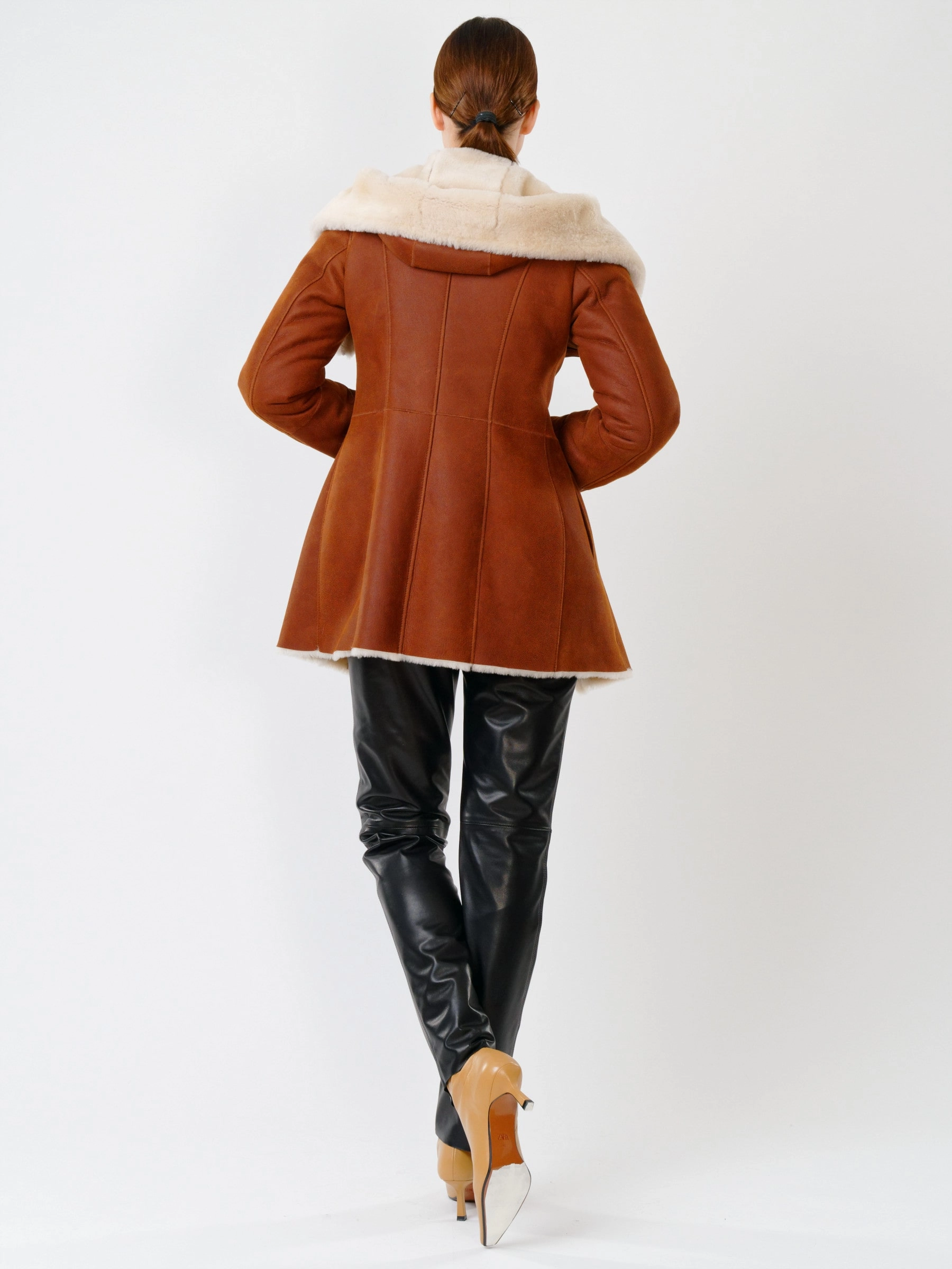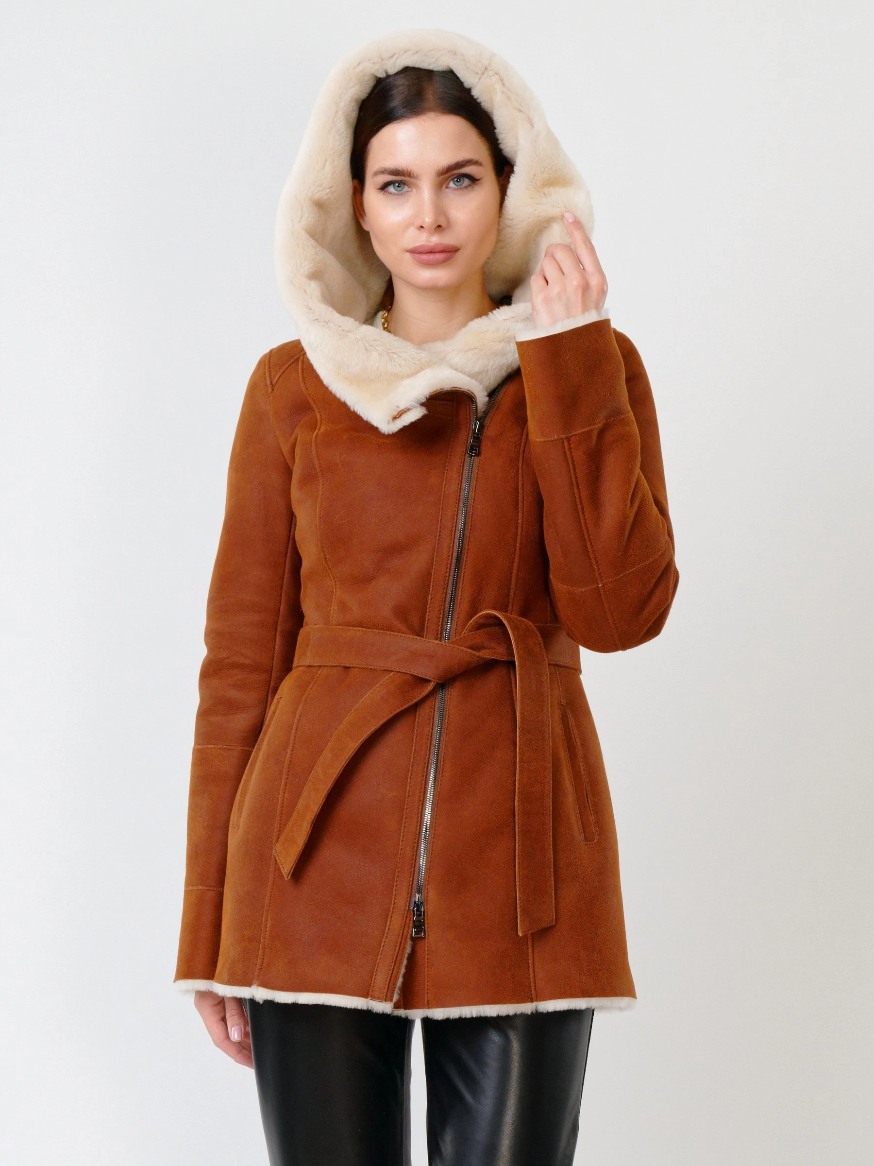 Товар короткая женская дубленка косуха с капюшоном 200, табачно-рыжая, размер 44, артикул 61701 выполнен из овчина "мерино" с застежкой молния. Рассчитан на сезон: осень-зима. Длина изделия 75 см, силуэт полуприлегающий.