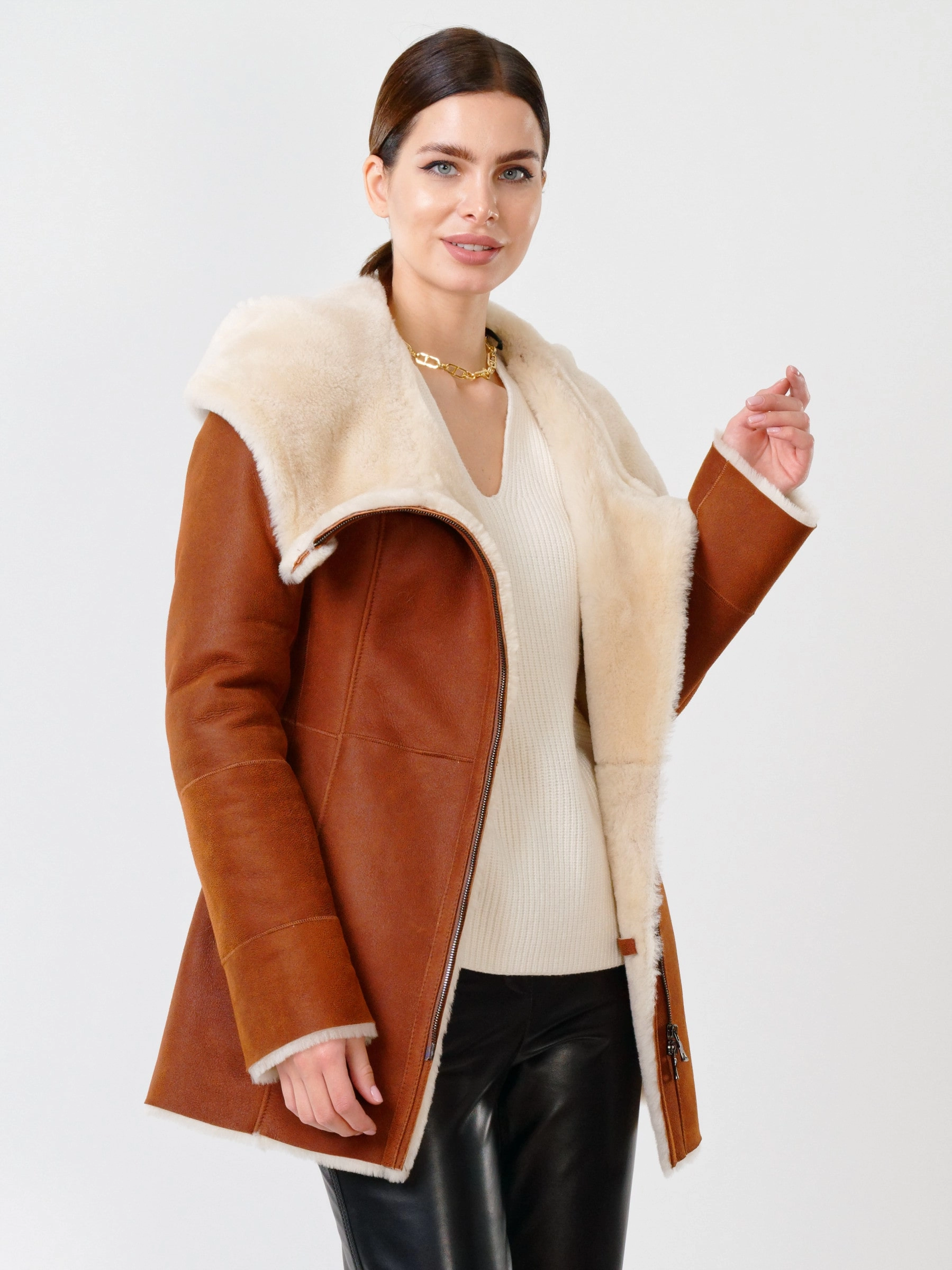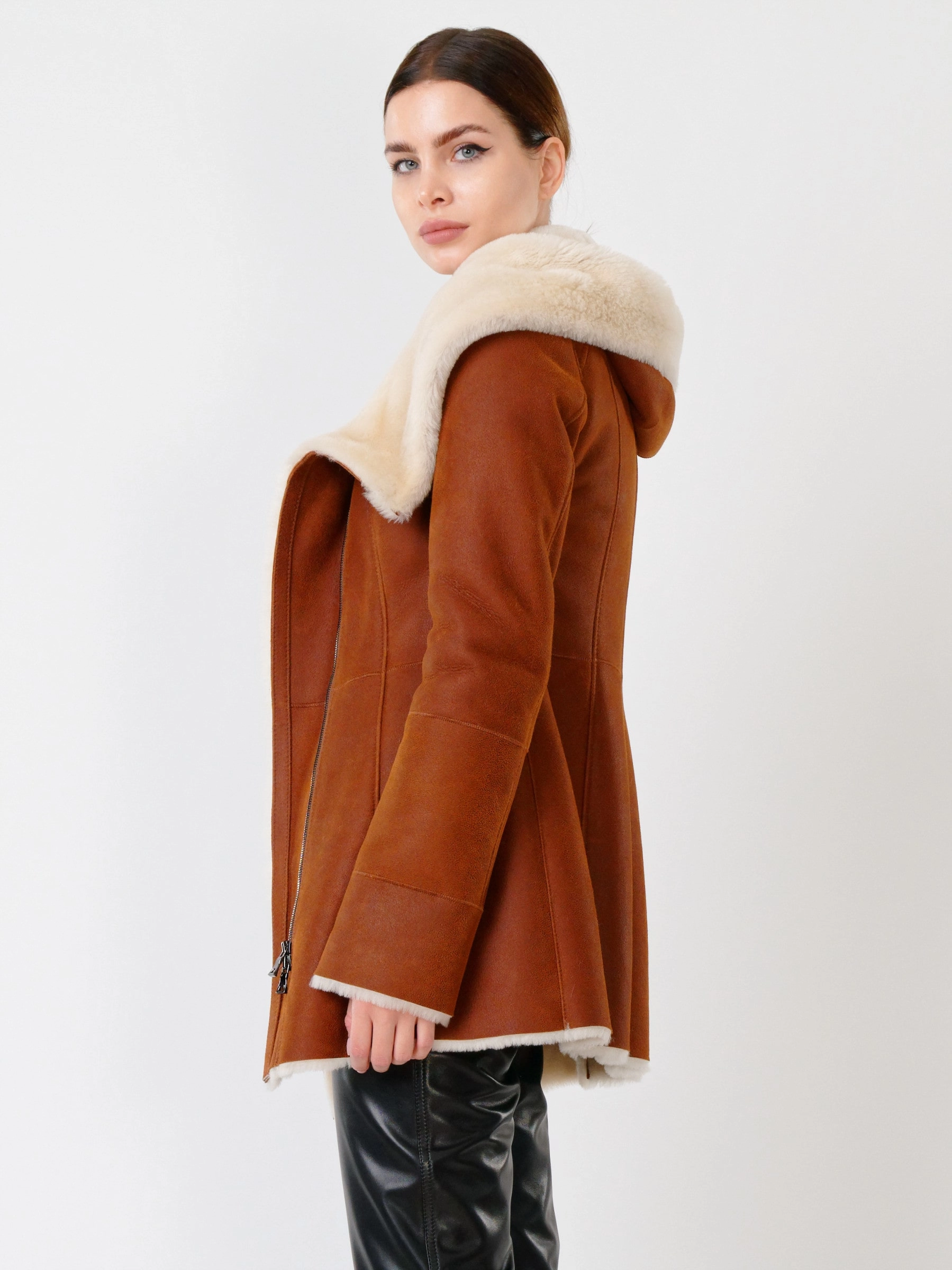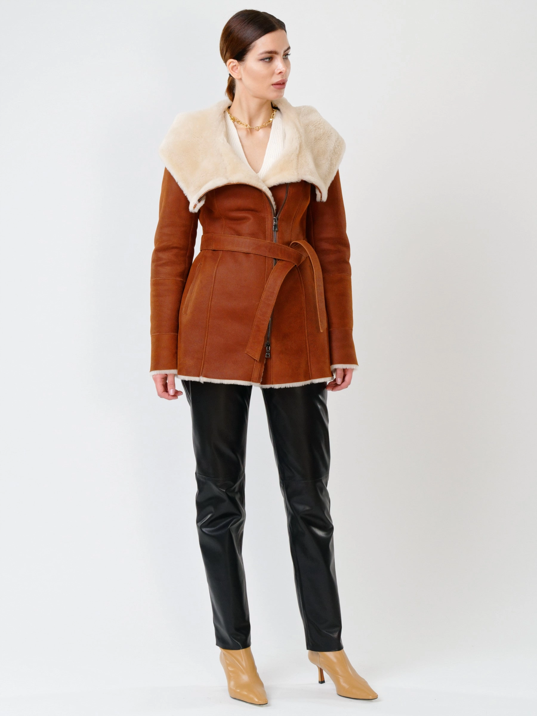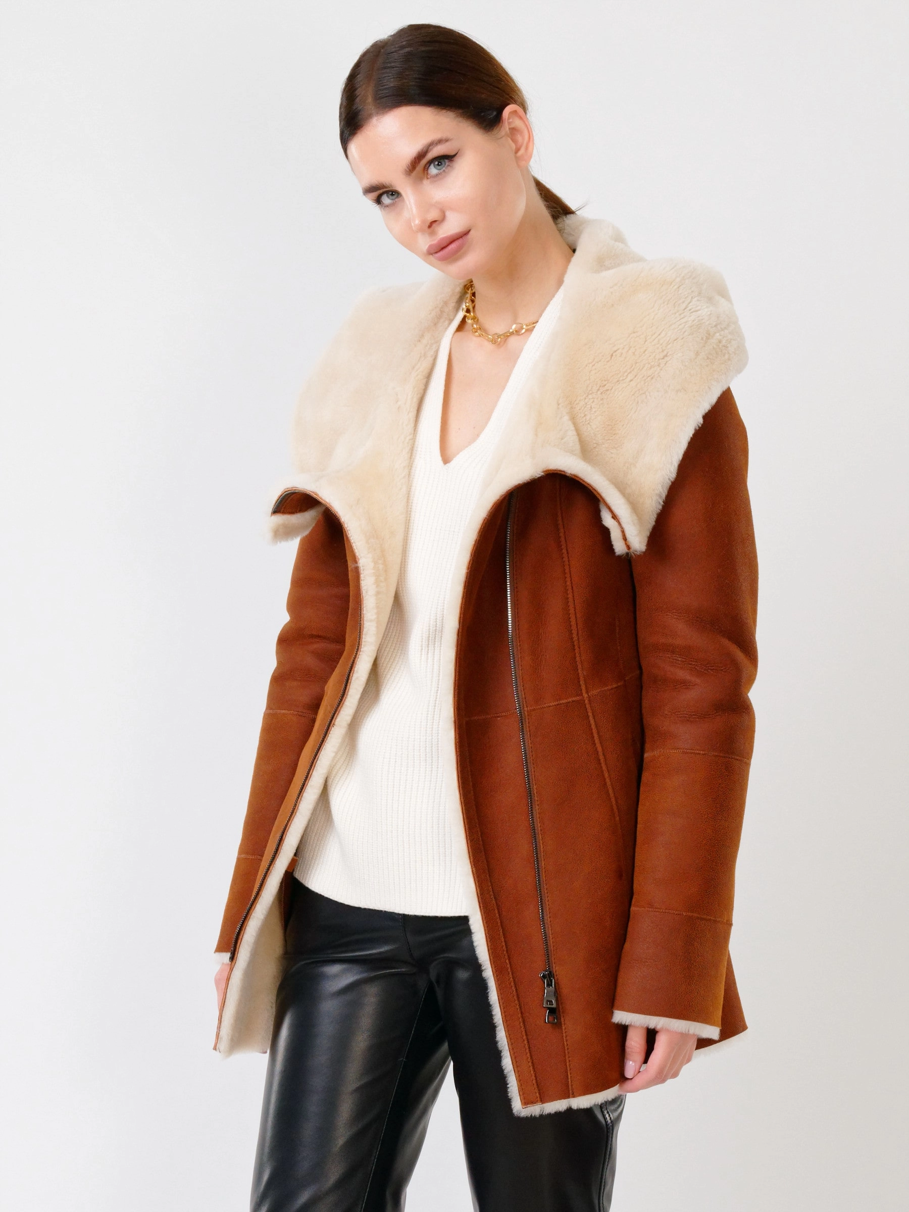 В теплом табачно-рыжем цвете эта дерзкая короткая женская дубленка-косуха из нежнейшей овчины мерино становится воплощением уличного шика и бескомпромиссного комфорта для прохладного сезона. Модель полуприлегающего силуэта длиной 75 сантиметров с втачным рукавом и удобным объемным несъемным капюшоном создает образ современной небрежной элегантности, где байкерский характер встречается с премиальным теплом натуральной овчины. Эффектная застежка на двойную молнию подчеркивает дерзкий стиль косухи, позволяя варьировать посадку и создавать разные силуэты. Два практичных врезных кармана согревают руки, а длинный пояс дает возможность при желании акцентировать талию и менять настроение образа. Нежнейшая овчина мерино дарит исключительное тепло и тактильный комфорт, делая эту дубленку идеальным спутником для холодных дней. Стилисты рекомендуют сочетать ее с худи и рваными джинсами для максимально дерзкого лука.
