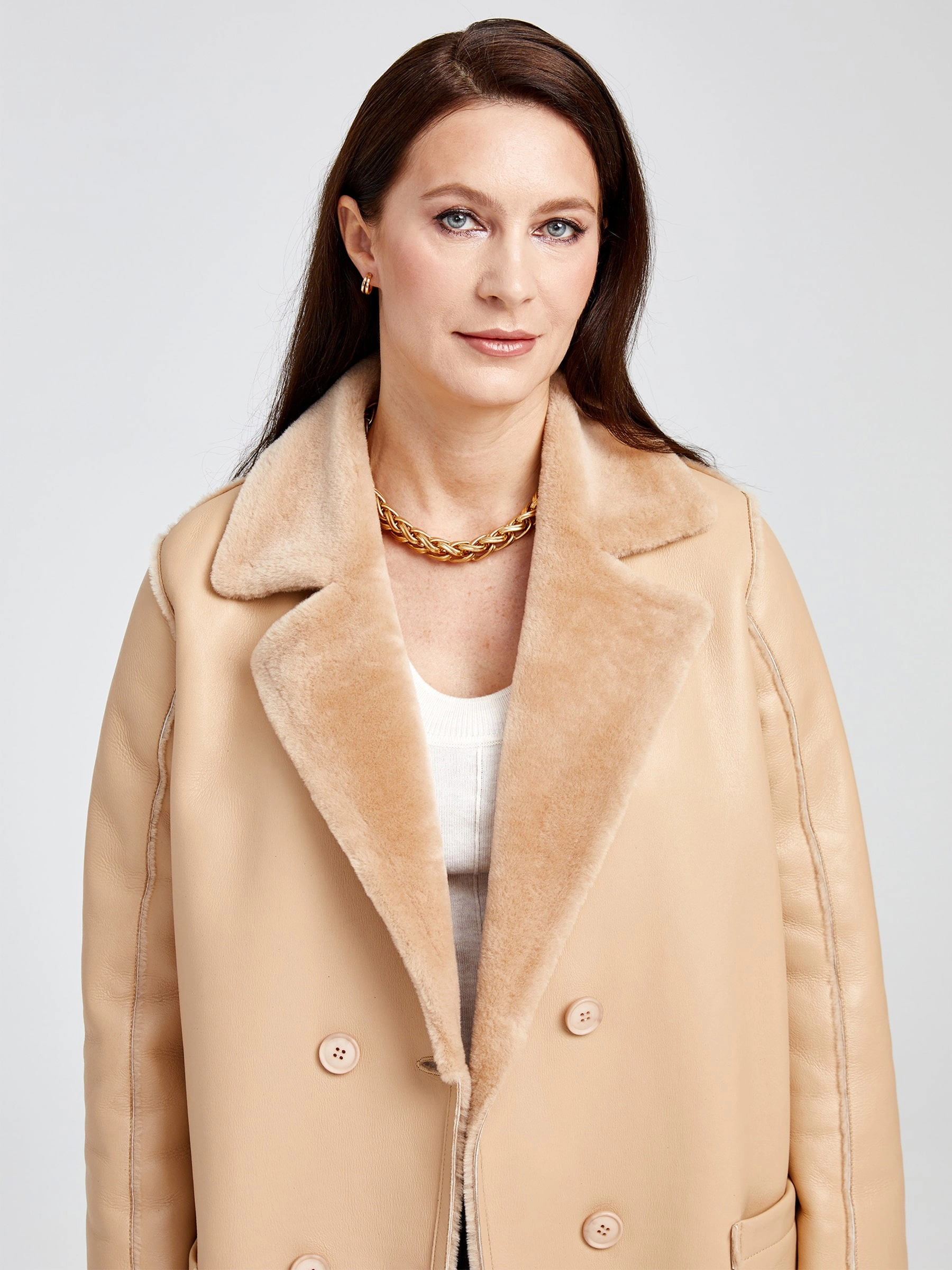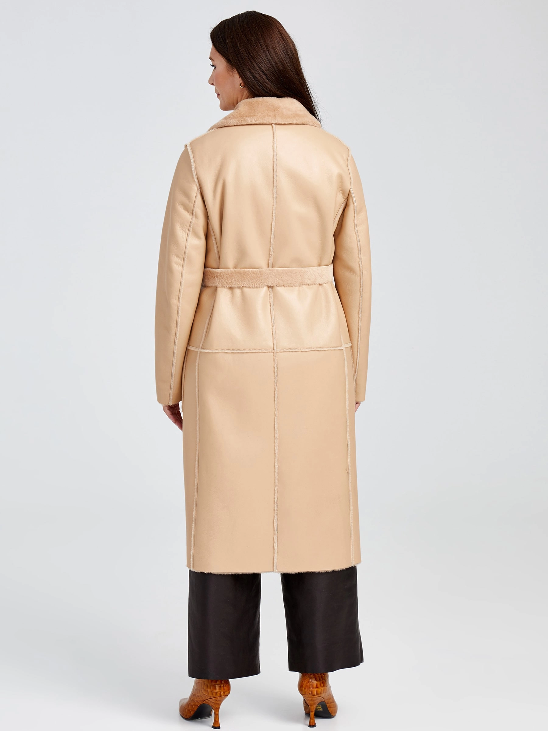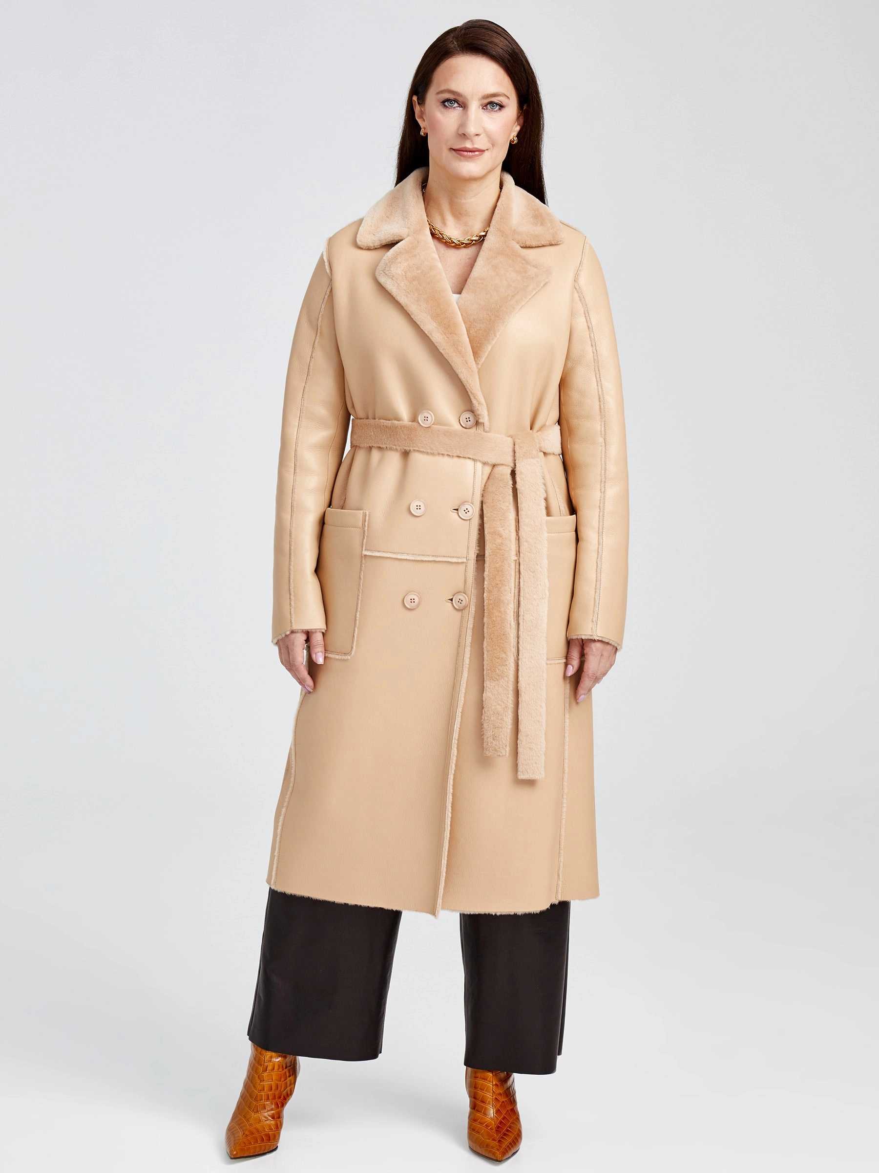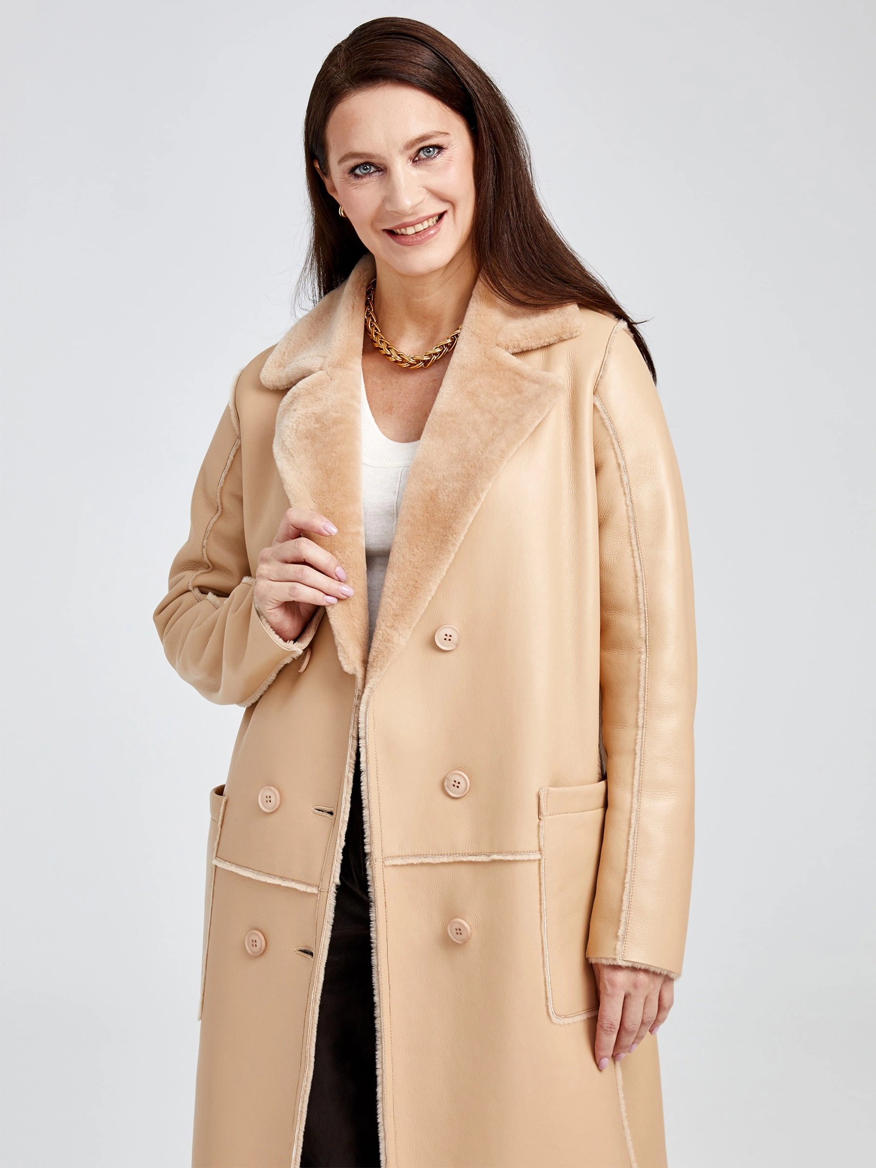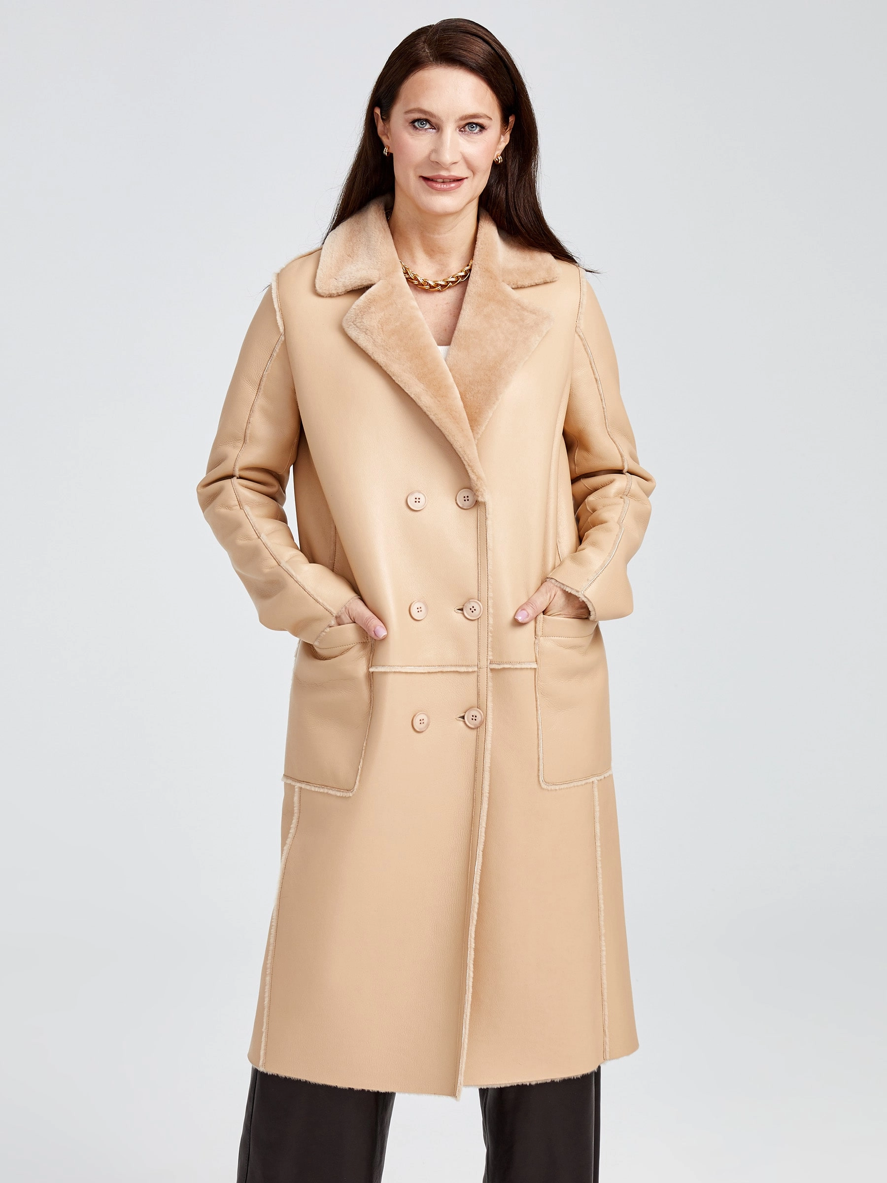 Представляем лимитированную серию: роскошная длинная дублёнка без капюшона премиум-класса из натуральной овчины «мерино» длиной 105 см. Классический прямой силуэт с элегантным английским воротником и эффектной двубортной застёжкой на пуговицах излучает строгую элегантность, а нежнейший шелковистый мех обеспечивает непревзойдённый комфорт и тепло. Дополнена накладными карманами для лаконичного стиля. Совет стилиста: наденьте поверх брючного костюма для статусного образа в офисе или с коктейльным платьем для вечернего выхода — эта дублёнка довершит ваш лук безупречной роскошью.