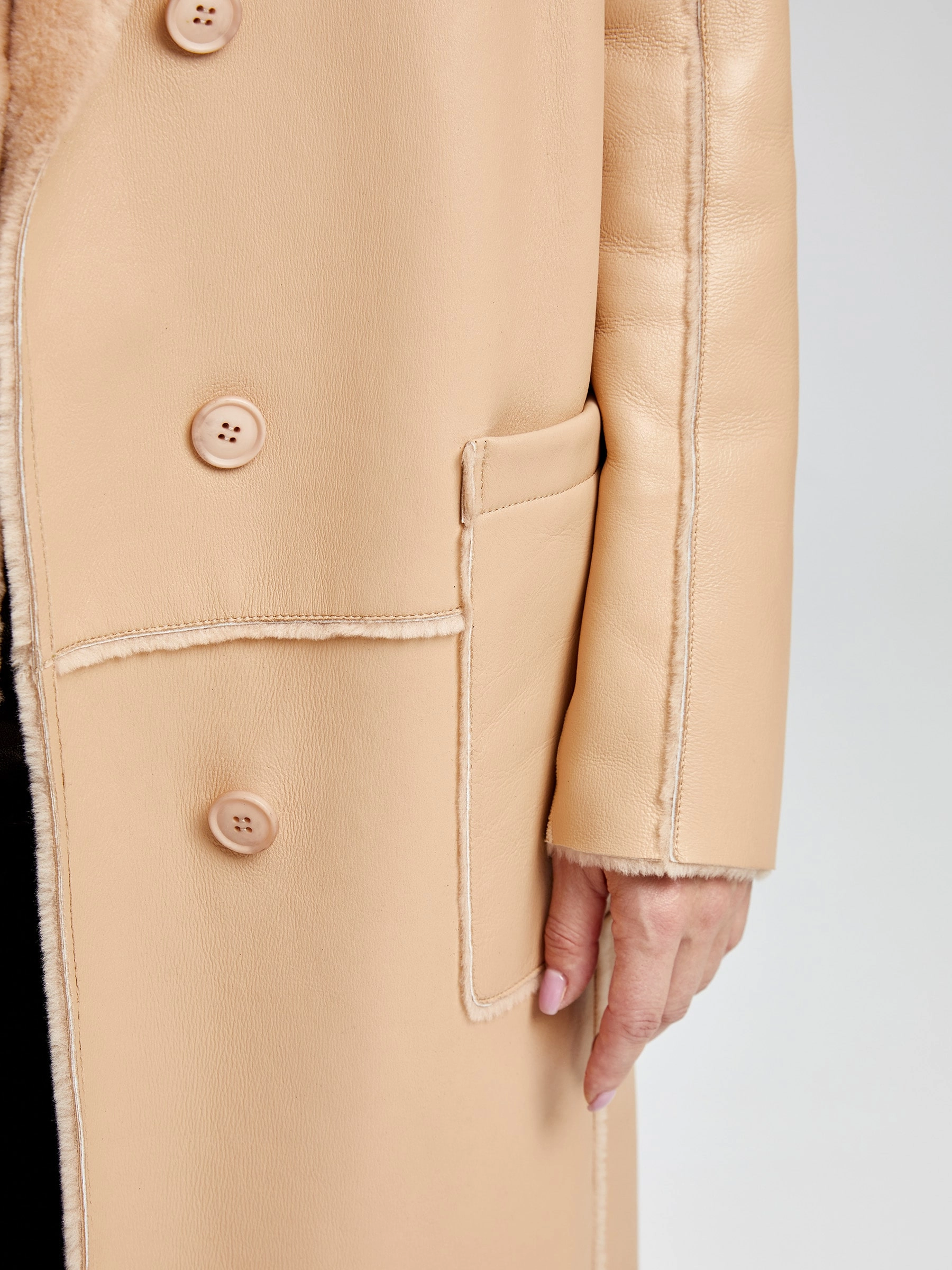 Товар дубленка женская двубортная премиум класса 2000, бежевая, размер 46, артикул 62280 выполнен из овчина "мерино" с застежкой пуговицы. Рассчитан на сезон: осень-зима. Длина изделия 105 см, силуэт прямой.