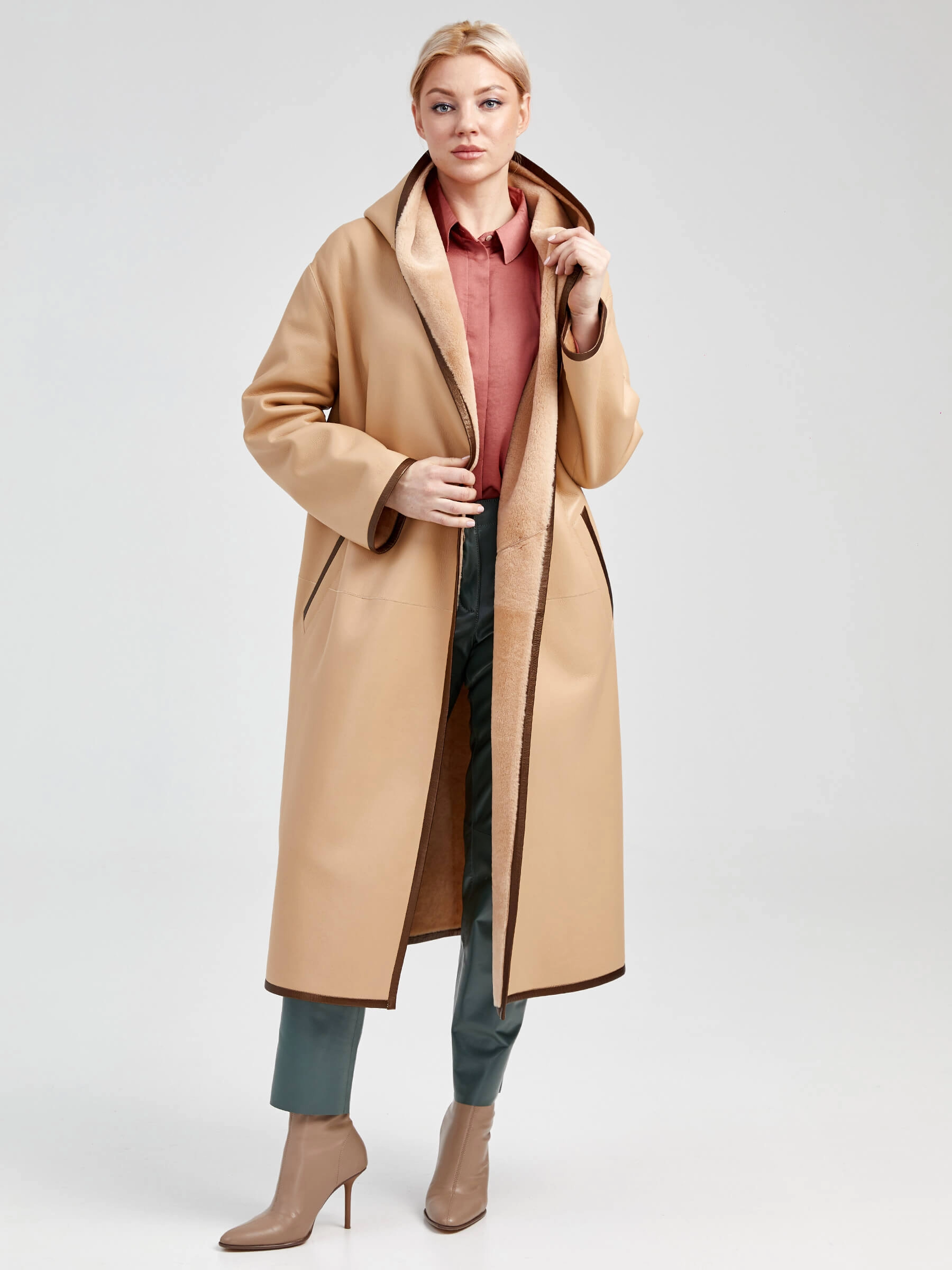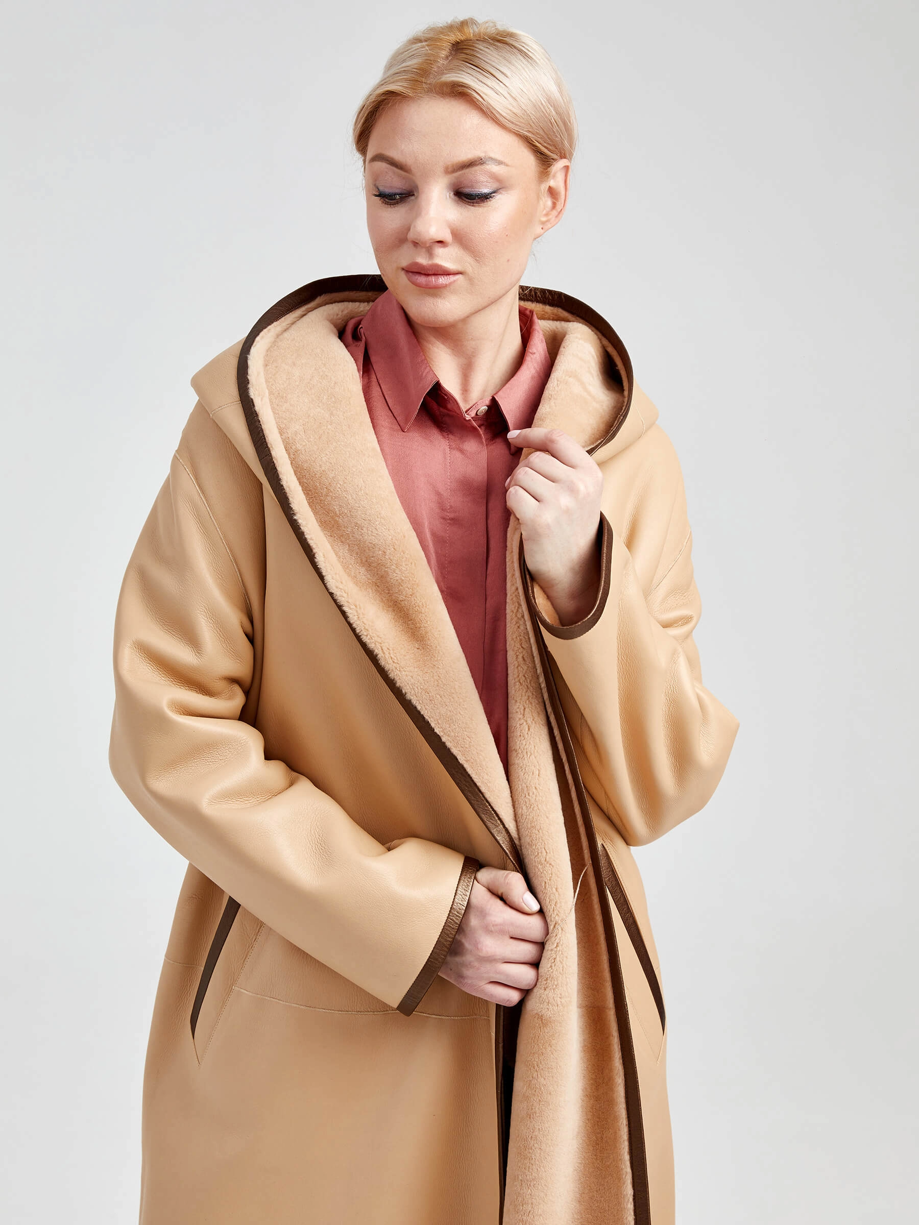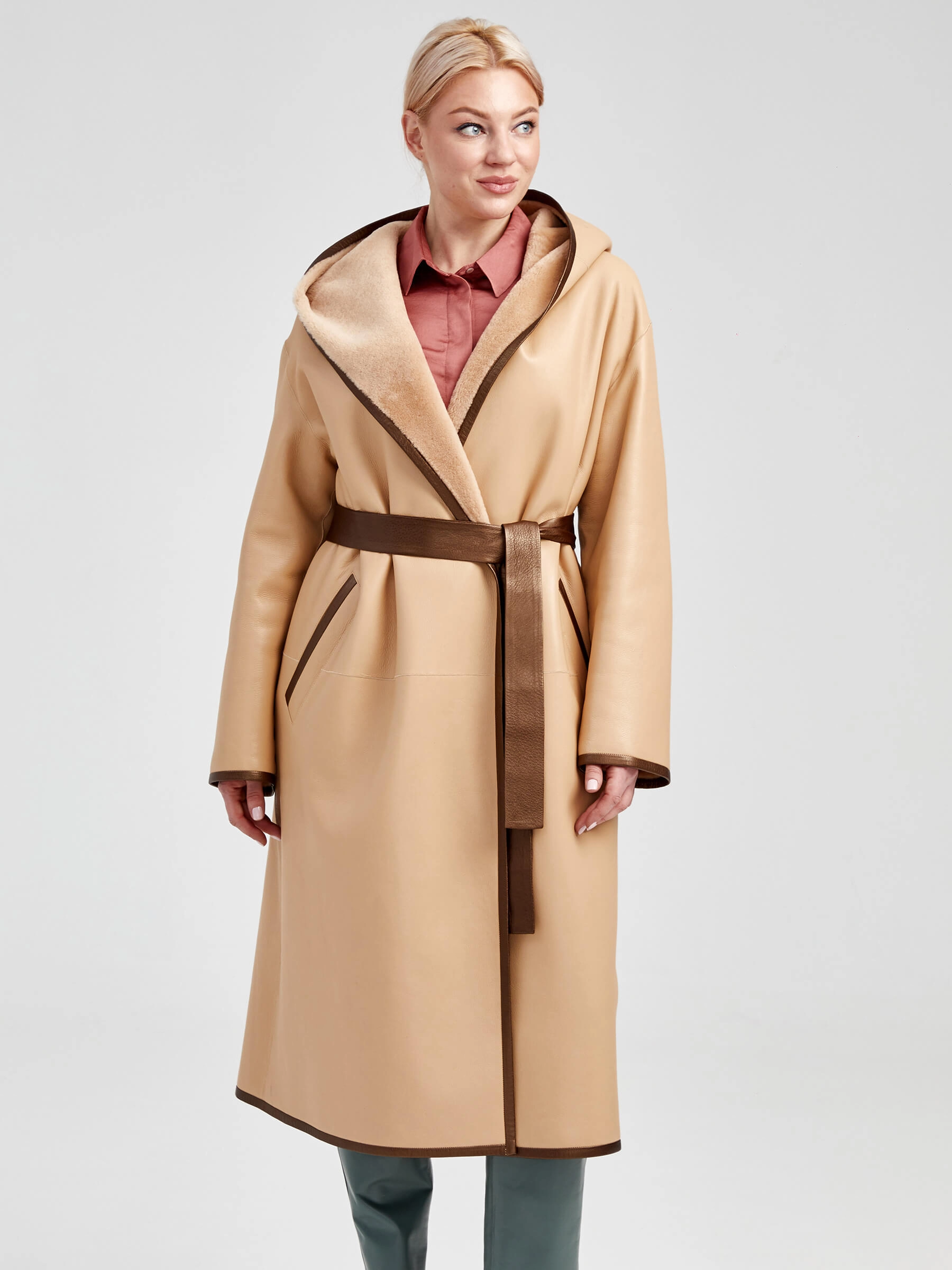 Двусторонняя женская дубленка халат с капюшоном премиум класса 2001/1, бежевая, размер 44, артикул 62291