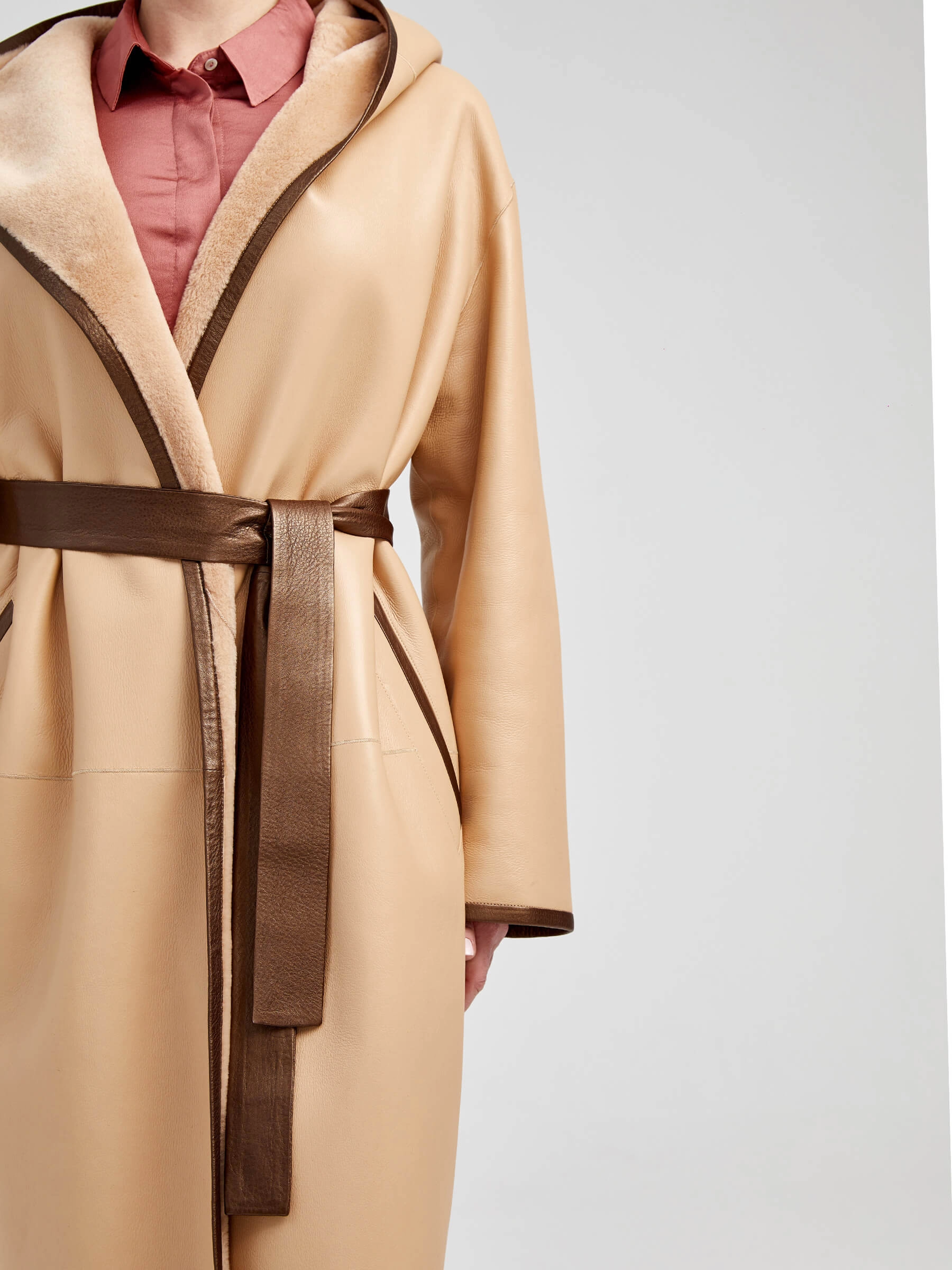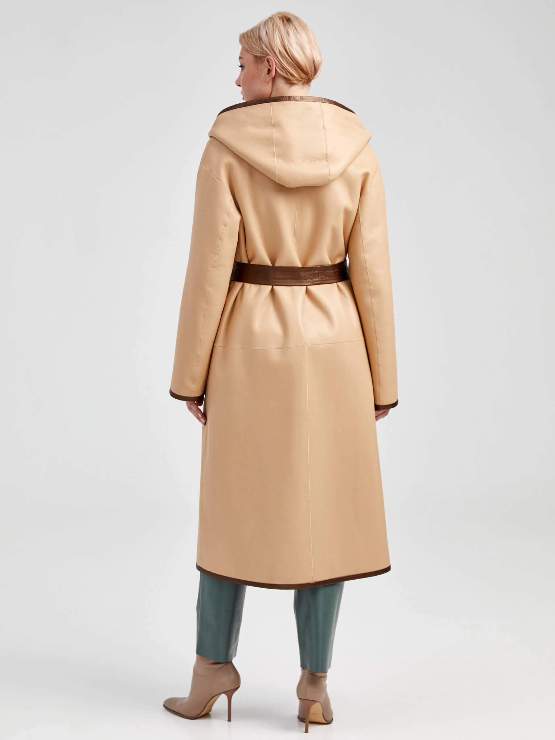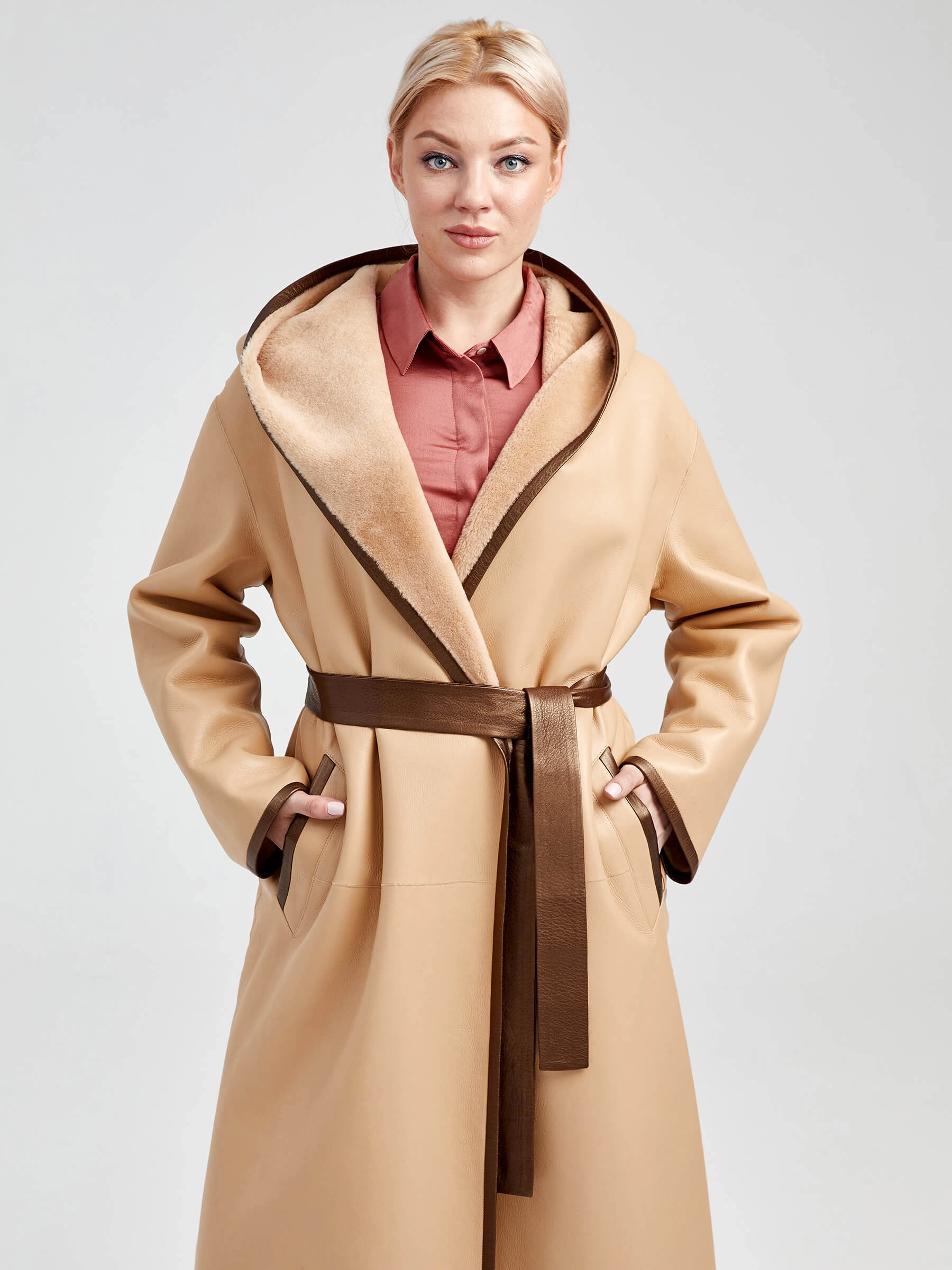Двусторонняя женская дубленка халат с капюшоном премиум класса 2001/1, бежевая, размер 44, артикул 62291