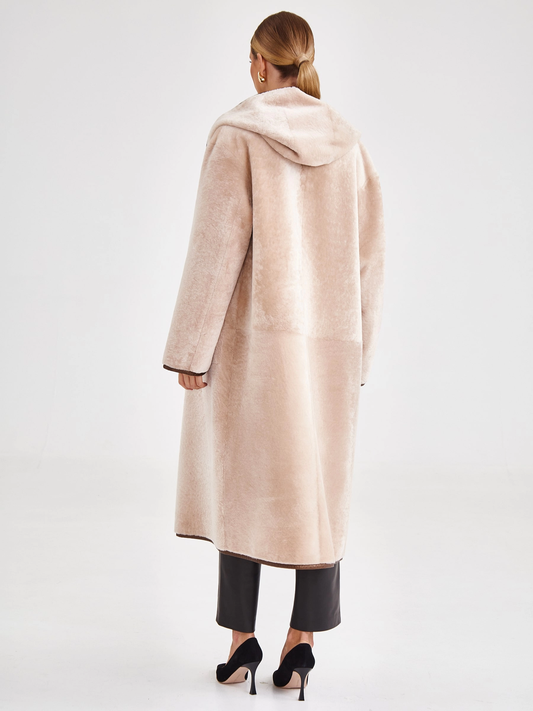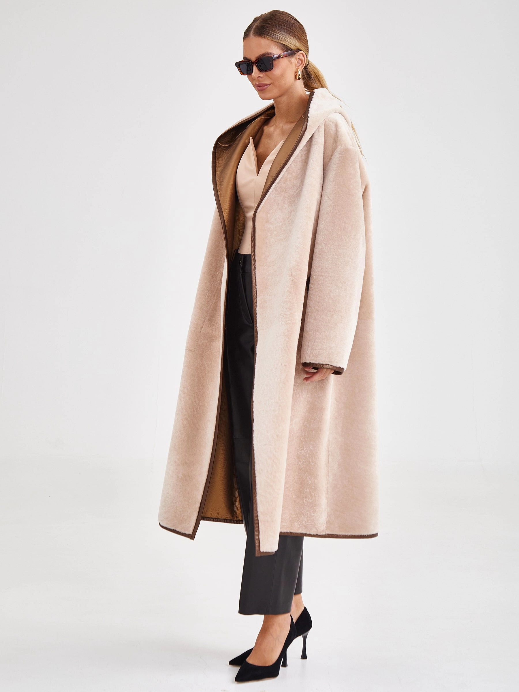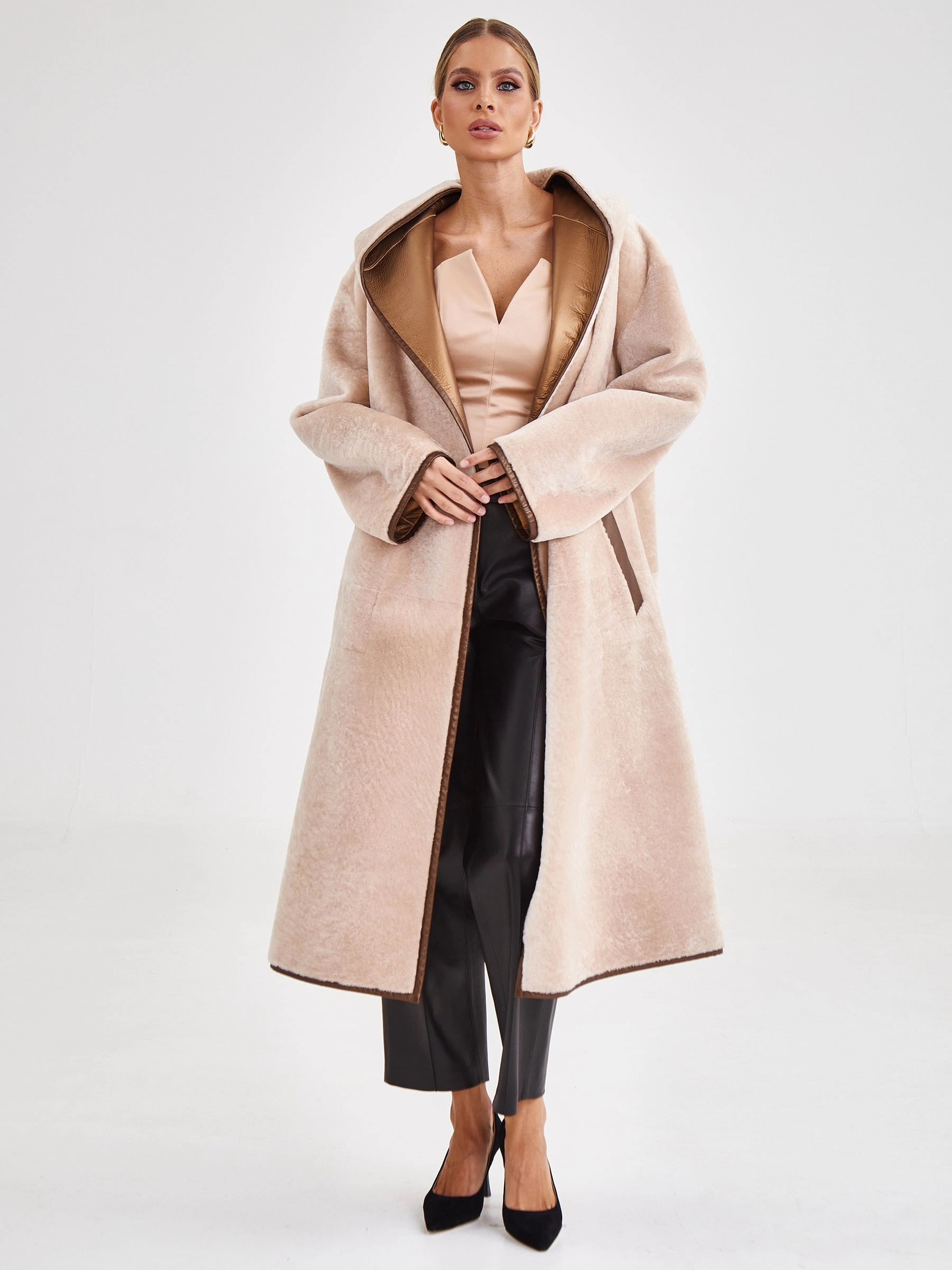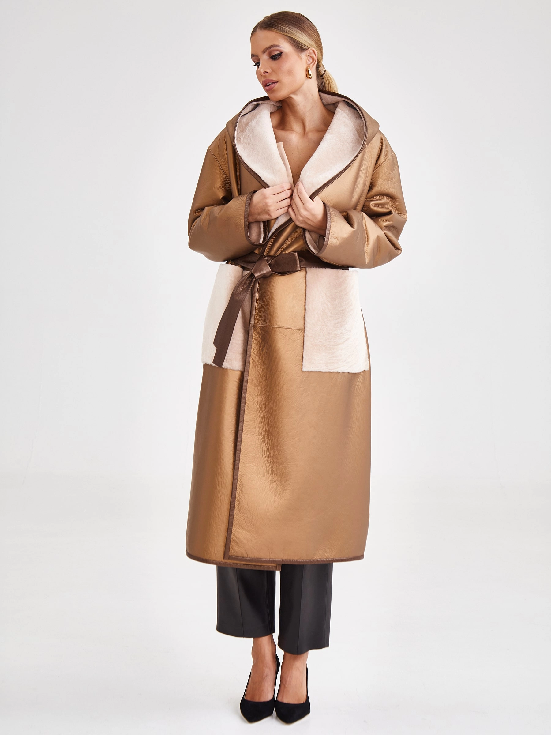Эксклюзивная двусторонняя дубленка-халат премиум-класса из натуральной овчины астраган с шелковистой стриженой фактурой и технологичным водоотталкивающим покрытием. Свободный удлиненный силуэт длиной 117 см, до щиколотки, с глубоким запахом дополнен несъемным капюшоном, трансформирующимся в шалевый воротник, и контрастным поясом. Удлиненные рукава подчеркивают элегантность силуэта. Совет стилиста: сочетайте с лаконичным базовым гардеробом нейтральных тонов — это позволит сделать акцент на роскошной фактуре меха и подчеркнет практичность модели.