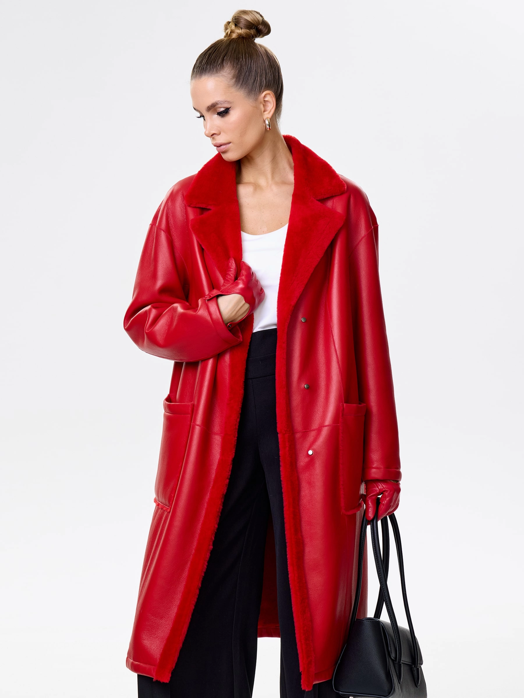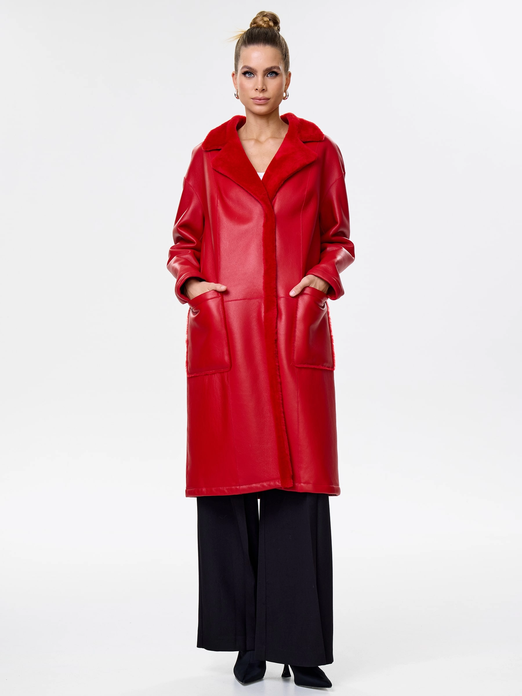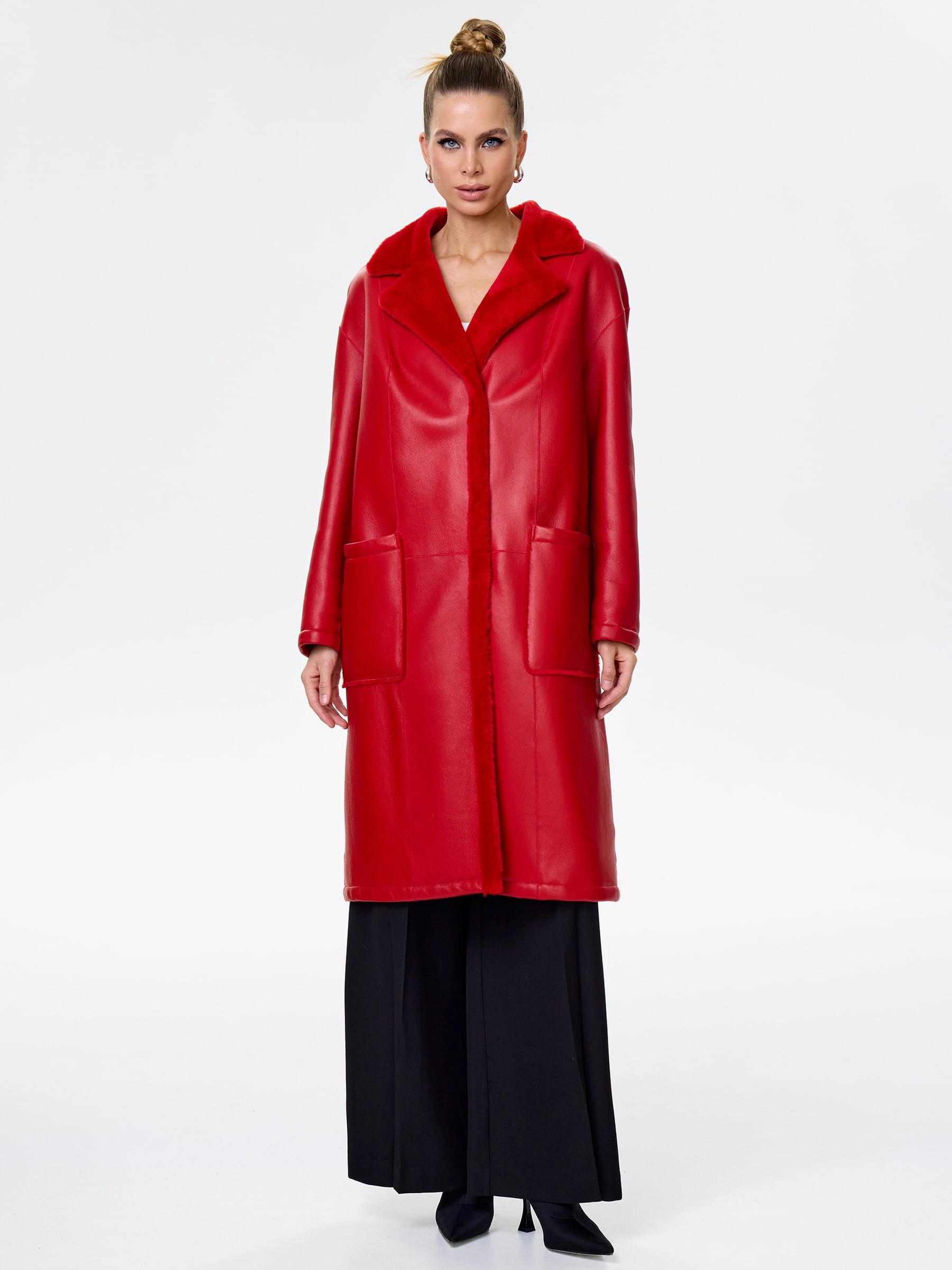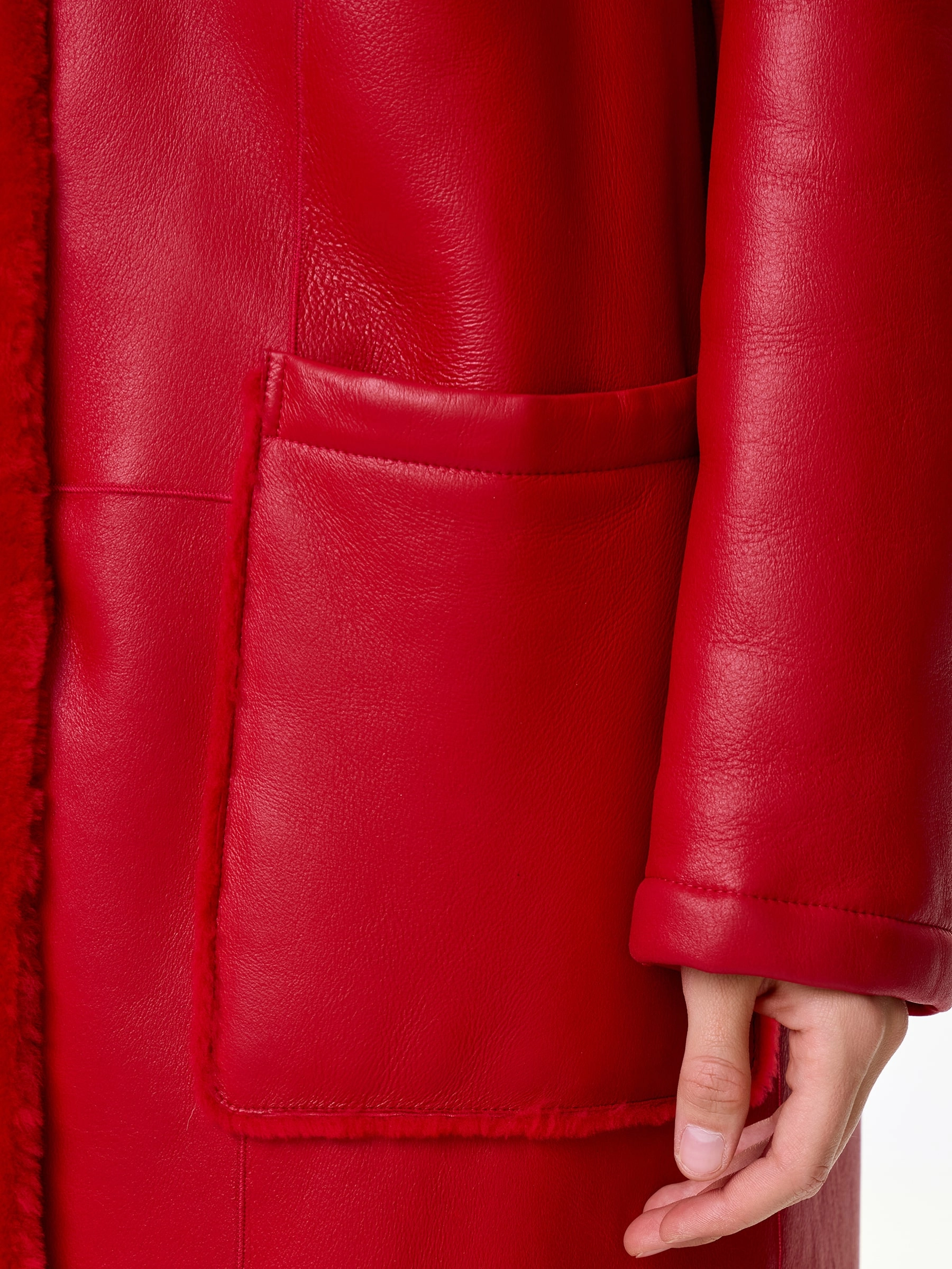 Товар длинная женская дубленка оверсайз премиум класса 2002, красная, размер 44, артикул 62441 выполнен из овчина "мерино" с застежкой кнопки. Рассчитан на сезон: осень-зима. Длина изделия 105 см, силуэт прямой.