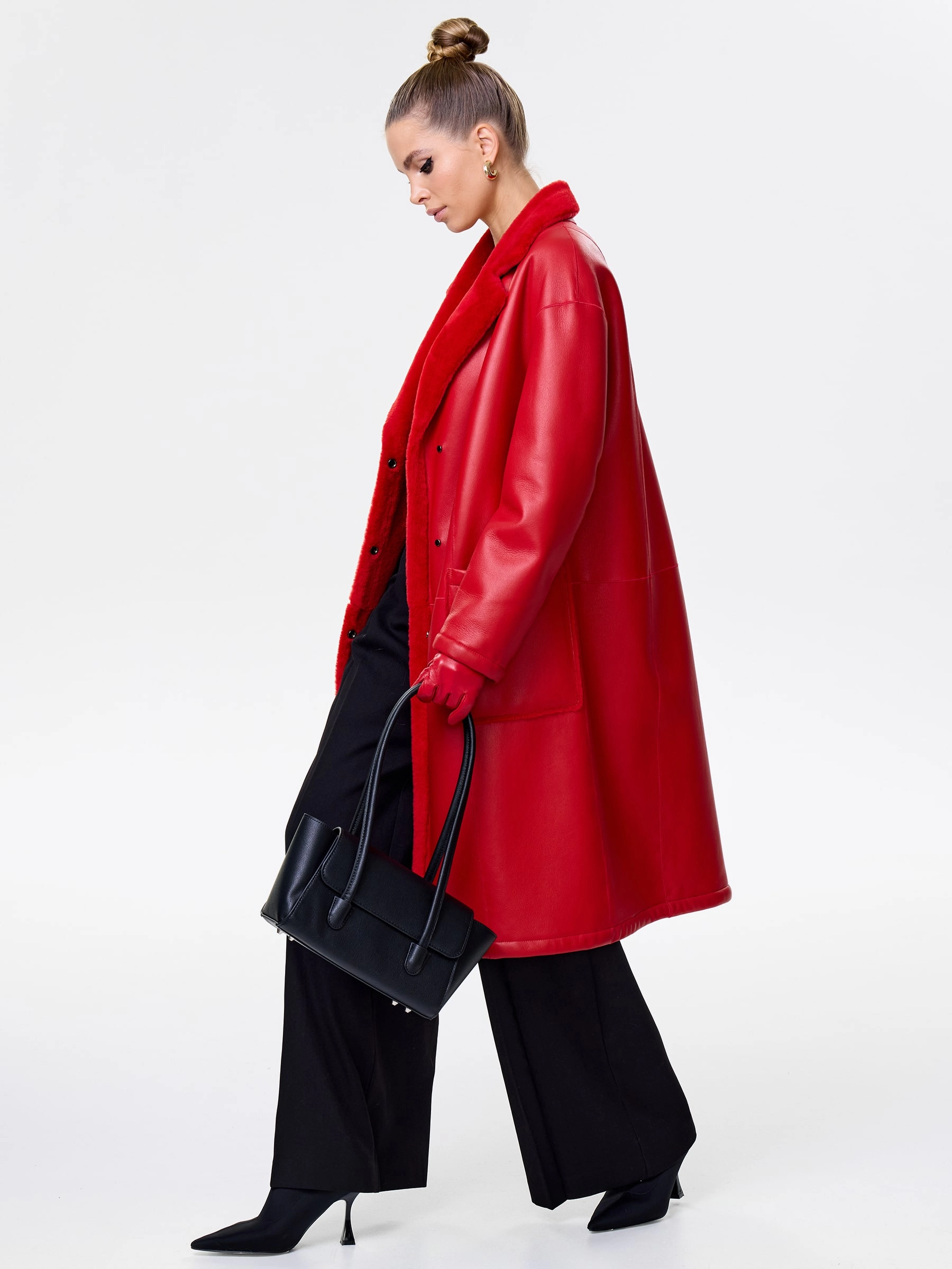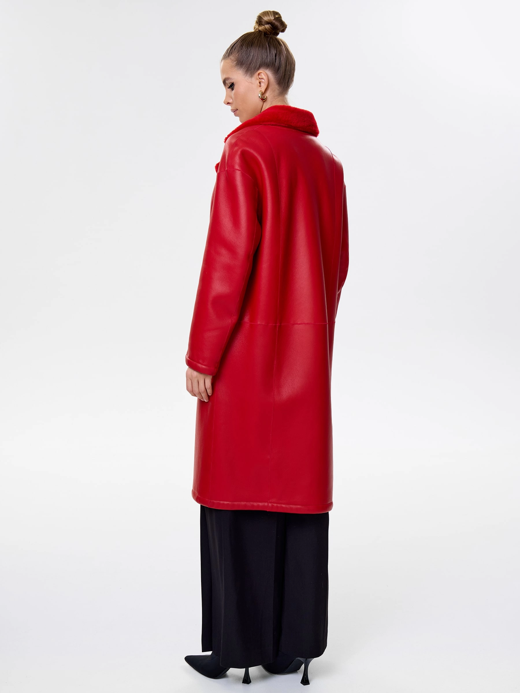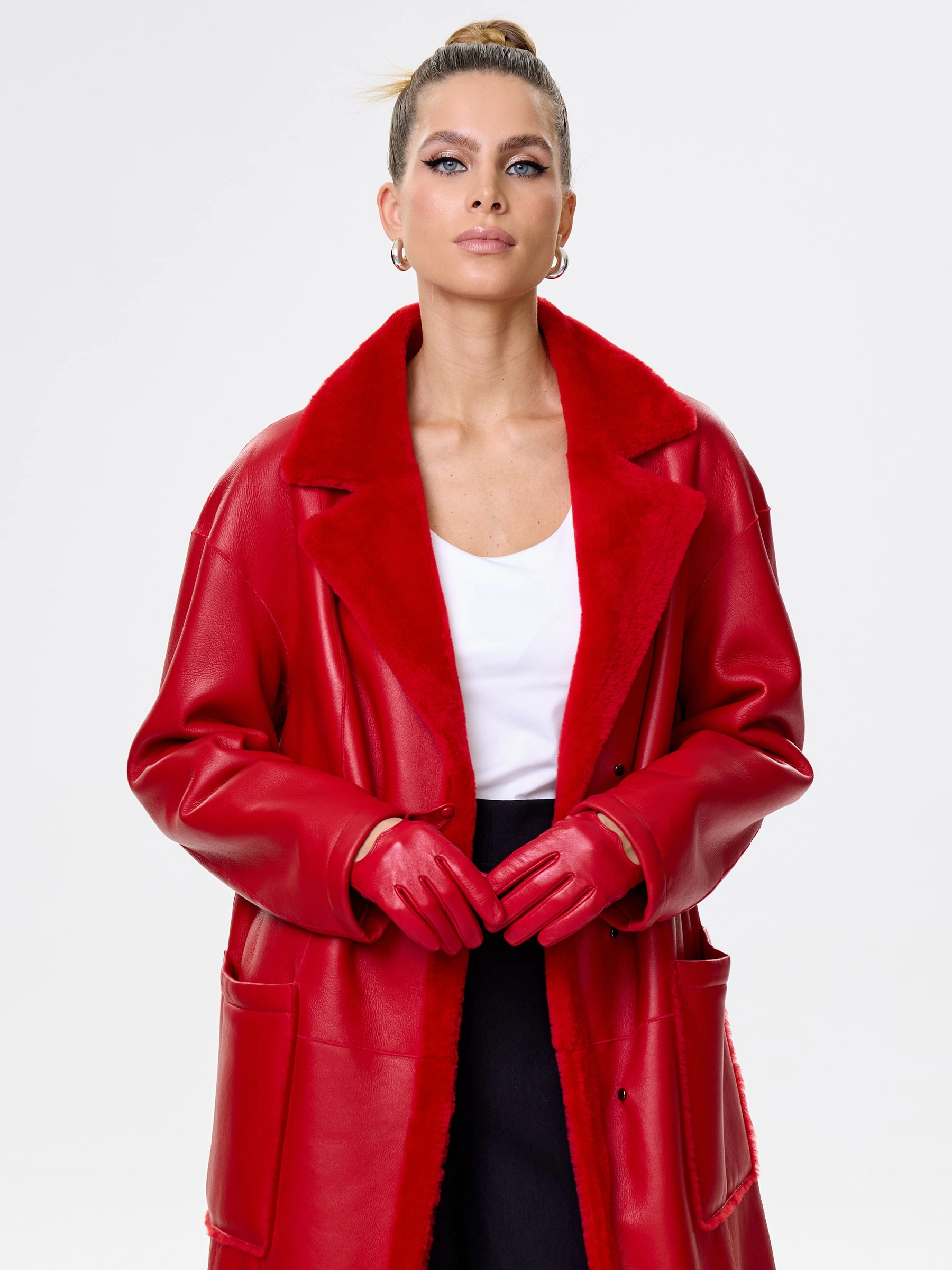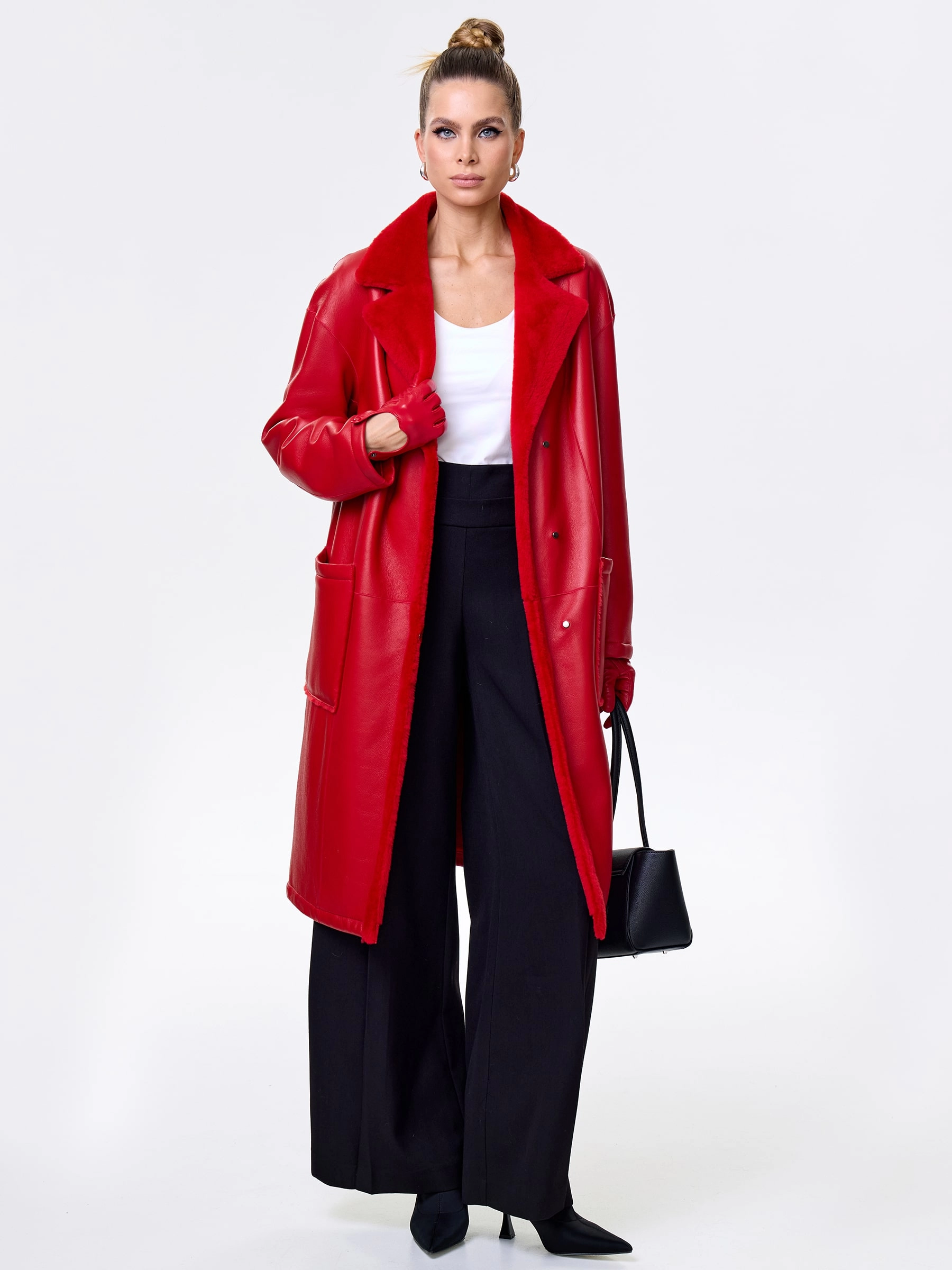 Товар длинная женская дубленка оверсайз премиум класса 2002, красная, размер 44, артикул 62441 выполнен из овчина "мерино" с застежкой кнопки. Рассчитан на сезон: осень-зима. Длина изделия 105 см, силуэт прямой.