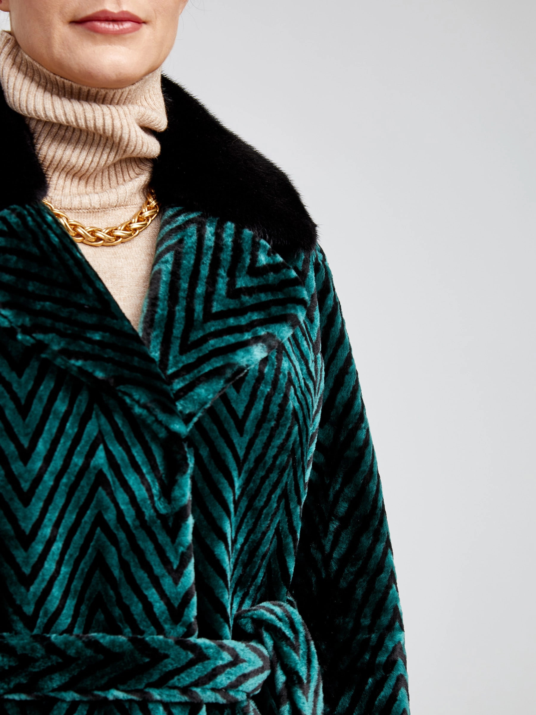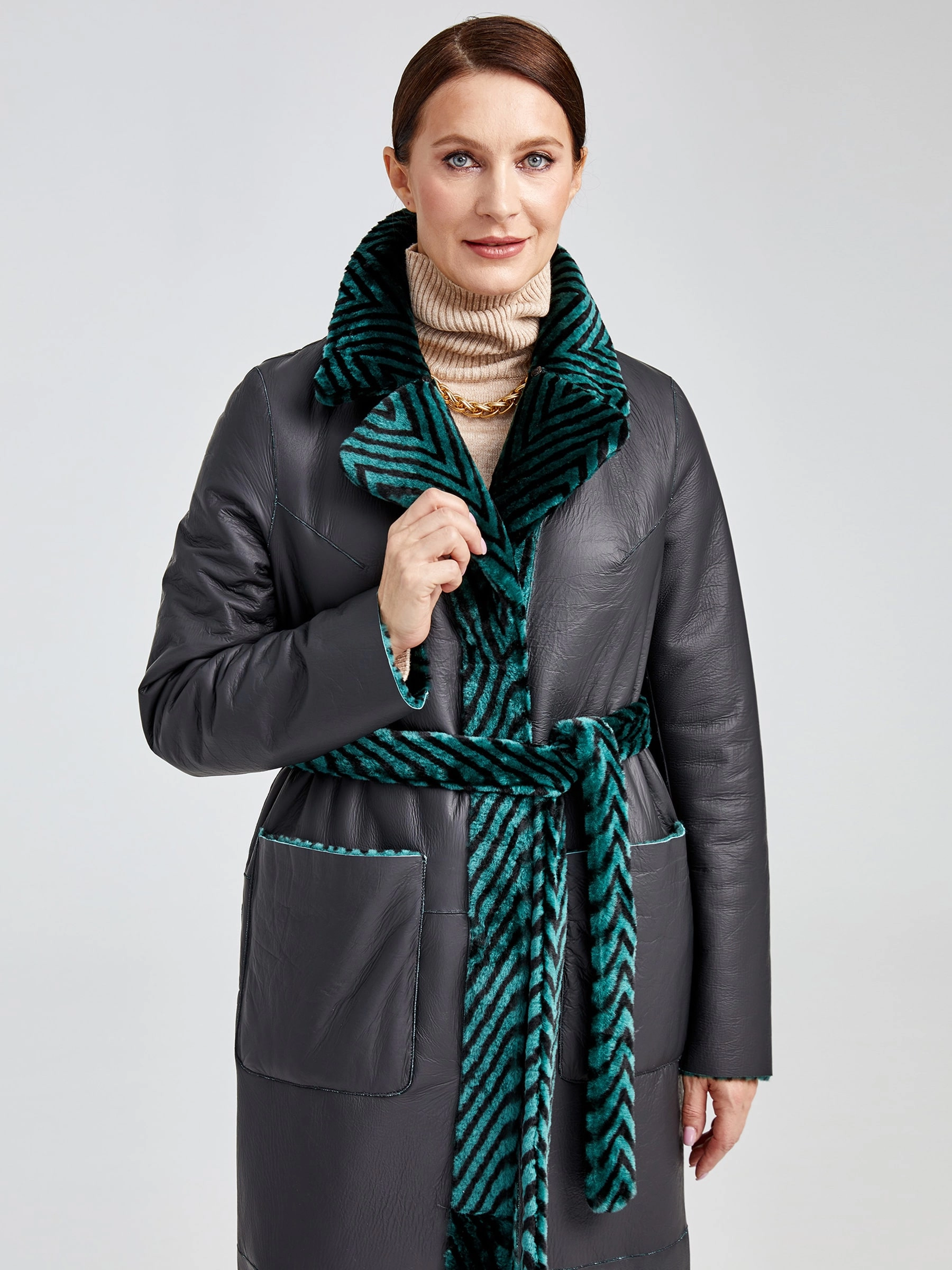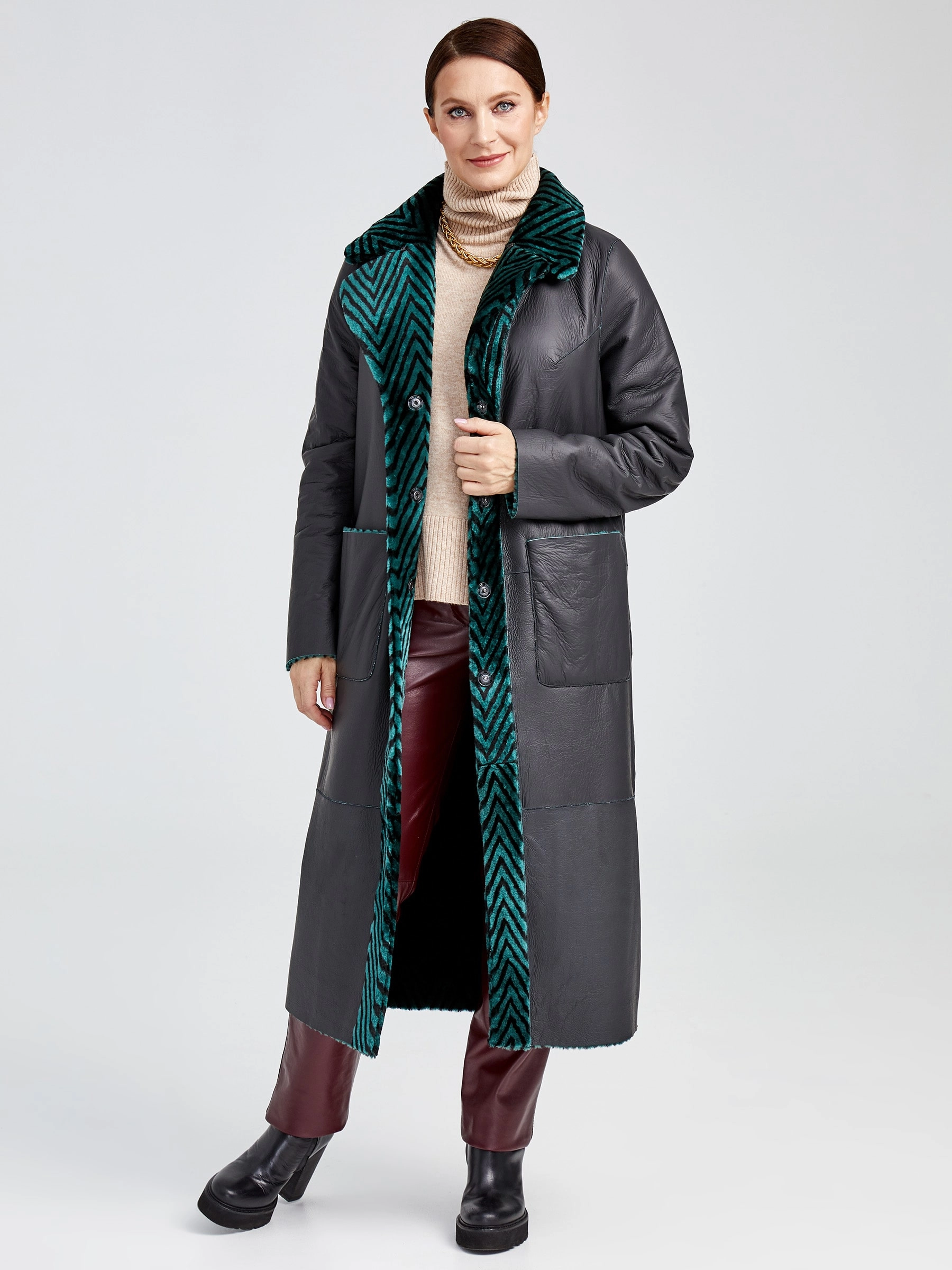 Роскошная двусторонняя дублёнка премиум-класса длиной 119 см: принтованный мех астрагана, то есть ягнёнка, с одной стороны и благородное бронзовое металлизированное покрытие — с другой. Свободный силуэт со съёмным английским воротником из густого чёрного меха норки и удобной застёжкой на кнопках создаёт образ исключительной элегантности. Два накладных кармана и длинный пояс подчёркивают дизайн. Совет стилиста: носите со стороной из астрагана и меховым воротником с платьем-миди и сапогами для вечера или со стороной-металлик без воротника с водолазкой, кожаными брюками и ботинками для дерзкого повседневного лука — максимальная универсальность в одной вещи.