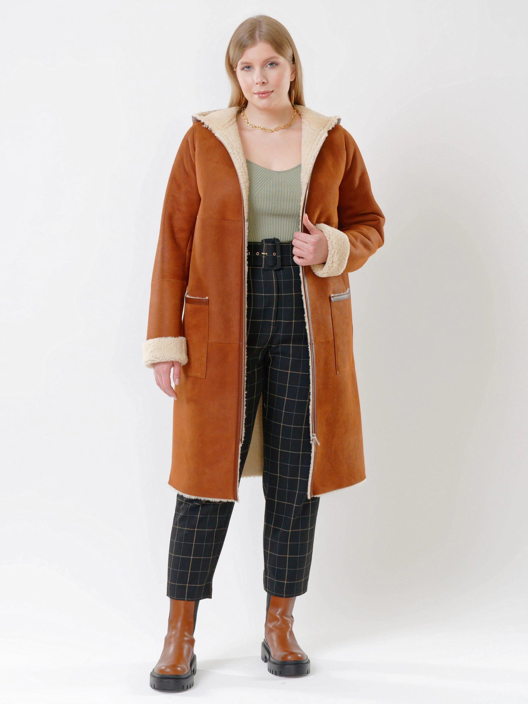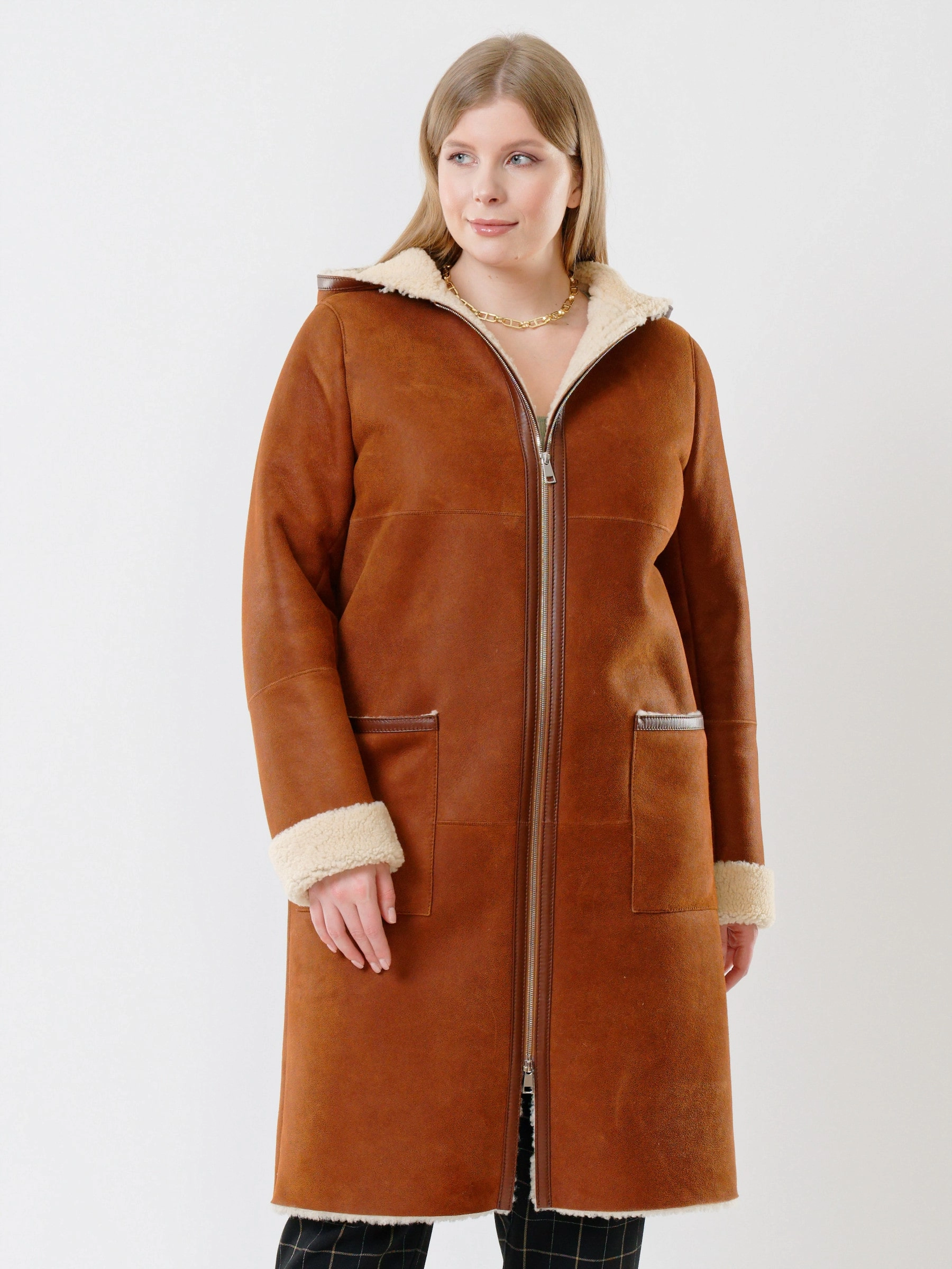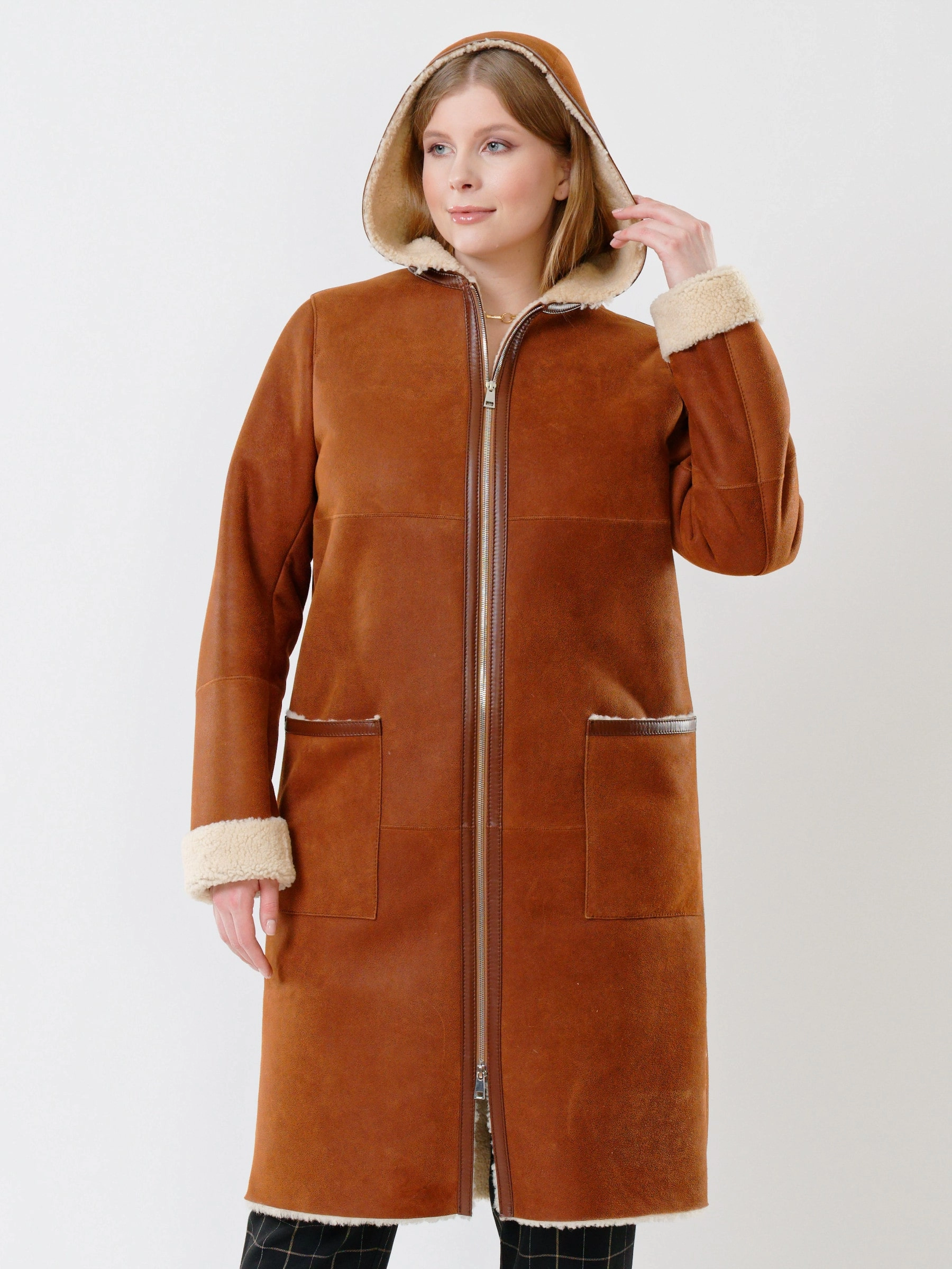 Женская длинная дубленка из керли с капюшоном 203, табачно-рыжая, размер 44, артикул 61500
