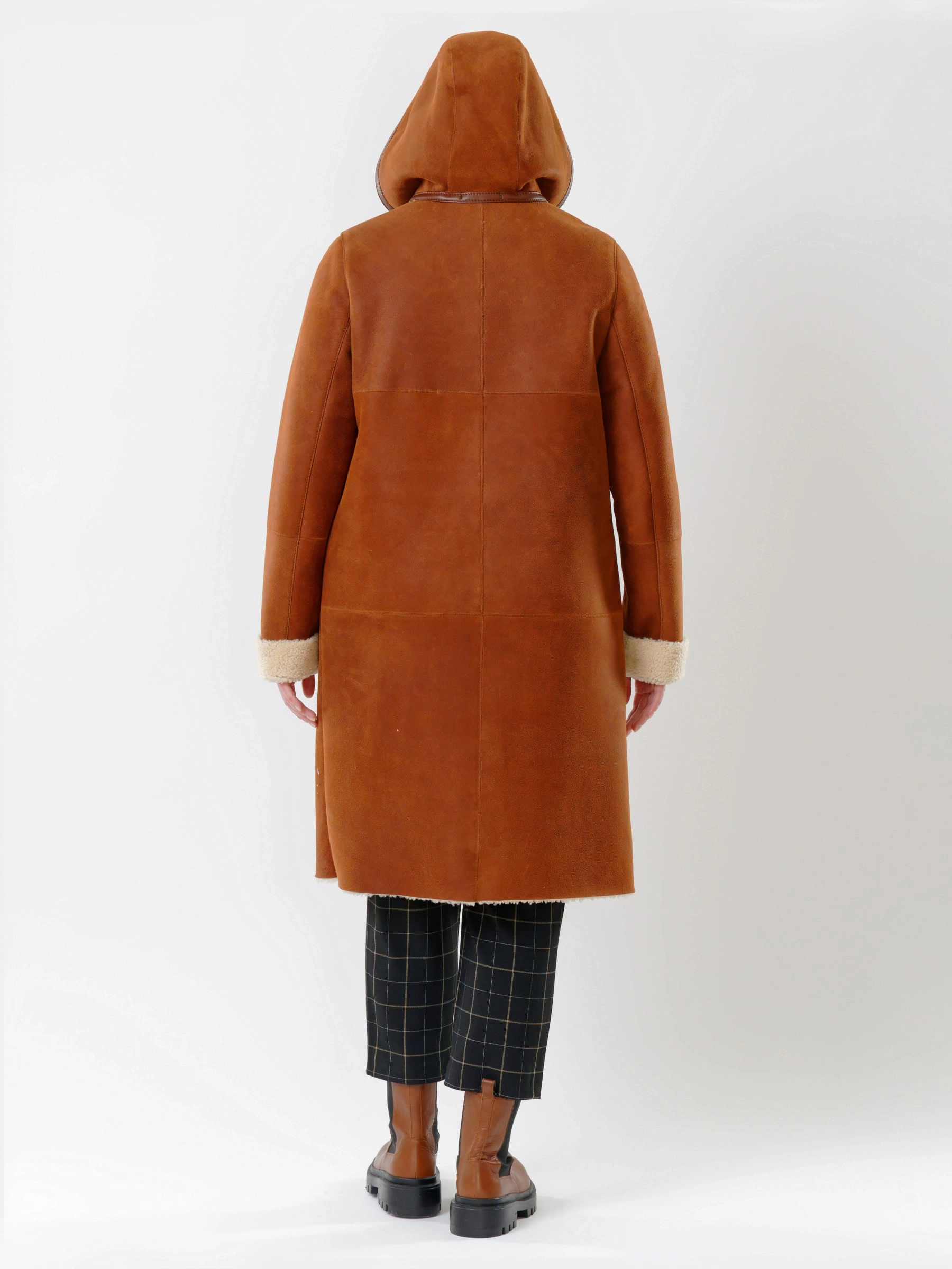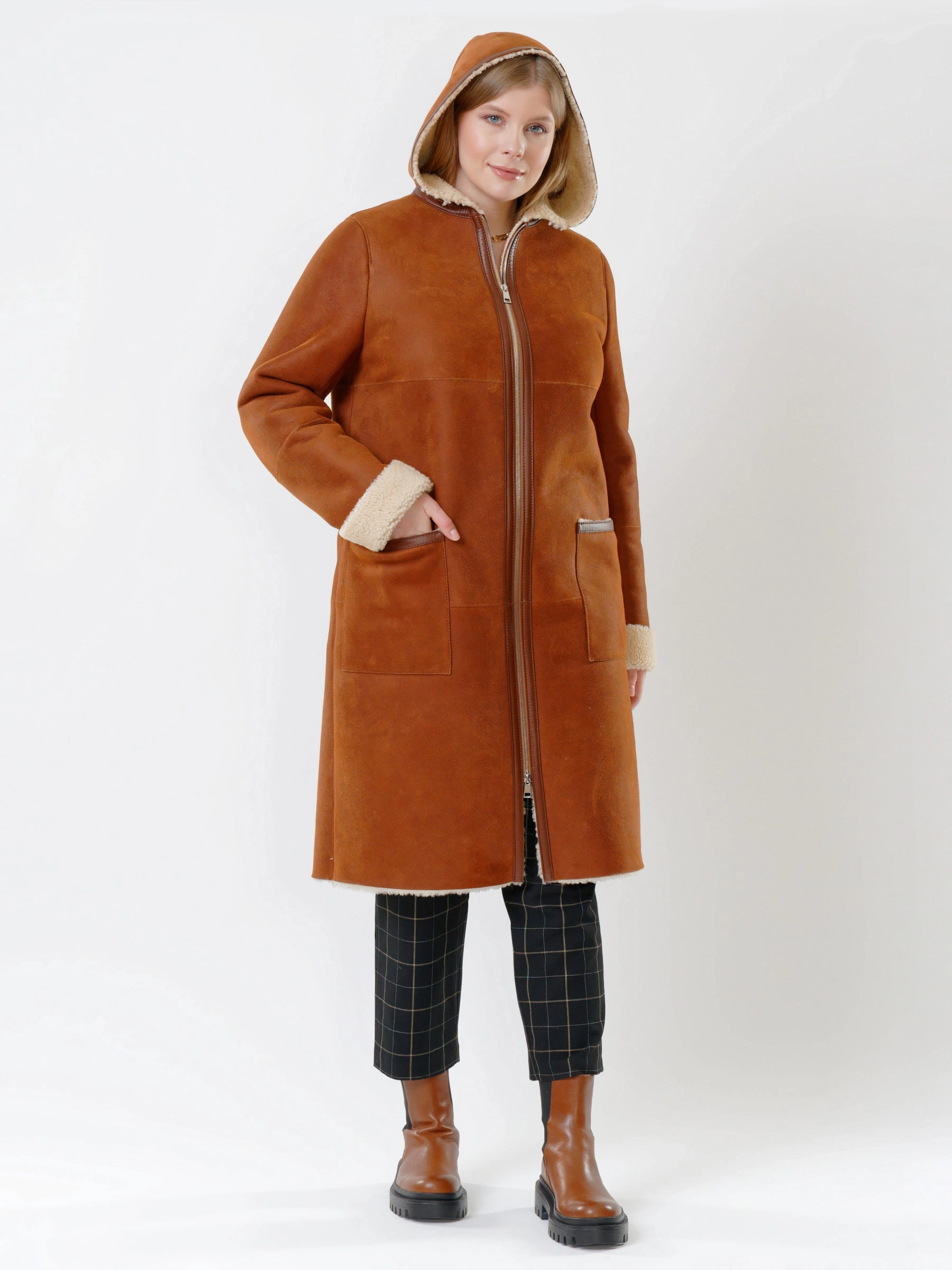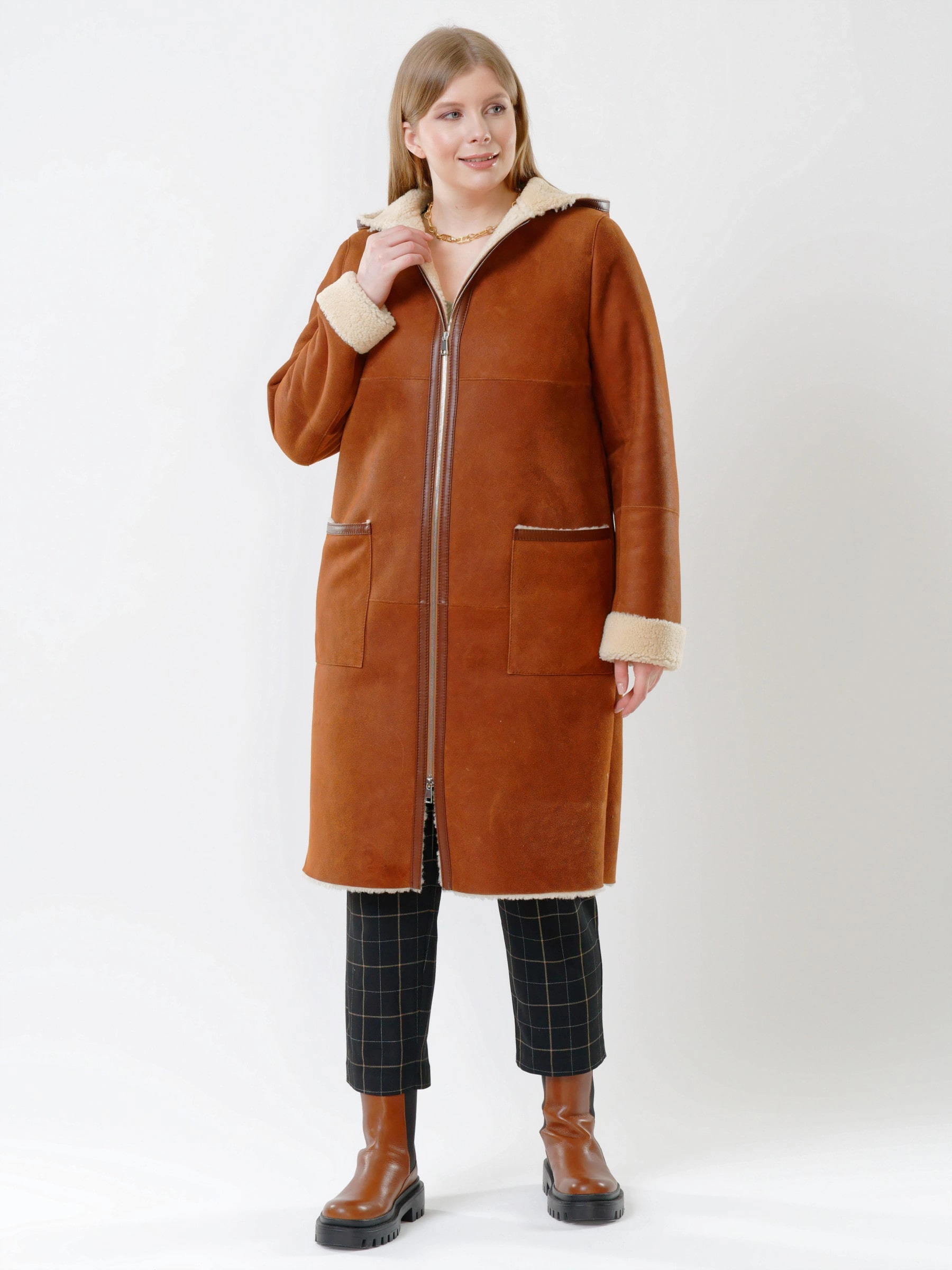 Женская длинная дубленка из керли с капюшоном 203, табачно-рыжая, размер 44, артикул 61500