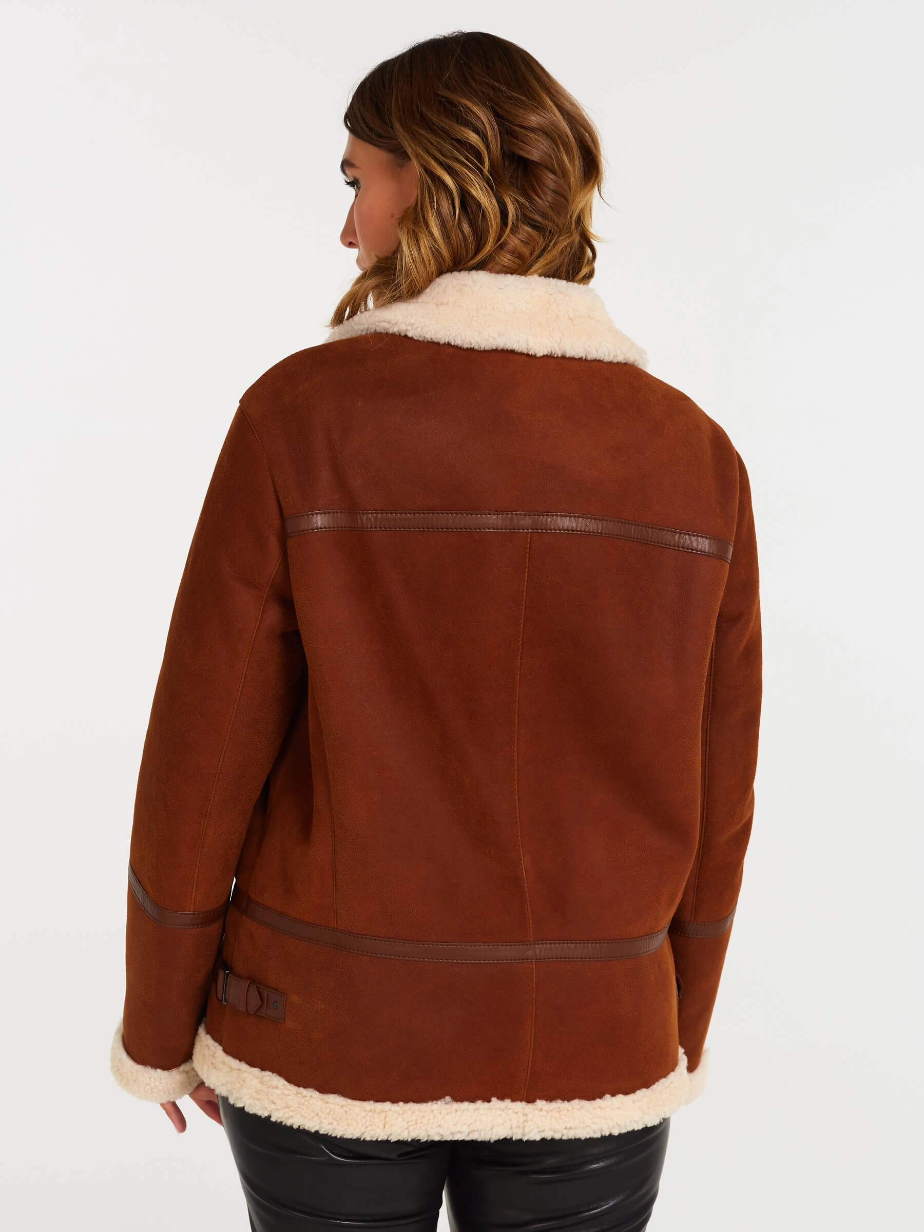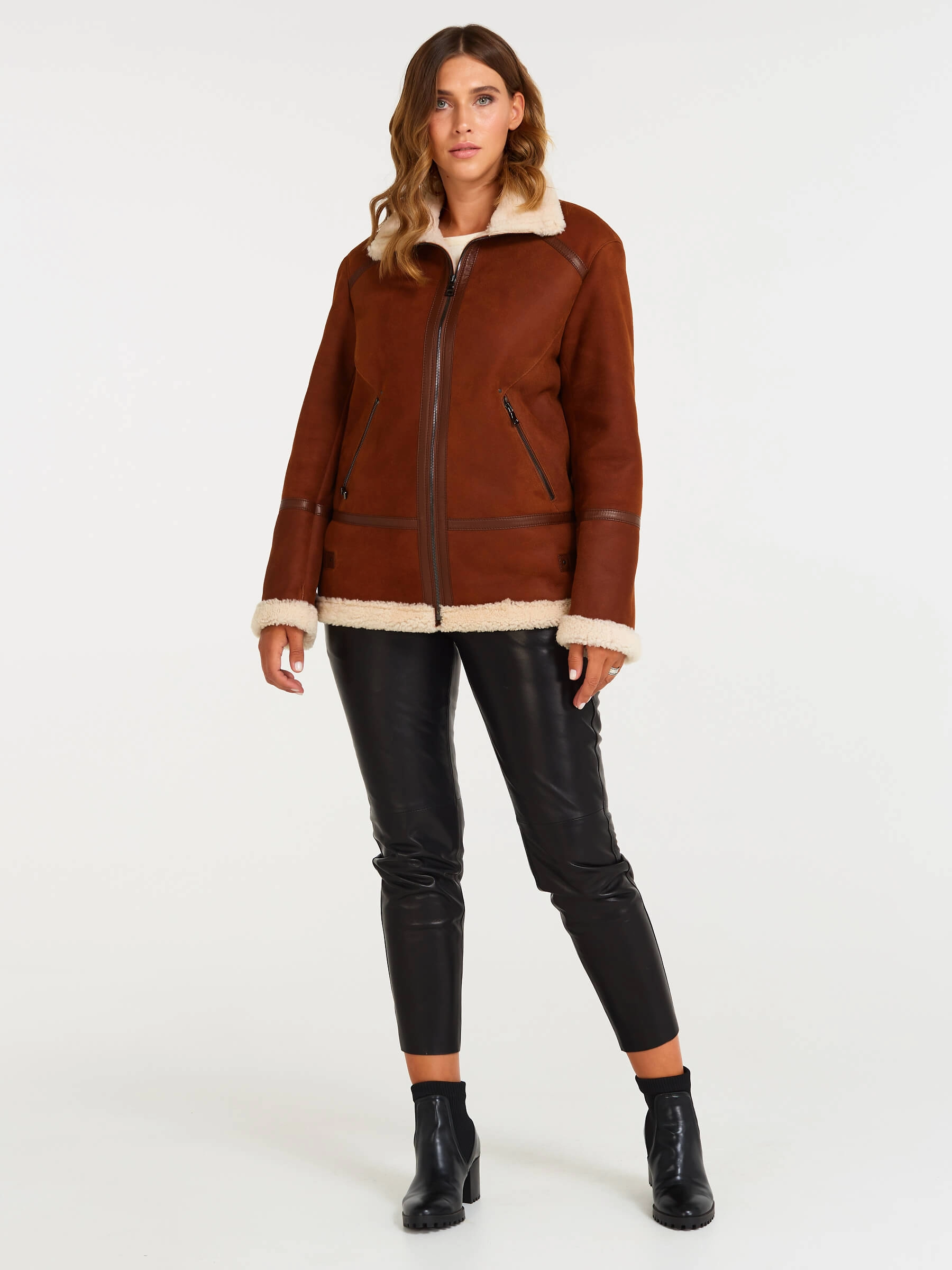 Короткая женская дубленка авиатор из керли 204, табачно-рыжая, размер 48, артикул 61410