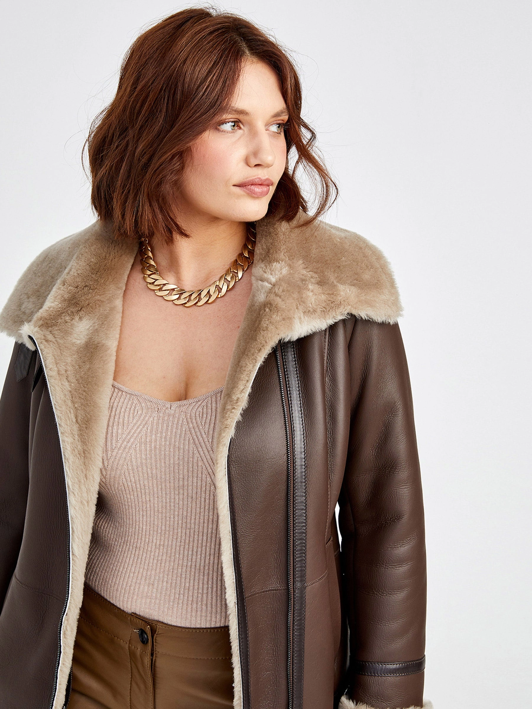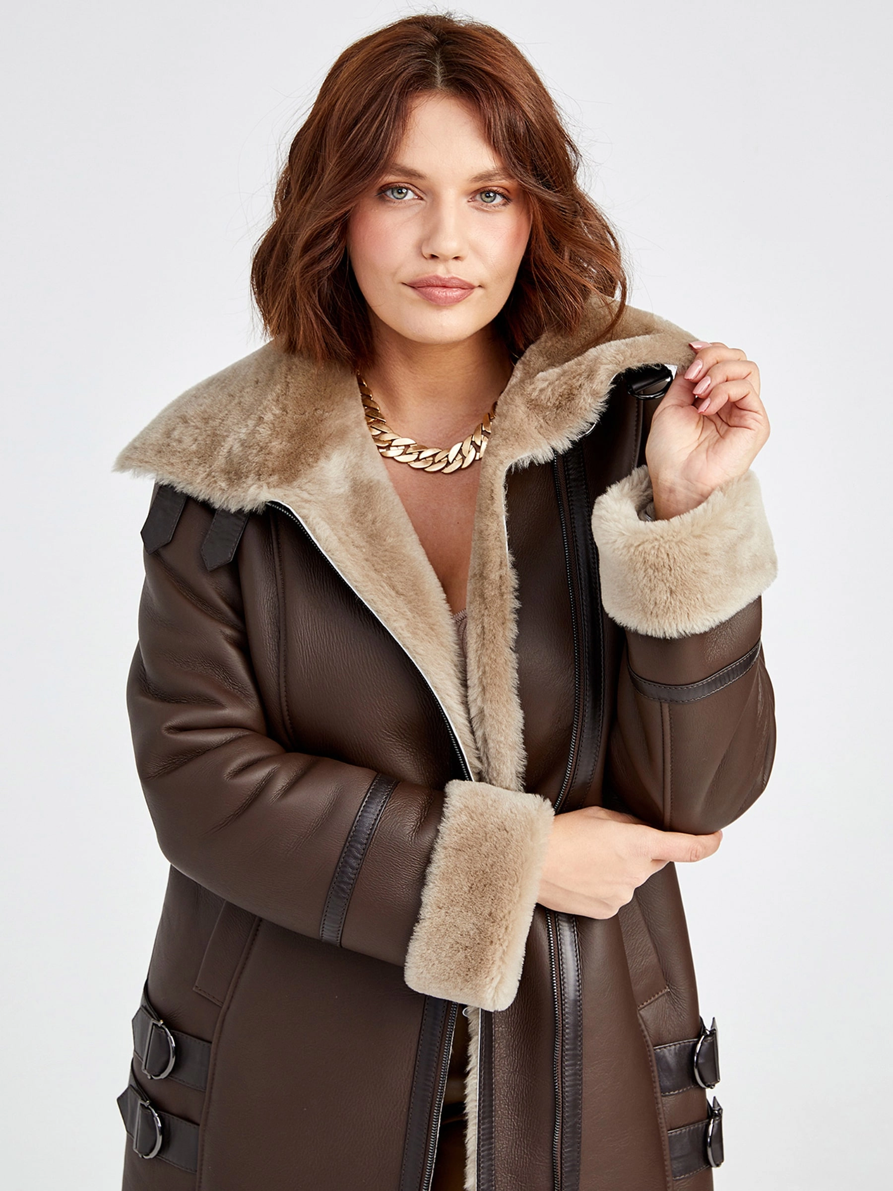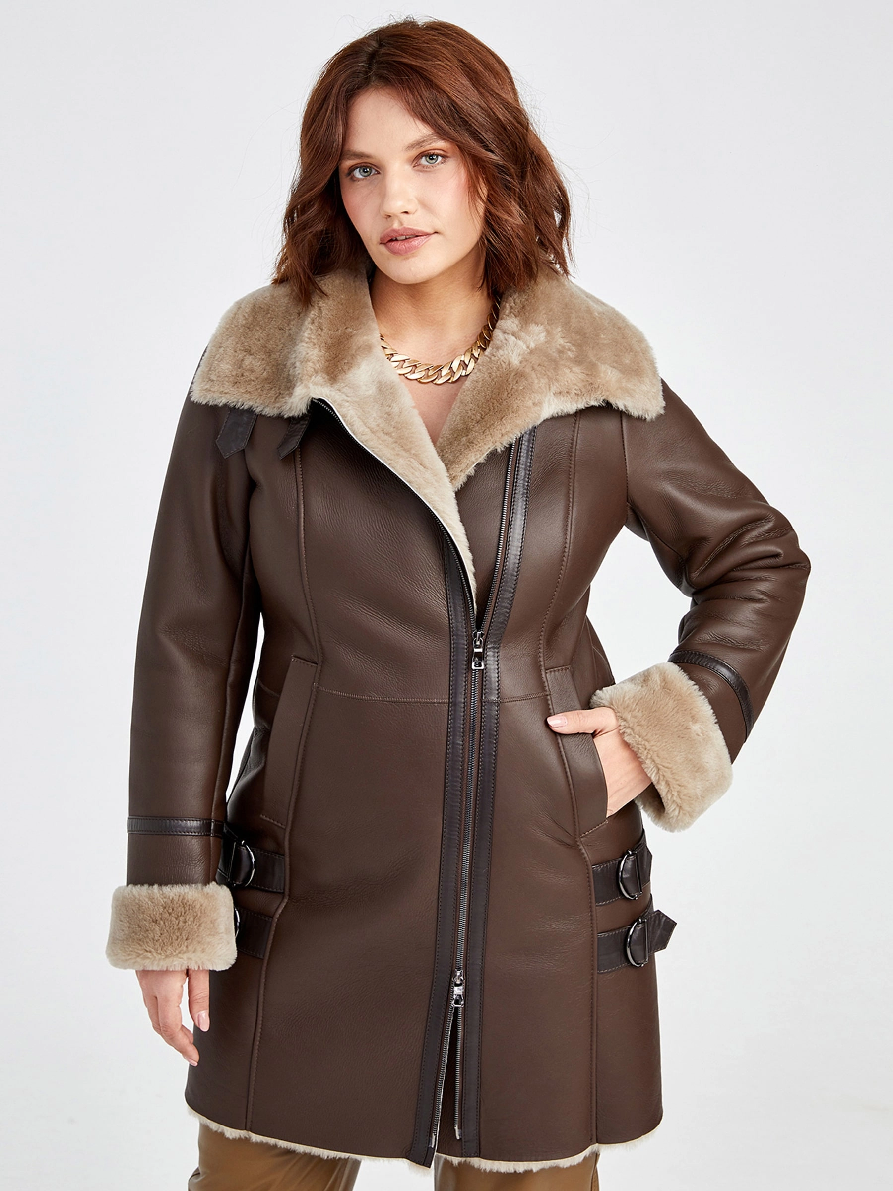 Элегантная короткая женская дублёнка-косуха без капюшона из натуральной овчины «мерино» насыщенного коричневого цвета. Застёгивается на молнию с фиксацией ремешками; полуприлегающий силуэт длиной 85 см подчёркивает фигуру. Мягкий матовый мех и отложной воротник-трансформер, который можно носить как отложной или стойку, в сочетании с лаконичным дизайном создают универсальную повседневную модель. Идеальна для создания стильного контраста — наденьте с кожаными брюками или даже поверх вечернего платья.