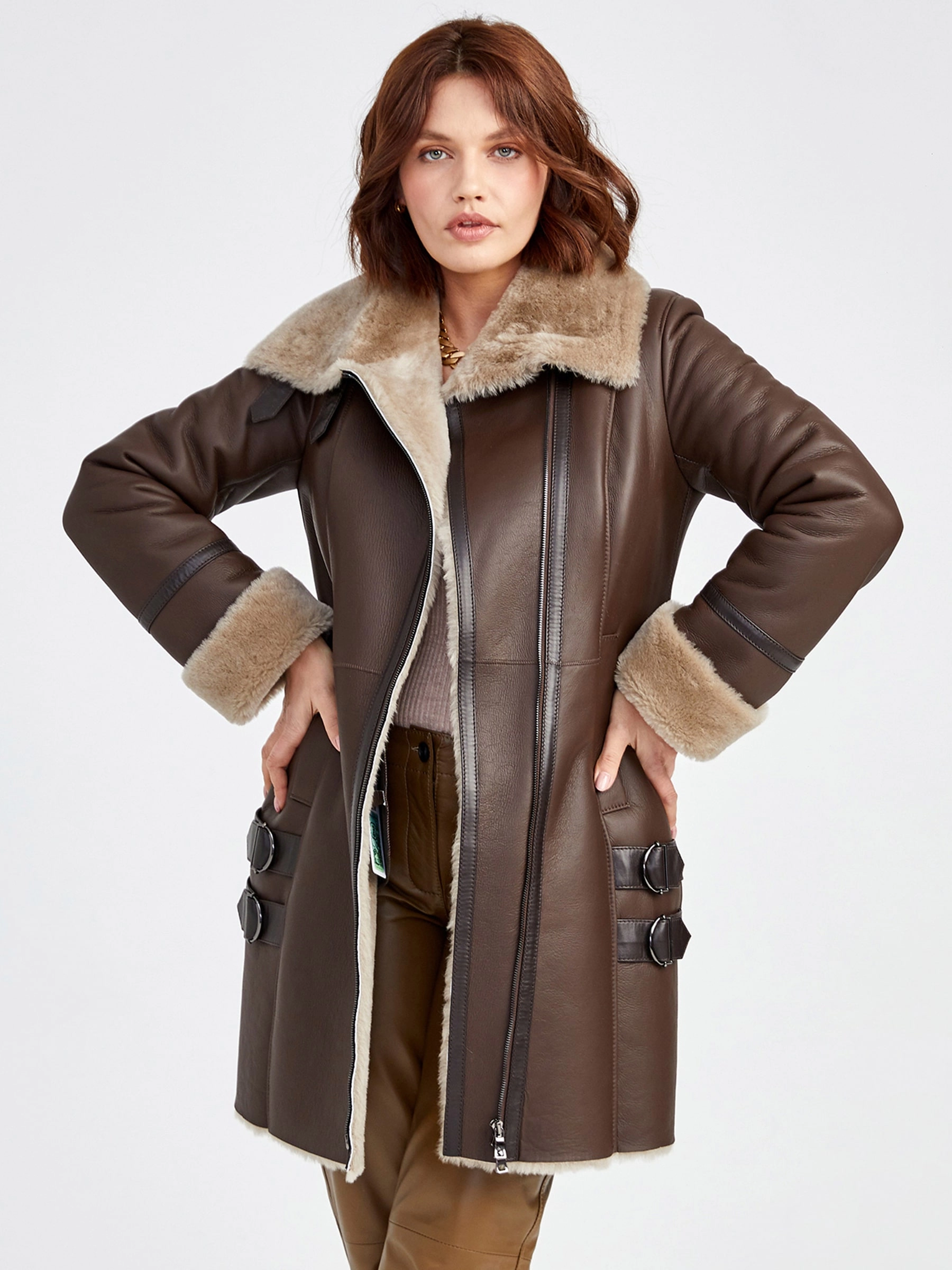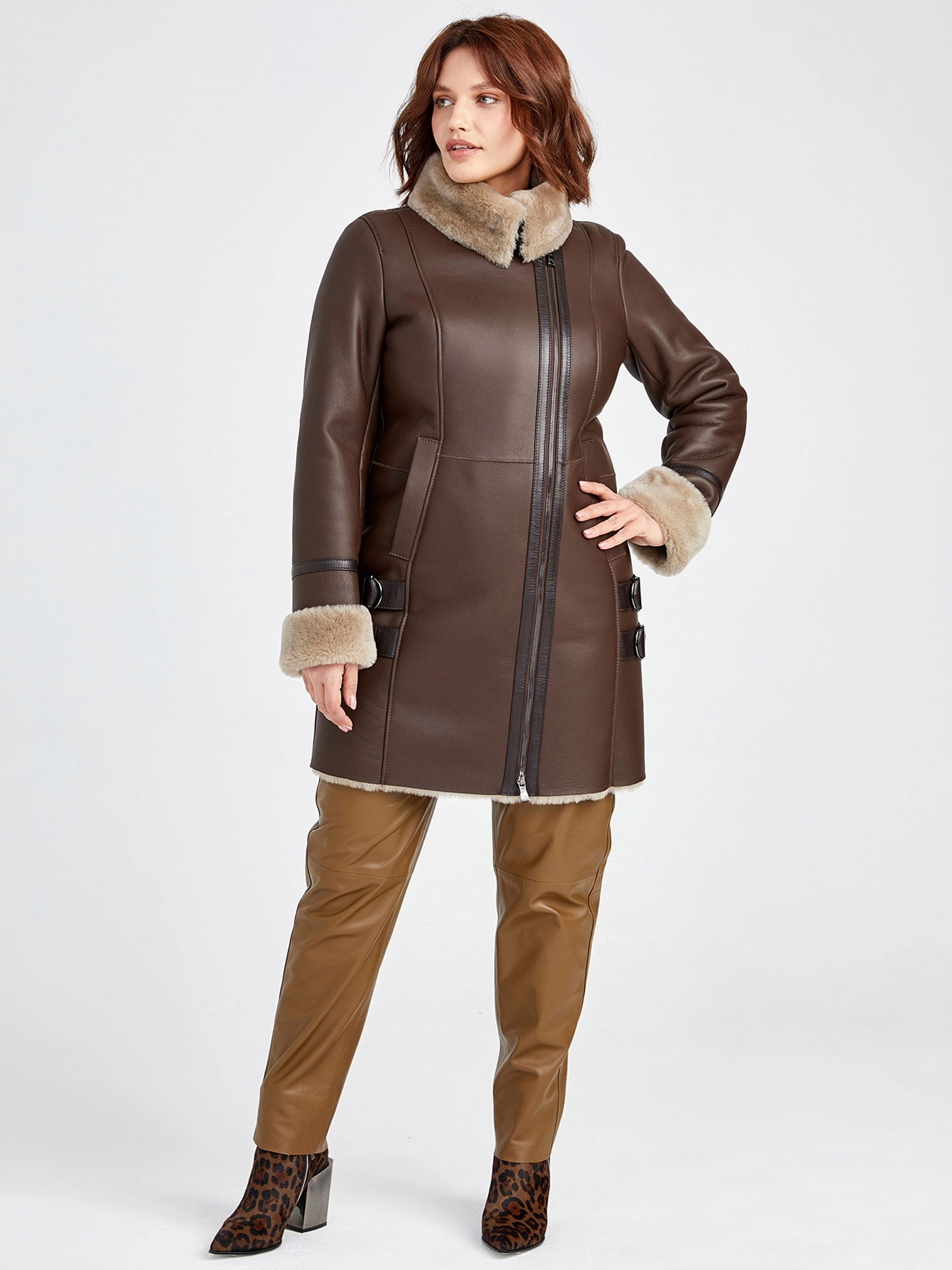 Товар дубленка косуха женская 206, коричневая, размер 48, артикул 62190 выполнен из овчина "мерино" с застежкой молния. Рассчитан на сезон: осень-зима. Длина изделия 85 см, силуэт полуприлегающий.
