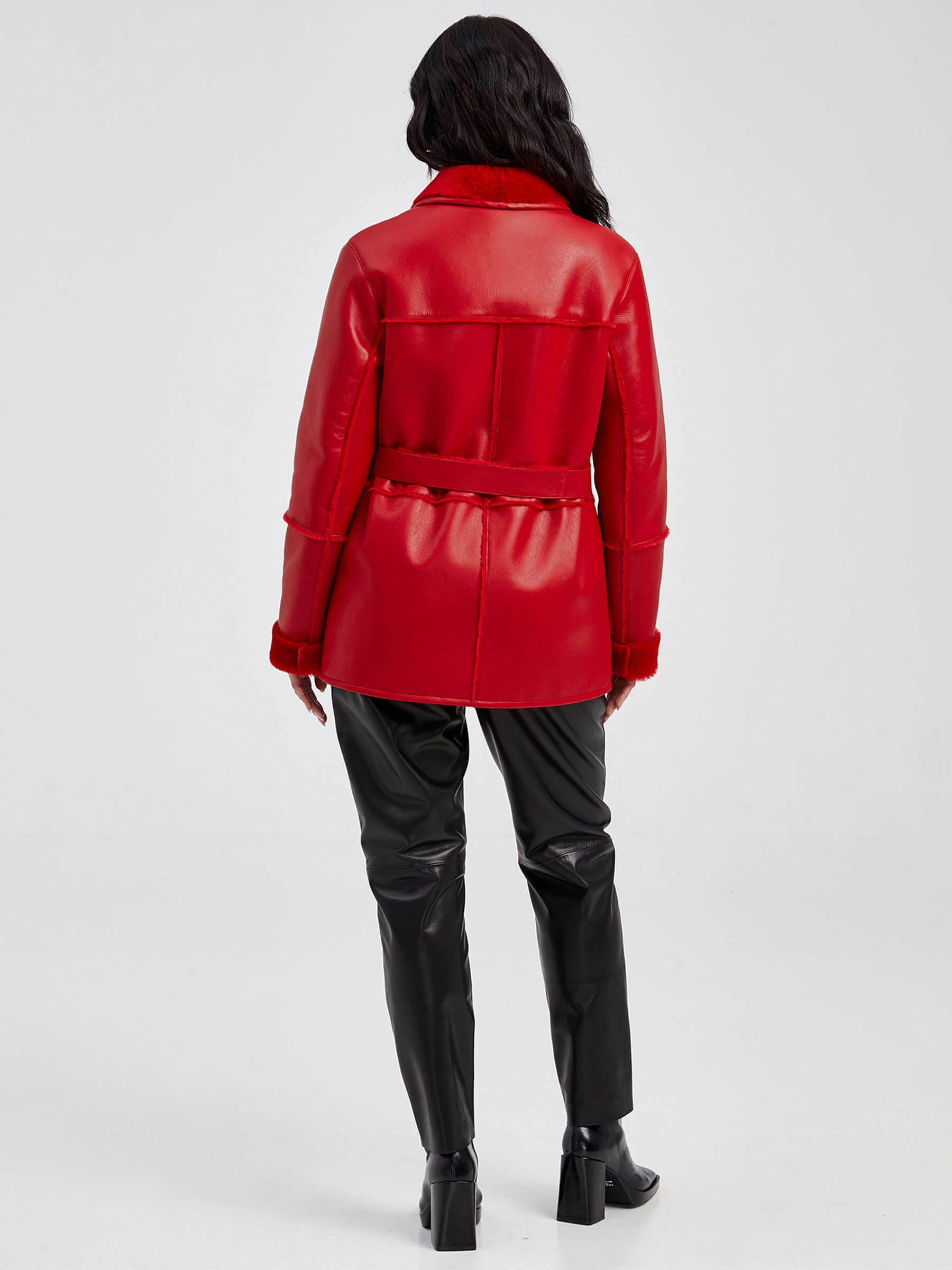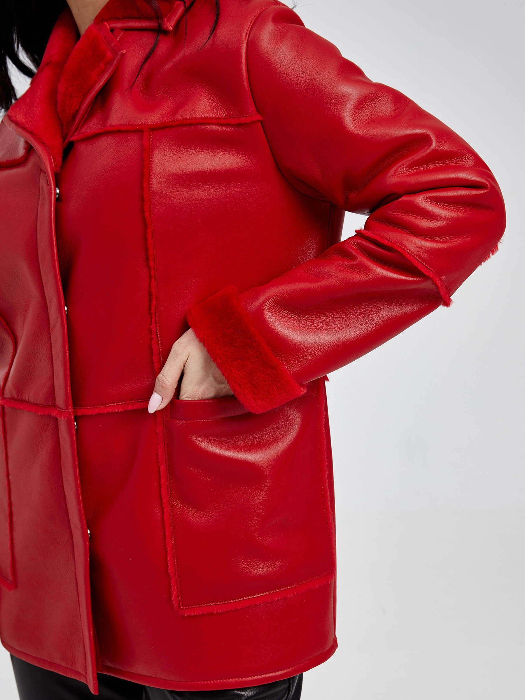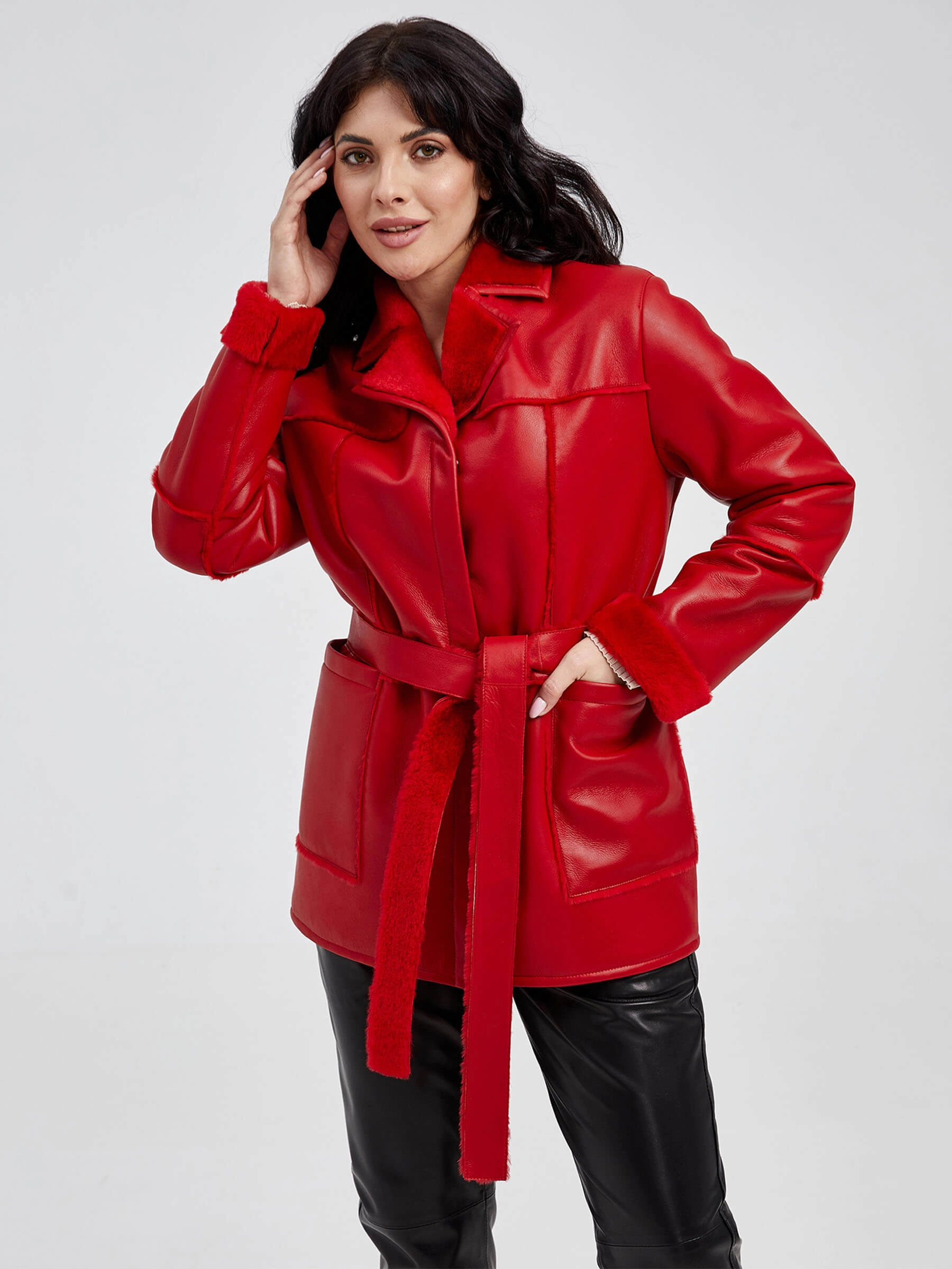 Короткая женская дубленка длиной 75 см на кнопках из натуральной овчины «мерино» насыщенного красного цвета. Прямой силуэт дополнен стильным поясом и классическим английским воротником. Модель с втачными рукавами выполнена из качественной овчины мерино, известной своей способностью поддерживать комфортную температуру и защищать от ветра. Стилисты рекомендуют носить эту дубленку с базовыми вещами: черными брюками строгого кроя и водолазкой для лаконичного образа или с джинсами-скинни и бежевым свитером для повседневного выхода, позволяя красному цвету стать главным акцентом.