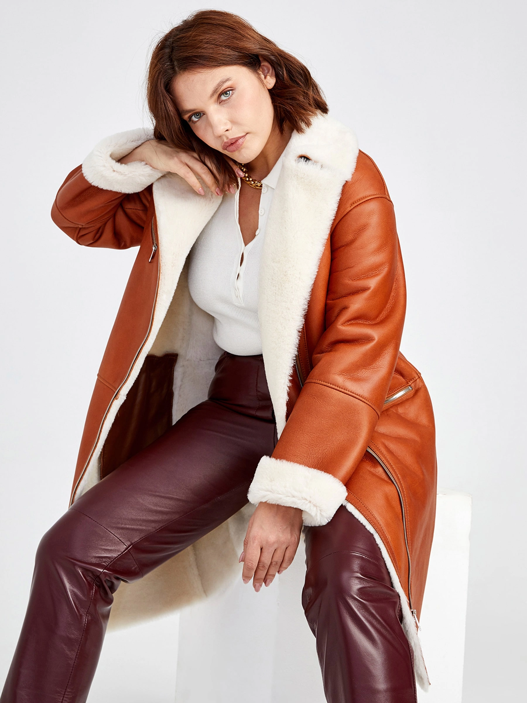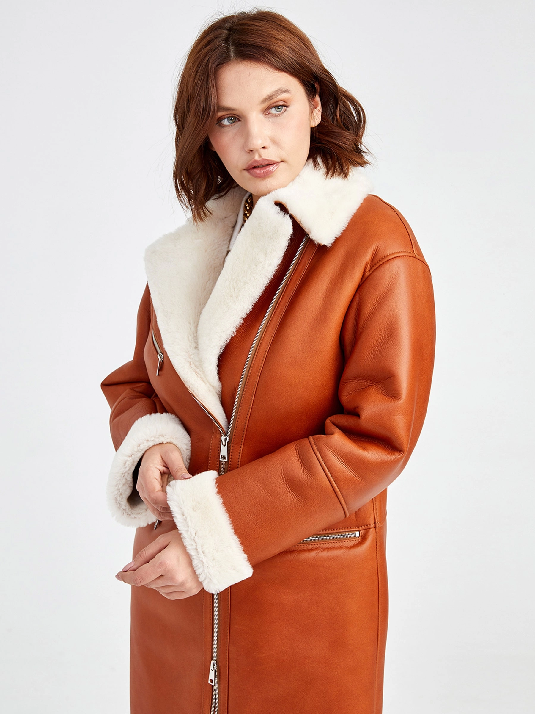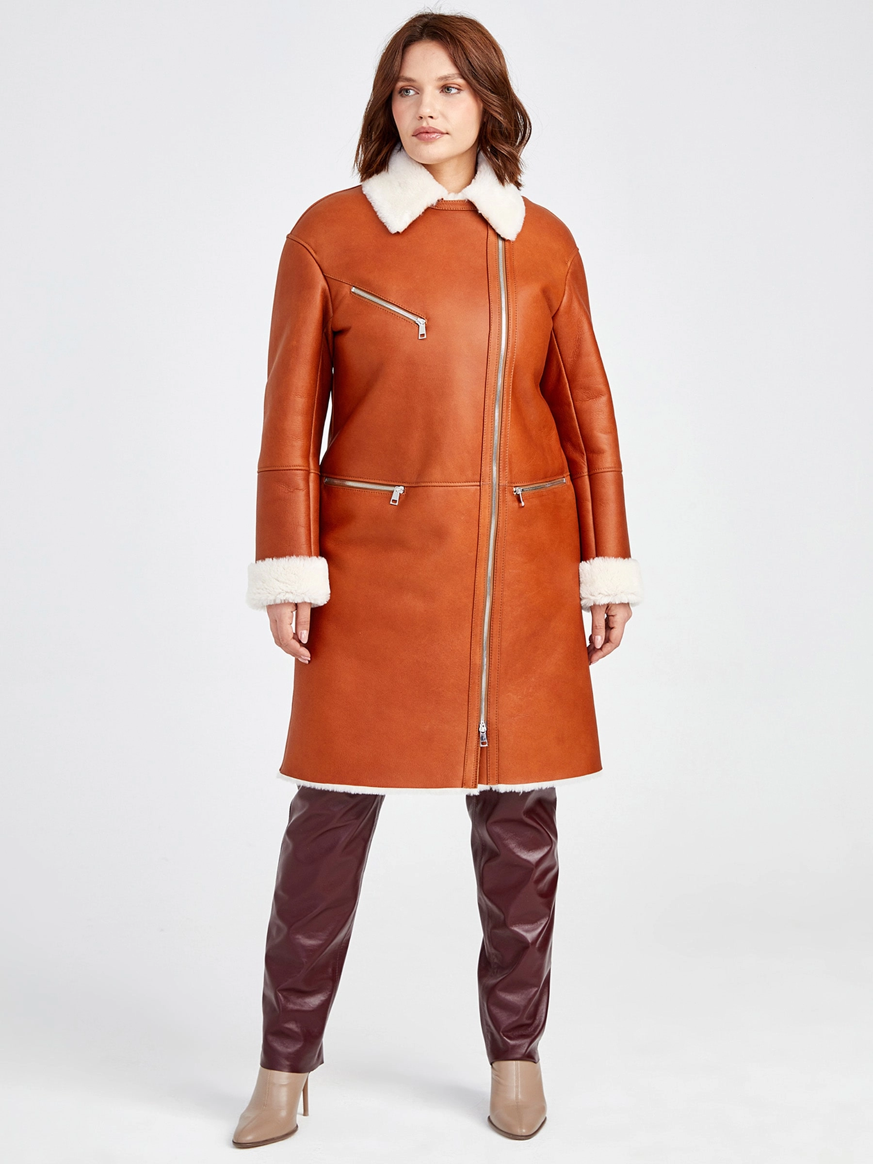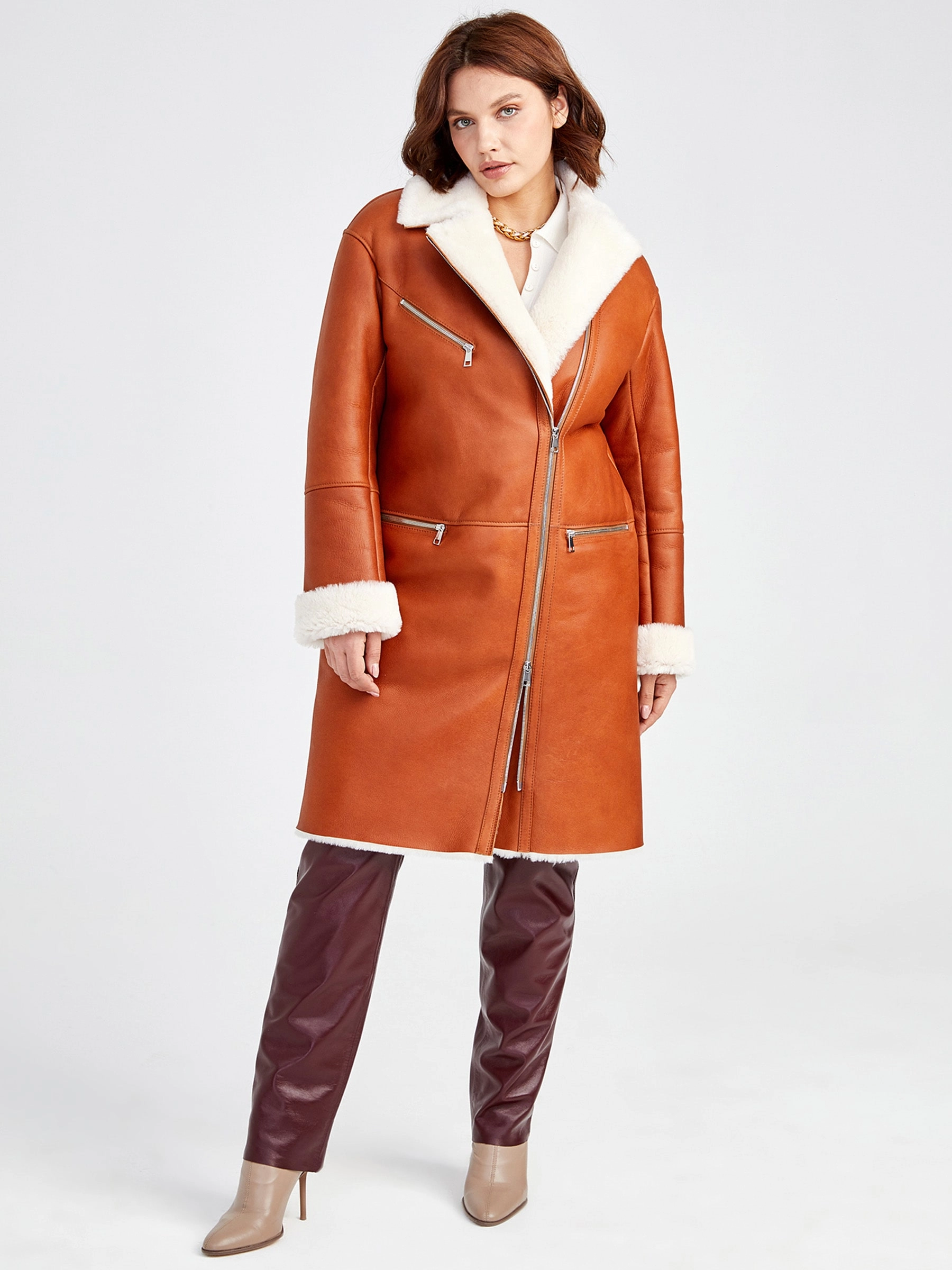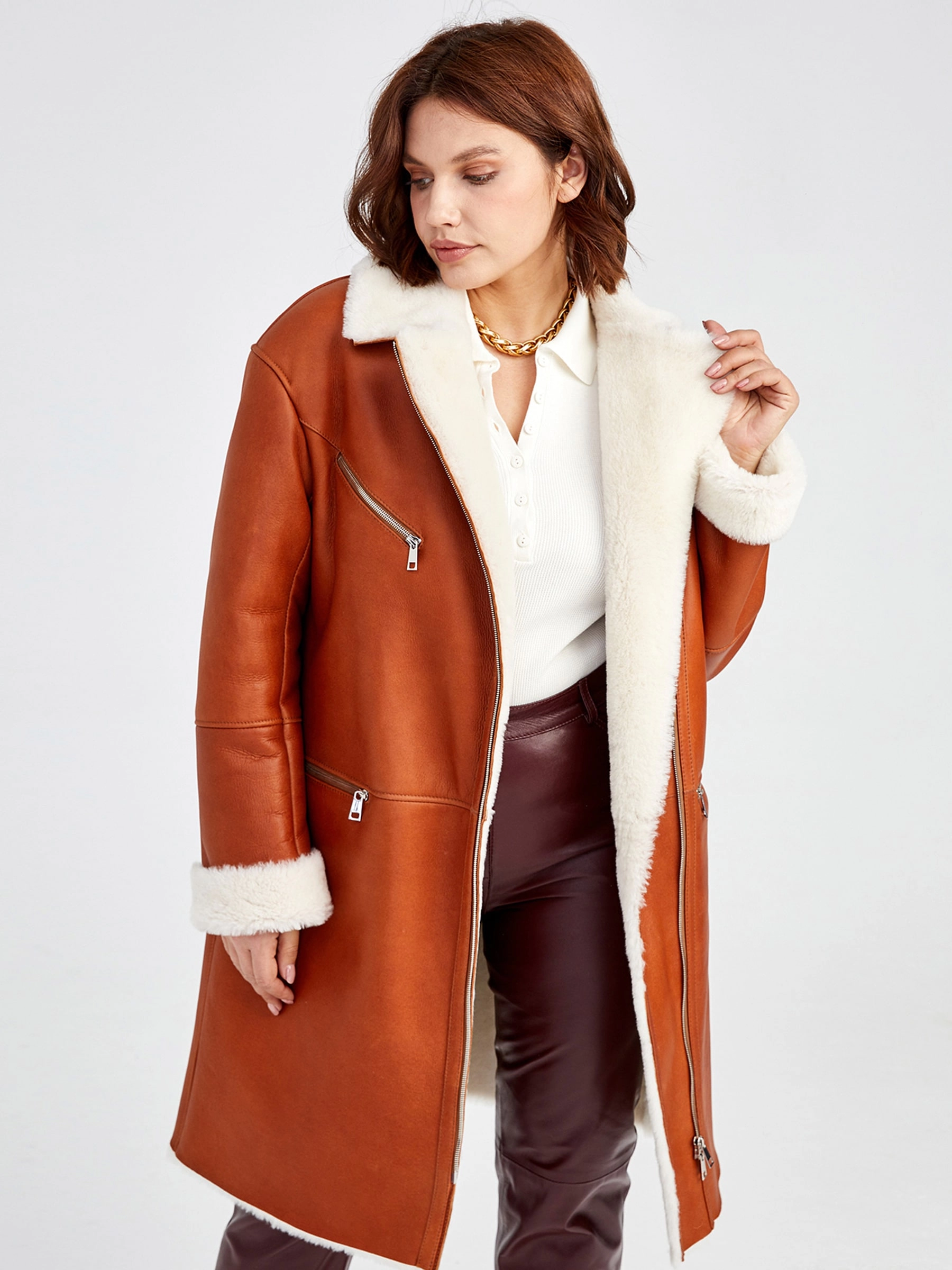 Роскошная длинная дублёнка-косуха из невероятно мягкой натуральной овчины «мерино» цвета тёплого виски станет ключевой вещью сезона. Прямой силуэт с отложным воротником, практичной застёжкой-молнией и тремя карманами, включая два боковых и один асимметричный на груди, идеален для повседневных образов, а благородный приглушённый блеск кожи подчёркивает глубину насыщенного оттенка. Совет стилиста: сочетайте с объёмным свитером, прямыми джинсами и ботинками для непринуждённо-элегантного вида — эта косуха создана, чтобы согревать и восхищать!