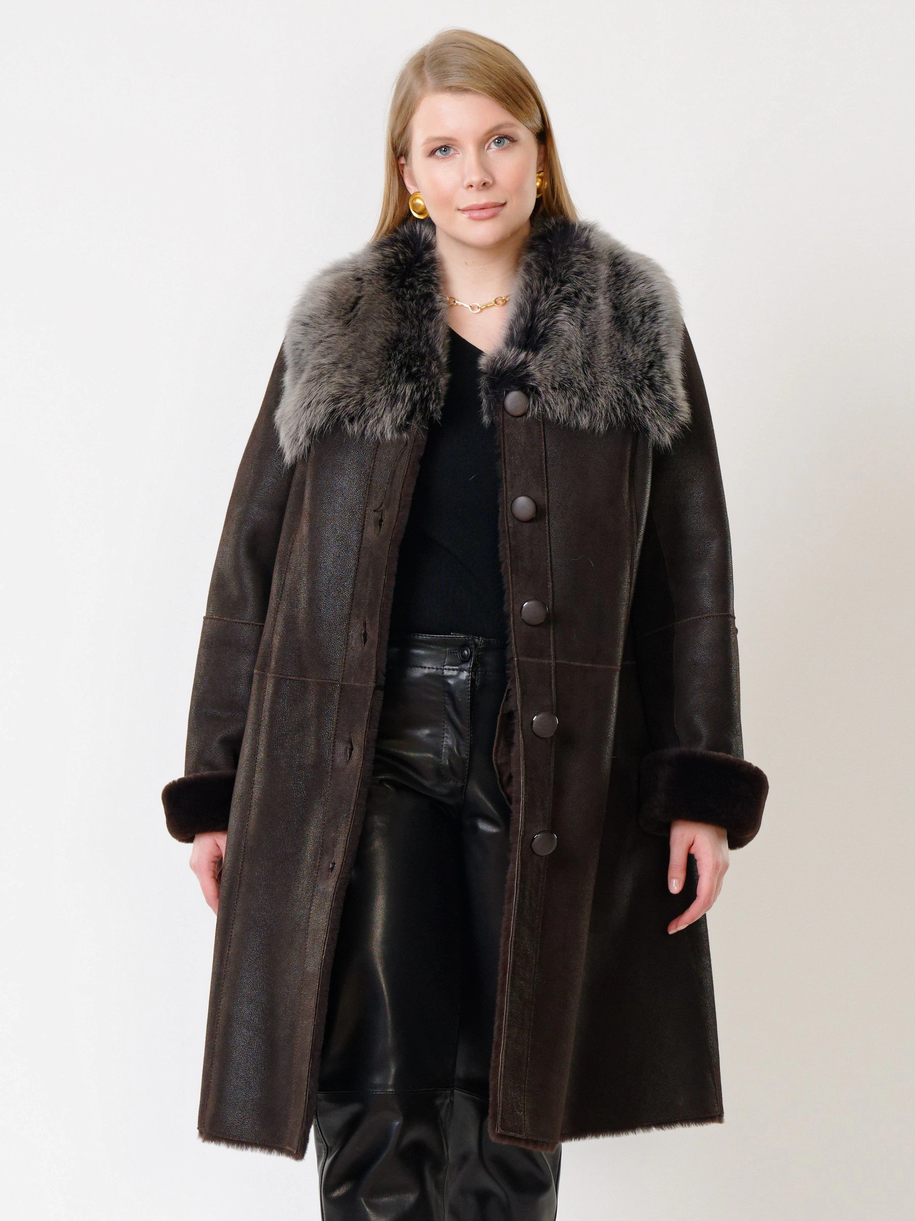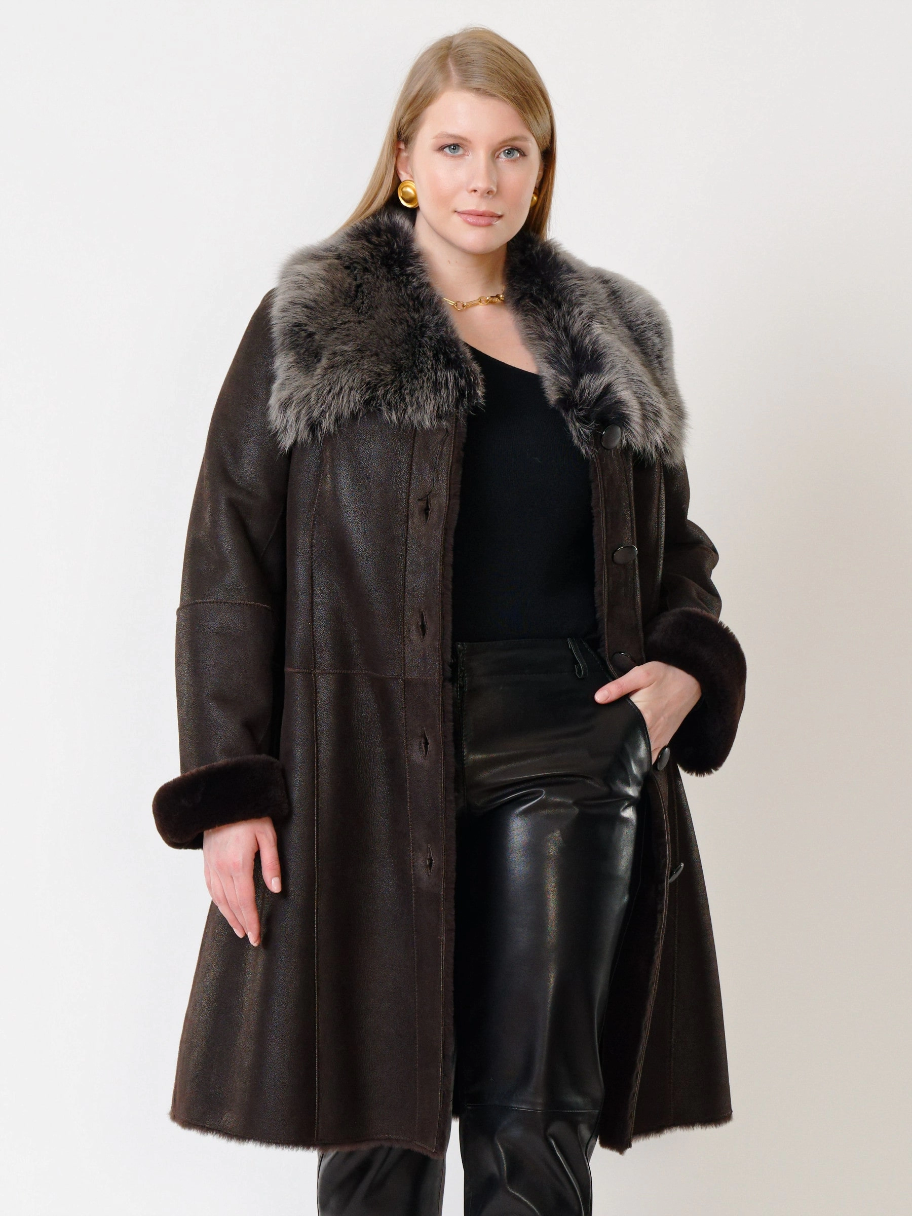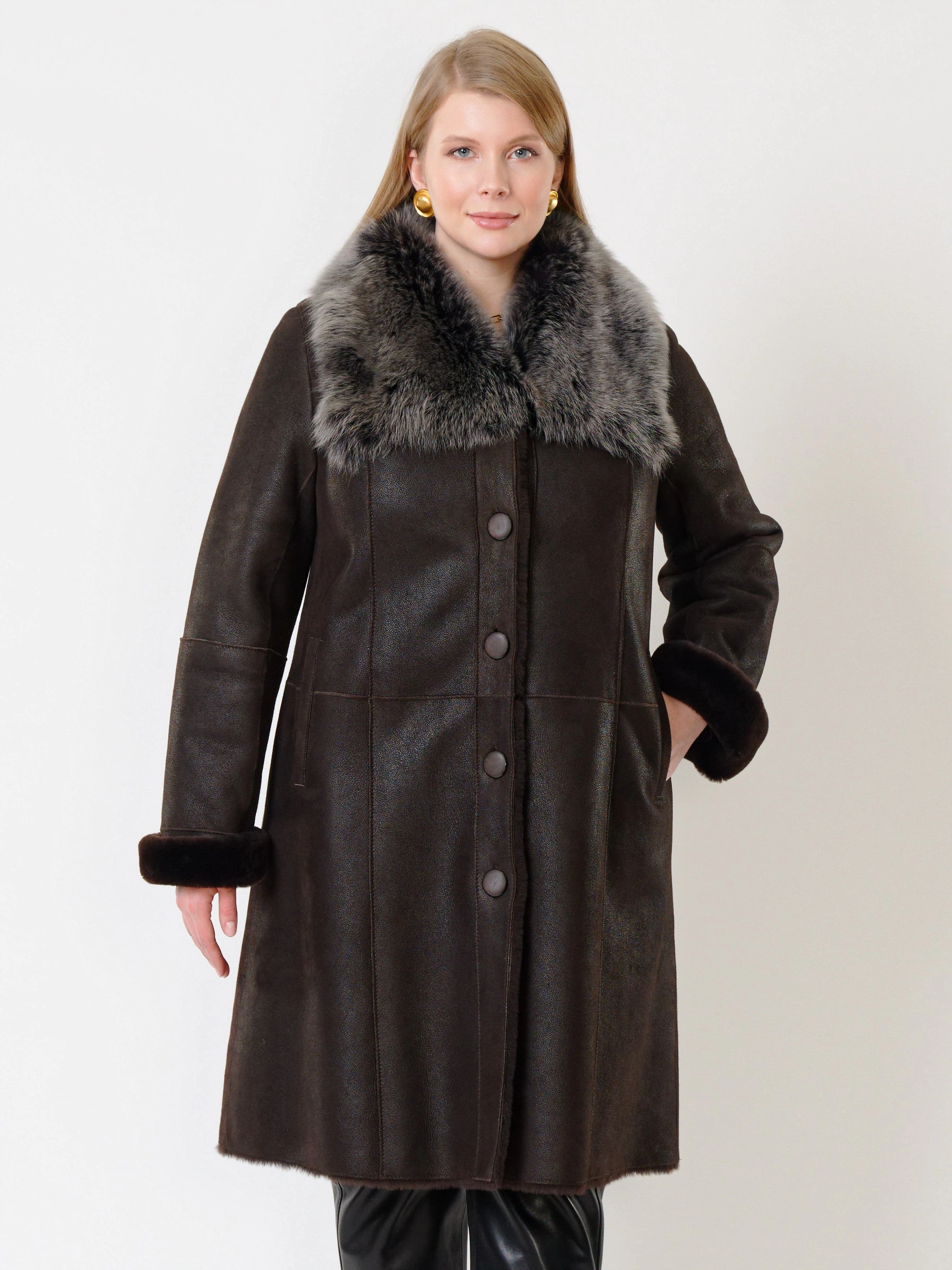 Элегантная длинная классическая дубленка длиной 100 сантиметров из натуральной овчины мерино с силуэтом «трапеция» создает комфортную, утонченную и безупречно женственную форму для прохладного времени года. Модель с втачными рукавами и отложным воротником, отделанным роскошной натуральной овчиной тоскана, приобретает особый шарм и выразительность — длинный, шелковистый и блестящий ворс тосканы эффектно контрастирует с гладкой поверхностью основной овчины, добавляя изделию текстурную глубину и премиальное звучание. Два боковых кармана согревают руки и сохраняют чистоту линий, а элегантная застежка на пуговицы подчеркивает классический характер модели. Продуманный крой и качественные материалы обеспечивают не только безупречный внешний вид, но и комфорт при носке. Стилисты рекомендуют носить эту дубленку с элегантными брюками, платьем-миди и кожаной сумкой для создания безупречного классического образа, где благородный контраст фактур мерино и тосканы становится главным акцентом.