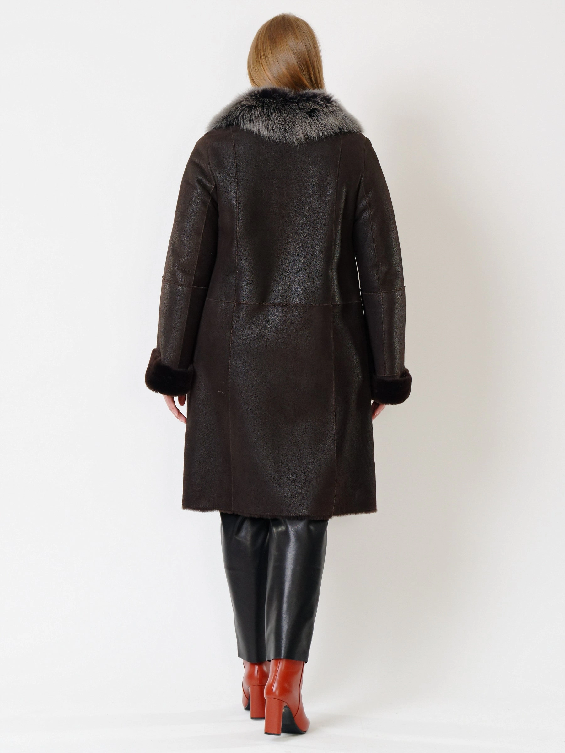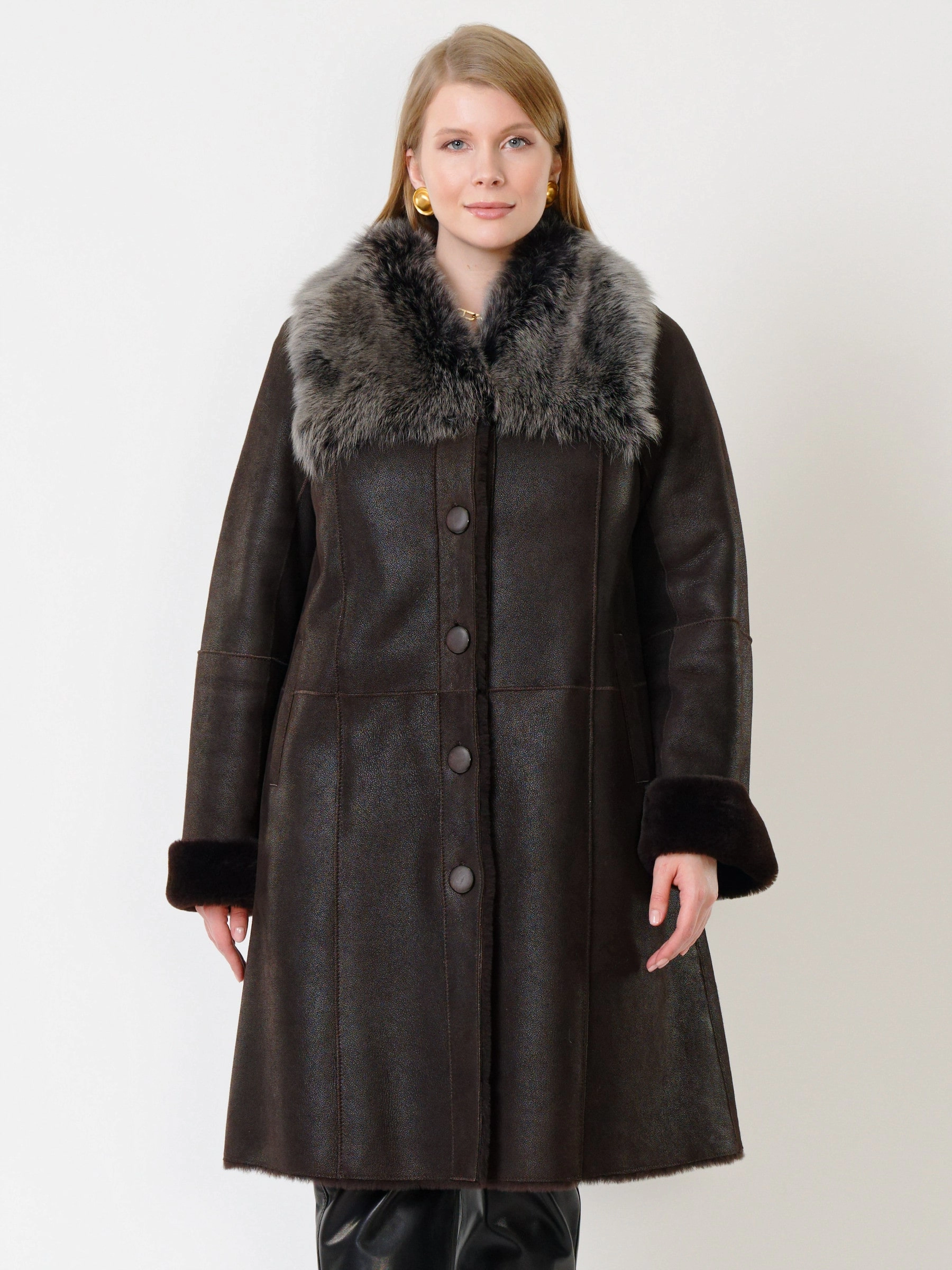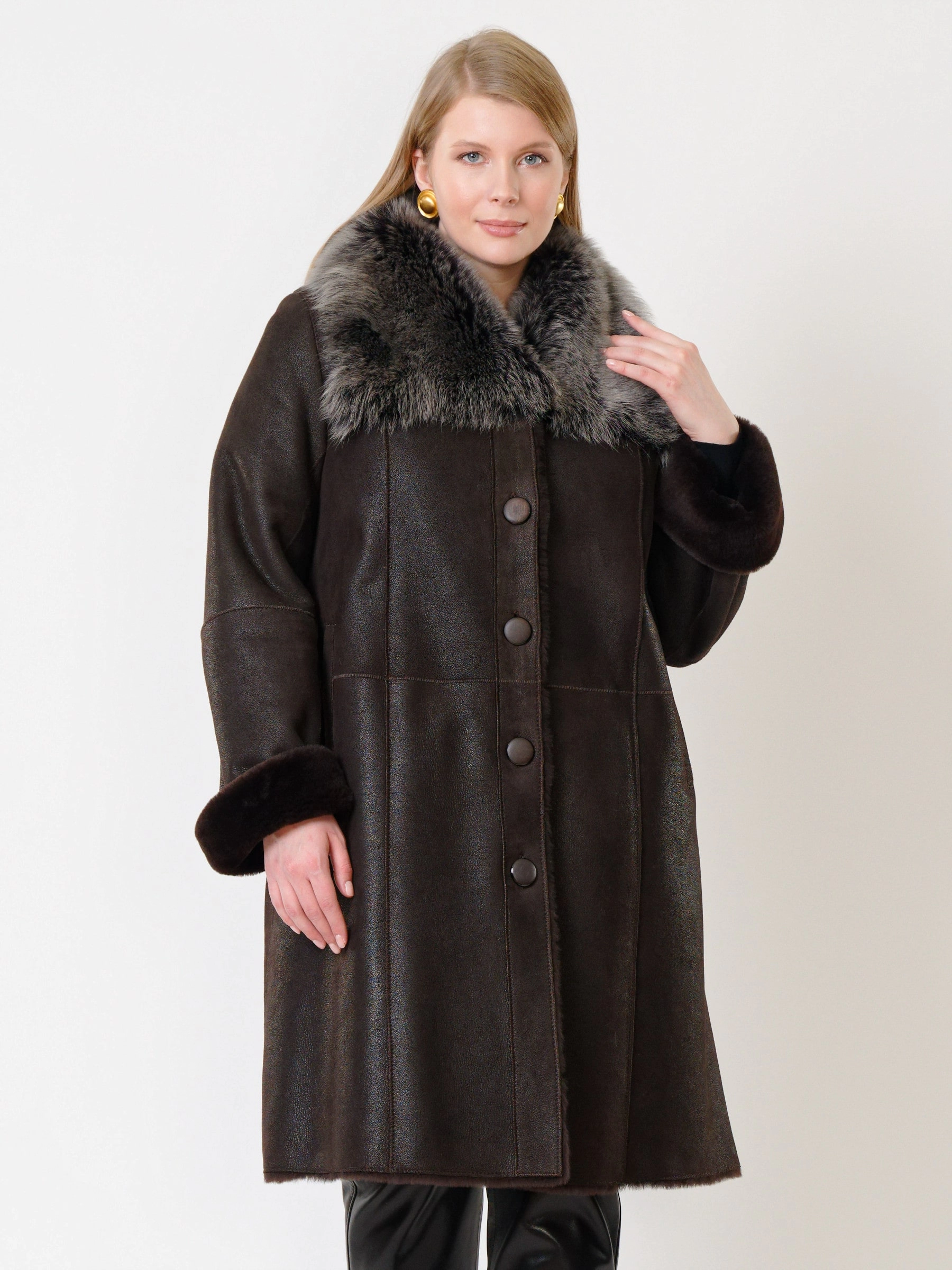 Элегантная длинная классическая дубленка длиной 100 сантиметров из натуральной овчины мерино с силуэтом «трапеция» создает комфортную, утонченную и безупречно женственную форму для прохладного времени года. Модель с втачными рукавами и отложным воротником, отделанным роскошной натуральной овчиной тоскана, приобретает особый шарм и выразительность — длинный, шелковистый и блестящий ворс тосканы эффектно контрастирует с гладкой поверхностью основной овчины, добавляя изделию текстурную глубину и премиальное звучание. Два боковых кармана согревают руки и сохраняют чистоту линий, а элегантная застежка на пуговицы подчеркивает классический характер модели. Продуманный крой и качественные материалы обеспечивают не только безупречный внешний вид, но и комфорт при носке. Стилисты рекомендуют носить эту дубленку с элегантными брюками, платьем-миди и кожаной сумкой для создания безупречного классического образа, где благородный контраст фактур мерино и тосканы становится главным акцентом.