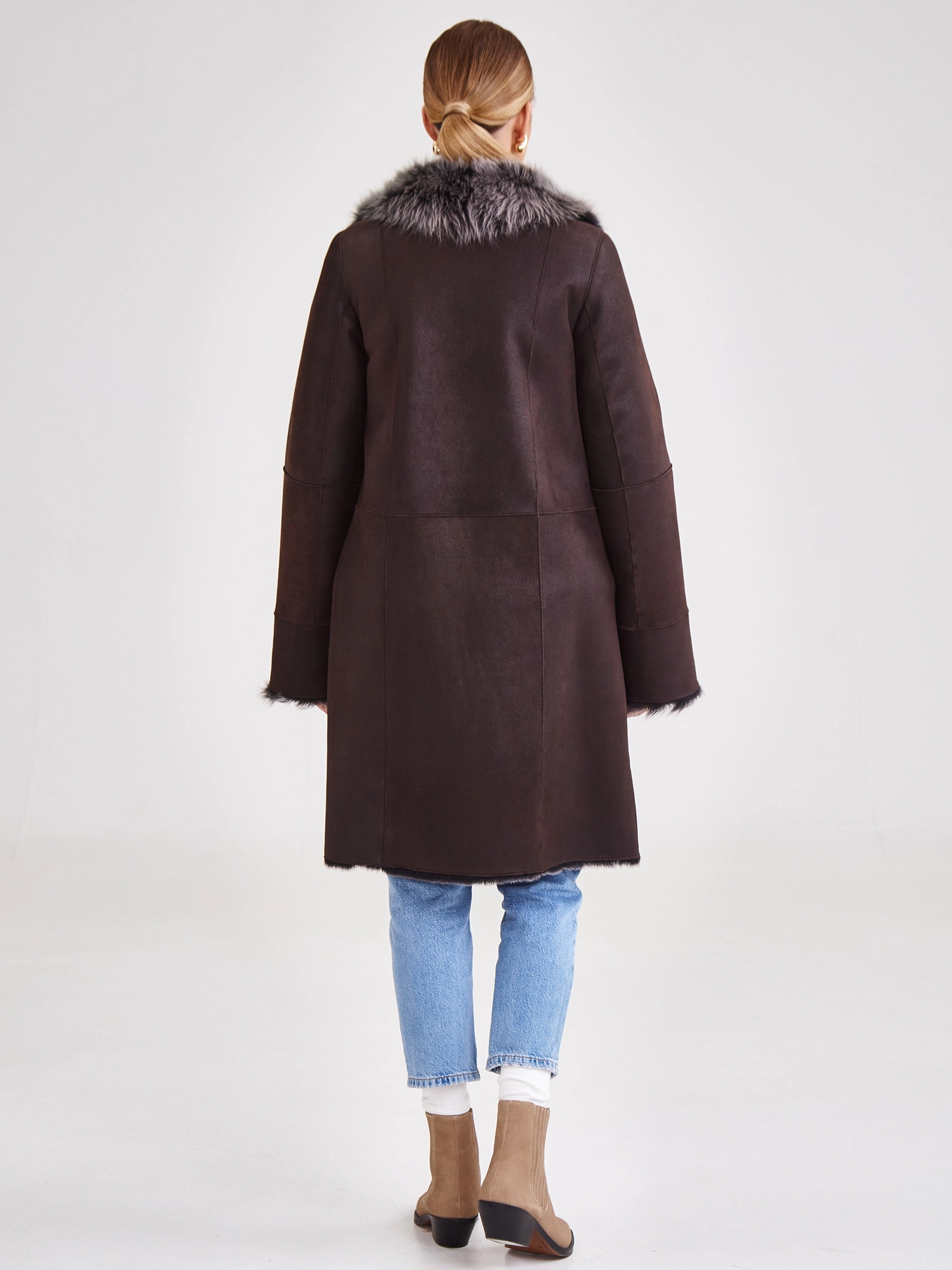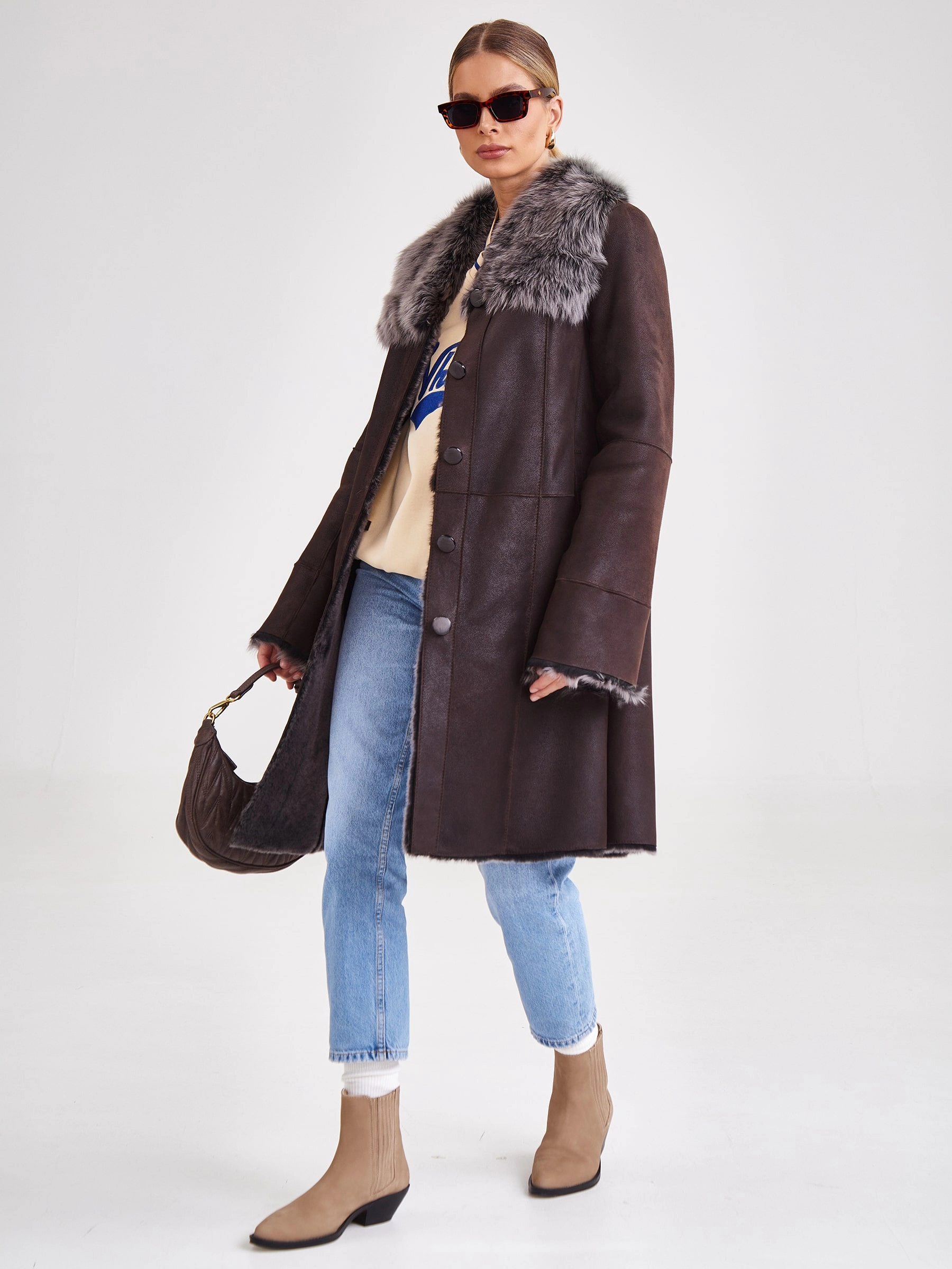 Элегантная длинная классическая дублёнка длиной 100 см из натуральной овчины «мерино» с силуэтом «трапеция» создаёт комфортную и утончённую форму. Модель с втачными рукавами, отложным воротником, отделанным роскошной натуральной овчиной «тоскана», двумя боковыми карманами и застёжкой на пуговицы — носите её с элегантными брюками, платьем-миди и кожаной сумкой для безупречного классического образа.
