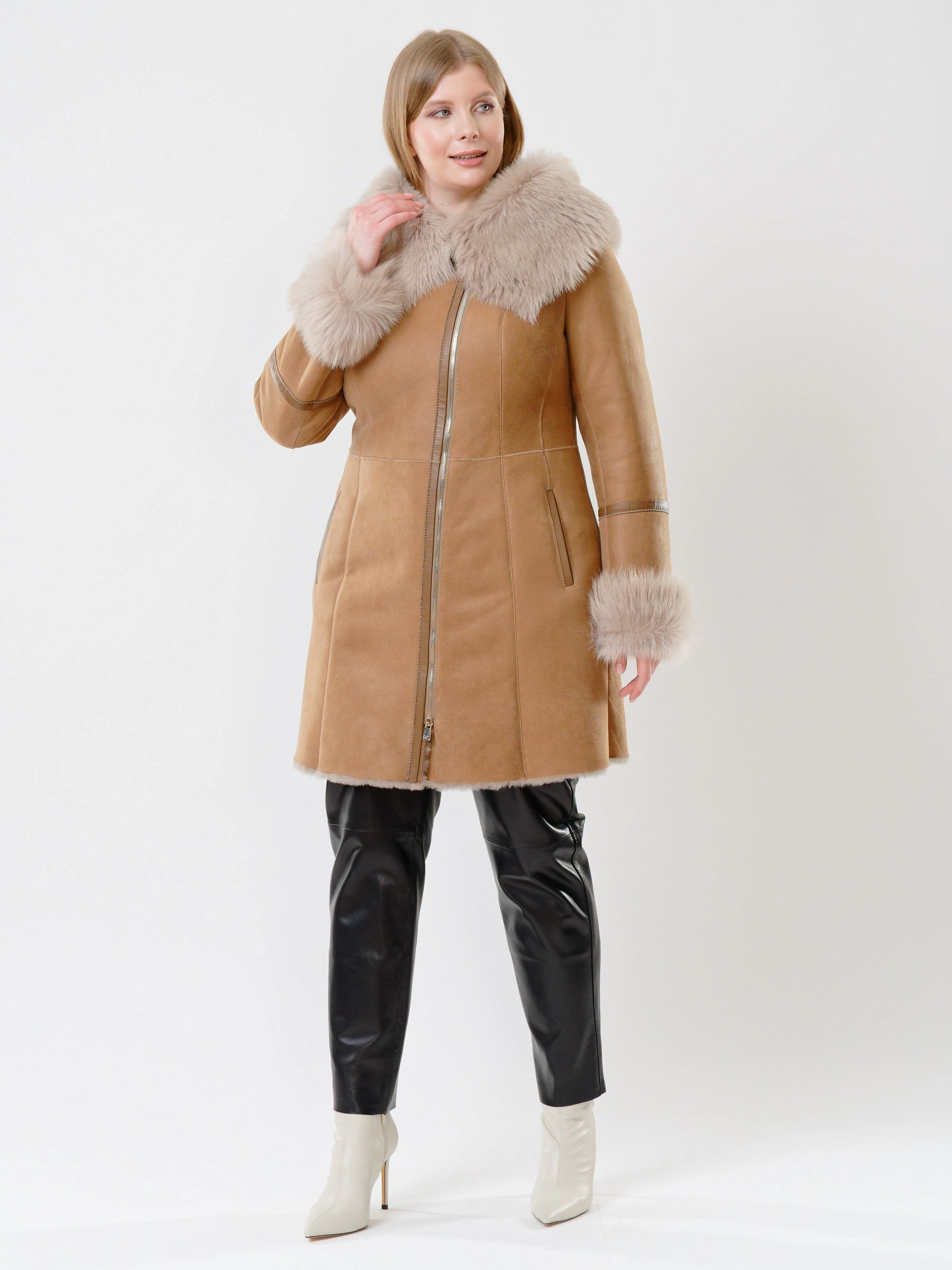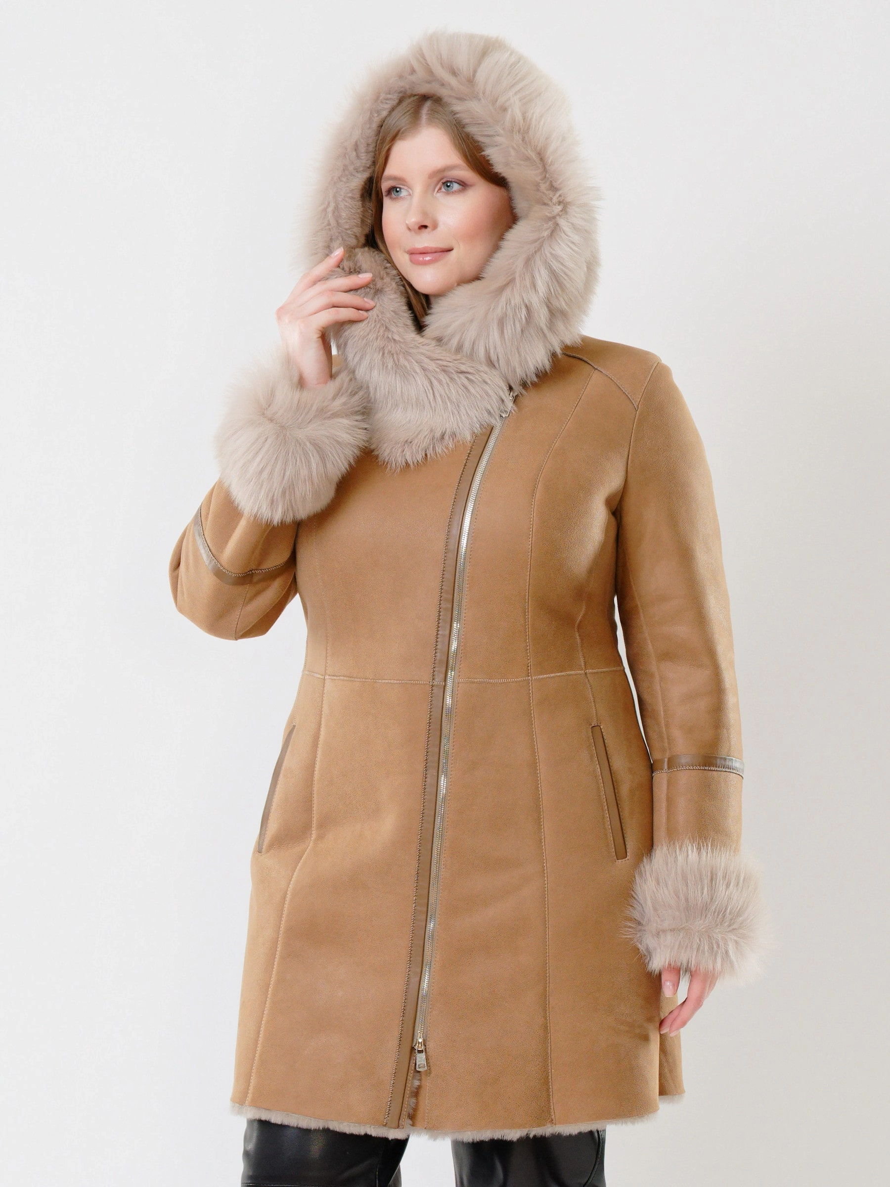 Женская дубленка косуха с капюшоном из тосканы 283, бежевая, размер 48, артикул 61430