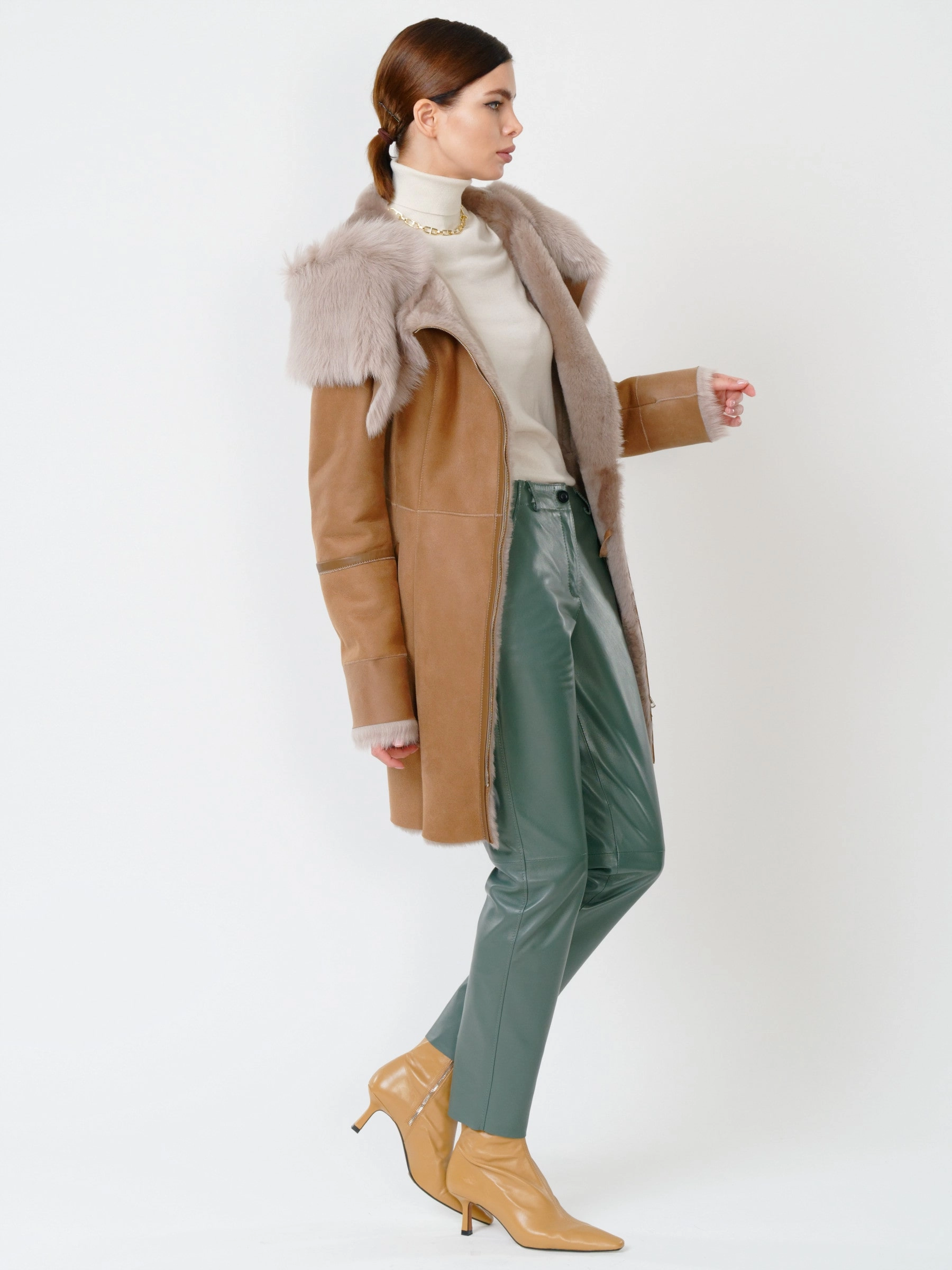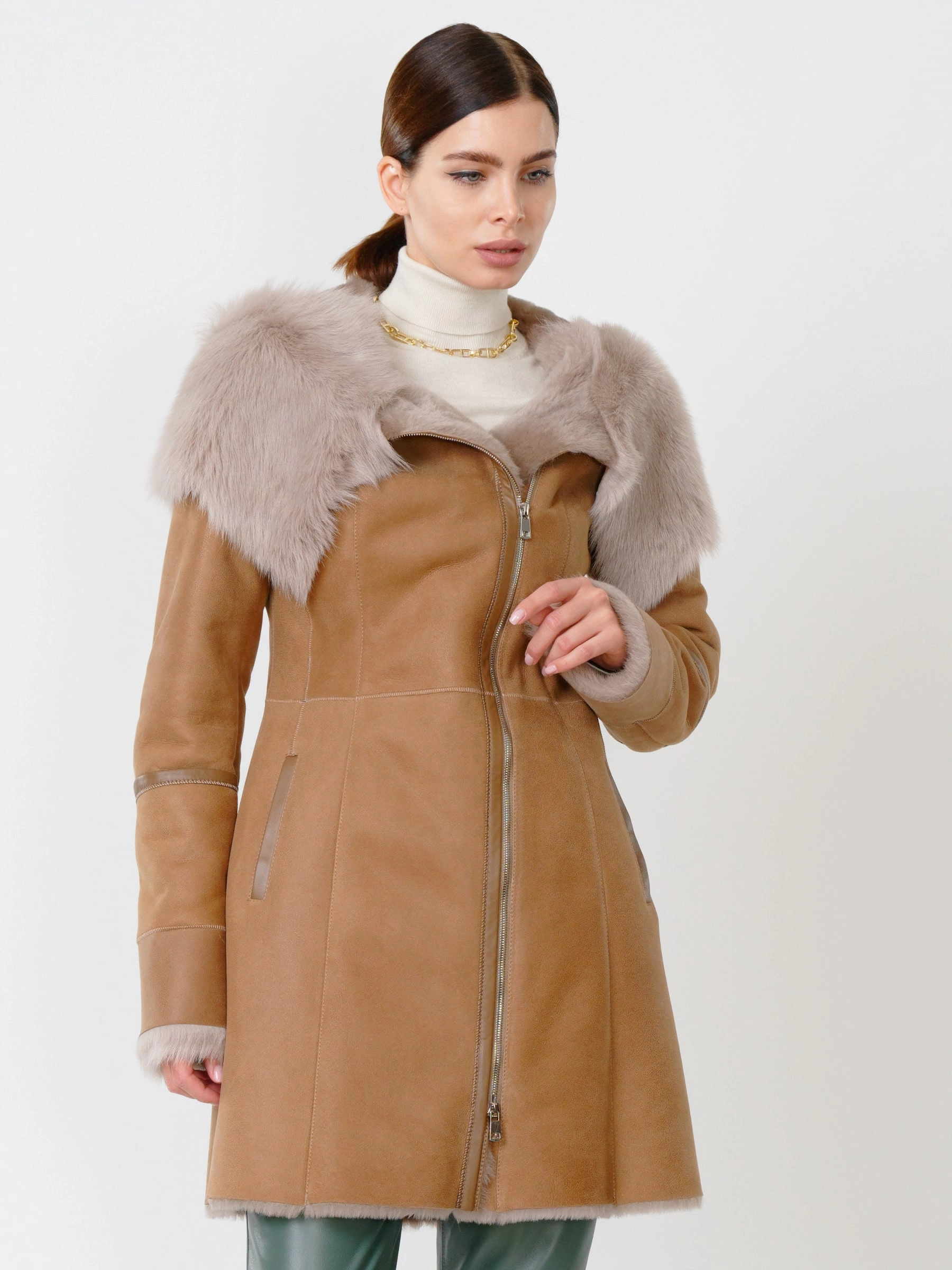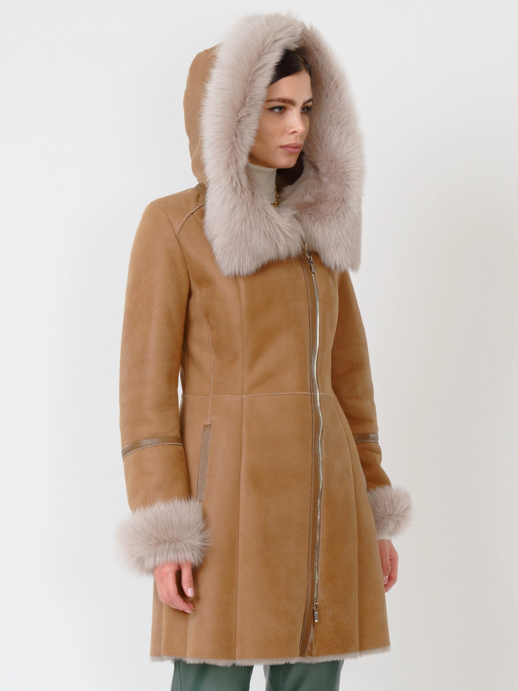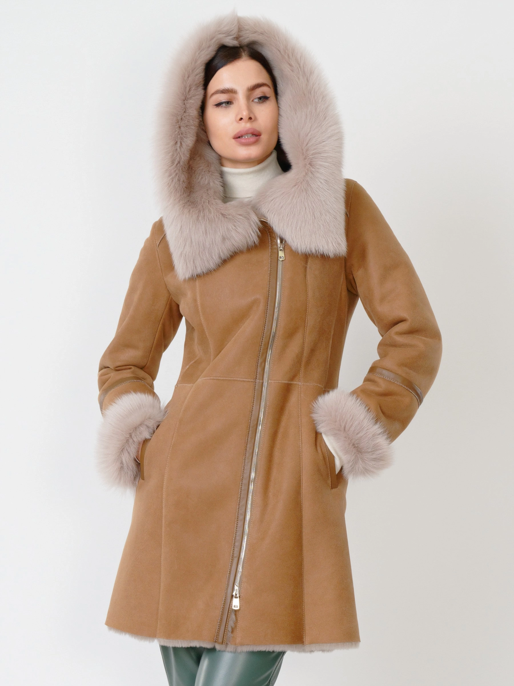 Женская дубленка косуха с капюшоном из тосканы 283, бежевая, размер 48, артикул 61831