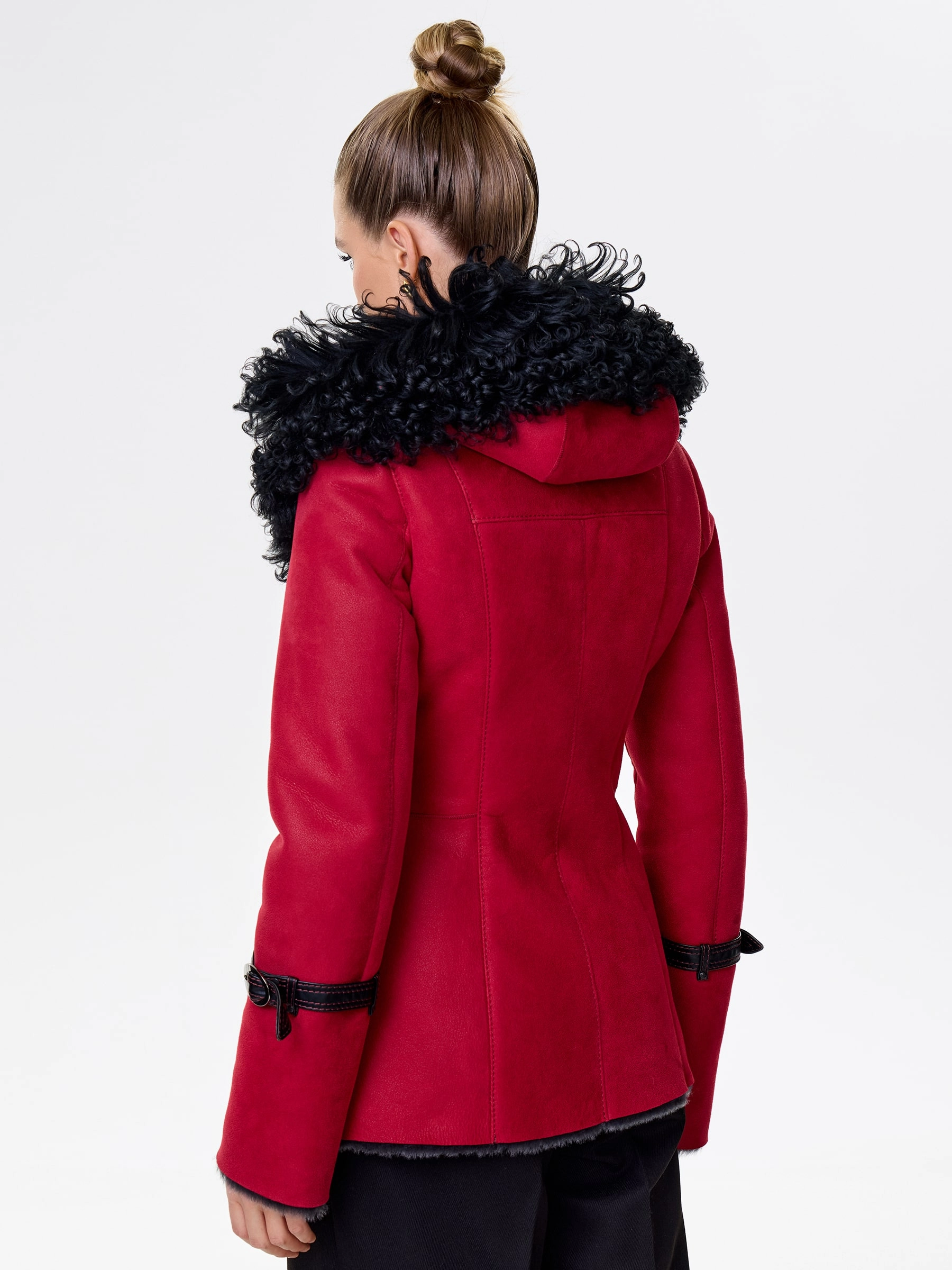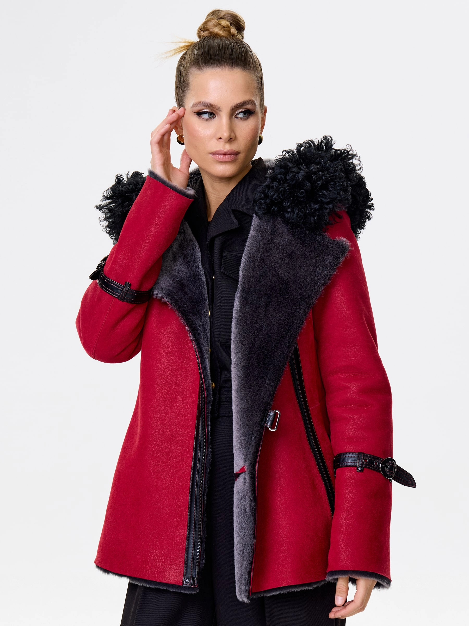 Женская дубленка косуха с капюшоном и отделкой овчиной тиградо 288, красная, размер 42, артикул 14730