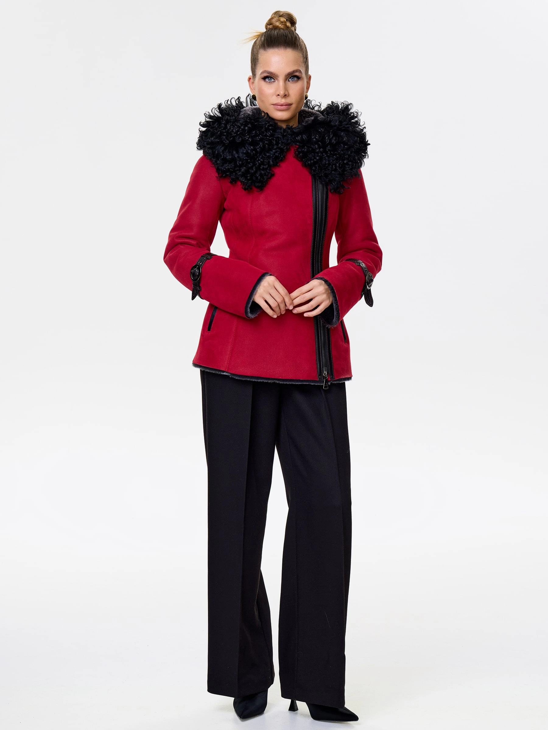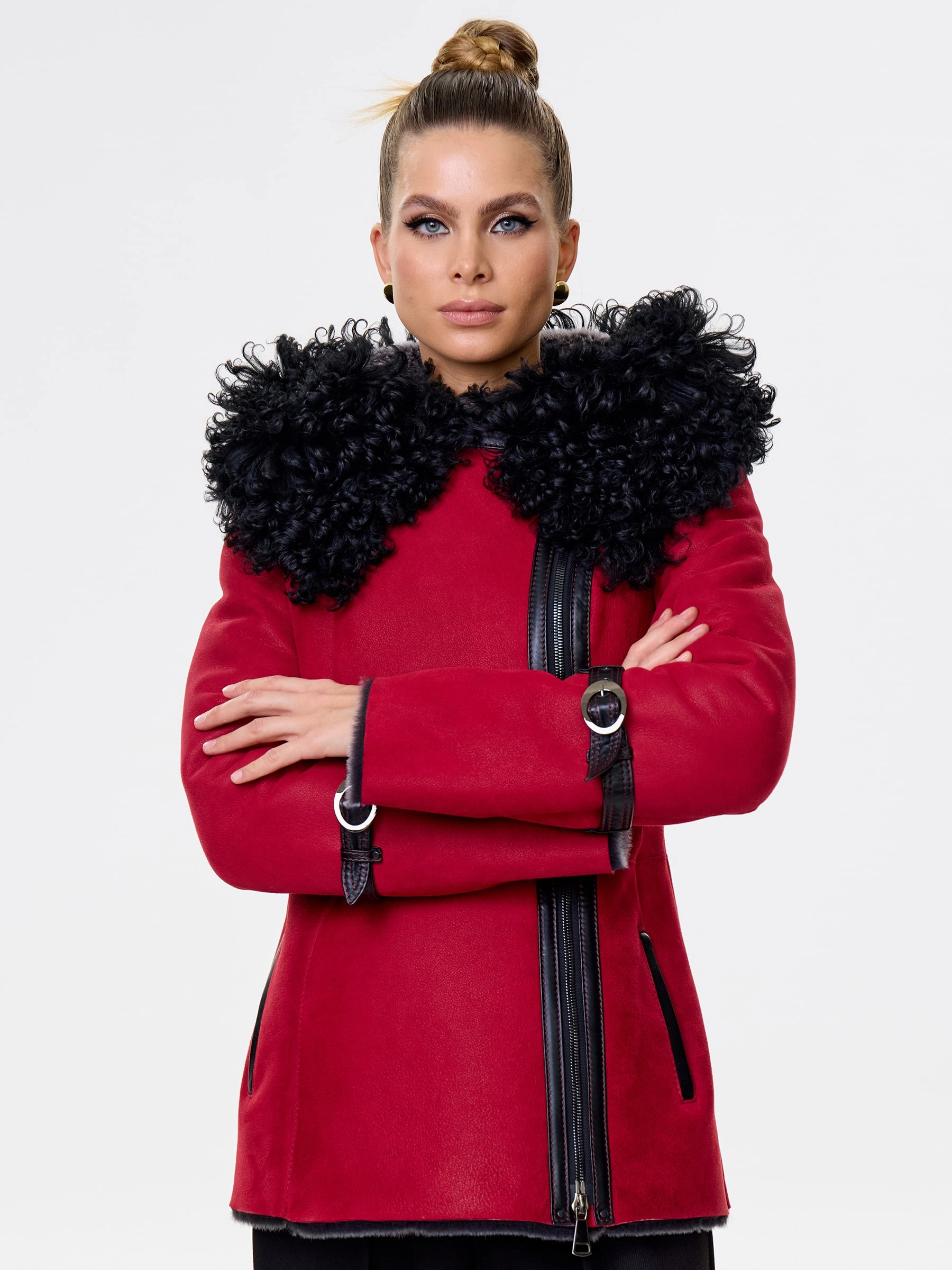 Товар женская дубленка косуха с капюшоном и отделкой овчиной тиградо 288, красная, размер 42, артикул 14730 выполнен из овчина "мерино" с застежкой молния. Рассчитан на сезон: осень-зима. Длина изделия 66 см, силуэт полуприлегающий.