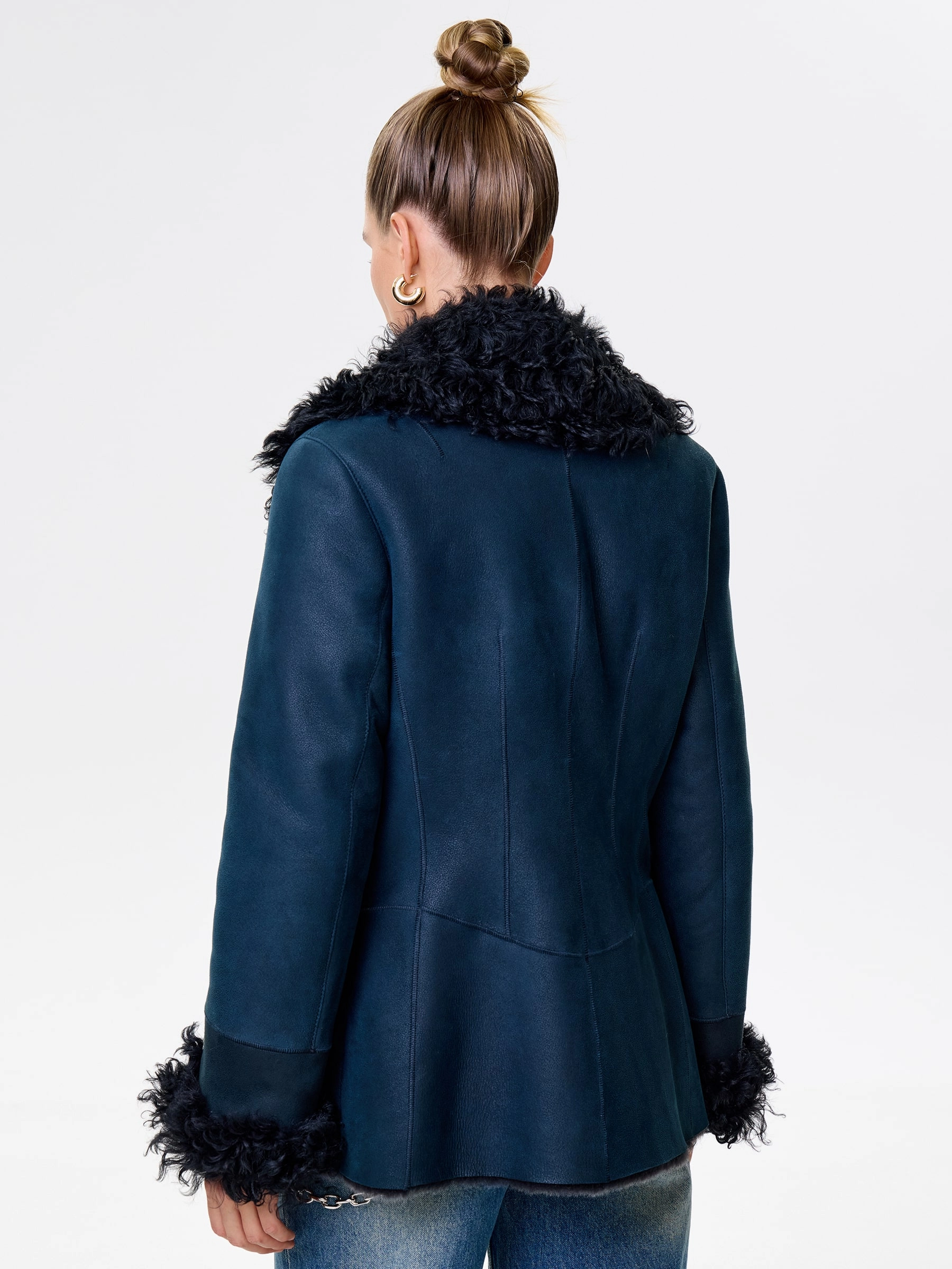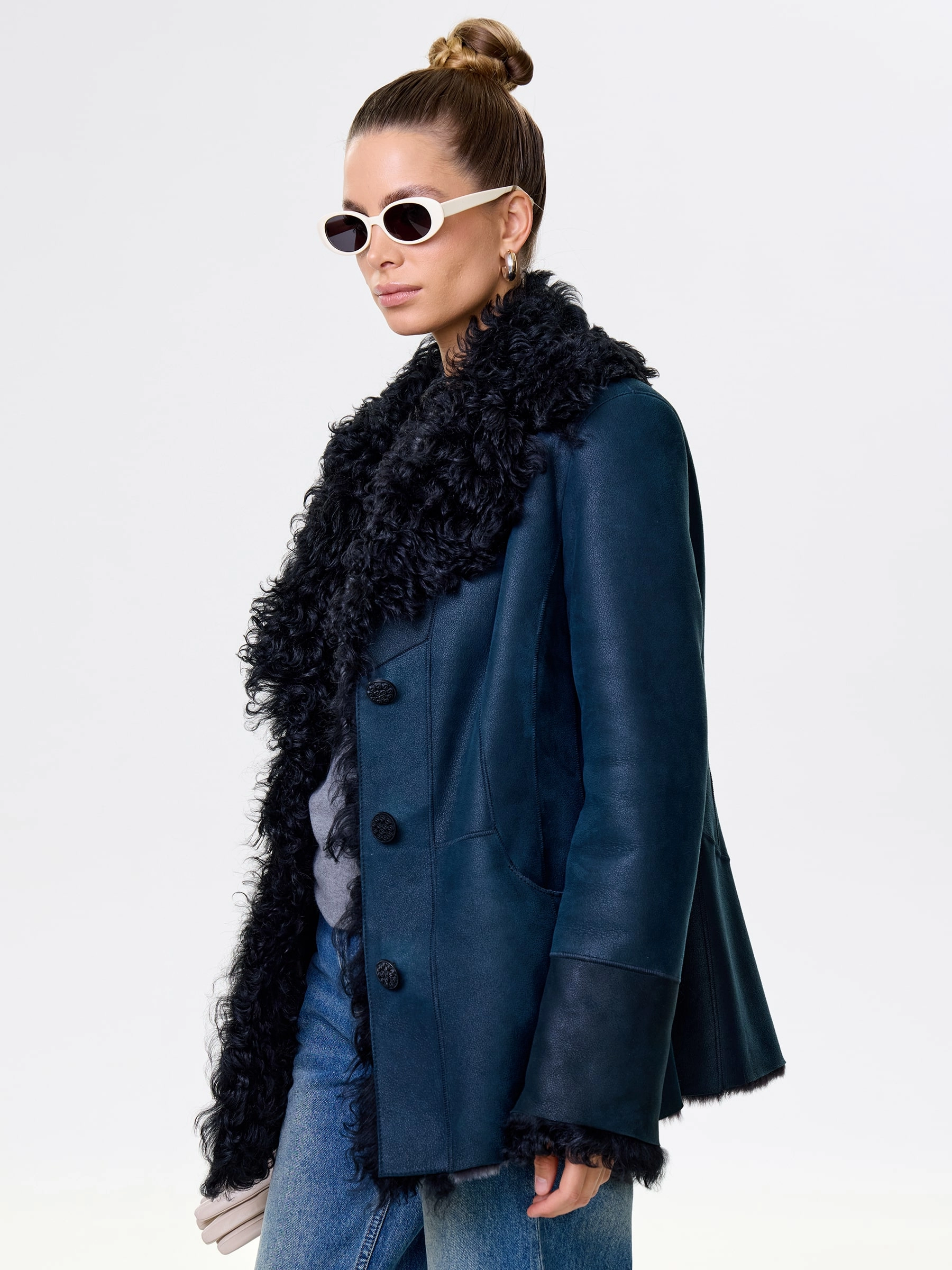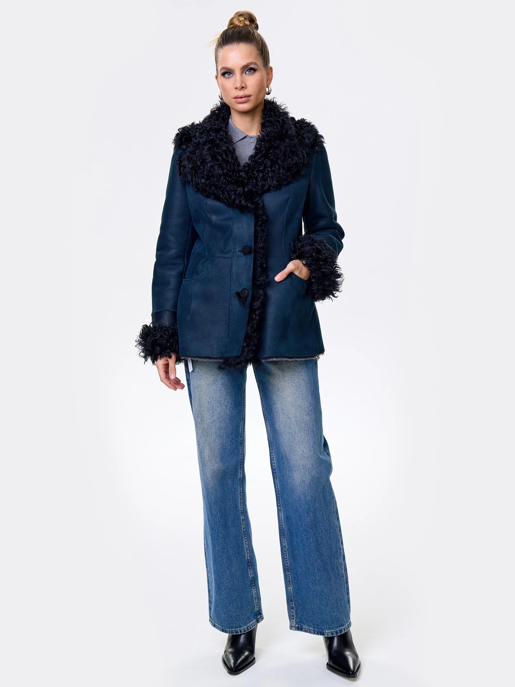 Короткая женская дубленка с овчиной тиградо 289, синяя, размер 42, артикул 61951