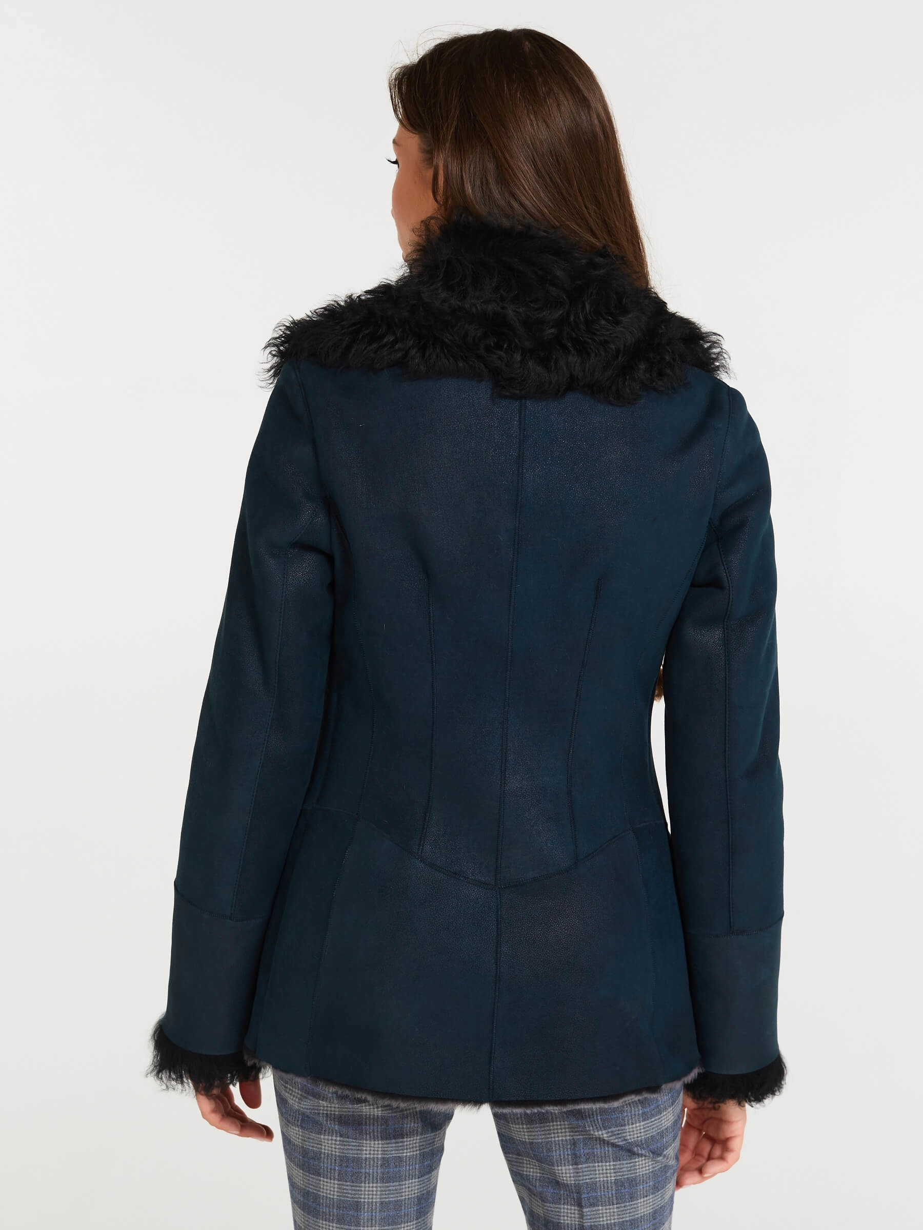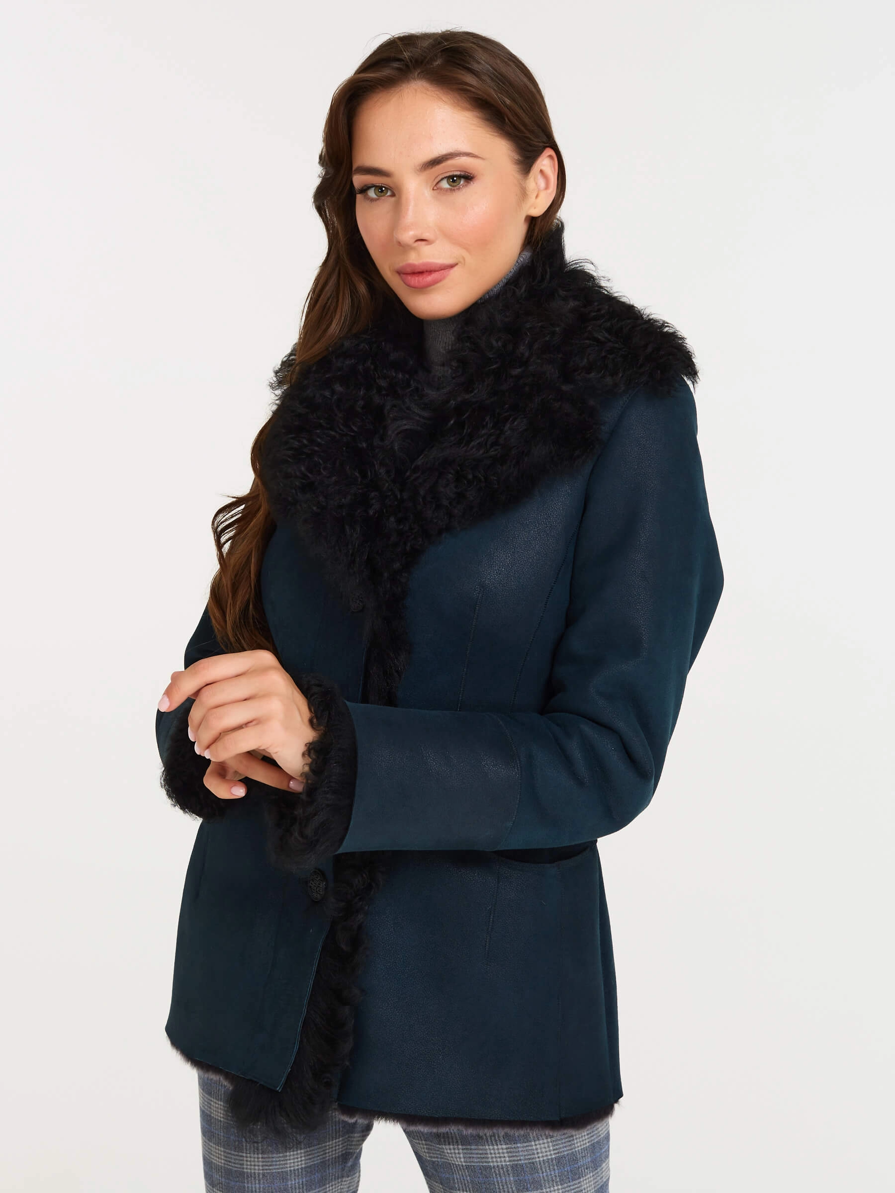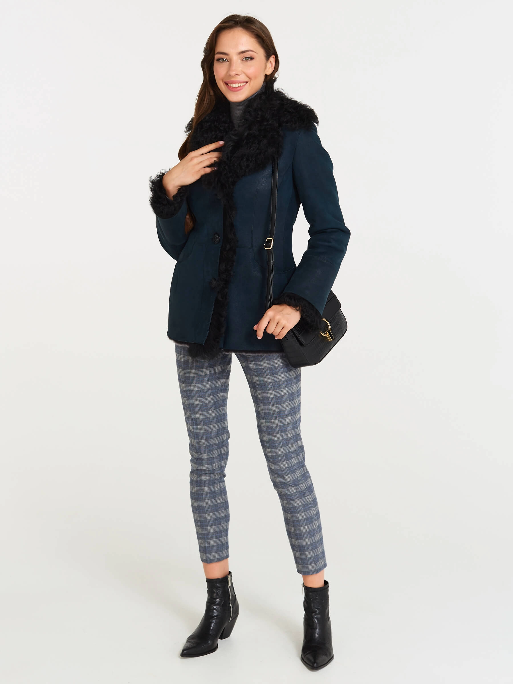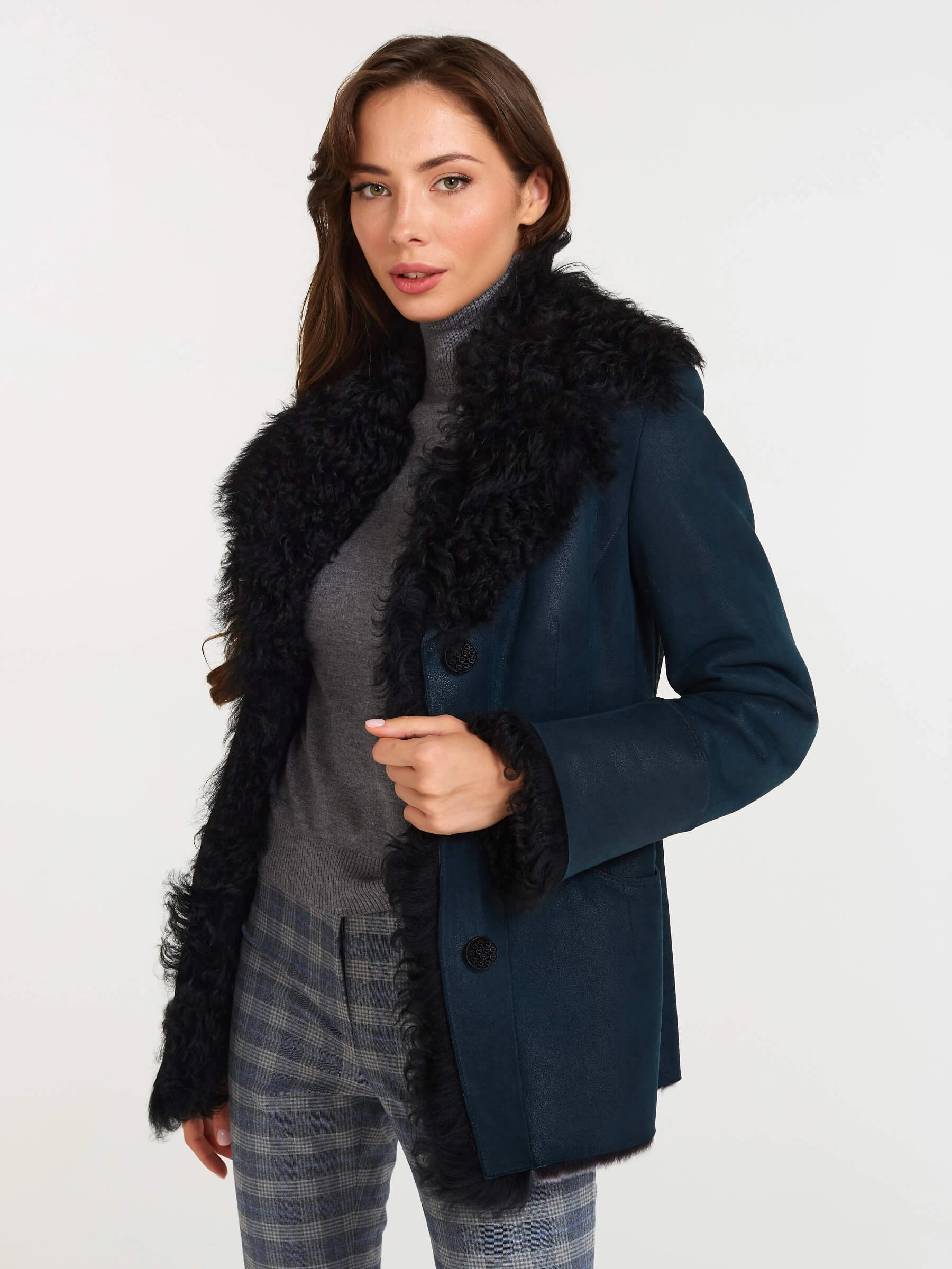 Короткая женская дубленка с овчиной тиградо 289, синяя, размер 42, артикул 14793