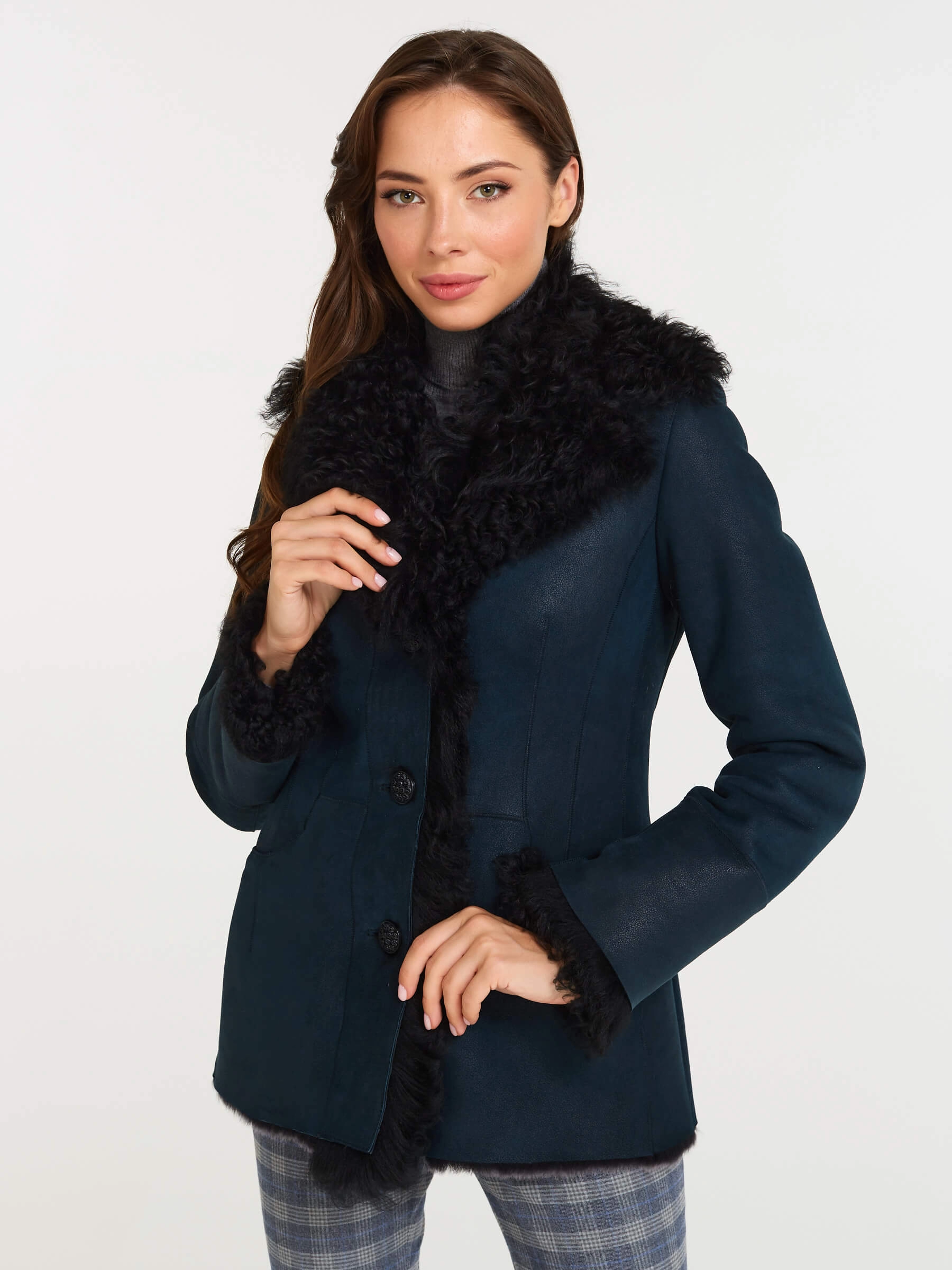 Товар короткая женская дубленка с овчиной тиградо 289, синяя, размер 42, артикул 14793 выполнен из овчина "мерино" с застежкой пуговицы. Рассчитан на сезон: осень-зима. Длина изделия 70 см, силуэт полуприлегающий.