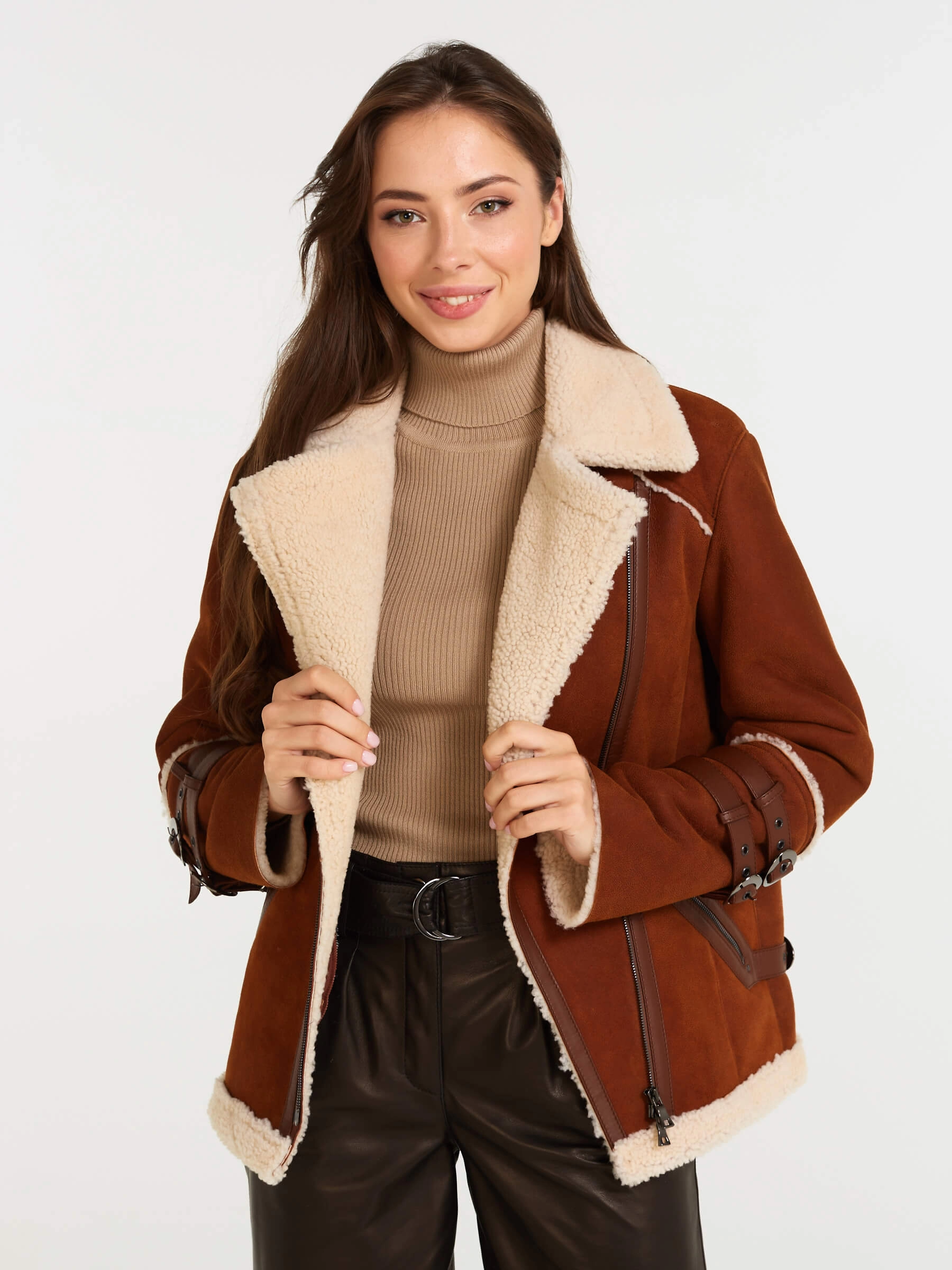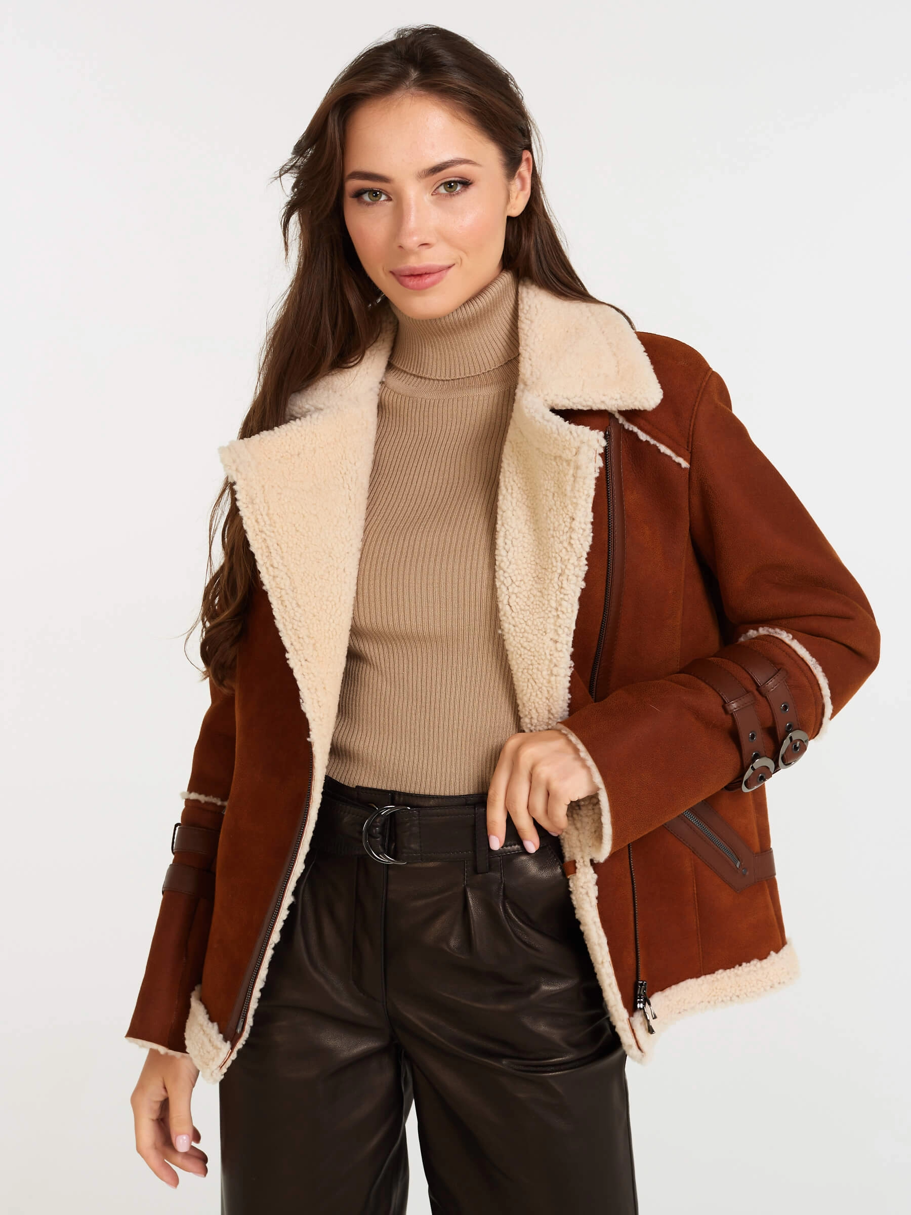 Женская короткая дубленка-косуха из теплой натуральной овчины «керли» подарит брутальный шарм и защитит от холода! Свободный силуэт спортивного кроя обеспечивает комфорт и свободу движений, а густой шелковистый мех согреет в мороз. Застежка-молния, английский воротник с лацканами, регулируемые манжеты и кожаные паты на рукавах и по бокам создают непокорный дух. Практичные врезные карманы на молниях дополняют образ. Сочетайте её с кожаными штанами и худи или объемным свитером для дерзкого повседневного образа.