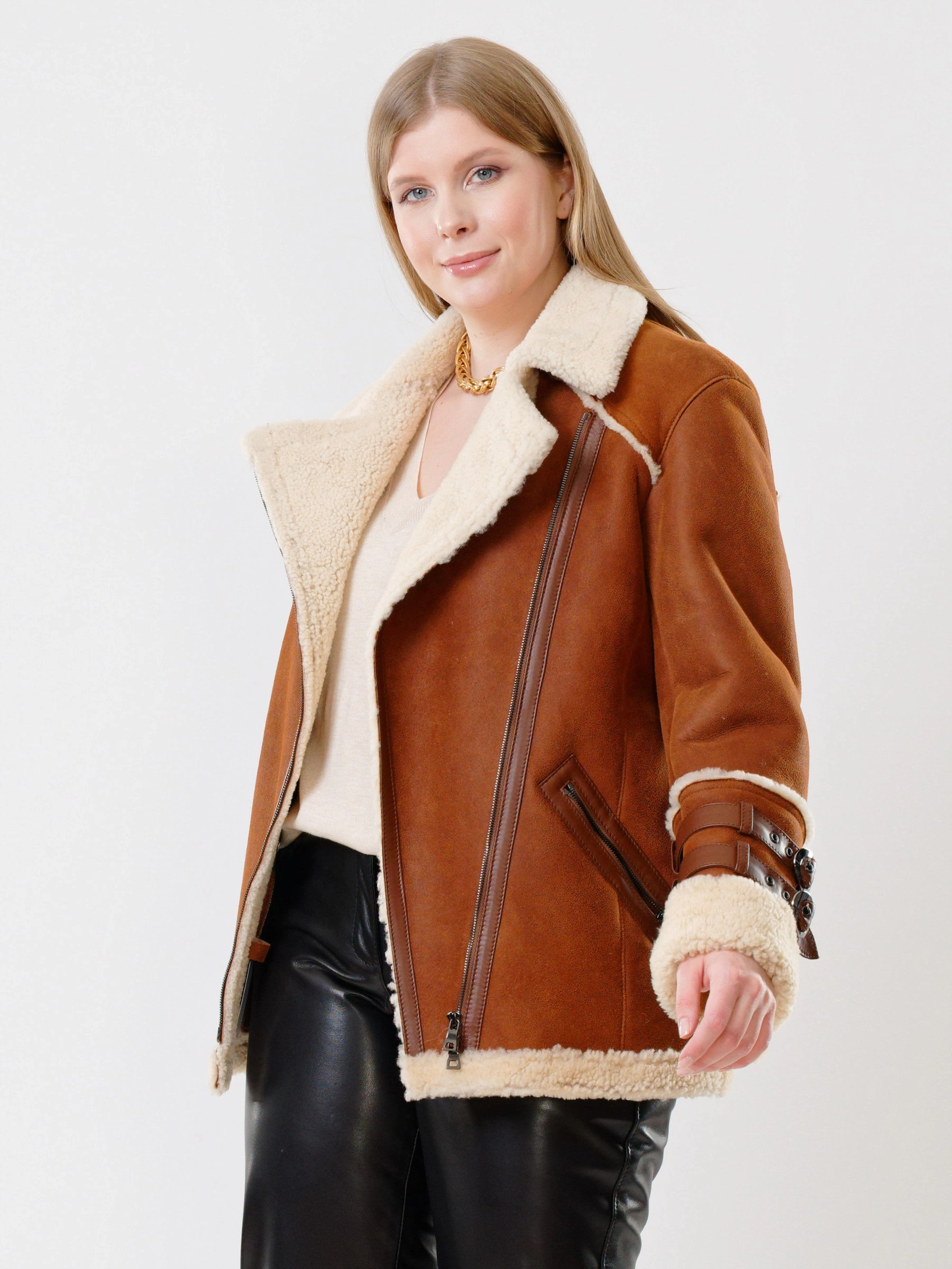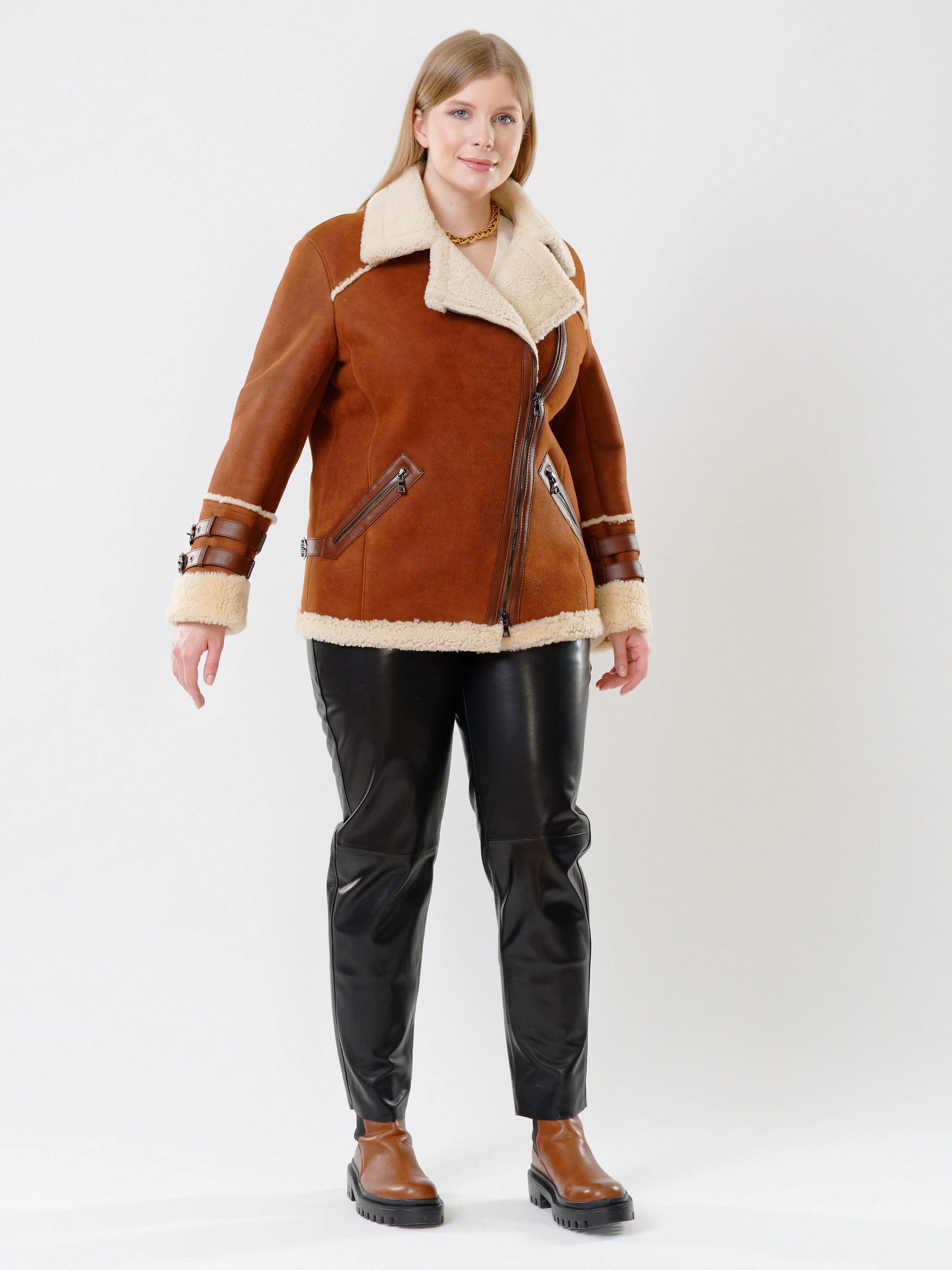Женская короткая дубленка-косуха из теплой натуральной овчины «керли» подарит брутальный шарм и защитит от холода! Свободный силуэт спортивного кроя обеспечивает комфорт и свободу движений, а густой шелковистый мех согреет в мороз. Застежка-молния, английский воротник с лацканами, регулируемые манжеты и кожаные паты на рукавах и по бокам создают непокорный дух. Практичные врезные карманы на молниях дополняют образ. Сочетайте её с кожаными штанами и худи или объемным свитером для дерзкого повседневного образа.
