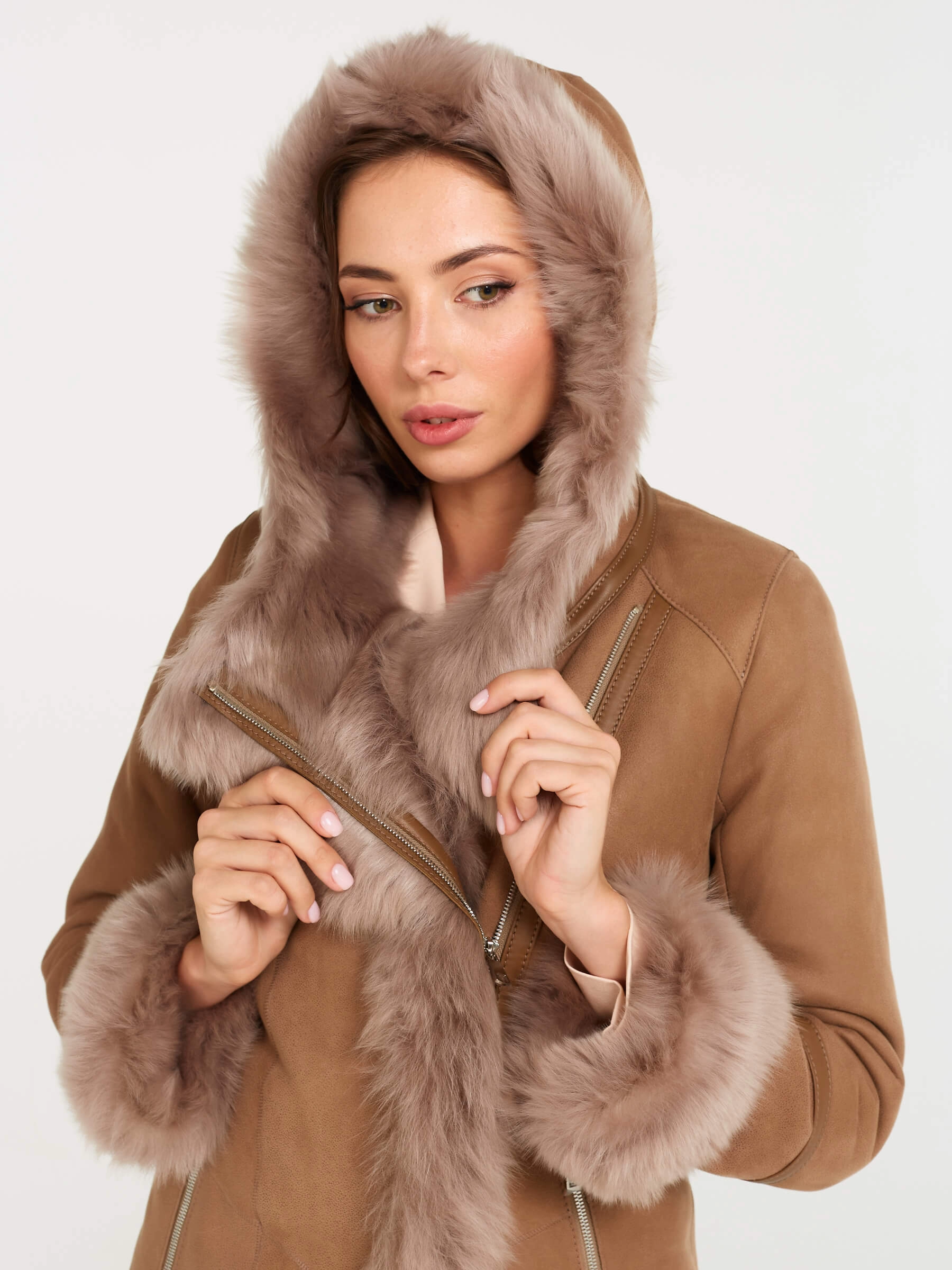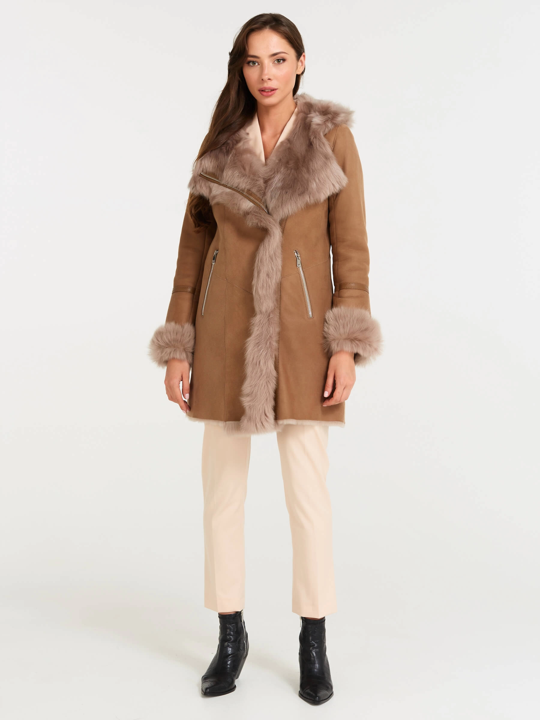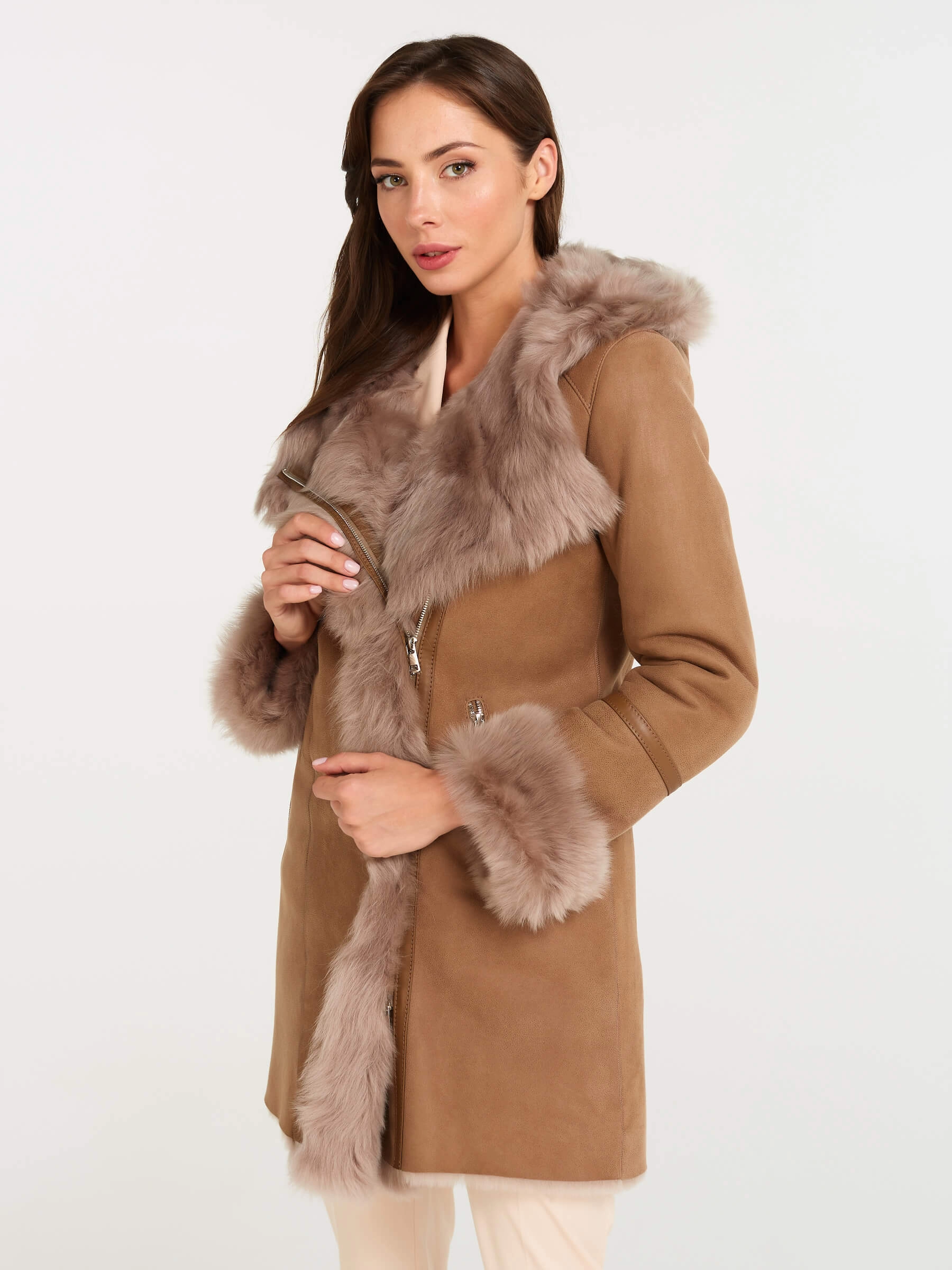 Стильная женская дублёнка-косуха из натуральной овчины «мерино» с удобным несъёмным капюшоном, отделанным роскошной овчиной «тоскана». Застёгивается на молнию; прямой силуэт универсальной длины 75 см обеспечивает комфортную современную посадку. Густой блестящий мех, мягкая отделка манжет «тосканой» гарантируют тепло и уют в холода. Идеальная повседневная модель для создания дерзкого образа с джинсами-скинни и грубыми ботинками.