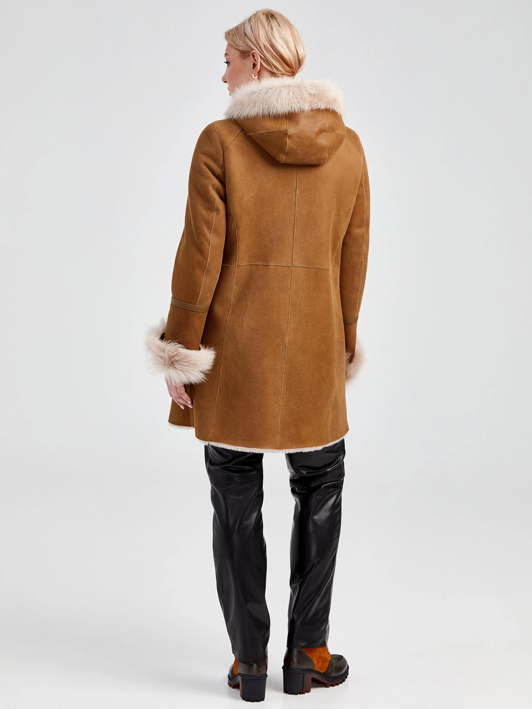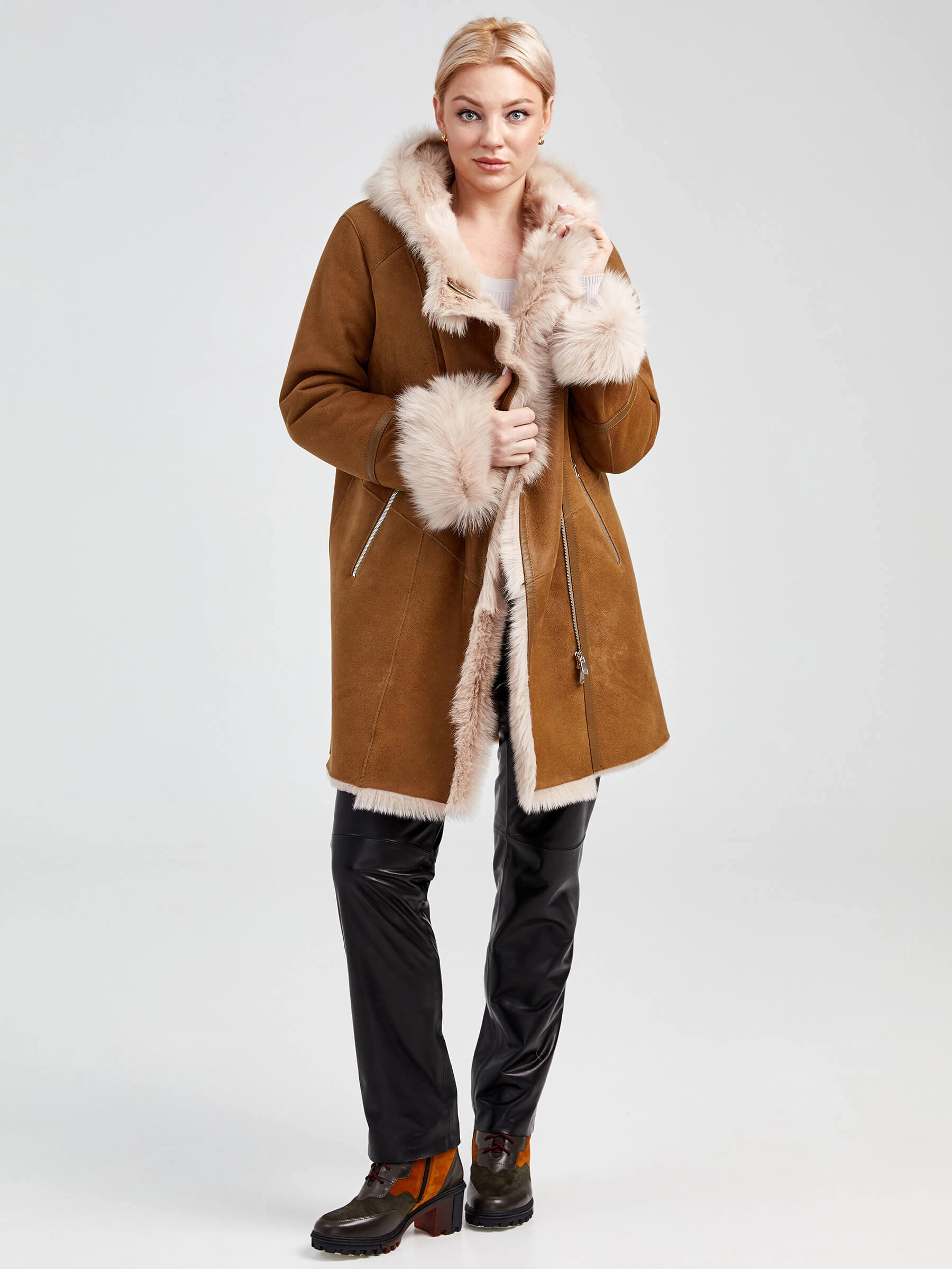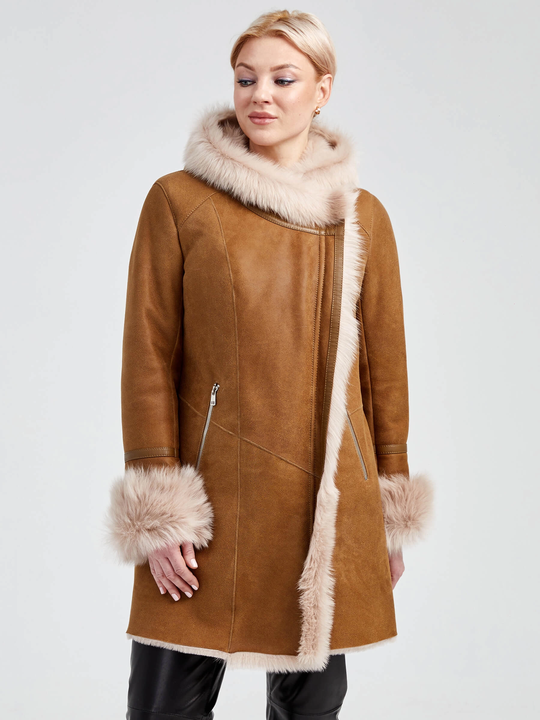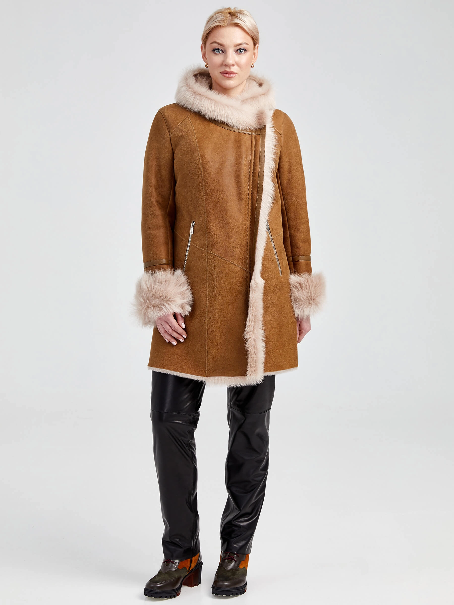 Дубленка косуха женская с капюшоном из тосканы 293, бежевая, размер 42, артикул 62481