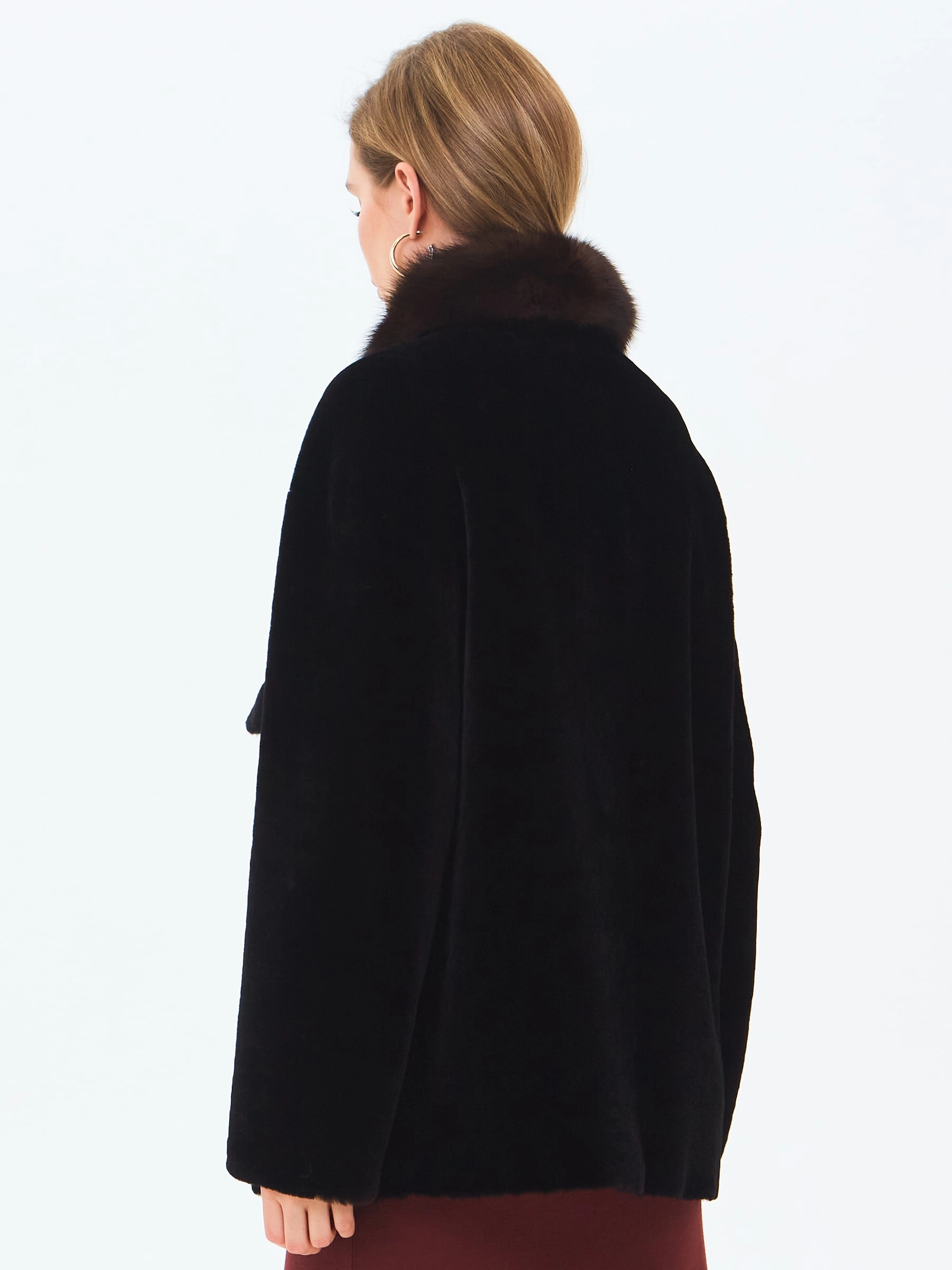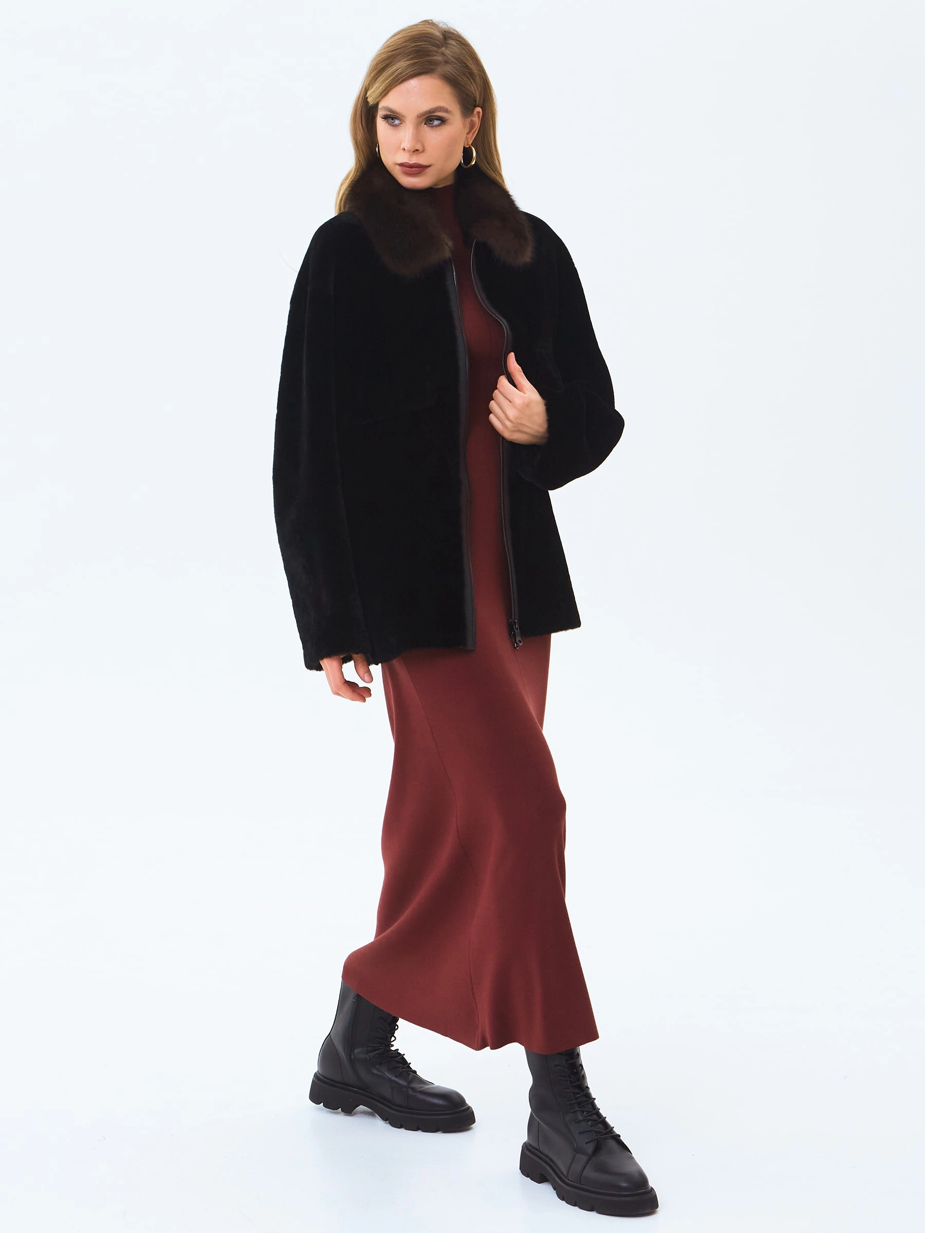 Дубленка женская из астрагана с воротником куницей 2063, черная, размер 46, артикул 64660